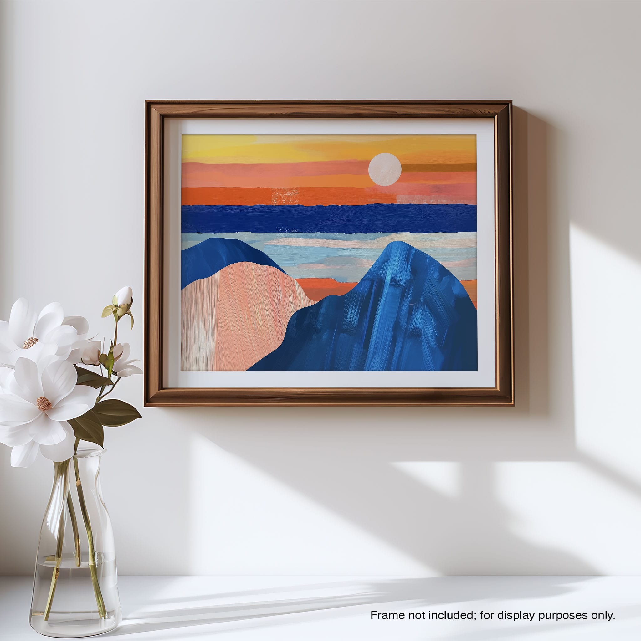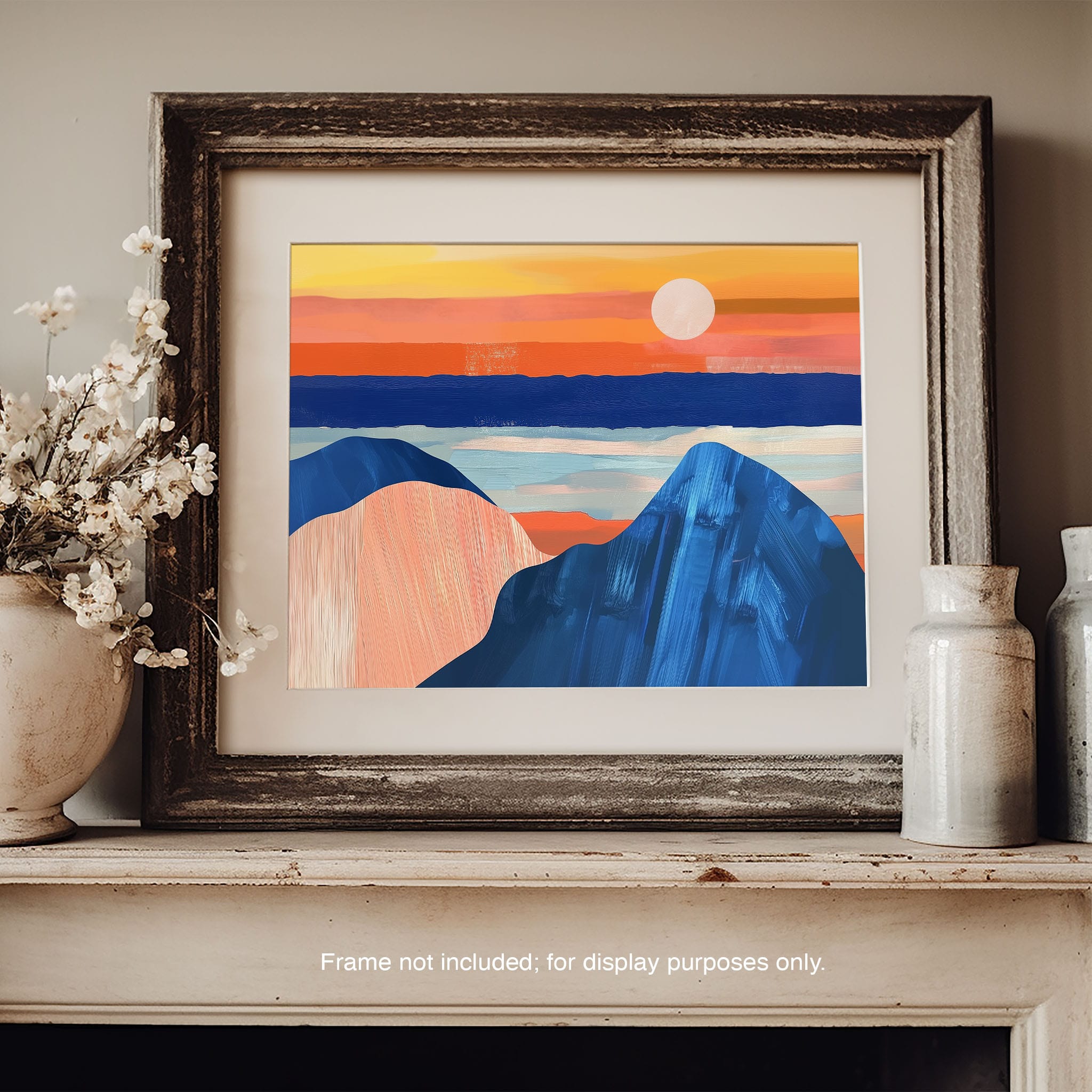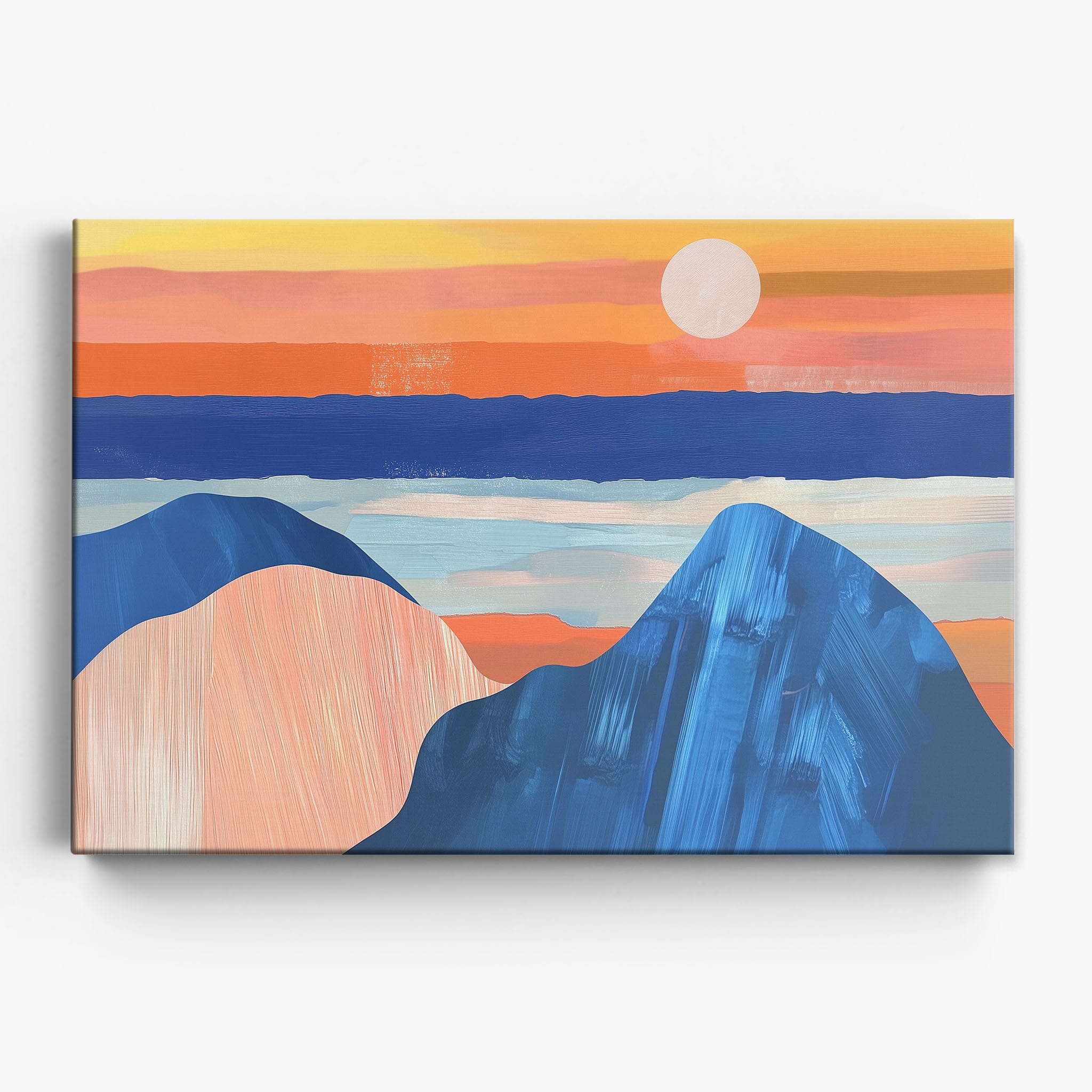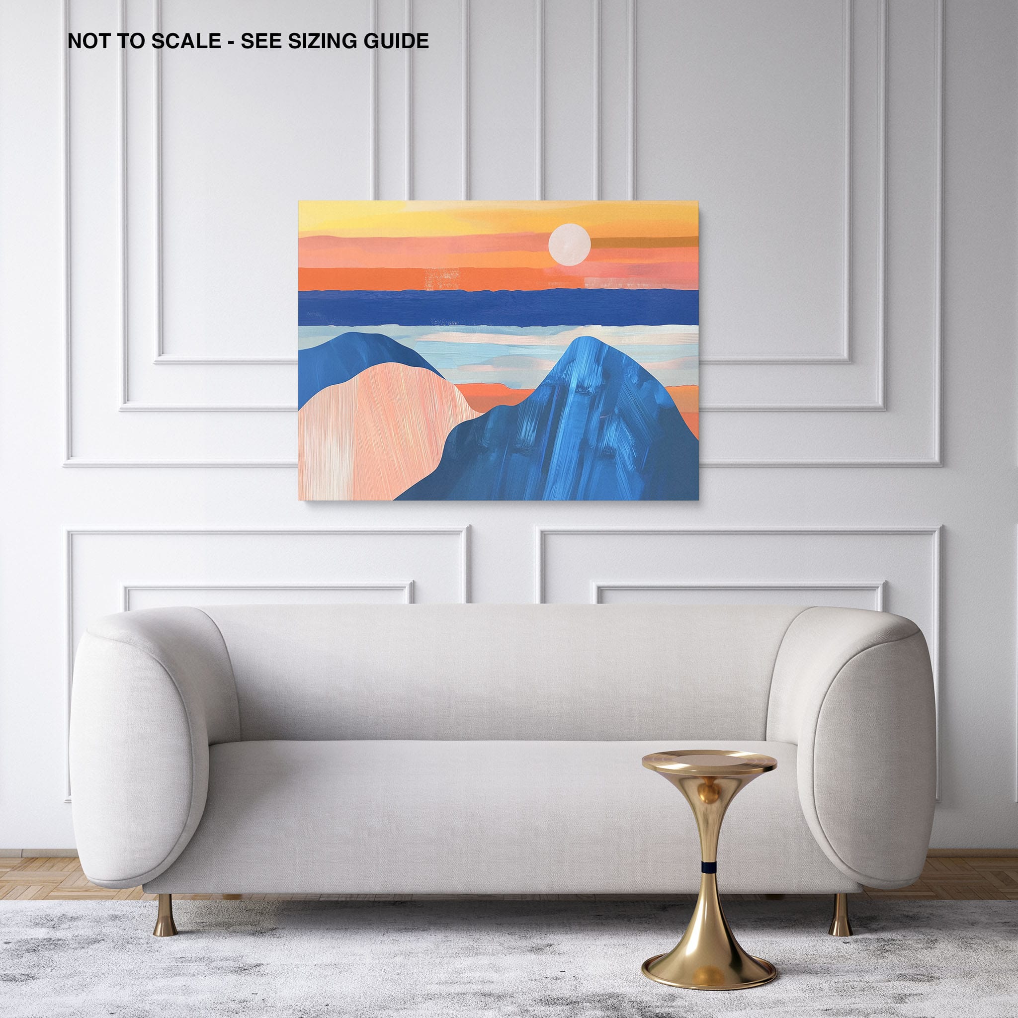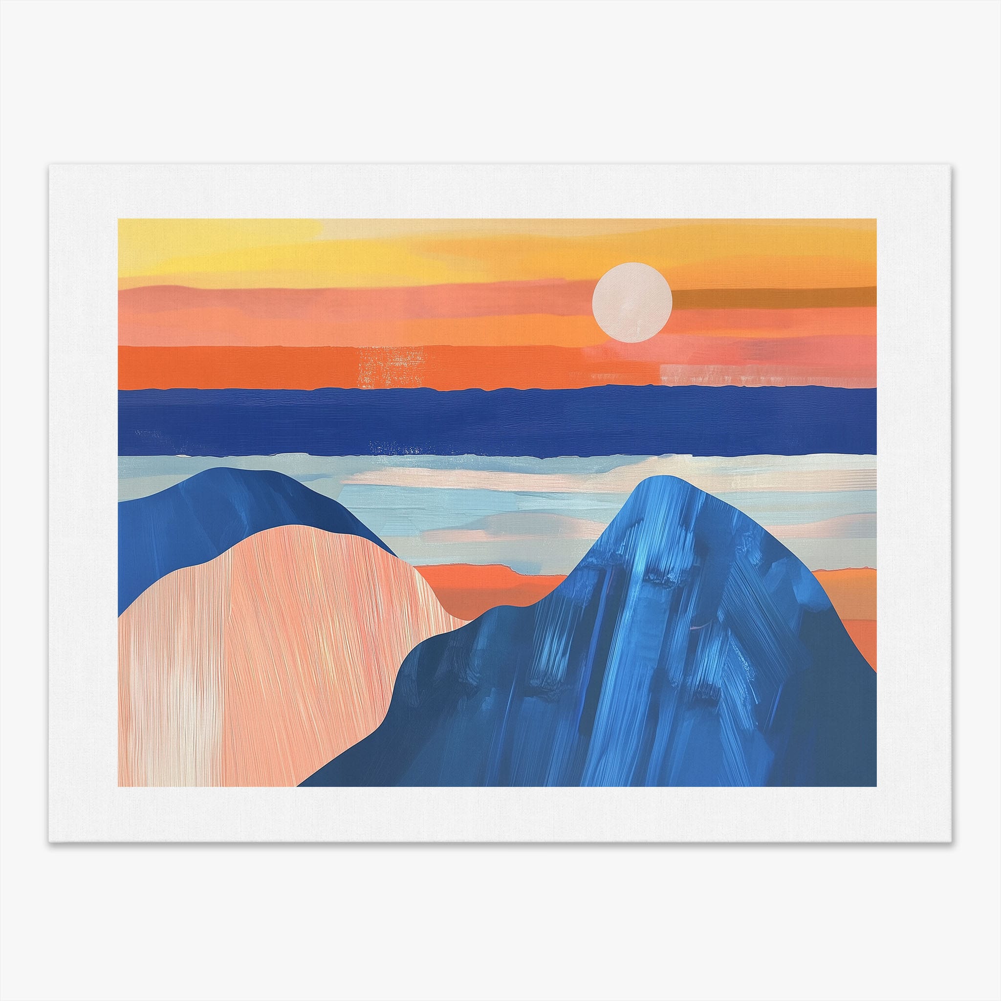 Experience the peaceful serenity of Sunrise Over Abstract Mountains, a compelling digital artwork that captures the beauty of nature in an abstract form. Bold, sweeping strokes and a warm color palette evoke the first light of day spreading over stylized mountain peaks. This piece masterfully combines hues of blue, orange, and peach, creating a harmonious blend that appeals to modern art lovers seeking a soothing yet dynamic piece for their spaces. Perfect for adding a touch of abstract elegance and modern style to any room, this artwork invites viewers to enjoy the tranquility and beauty of an idealized landscape.