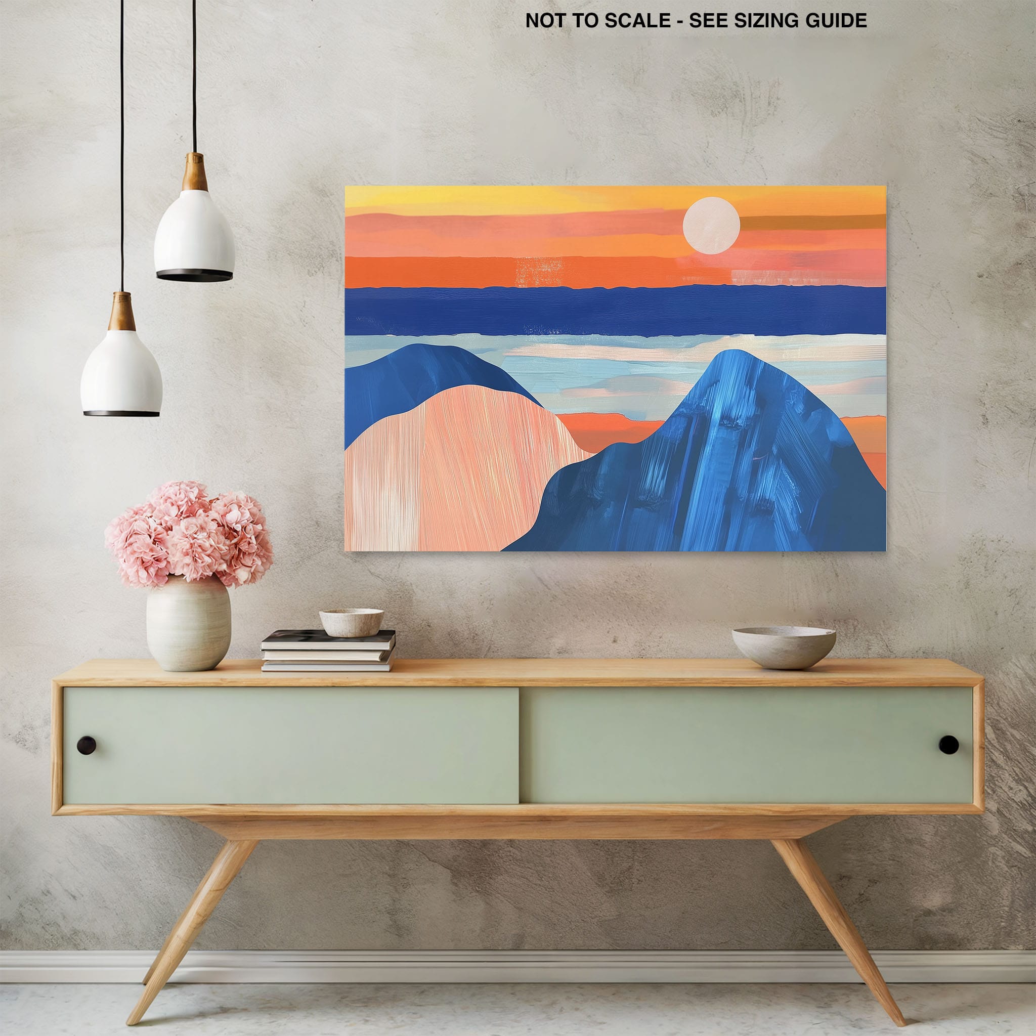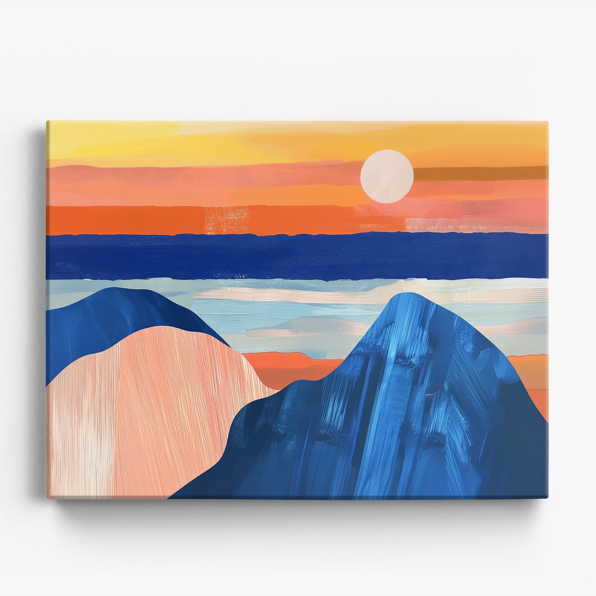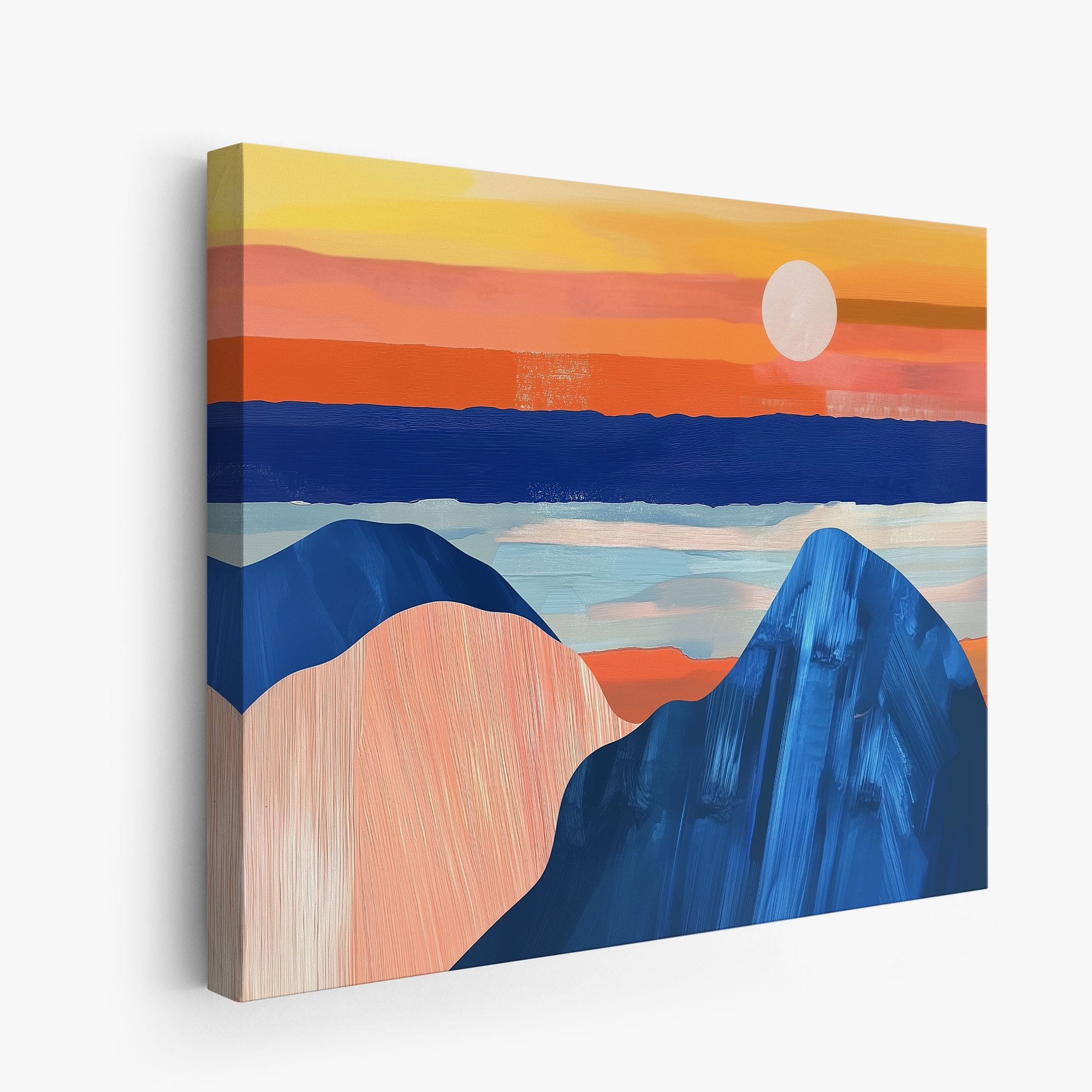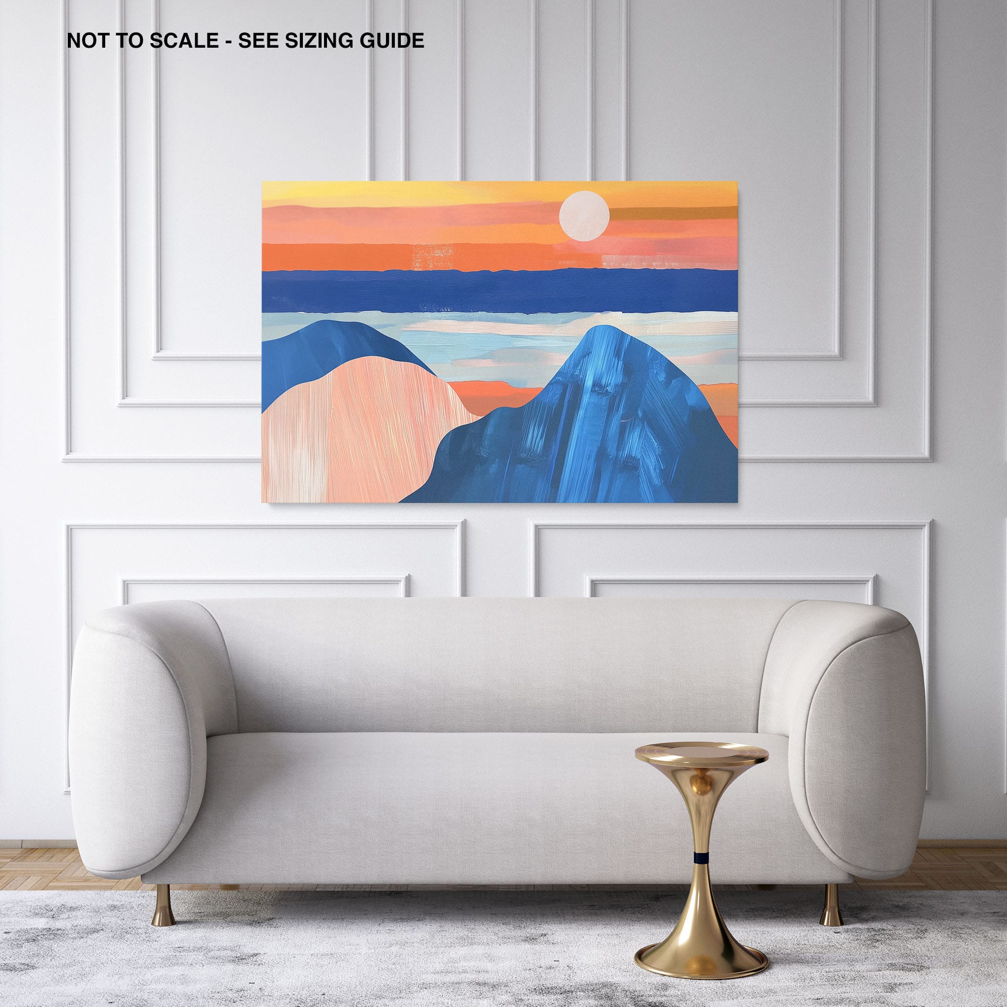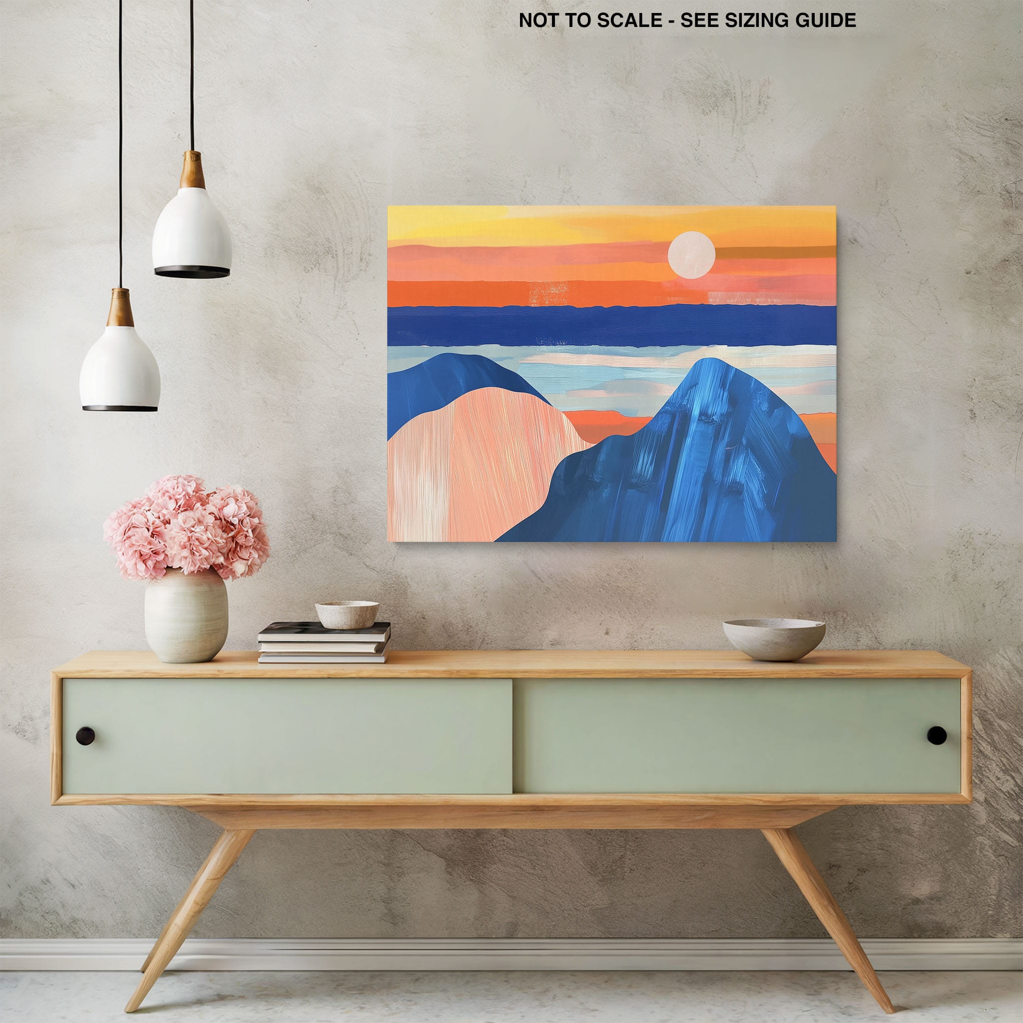 Experience the peaceful serenity of Sunrise Over Abstract Mountains, a compelling digital artwork that captures the beauty of nature in an abstract form. Bold, sweeping strokes and a warm color palette evoke the first light of day spreading over stylized mountain peaks. This piece masterfully combines hues of blue, orange, and peach, creating a harmonious blend that appeals to modern art lovers seeking a soothing yet dynamic piece for their spaces. Perfect for adding a touch of abstract elegance and modern style to any room, this artwork invites viewers to enjoy the tranquility and beauty of an idealized landscape.