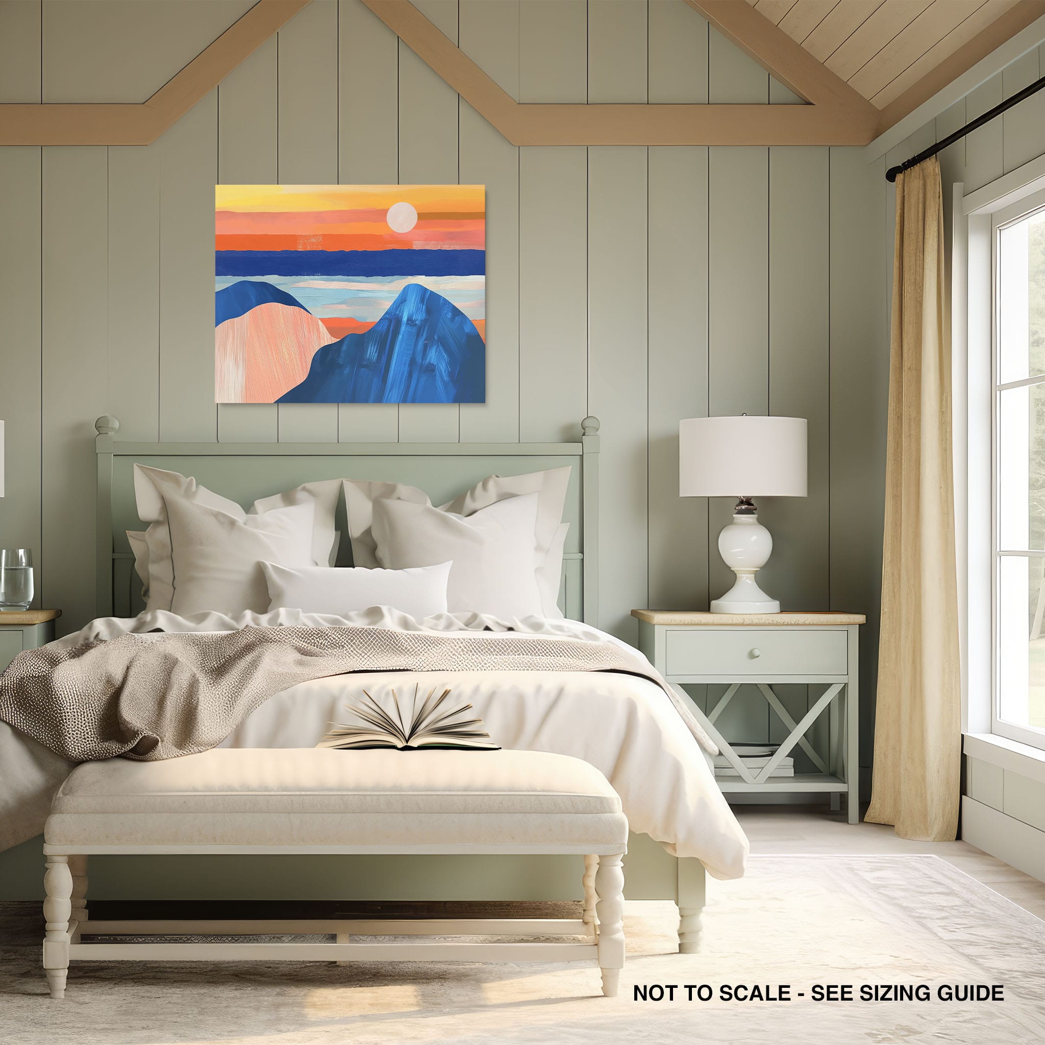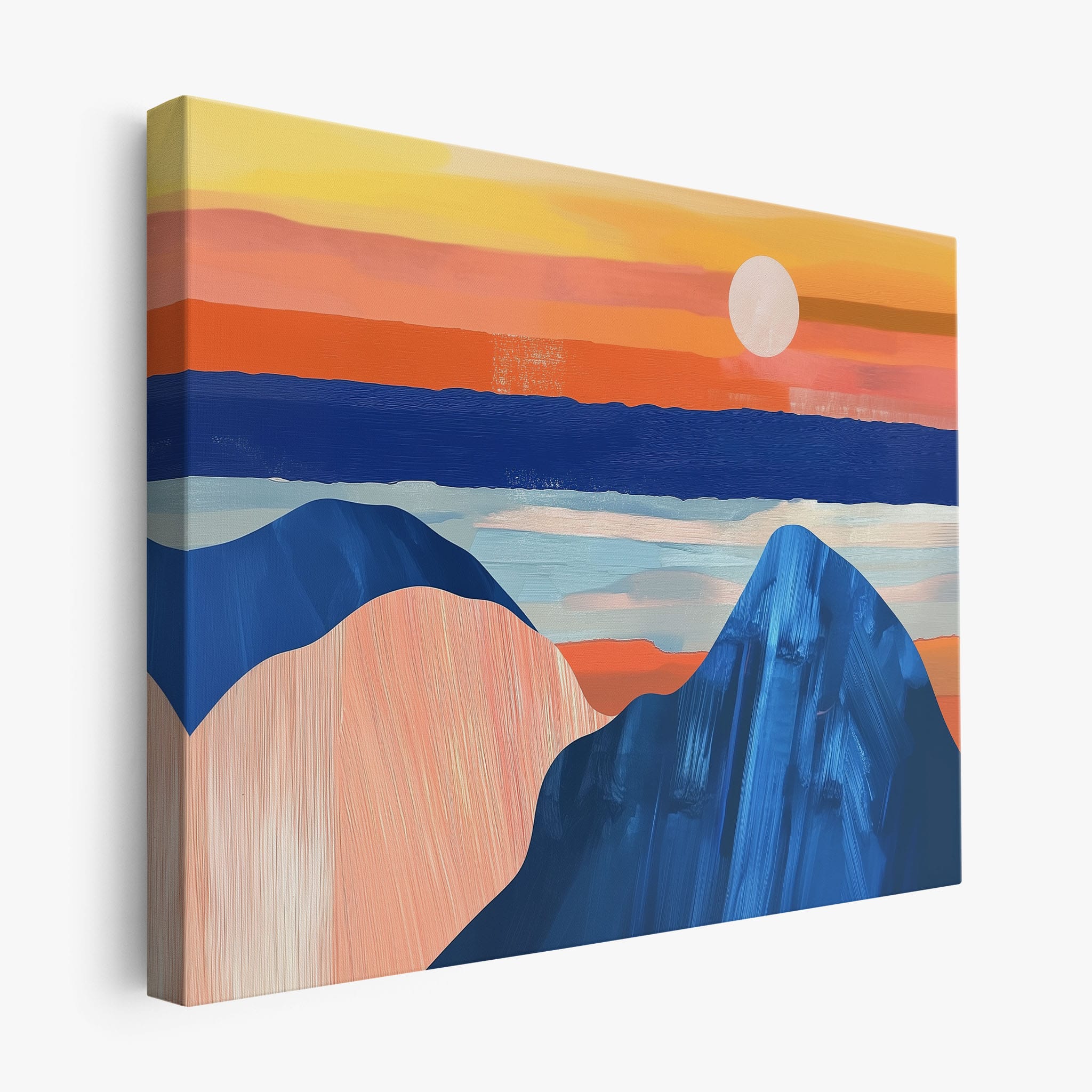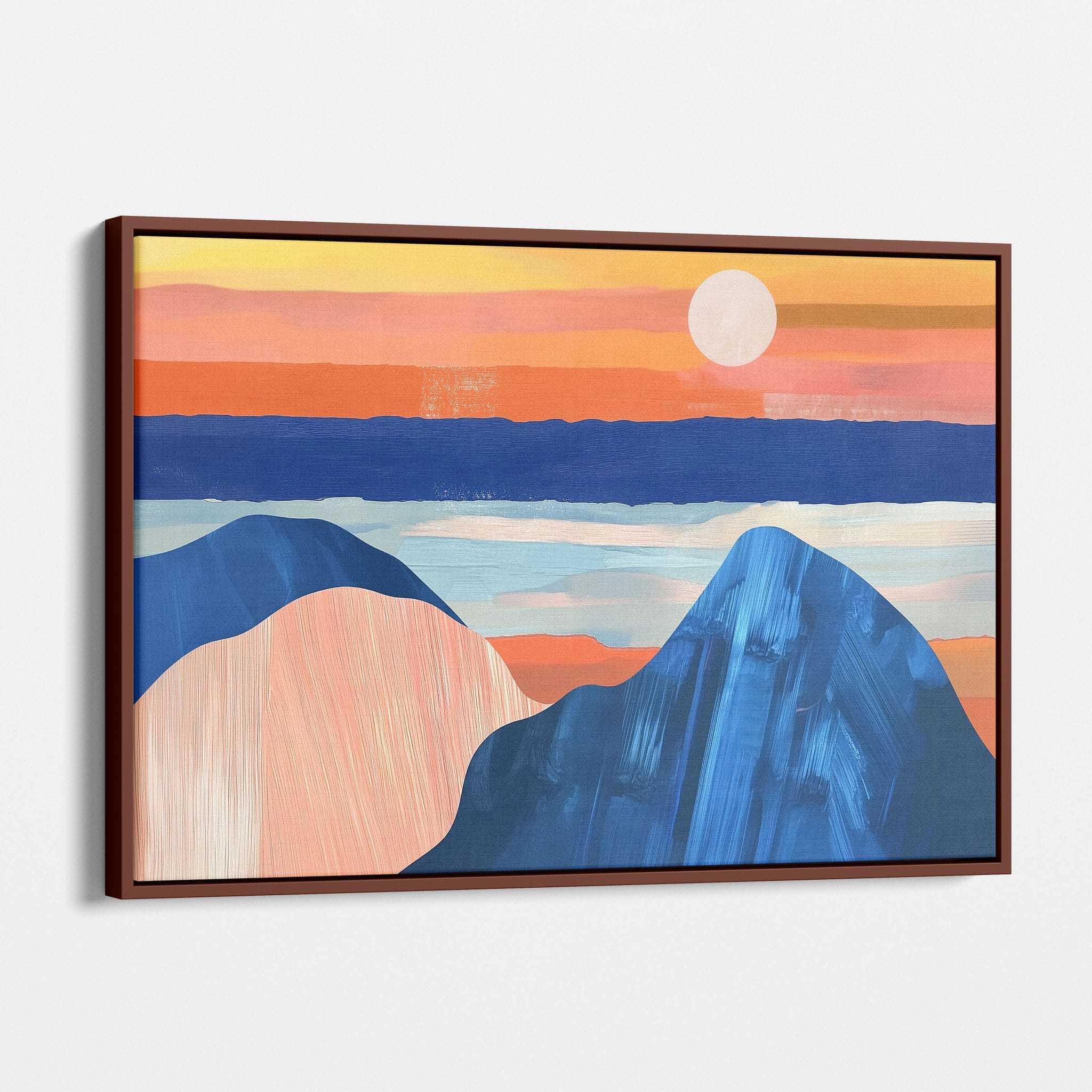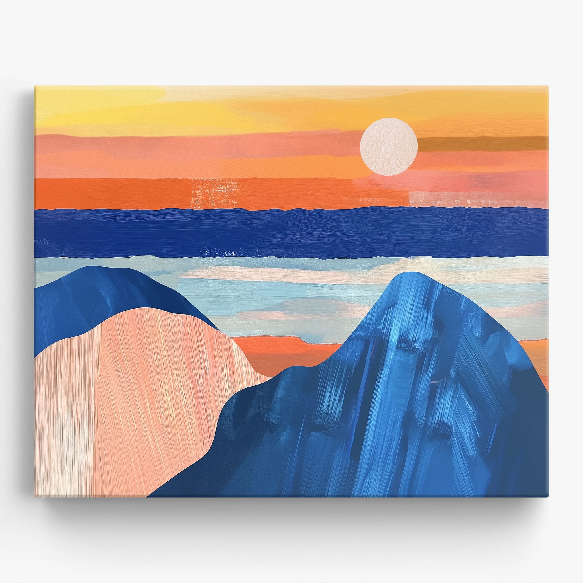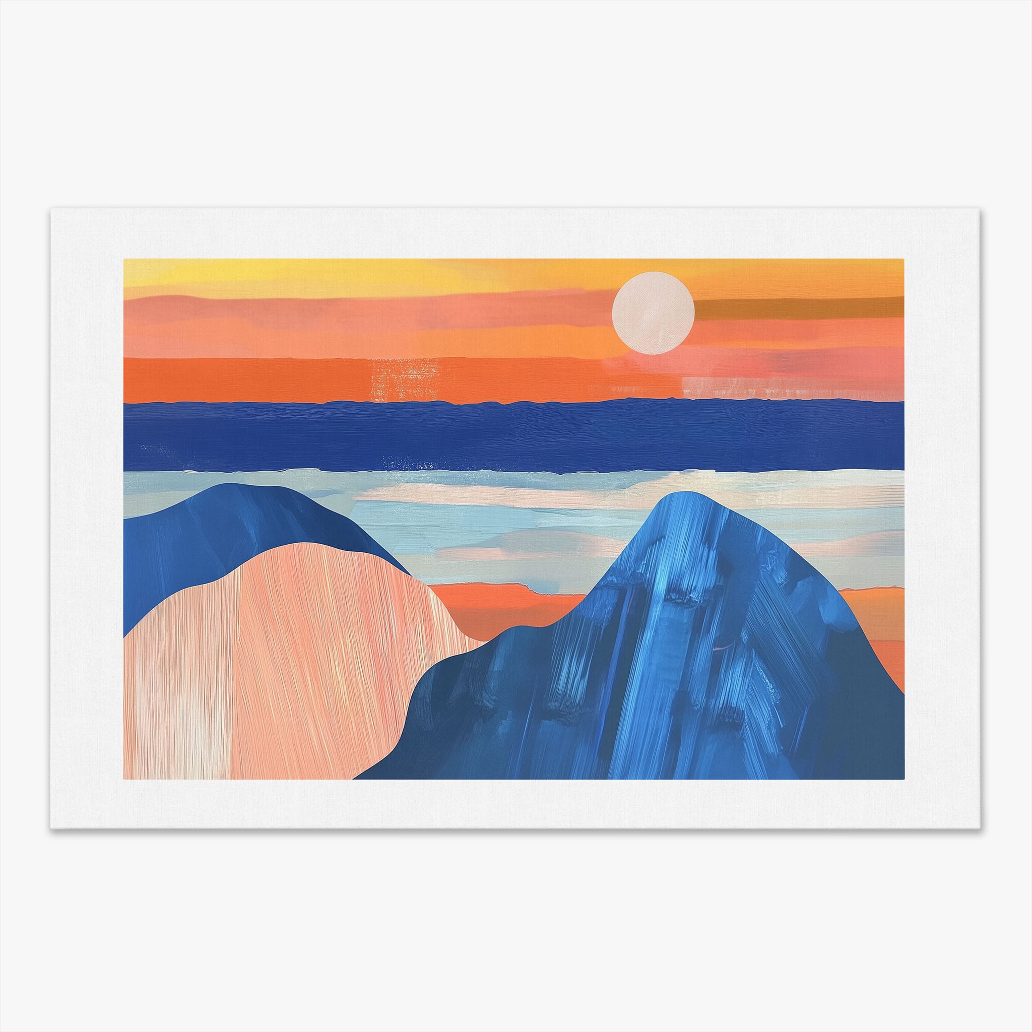 Experience the peaceful serenity of Sunrise Over Abstract Mountains, a compelling digital artwork that captures the beauty of nature in an abstract form. Bold, sweeping strokes and a warm color palette evoke the first light of day spreading over stylized mountain peaks. This piece masterfully combines hues of blue, orange, and peach, creating a harmonious blend that appeals to modern art lovers seeking a soothing yet dynamic piece for their spaces. Perfect for adding a touch of abstract elegance and modern style to any room, this artwork invites viewers to enjoy the tranquility and beauty of an idealized landscape.