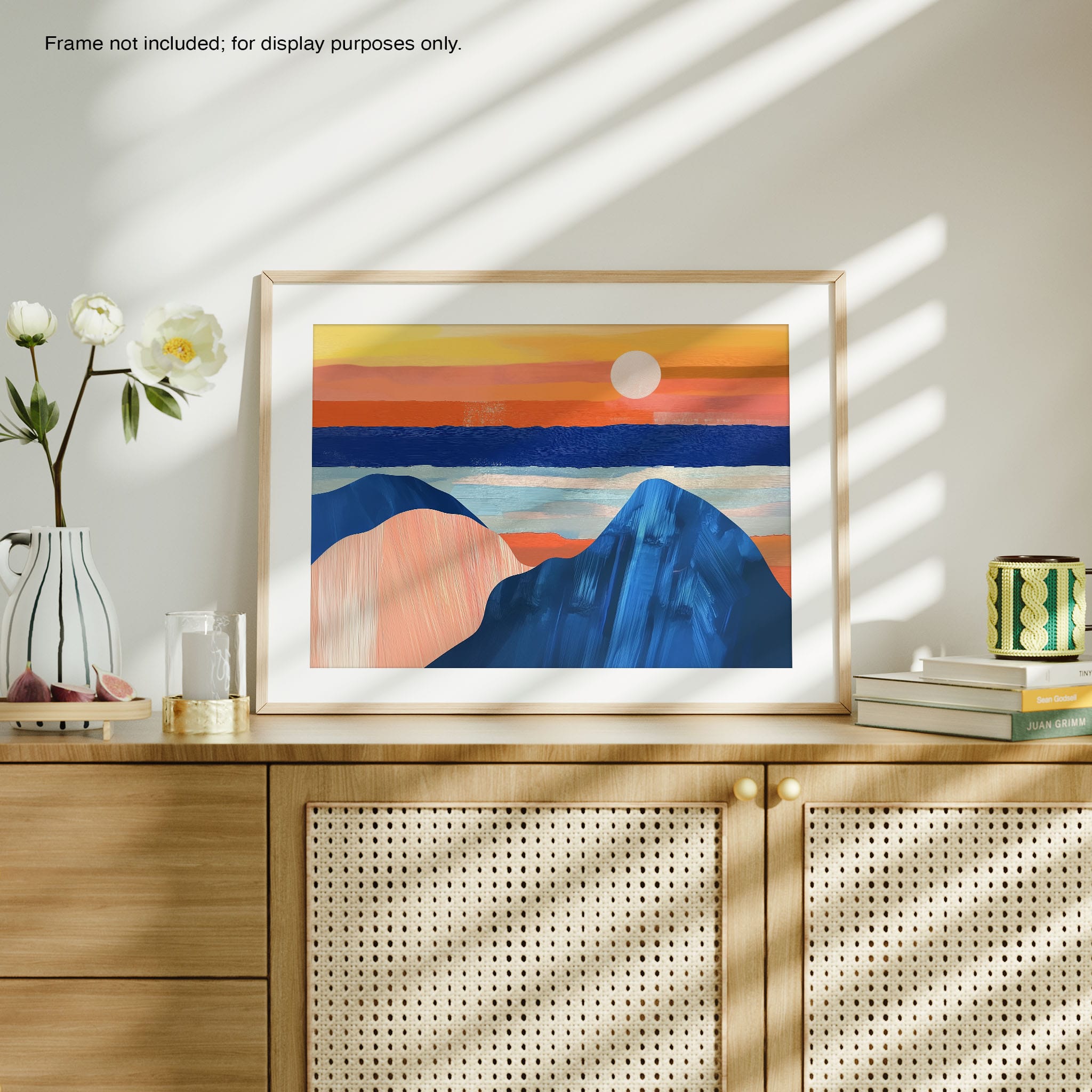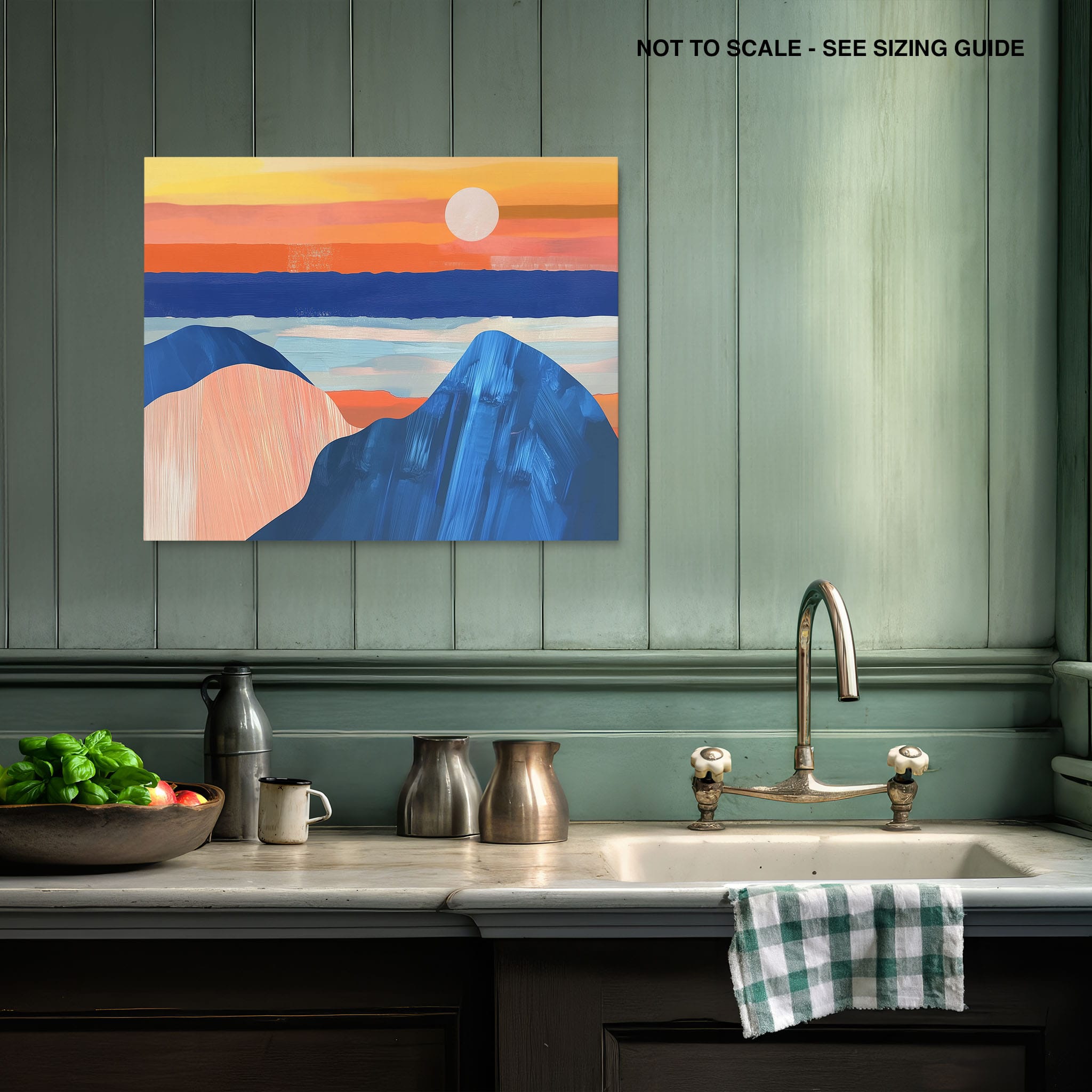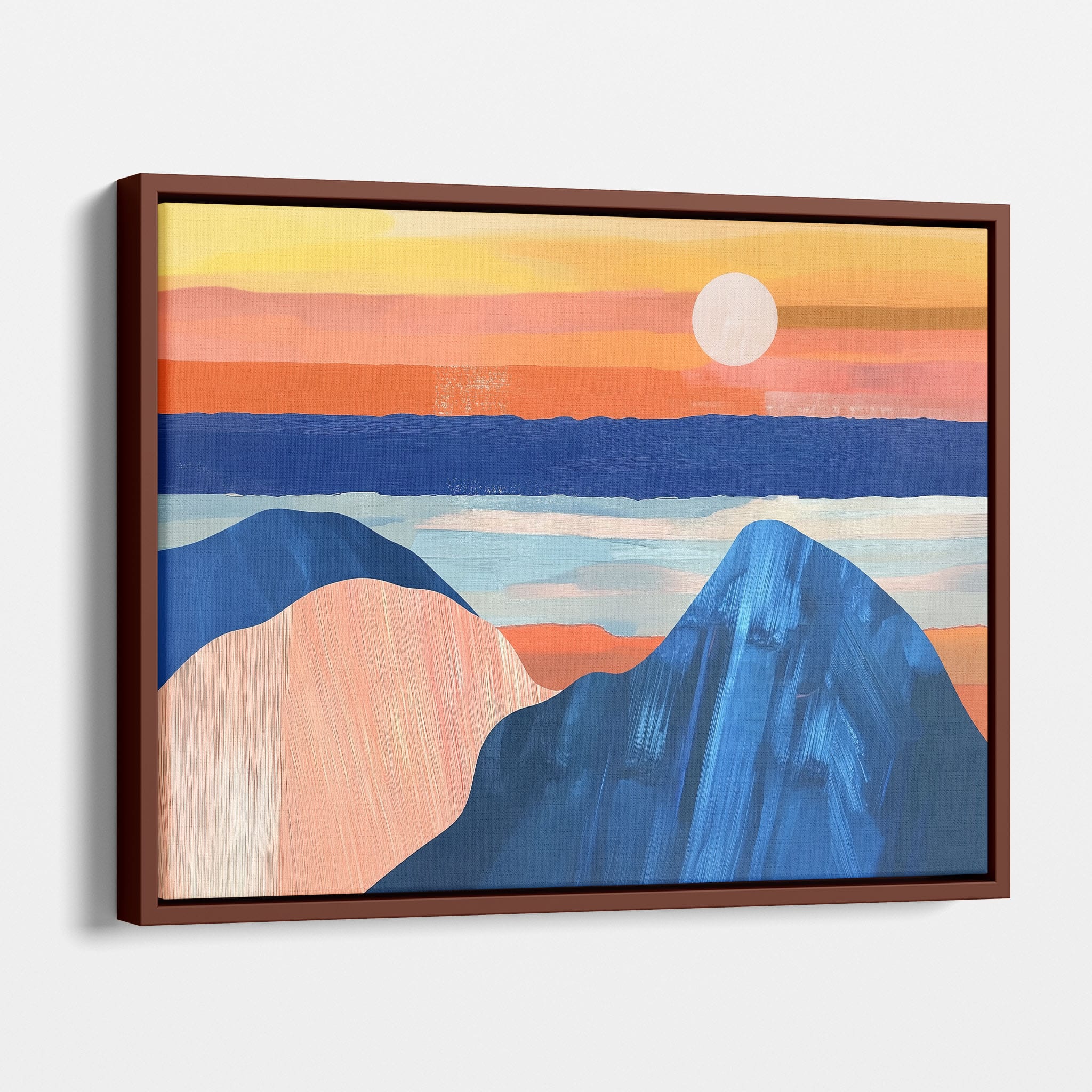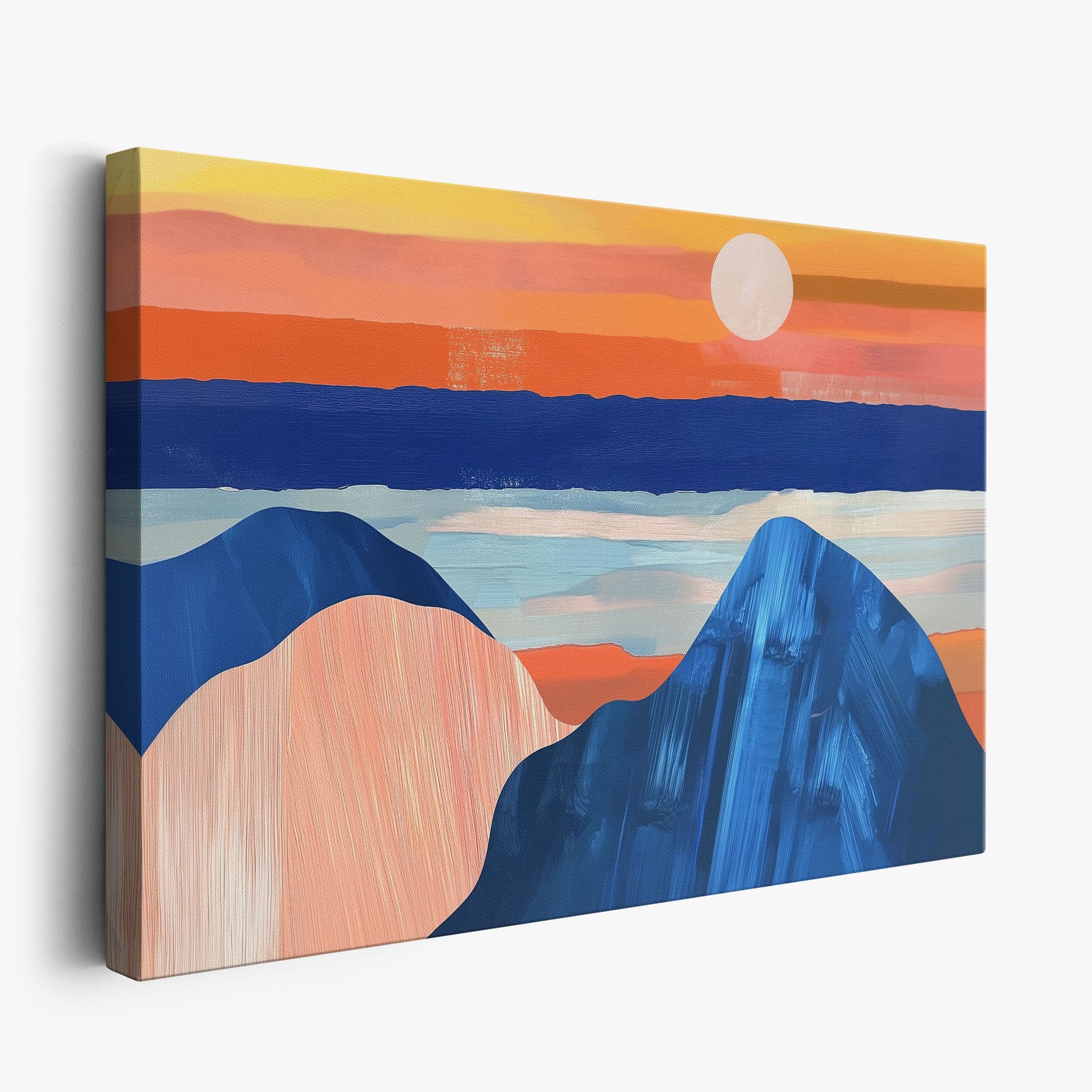 Experience the peaceful serenity of Sunrise Over Abstract Mountains, a compelling digital artwork that captures the beauty of nature in an abstract form. Bold, sweeping strokes and a warm color palette evoke the first light of day spreading over stylized mountain peaks. This piece masterfully combines hues of blue, orange, and peach, creating a harmonious blend that appeals to modern art lovers seeking a soothing yet dynamic piece for their spaces. Perfect for adding a touch of abstract elegance and modern style to any room, this artwork invites viewers to enjoy the tranquility and beauty of an idealized landscape.