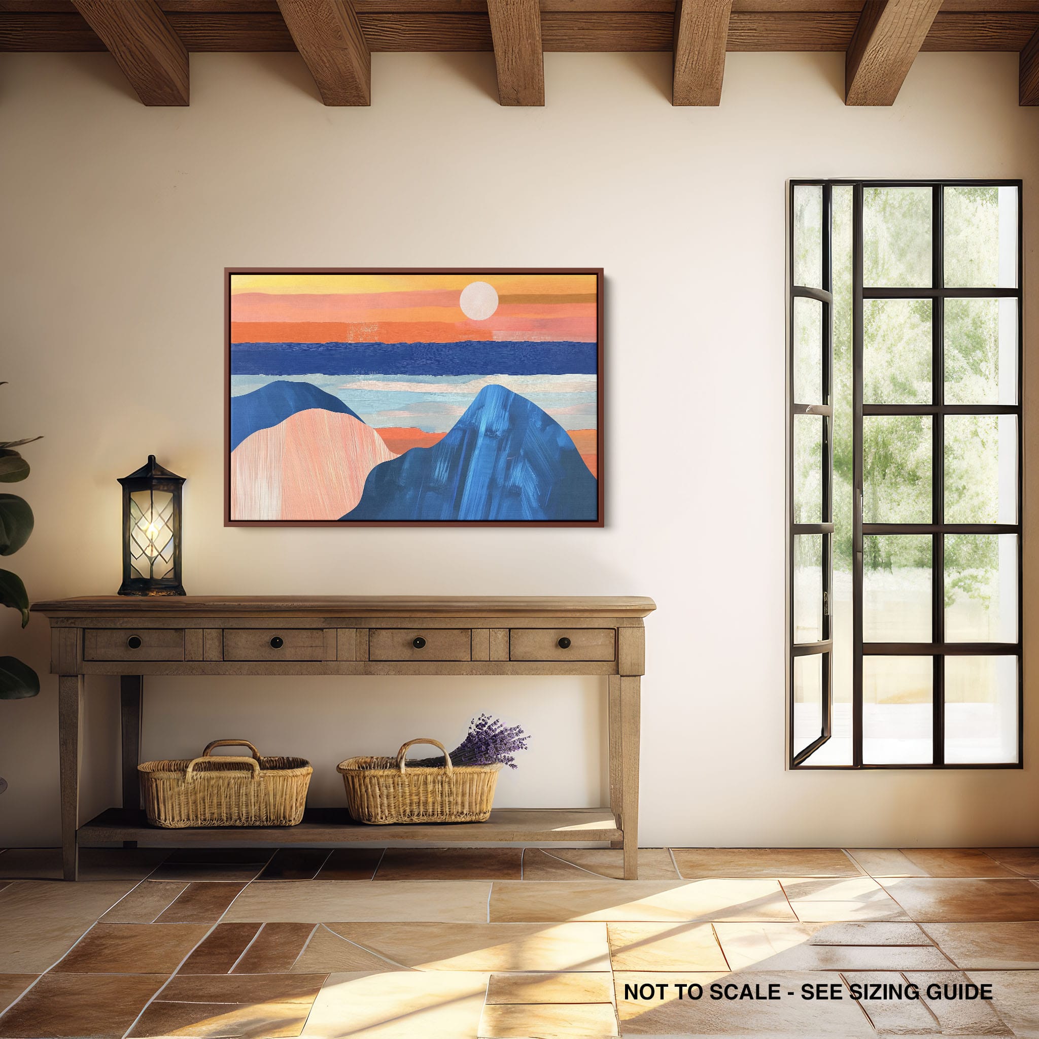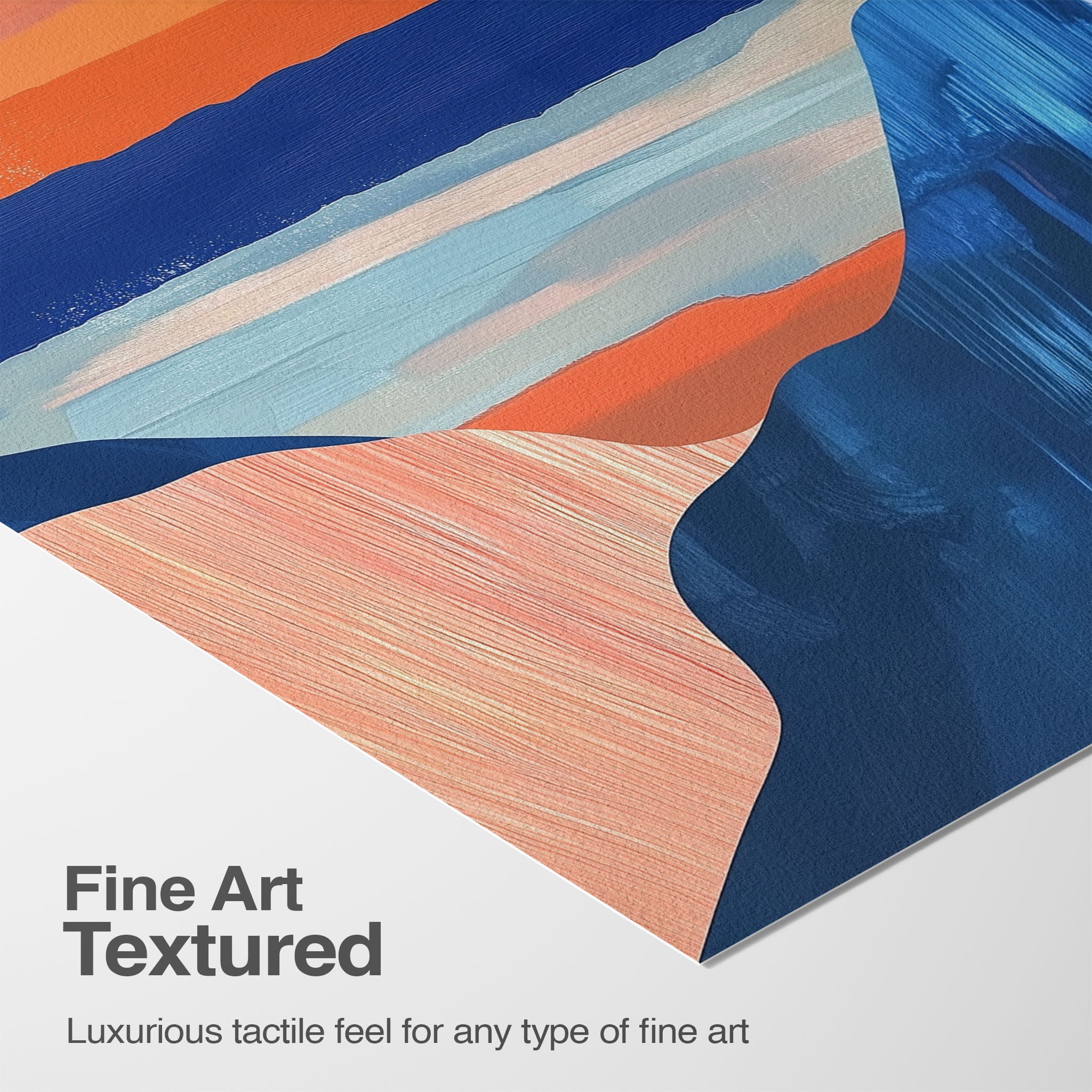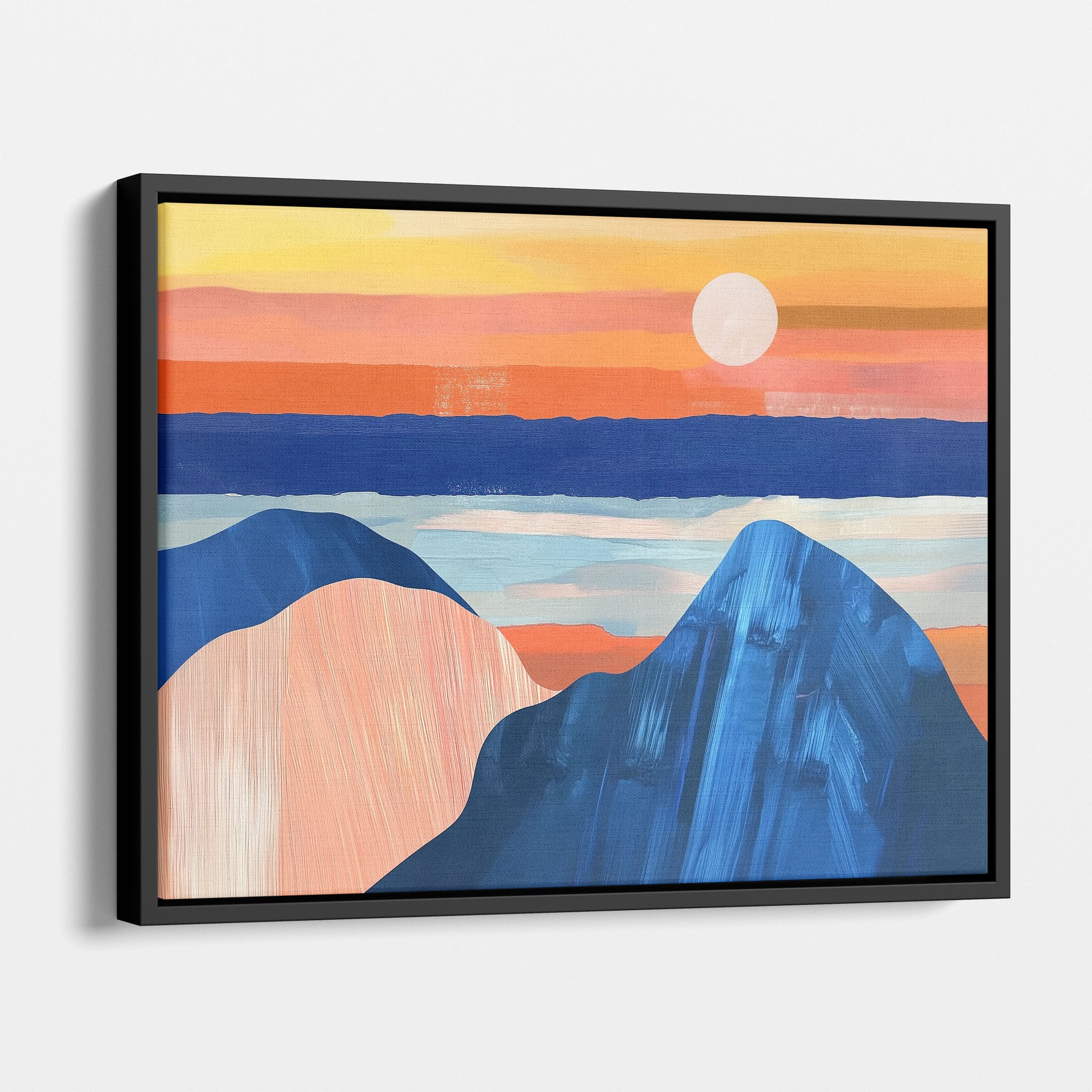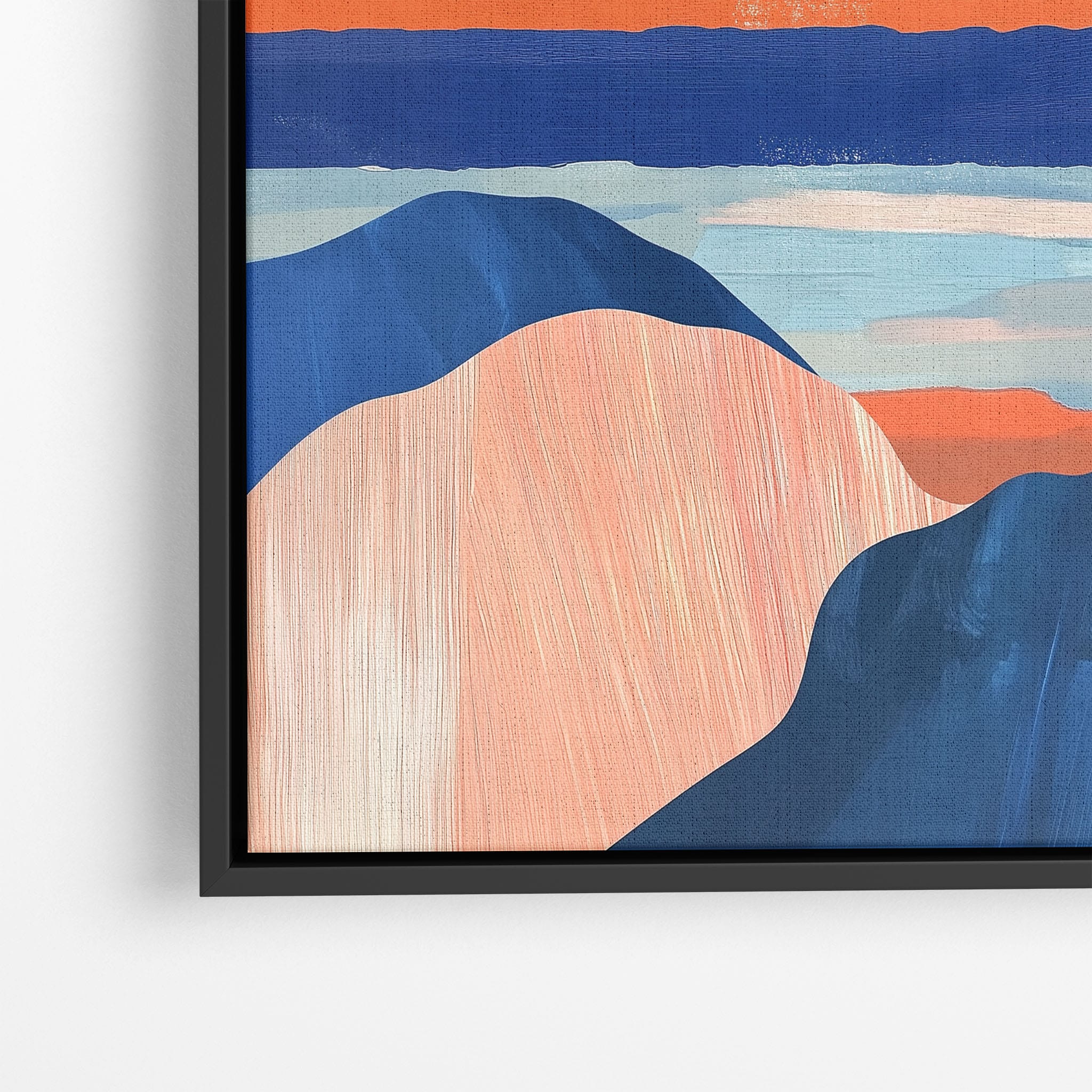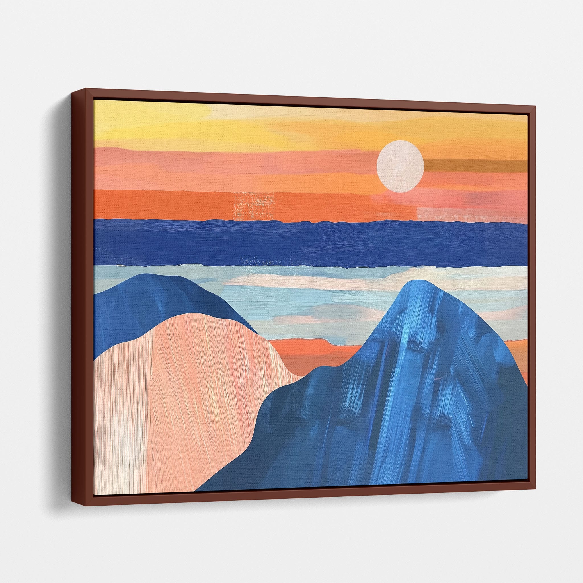 Experience the peaceful serenity of Sunrise Over Abstract Mountains, a compelling digital artwork that captures the beauty of nature in an abstract form. Bold, sweeping strokes and a warm color palette evoke the first light of day spreading over stylized mountain peaks. This piece masterfully combines hues of blue, orange, and peach, creating a harmonious blend that appeals to modern art lovers seeking a soothing yet dynamic piece for their spaces. Perfect for adding a touch of abstract elegance and modern style to any room, this artwork invites viewers to enjoy the tranquility and beauty of an idealized landscape.