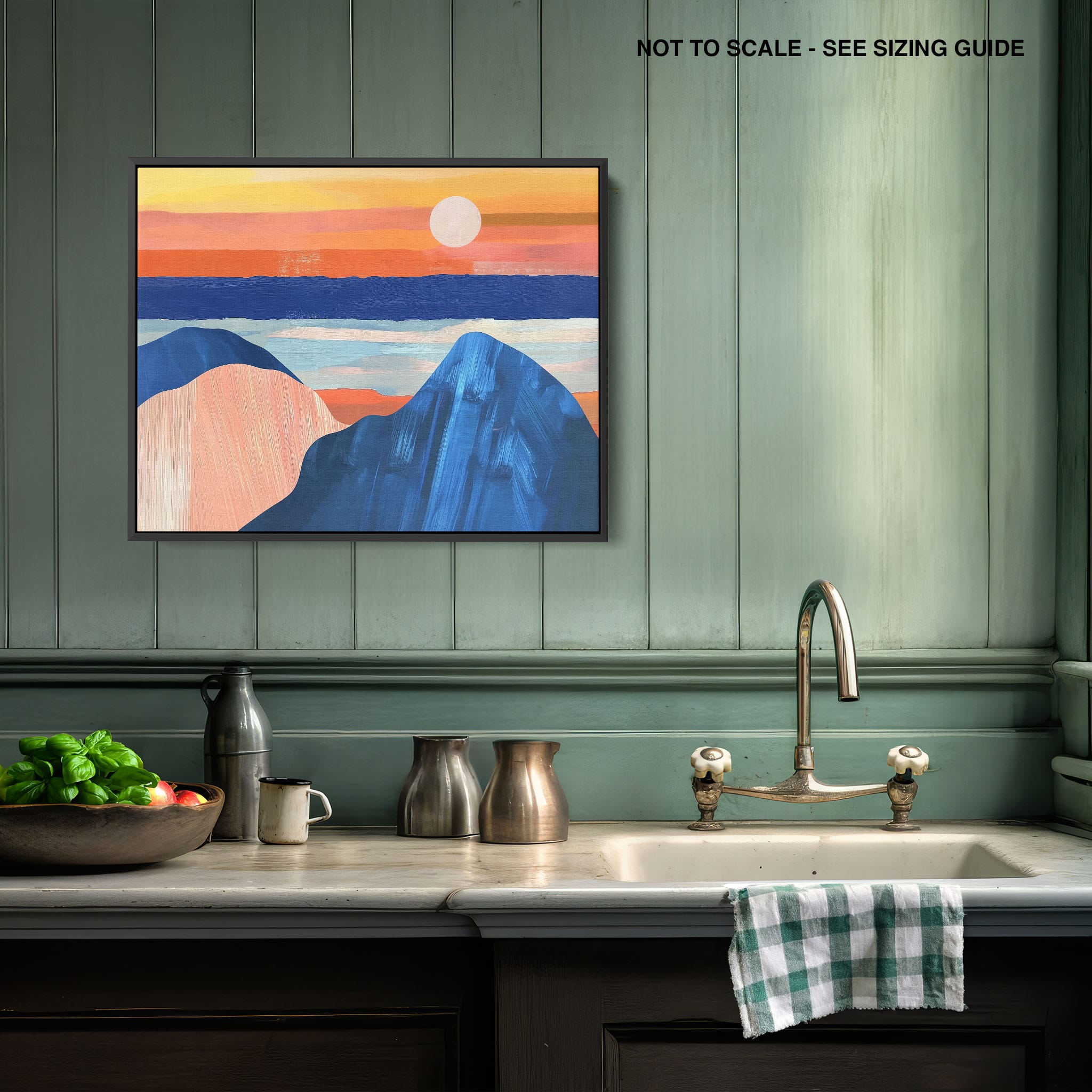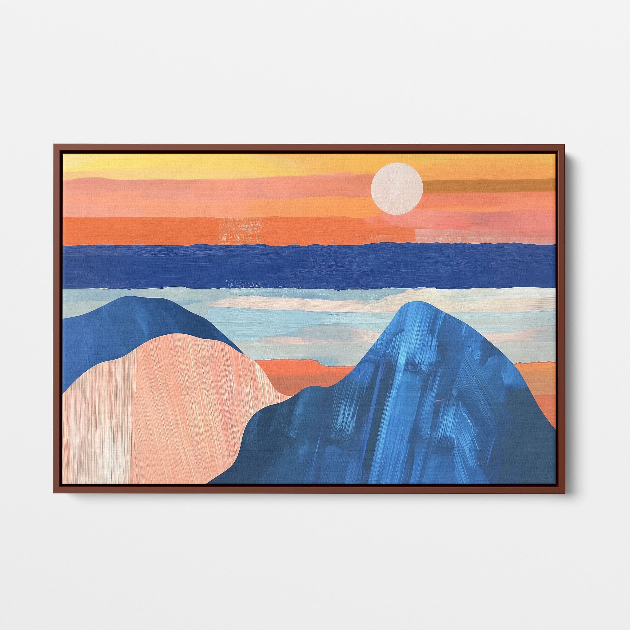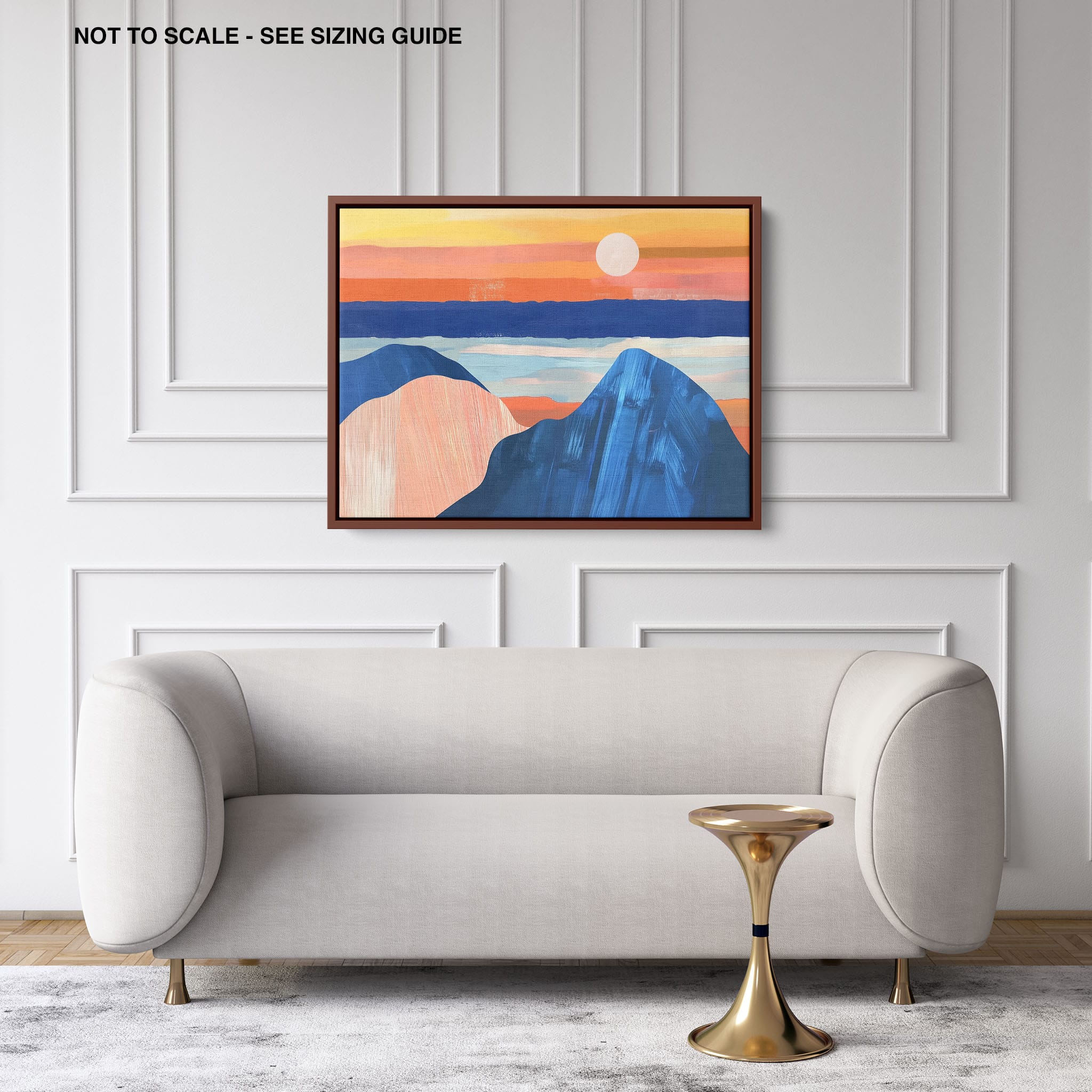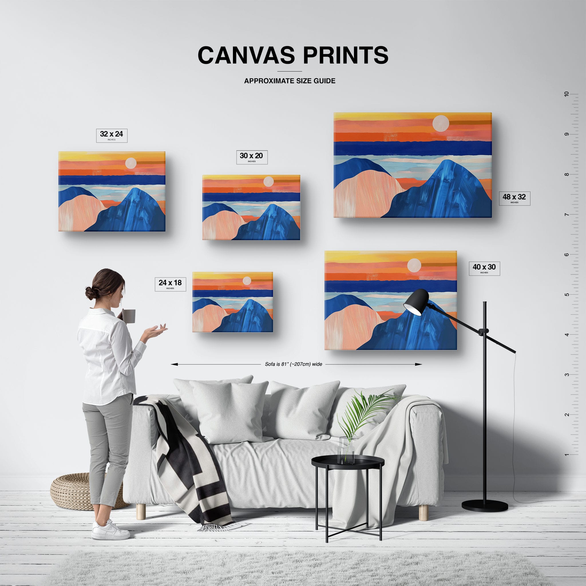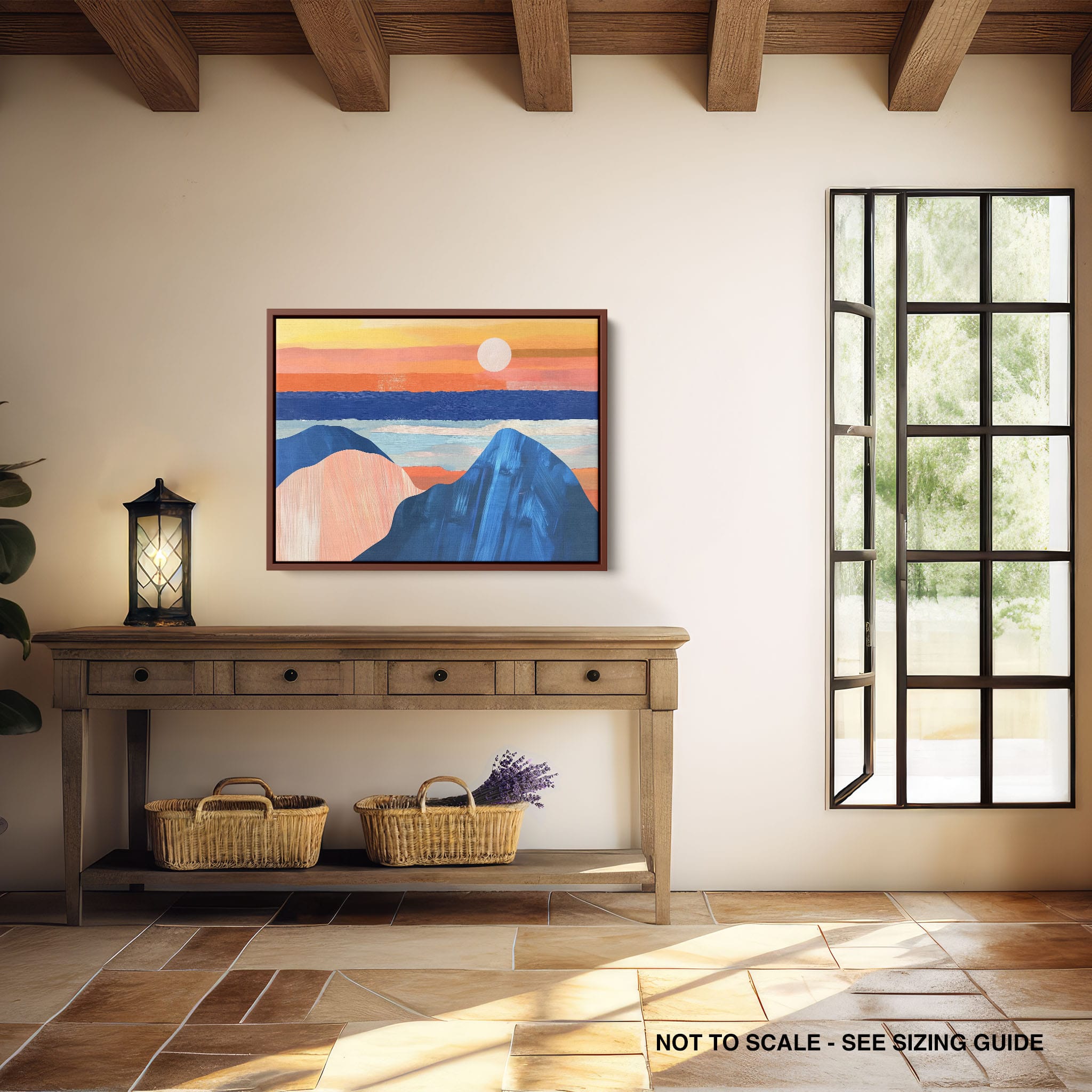 Experience the peaceful serenity of Sunrise Over Abstract Mountains, a compelling digital artwork that captures the beauty of nature in an abstract form. Bold, sweeping strokes and a warm color palette evoke the first light of day spreading over stylized mountain peaks. This piece masterfully combines hues of blue, orange, and peach, creating a harmonious blend that appeals to modern art lovers seeking a soothing yet dynamic piece for their spaces. Perfect for adding a touch of abstract elegance and modern style to any room, this artwork invites viewers to enjoy the tranquility and beauty of an idealized landscape.