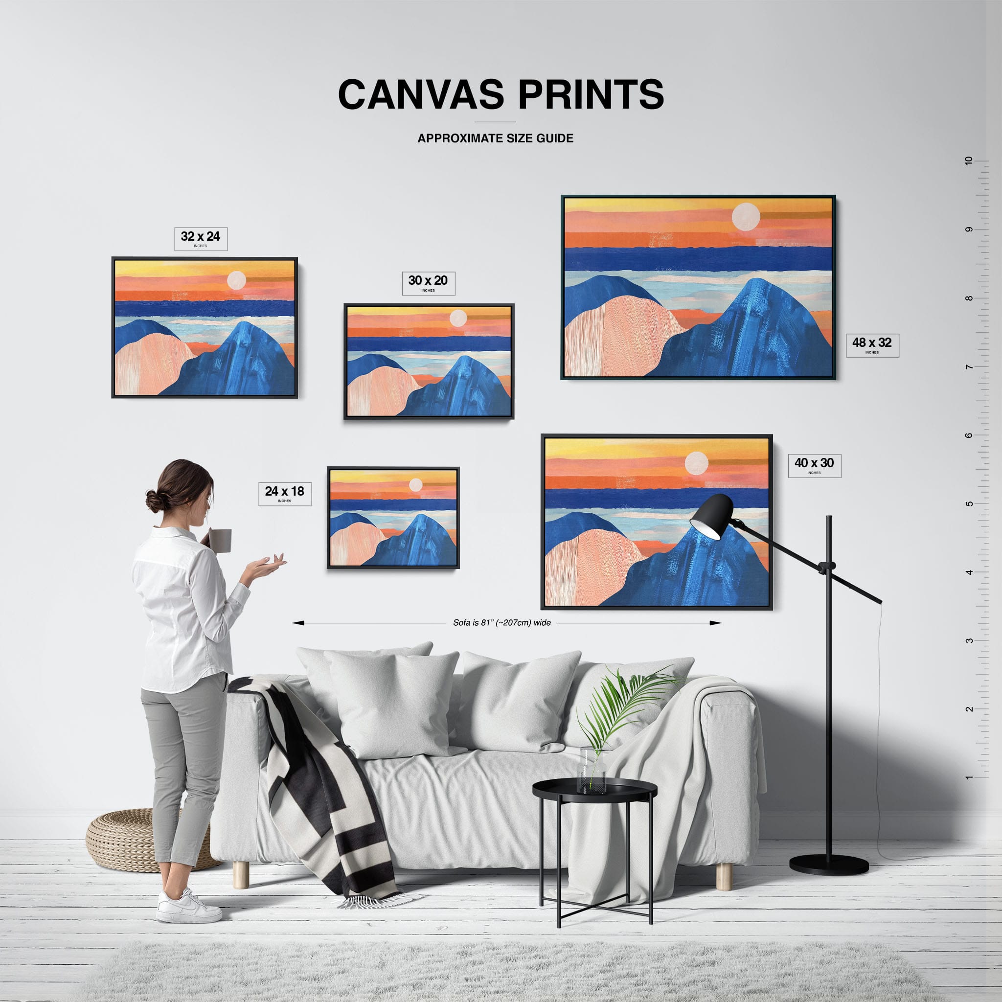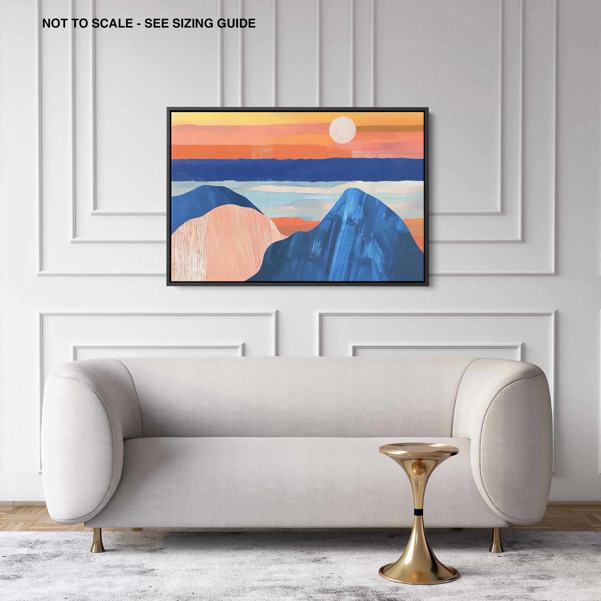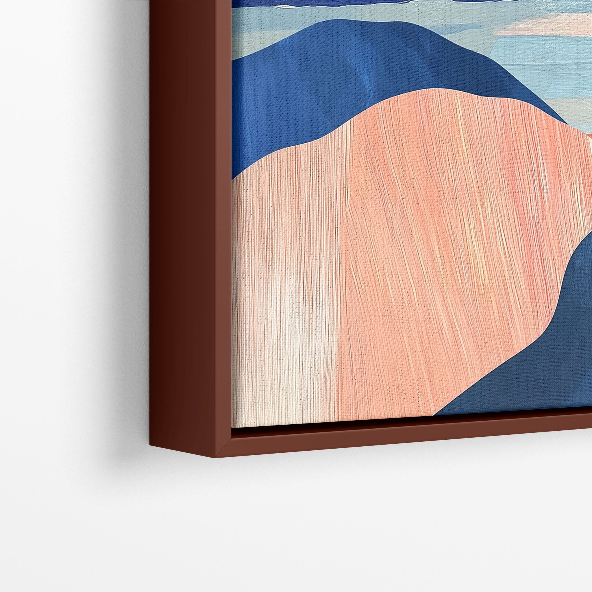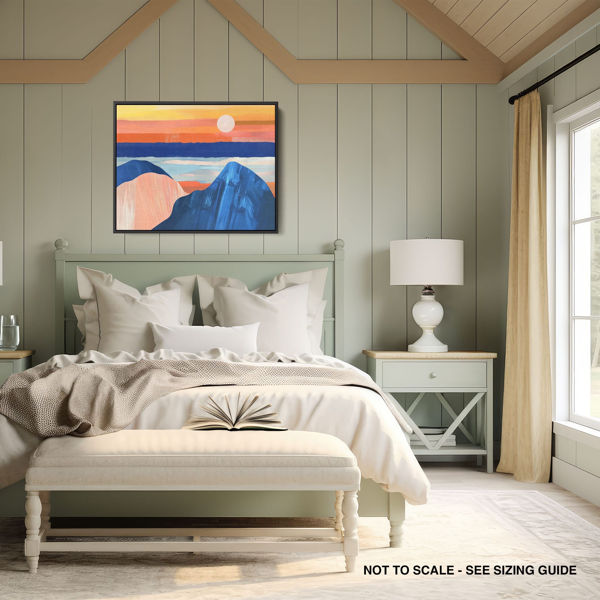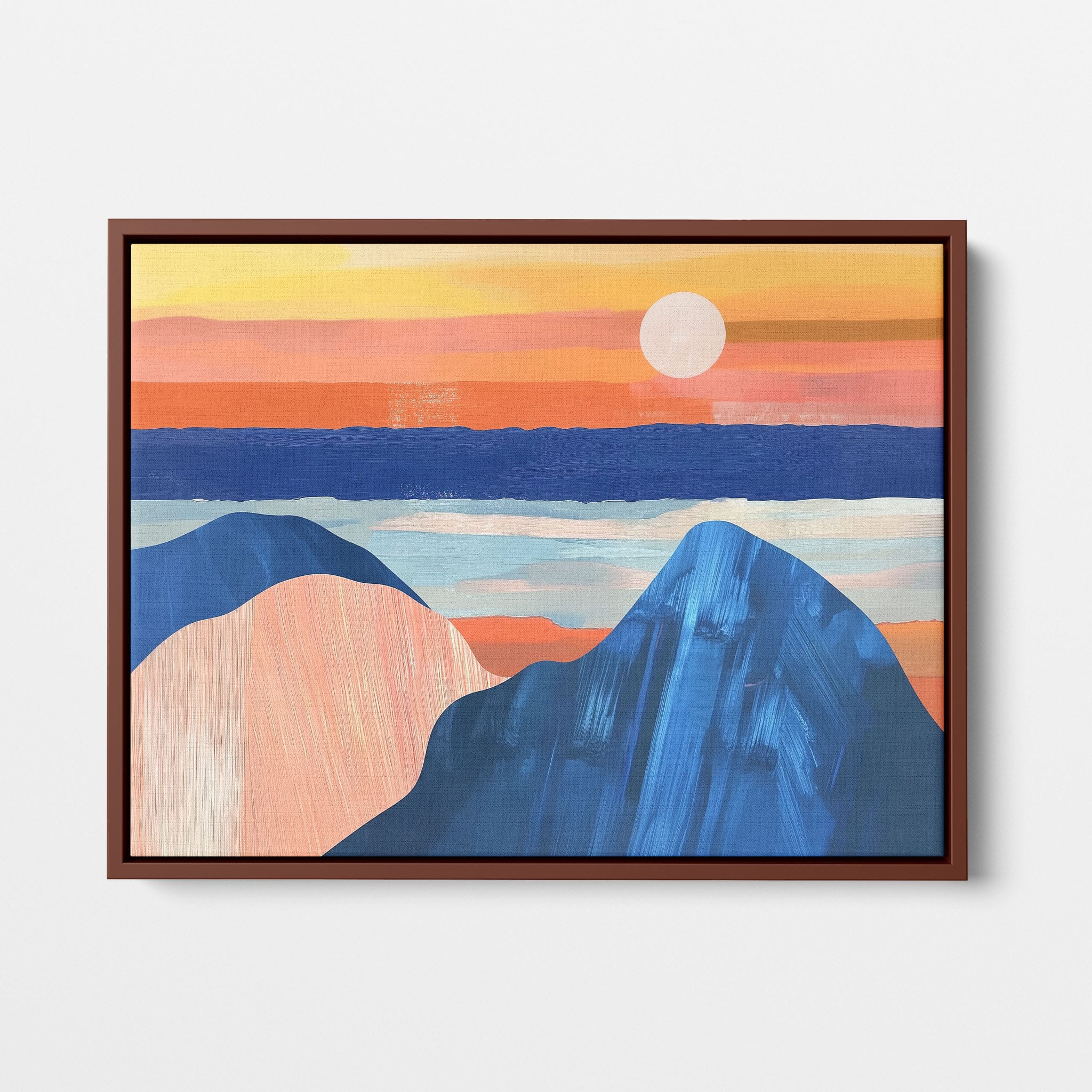 Experience the peaceful serenity of Sunrise Over Abstract Mountains, a compelling digital artwork that captures the beauty of nature in an abstract form. Bold, sweeping strokes and a warm color palette evoke the first light of day spreading over stylized mountain peaks. This piece masterfully combines hues of blue, orange, and peach, creating a harmonious blend that appeals to modern art lovers seeking a soothing yet dynamic piece for their spaces. Perfect for adding a touch of abstract elegance and modern style to any room, this artwork invites viewers to enjoy the tranquility and beauty of an idealized landscape.