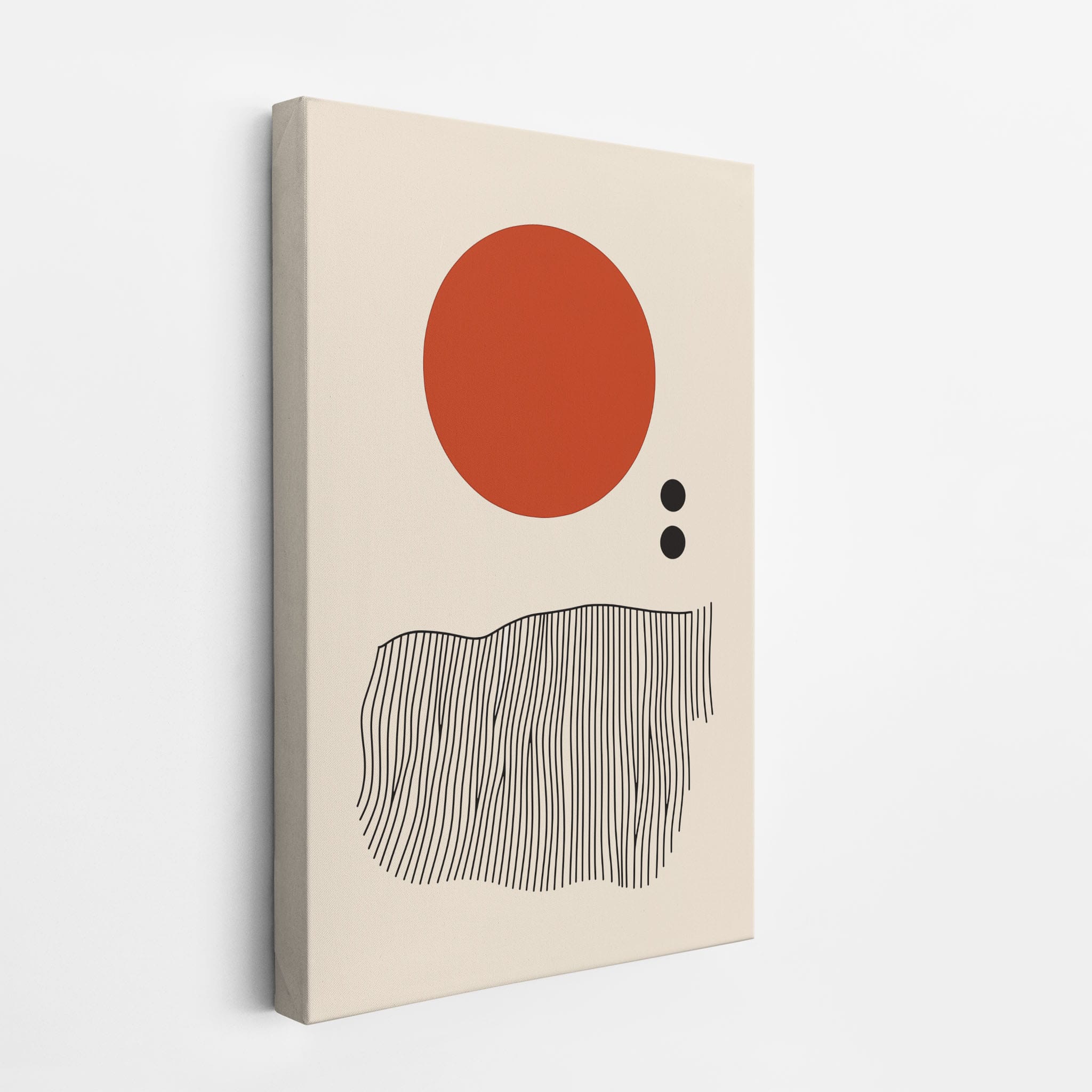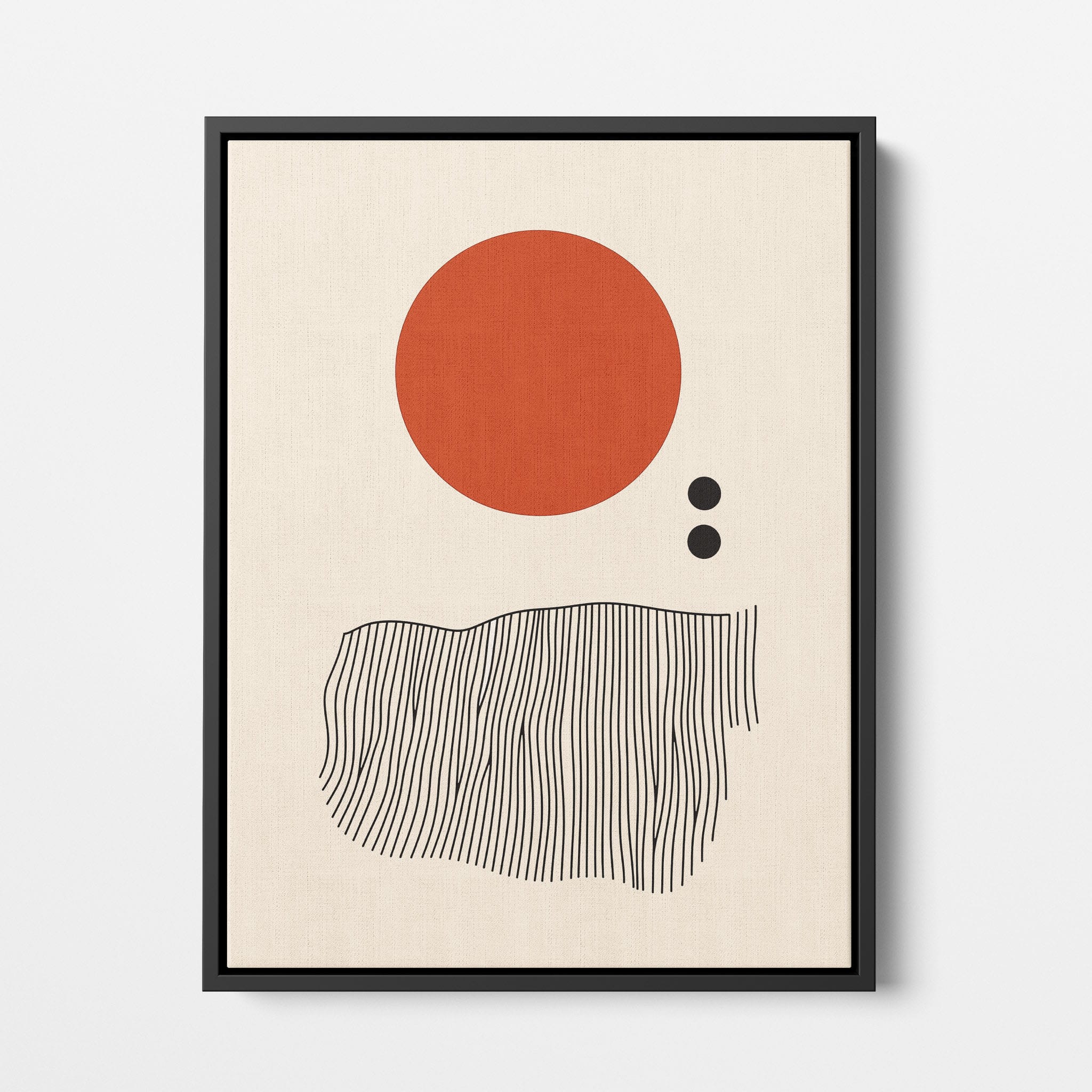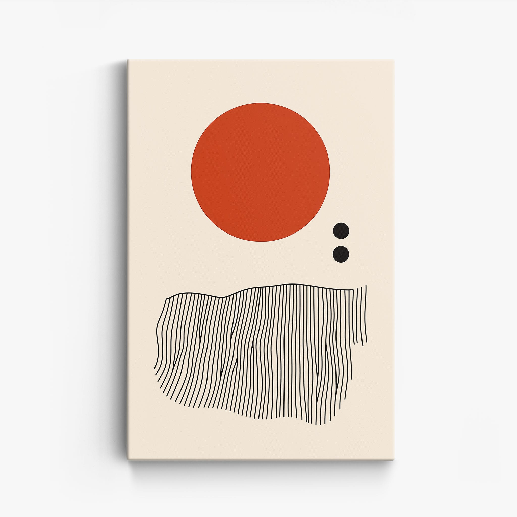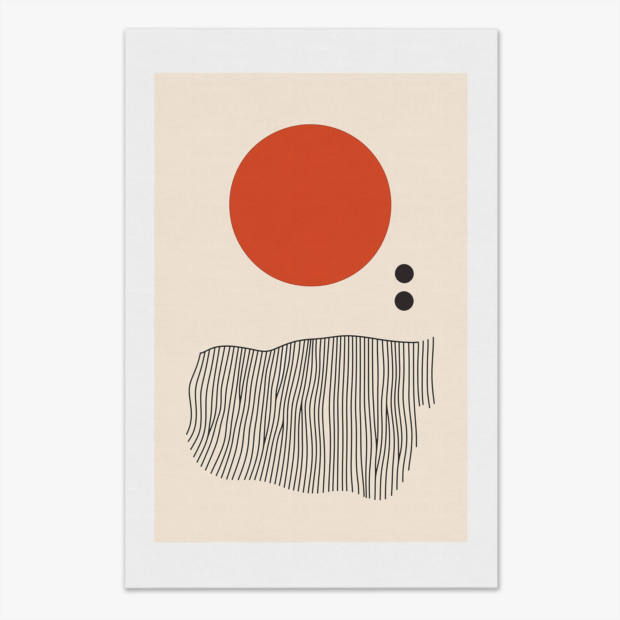 This digital illustration showcases an intriguing arrangement of geometric forms and minimalistic design. A bold red circle dominates the upper part of the canvas, strikingly set against a crisp, cream background. Below it, a series of black lines wave rhythmically, resembling a textured landscape or waves. The use of monochromatic black dots adds balance, creating a subtle yet effective contrast. Perfect for modern art lovers looking for a piece that combines simplicity with depth, this artwork could elegantly complement both residential and corporate spaces, infusing them with a touch of contemporary minimalism and stark geometric beauty.