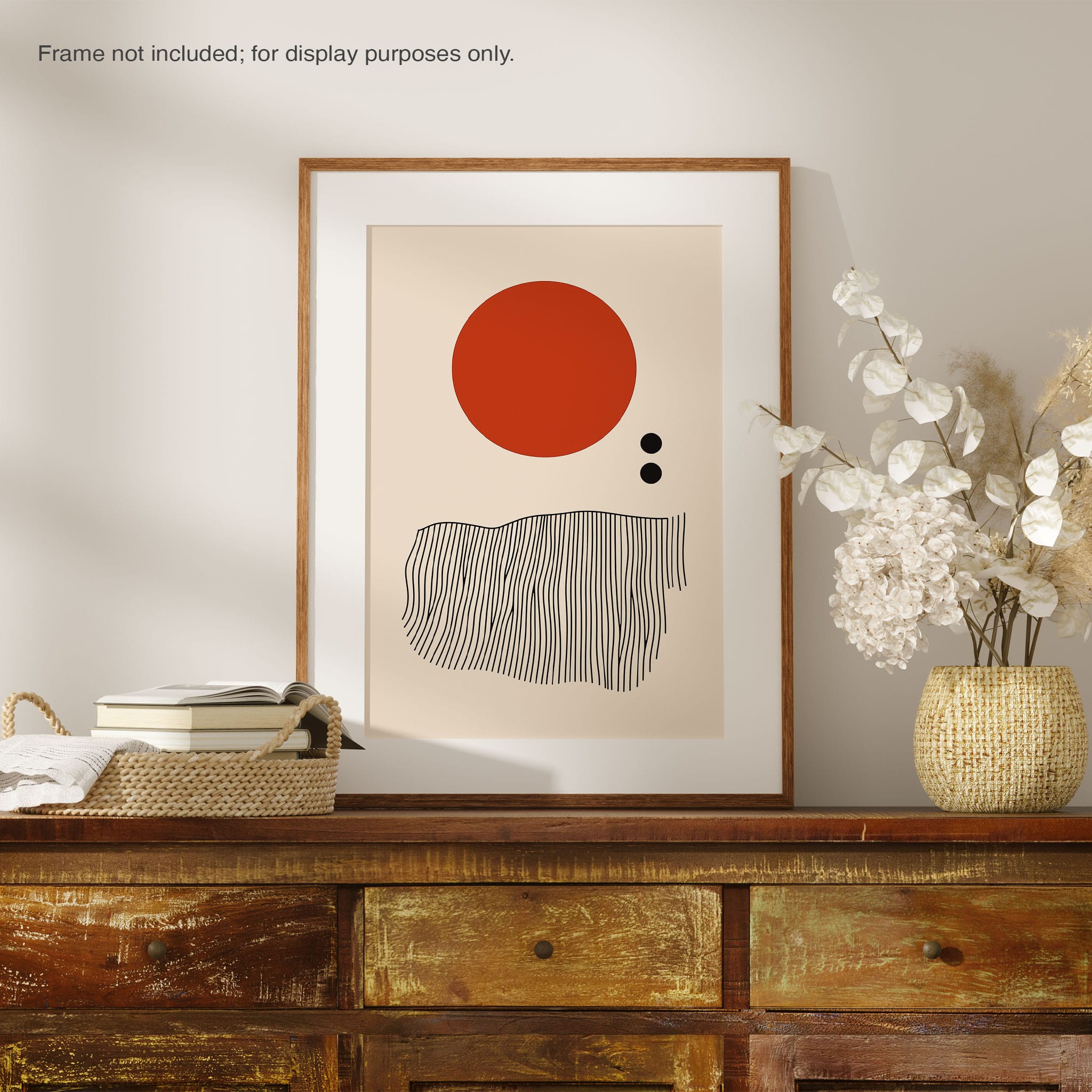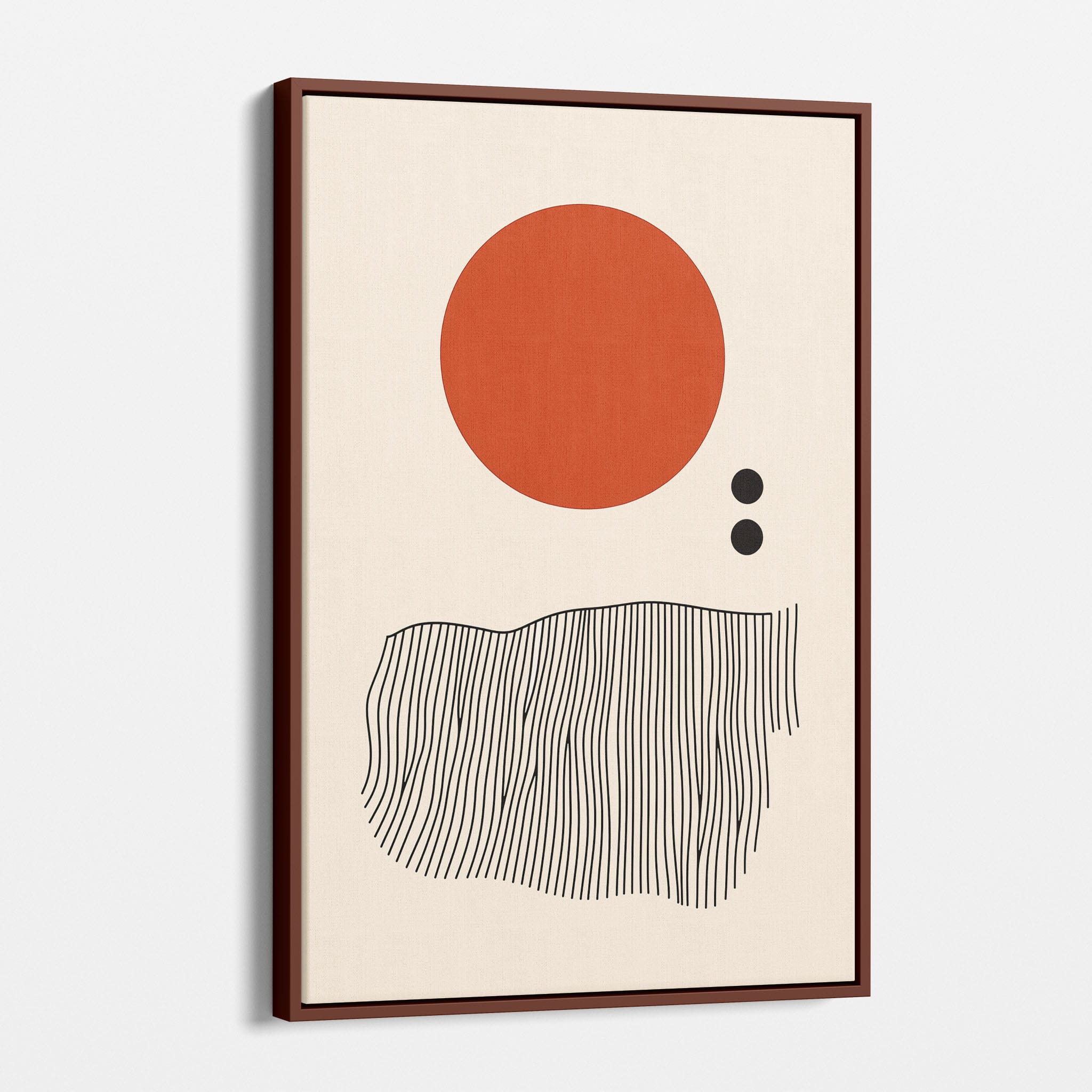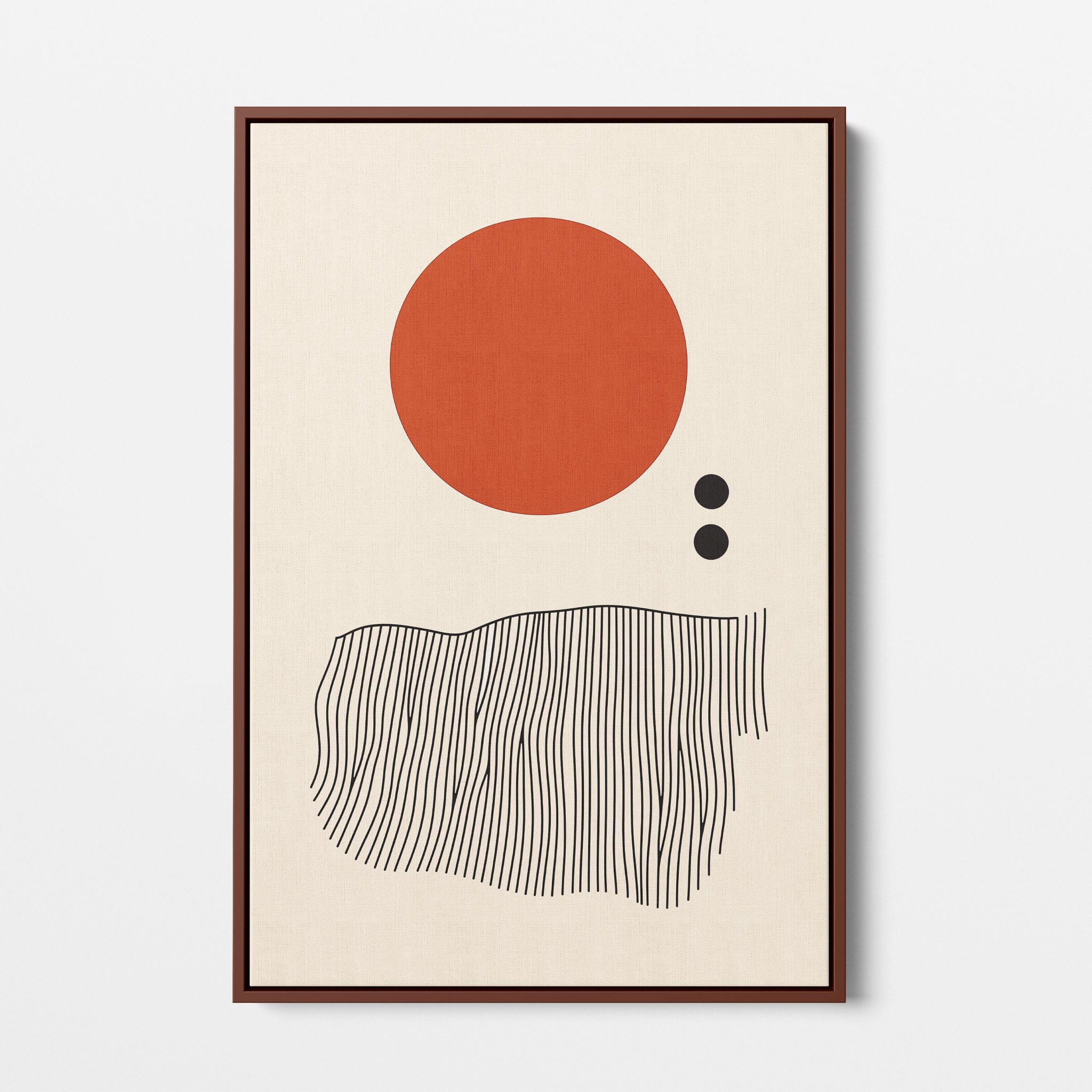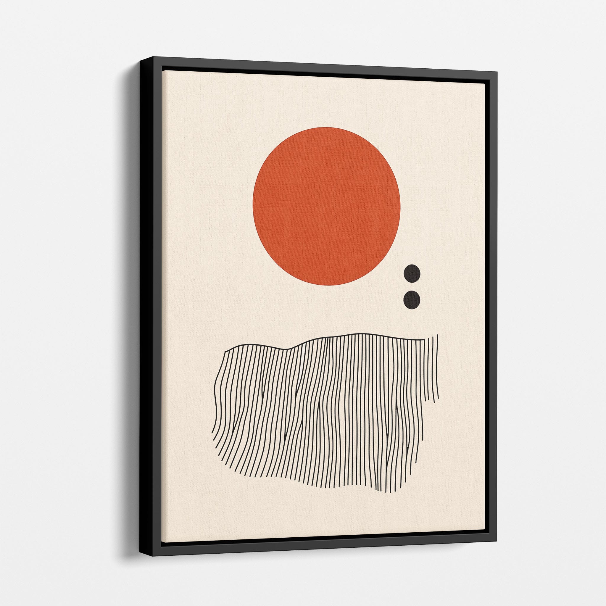 This digital illustration showcases an intriguing arrangement of geometric forms and minimalistic design. A bold red circle dominates the upper part of the canvas, strikingly set against a crisp, cream background. Below it, a series of black lines wave rhythmically, resembling a textured landscape or waves. The use of monochromatic black dots adds balance, creating a subtle yet effective contrast. Perfect for modern art lovers looking for a piece that combines simplicity with depth, this artwork could elegantly complement both residential and corporate spaces, infusing them with a touch of contemporary minimalism and stark geometric beauty.