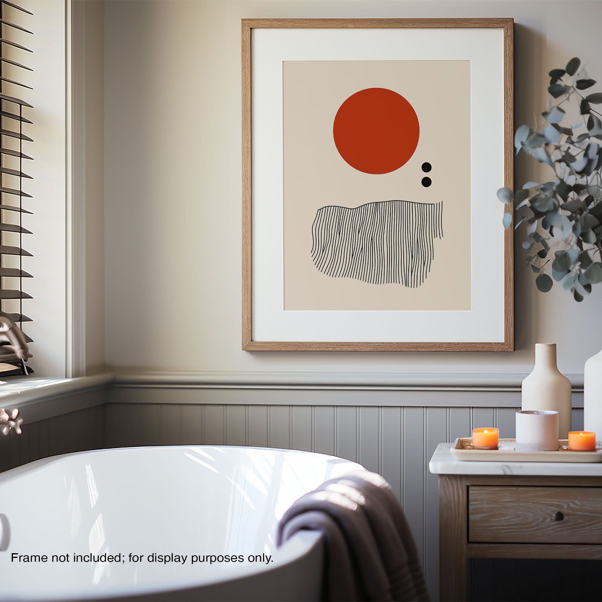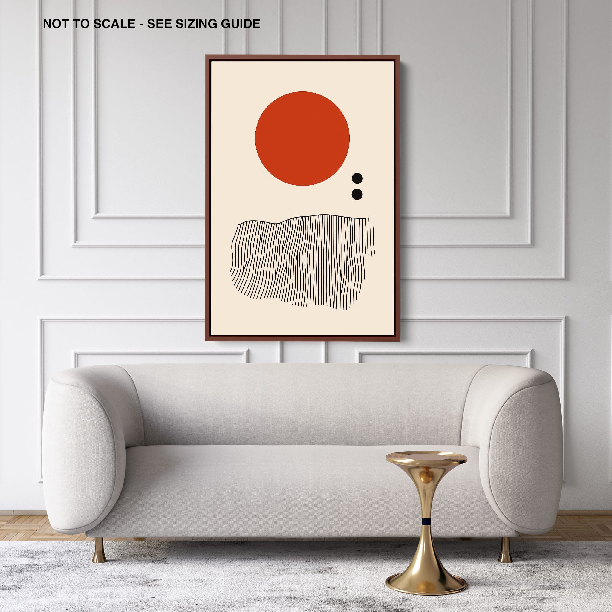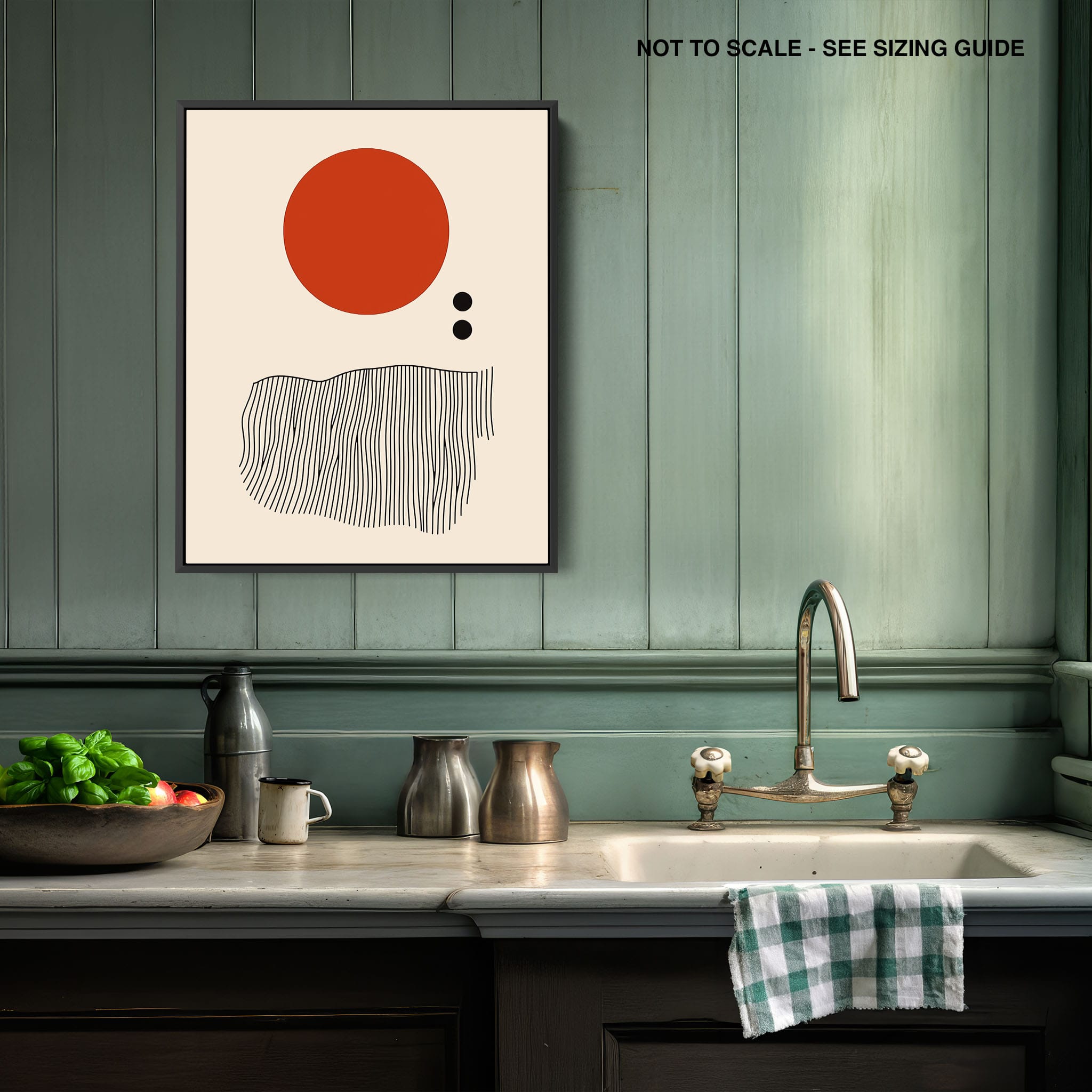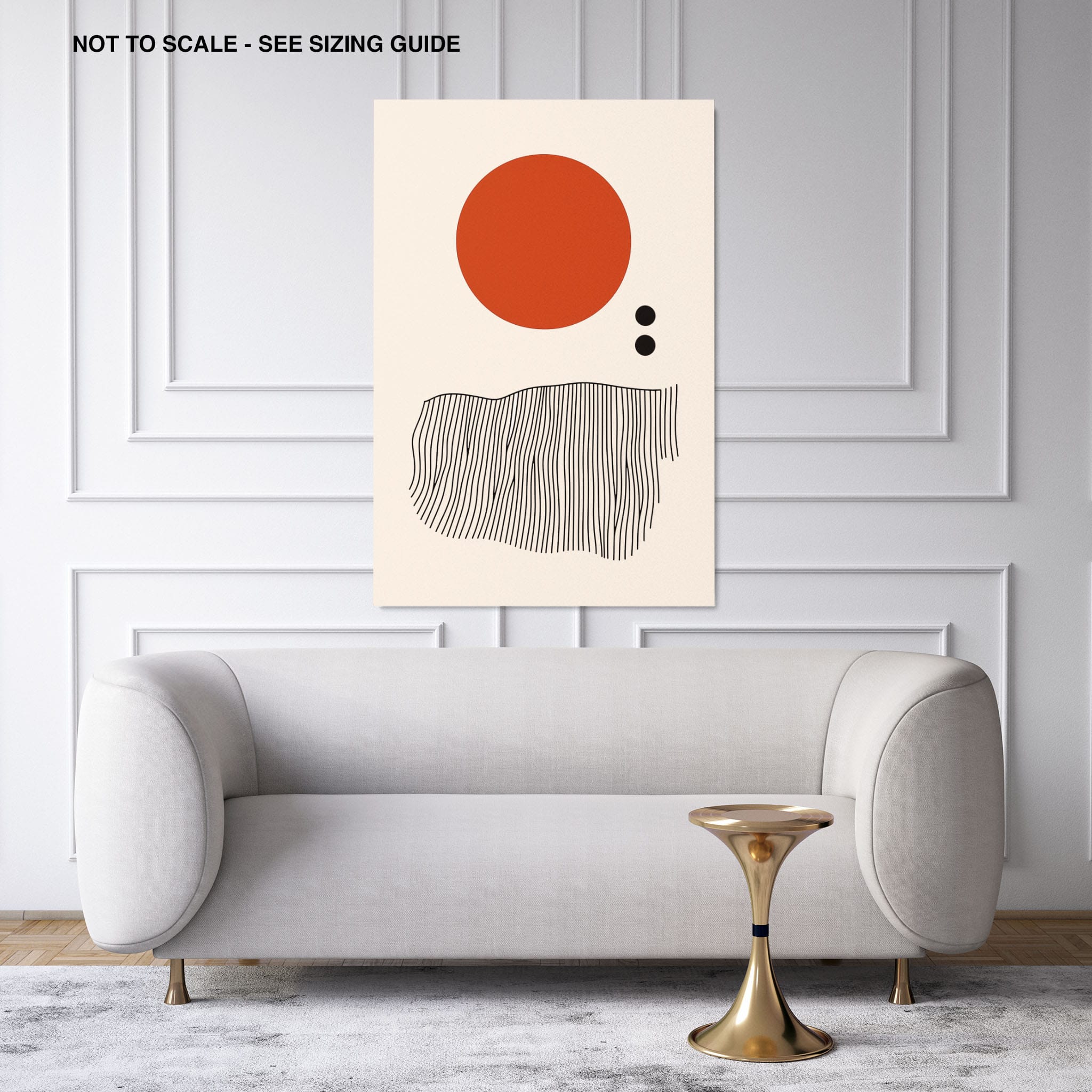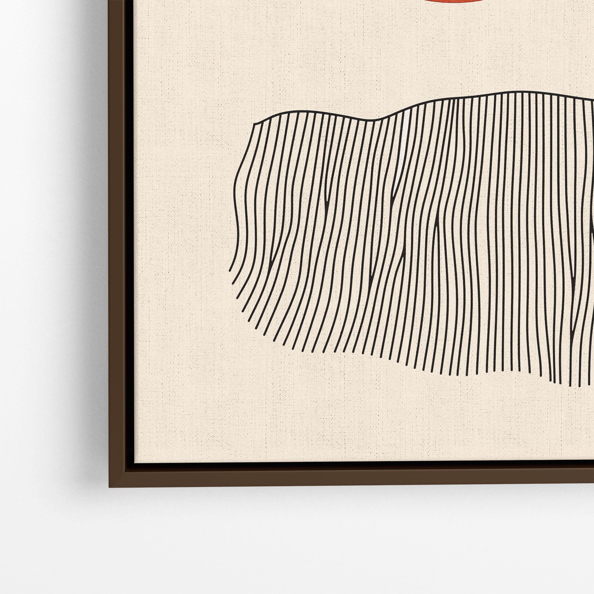 This digital illustration showcases an intriguing arrangement of geometric forms and minimalistic design. A bold red circle dominates the upper part of the canvas, strikingly set against a crisp, cream background. Below it, a series of black lines wave rhythmically, resembling a textured landscape or waves. The use of monochromatic black dots adds balance, creating a subtle yet effective contrast. Perfect for modern art lovers looking for a piece that combines simplicity with depth, this artwork could elegantly complement both residential and corporate spaces, infusing them with a touch of contemporary minimalism and stark geometric beauty.