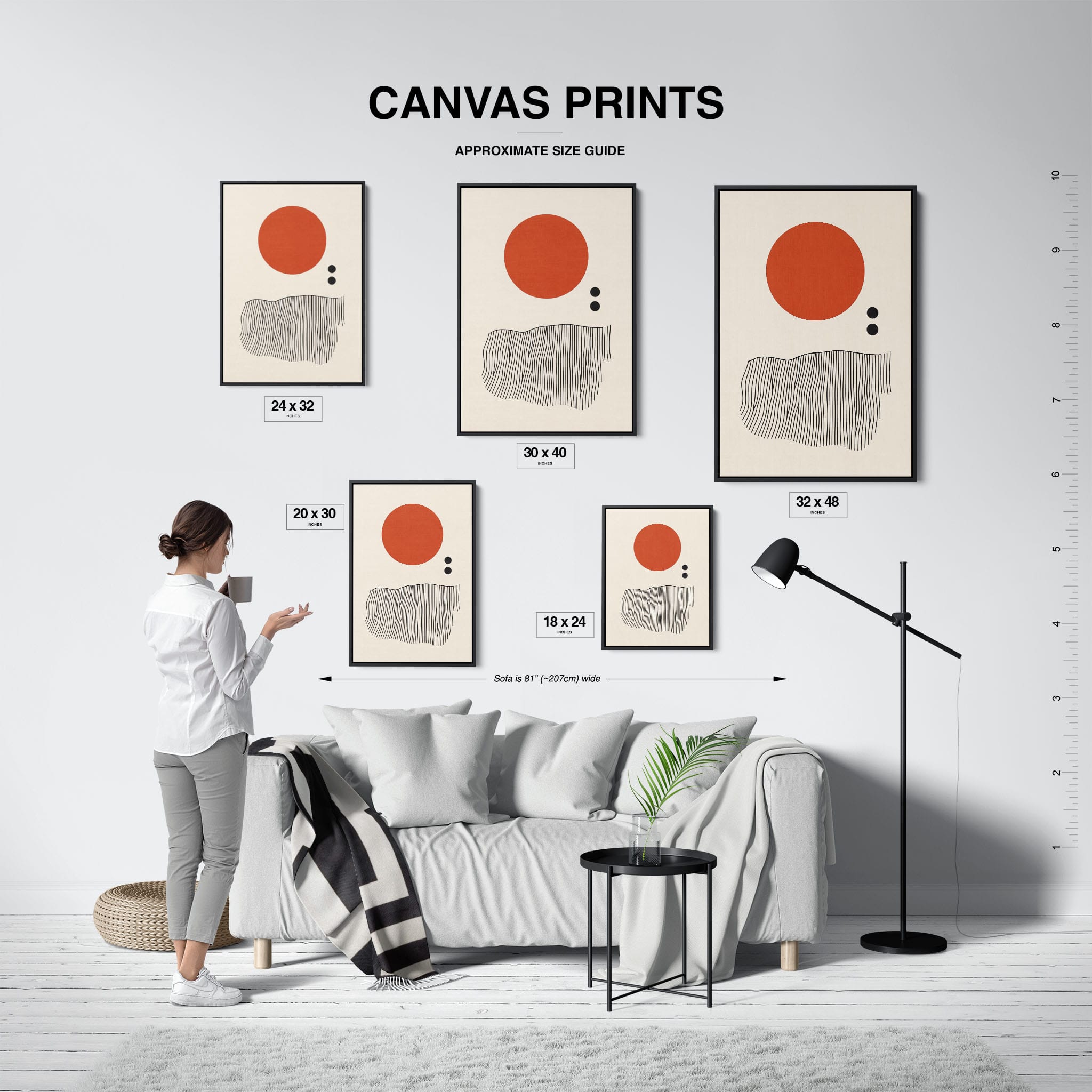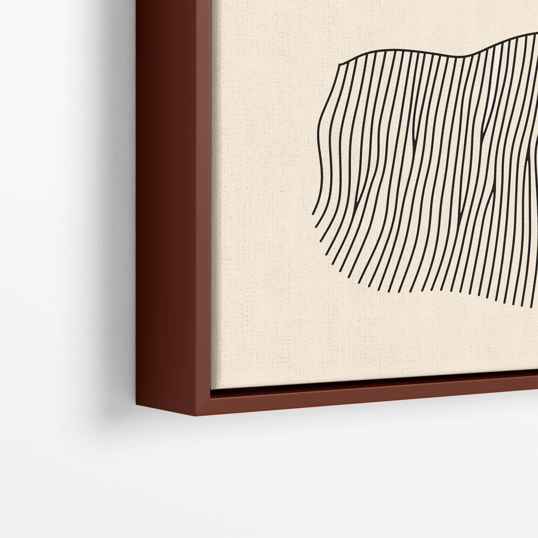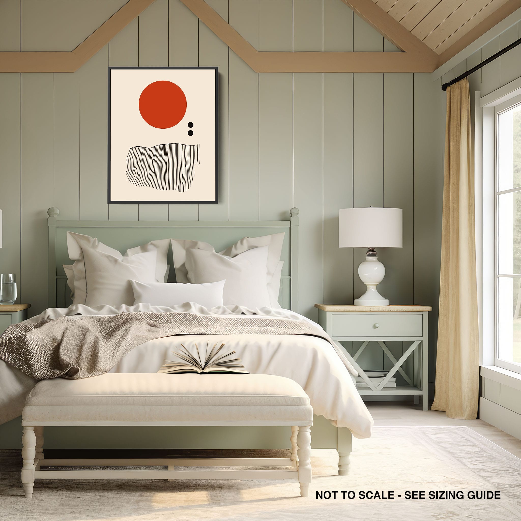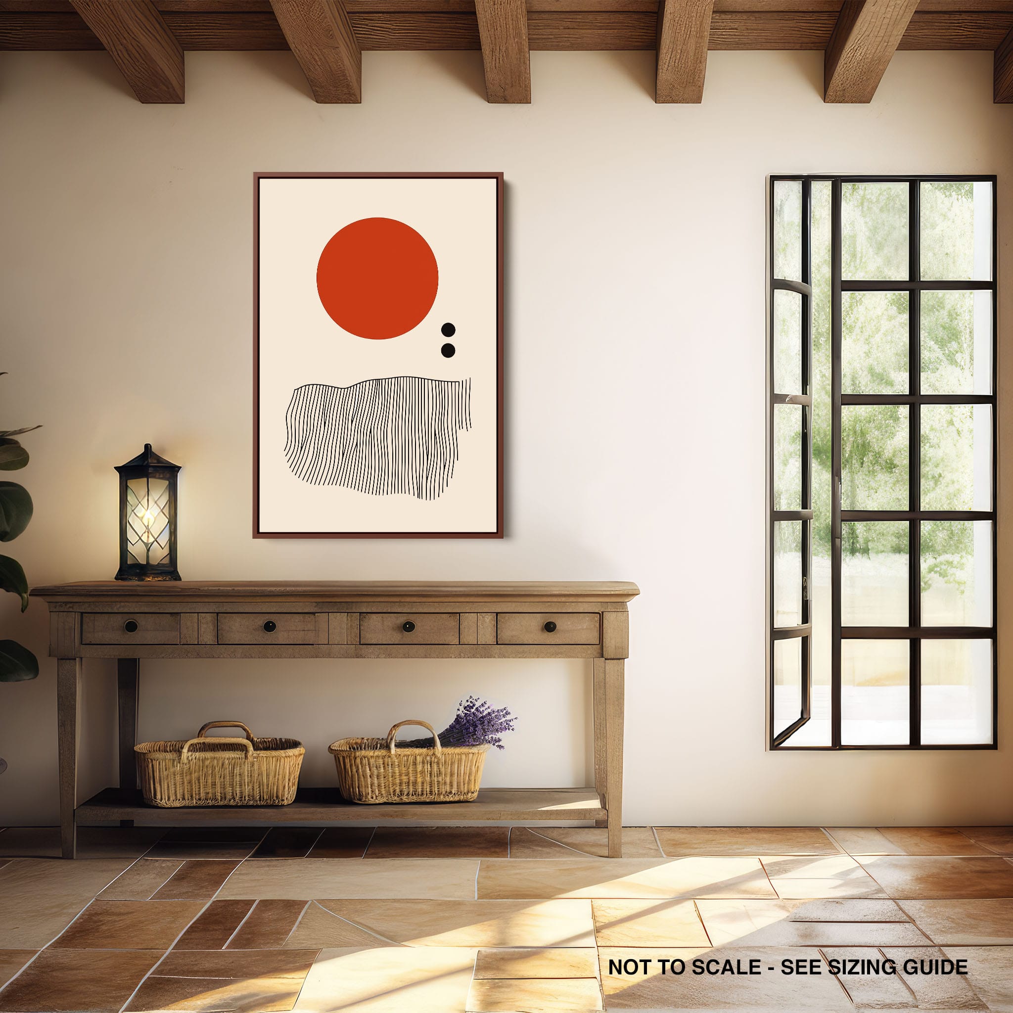 This digital illustration showcases an intriguing arrangement of geometric forms and minimalistic design. A bold red circle dominates the upper part of the canvas, strikingly set against a crisp, cream background. Below it, a series of black lines wave rhythmically, resembling a textured landscape or waves. The use of monochromatic black dots adds balance, creating a subtle yet effective contrast. Perfect for modern art lovers looking for a piece that combines simplicity with depth, this artwork could elegantly complement both residential and corporate spaces, infusing them with a touch of contemporary minimalism and stark geometric beauty.