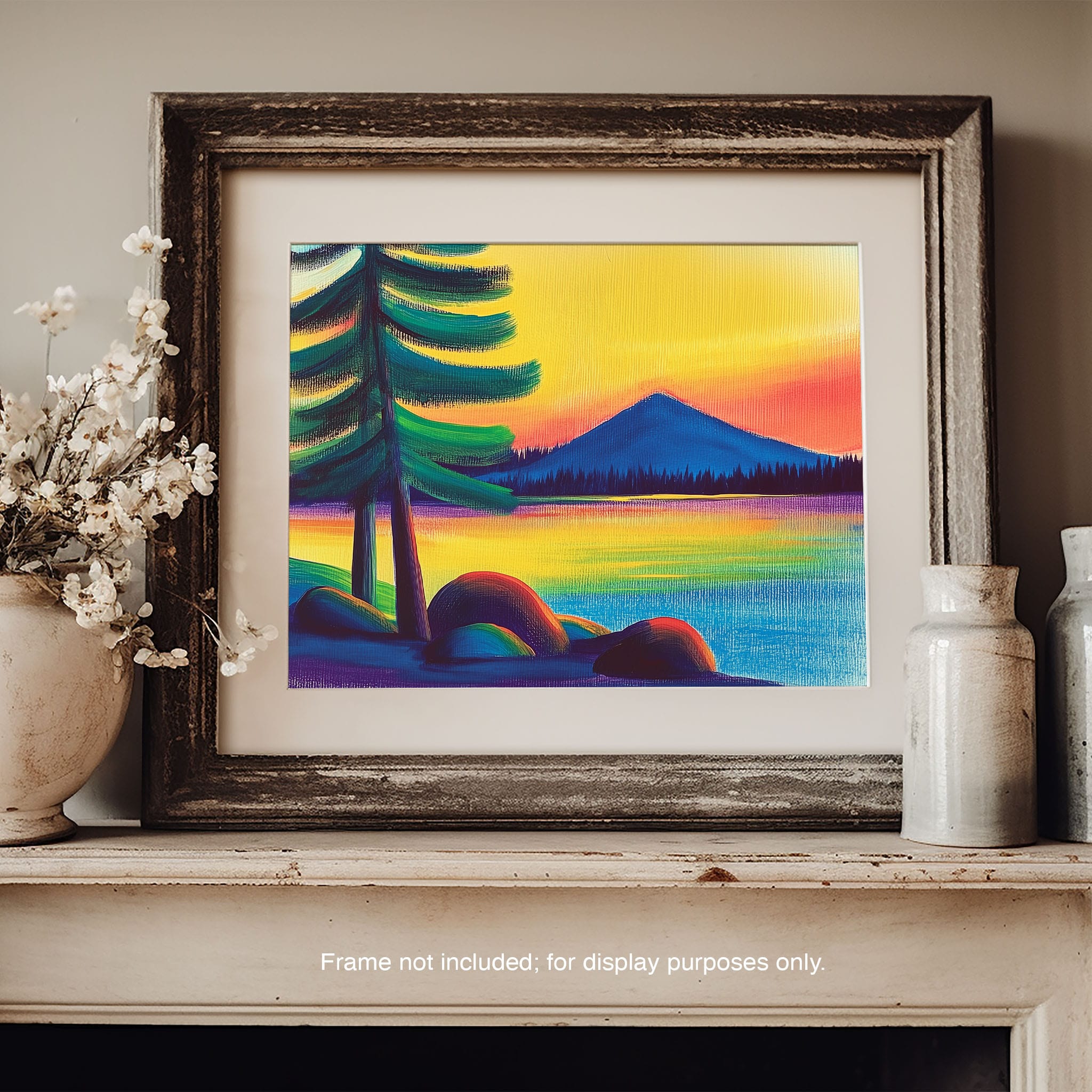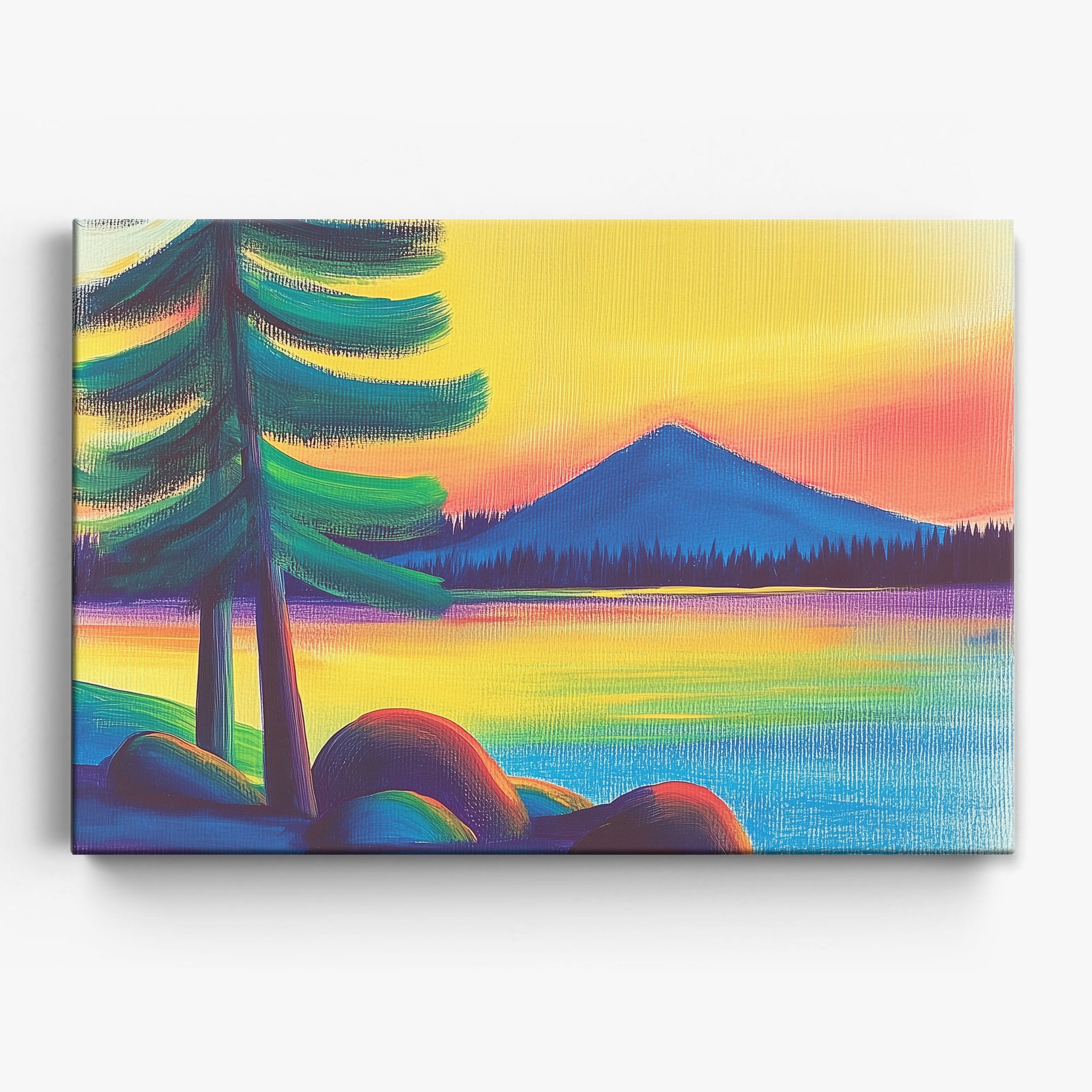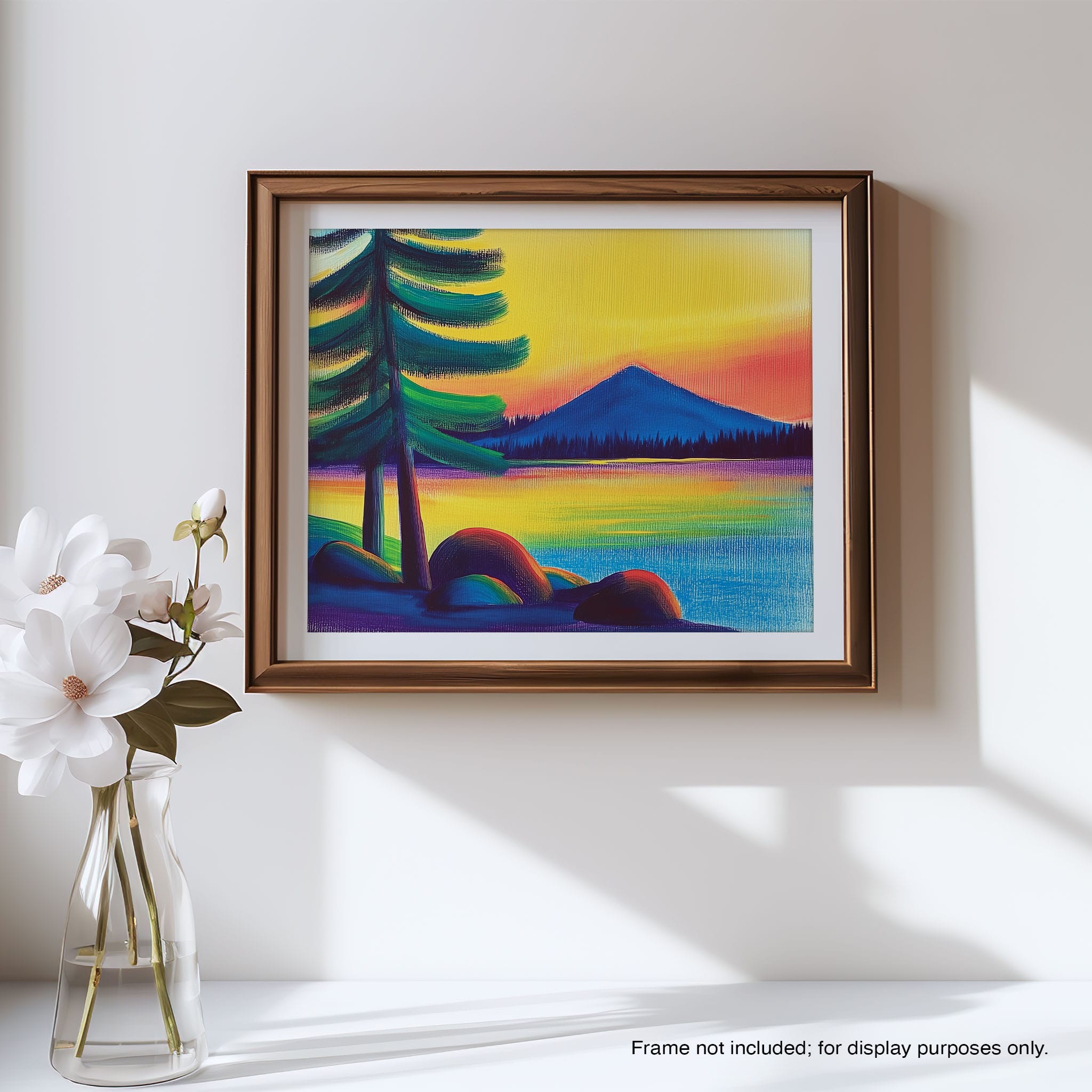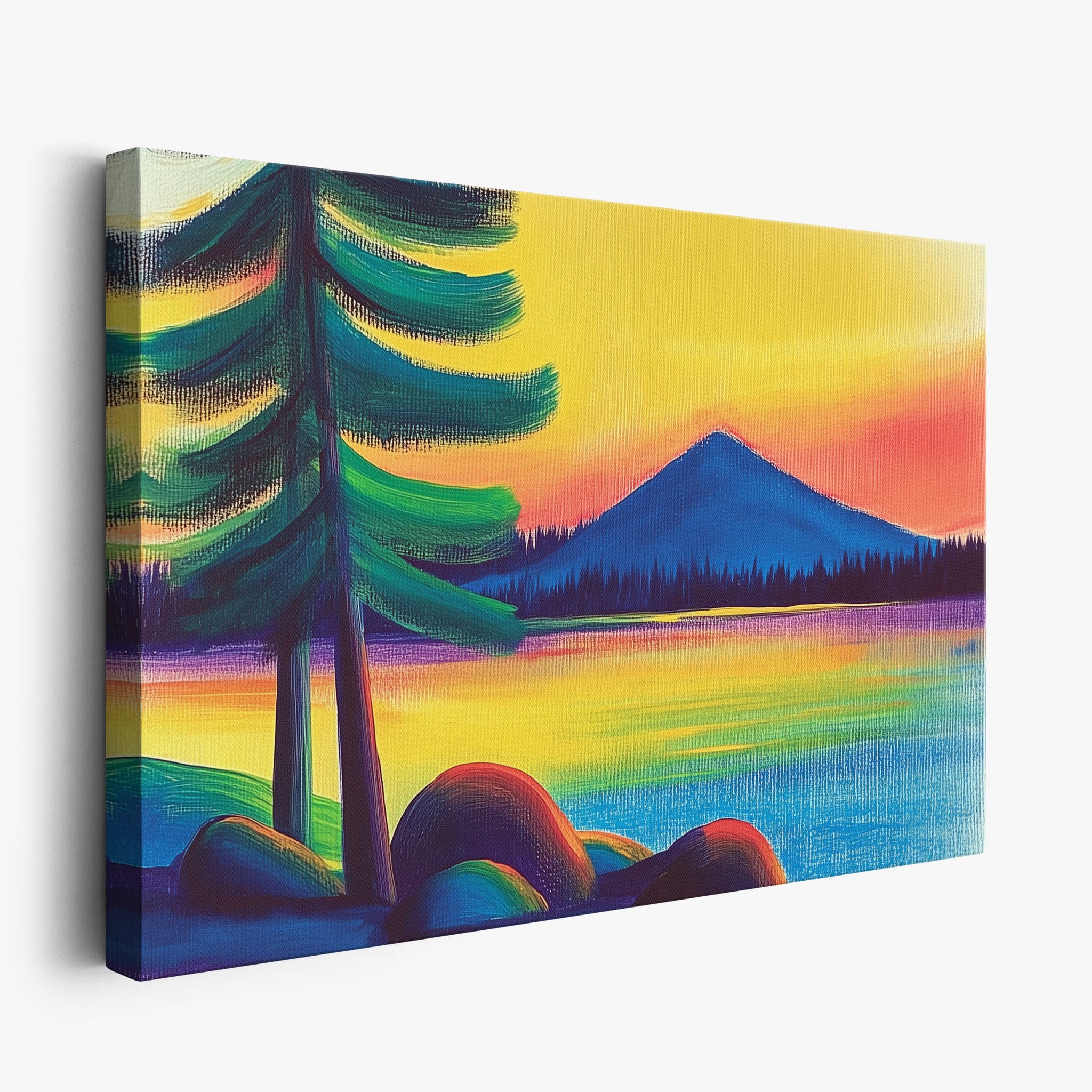 This striking painting captures a serene lakeside at sunset, with vibrantly expressed hues casting a spell over the scenery. Strong brushstrokes depict the tranquility of a mountain backdrop, mirrored waters, and silhouetted pines standing tall against a tapestry of orange, purple, and blue. Perfect for modern art lovers, this piece brings a touch of calm modernity and expressive color to any space, making it an ideal choice for those looking to enhance their living or work environment with a serene yet vibrant visual escape. Add this picturesque scene to your decor and transform any room with its soothing colors and bold expressionist style.