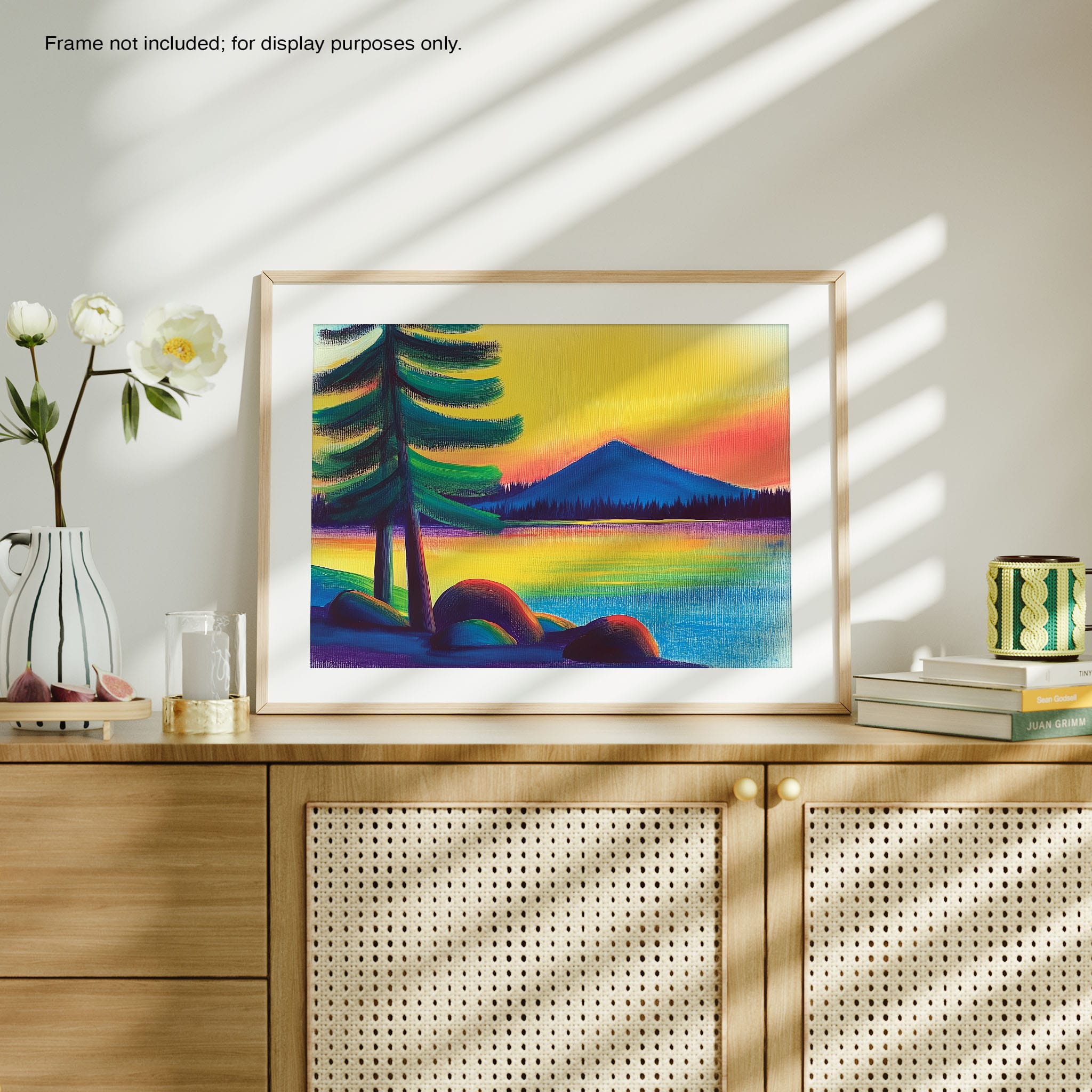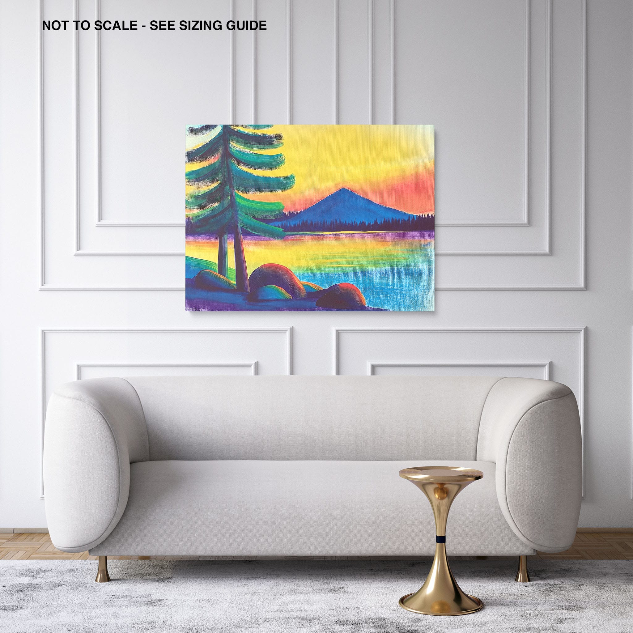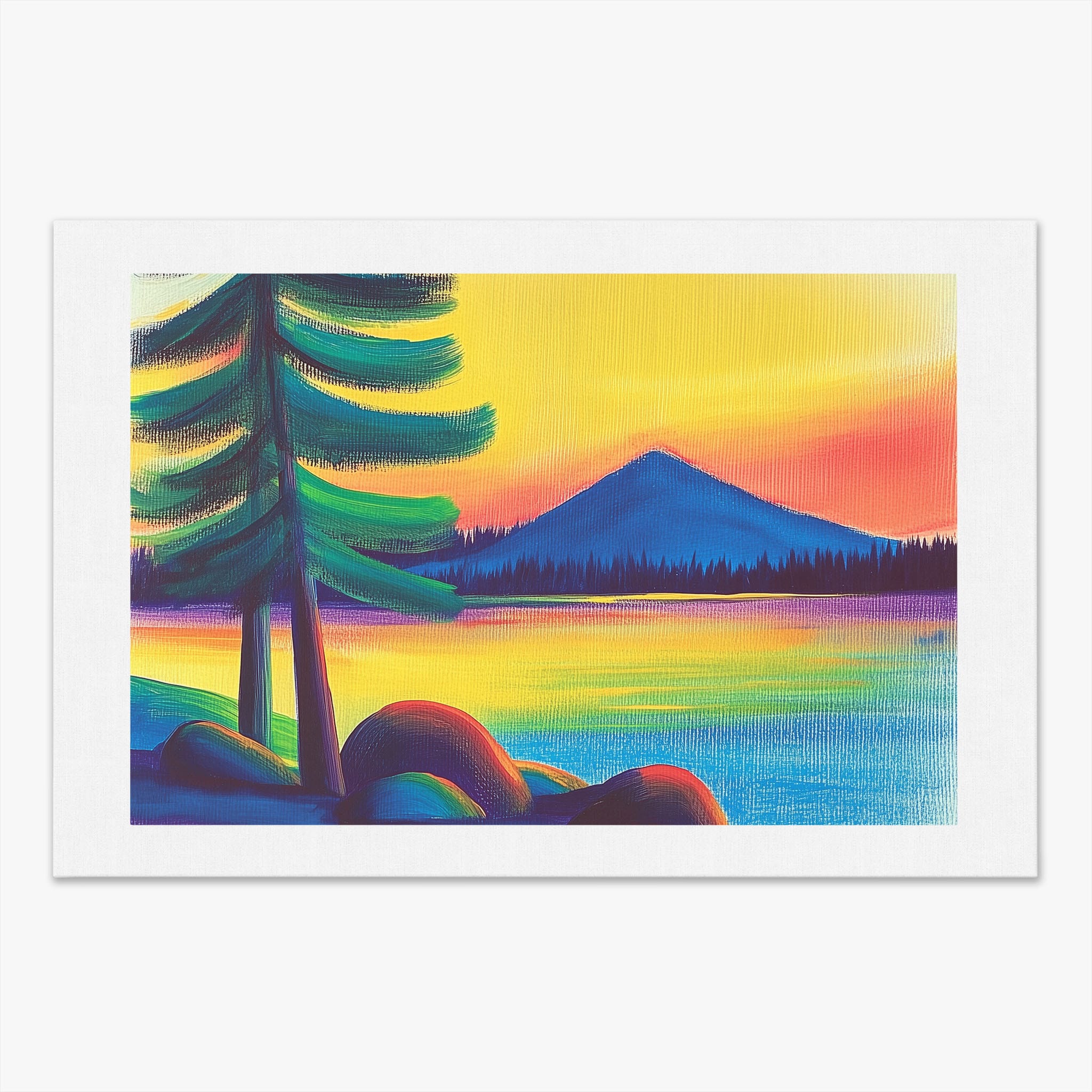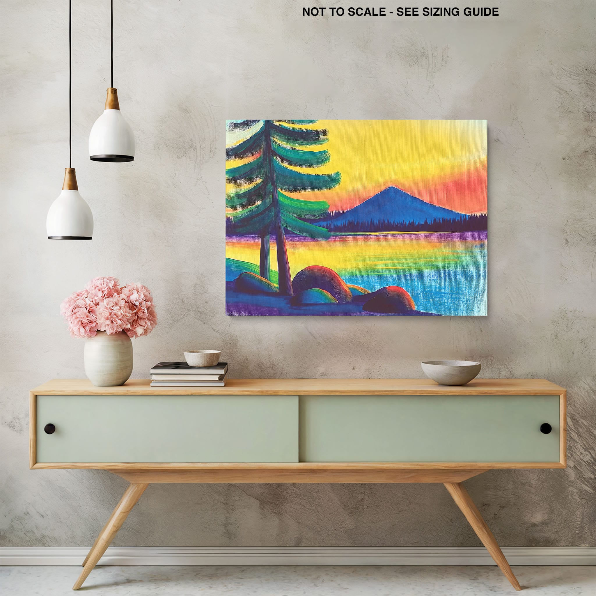 This striking painting captures a serene lakeside at sunset, with vibrantly expressed hues casting a spell over the scenery. Strong brushstrokes depict the tranquility of a mountain backdrop, mirrored waters, and silhouetted pines standing tall against a tapestry of orange, purple, and blue. Perfect for modern art lovers, this piece brings a touch of calm modernity and expressive color to any space, making it an ideal choice for those looking to enhance their living or work environment with a serene yet vibrant visual escape. Add this picturesque scene to your decor and transform any room with its soothing colors and bold expressionist style.