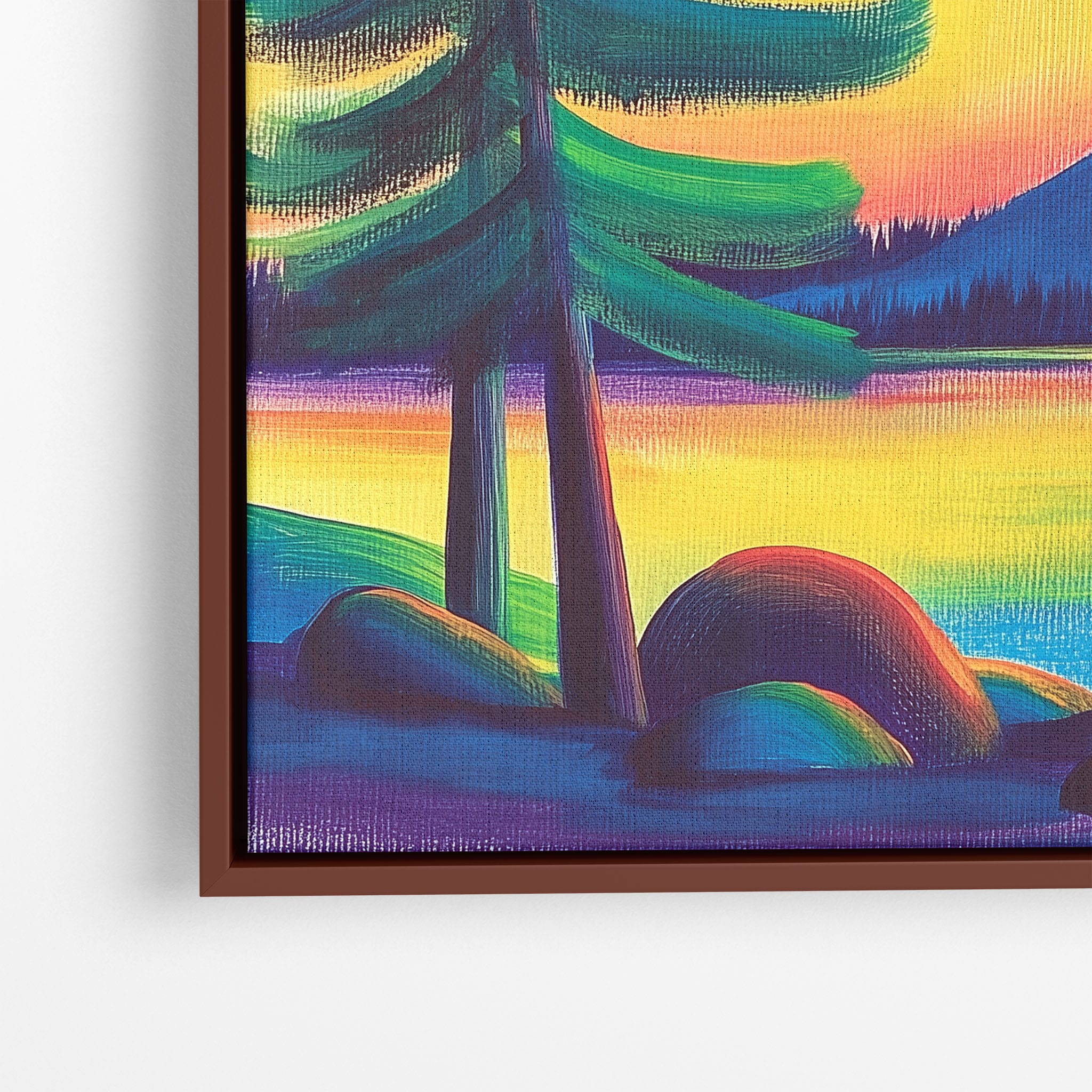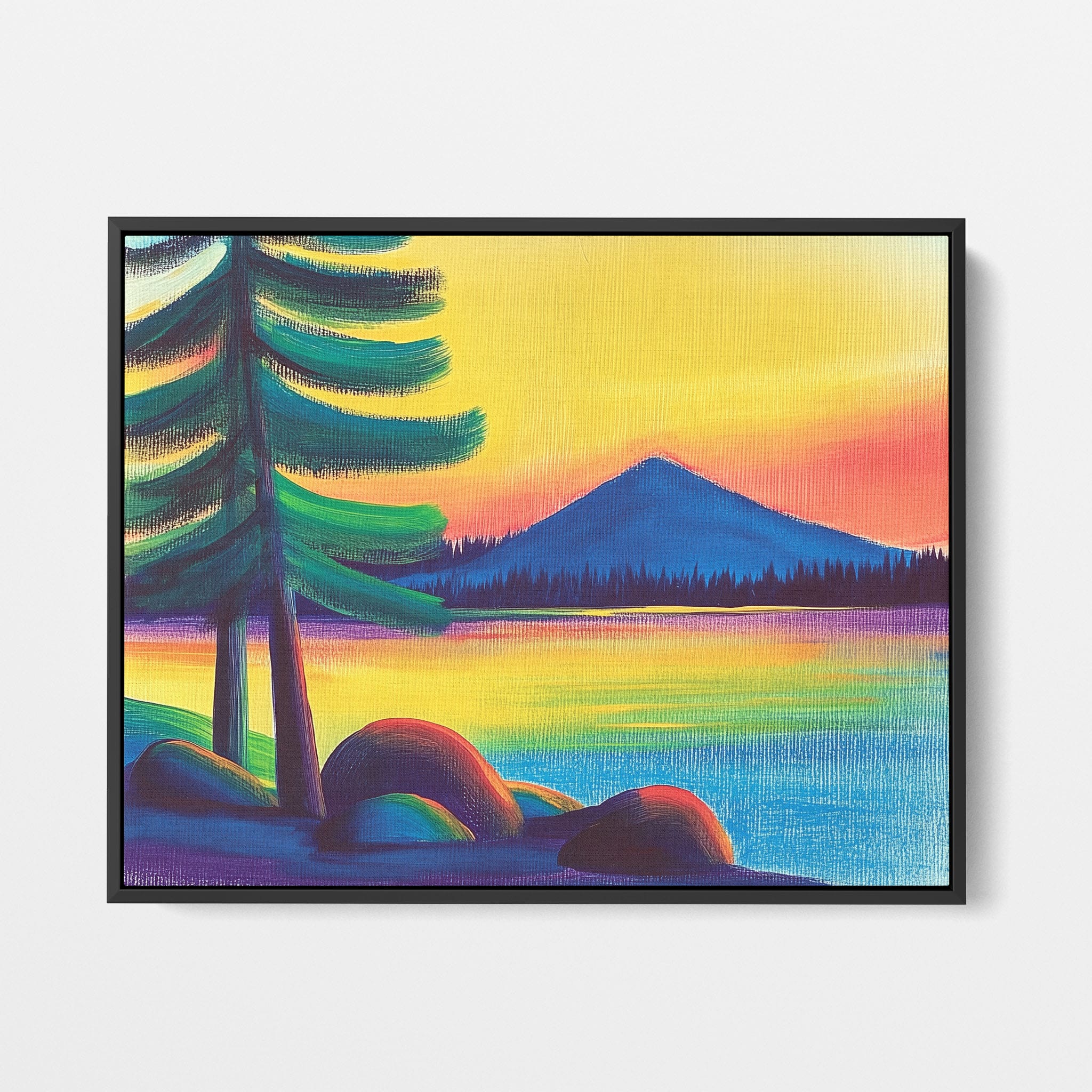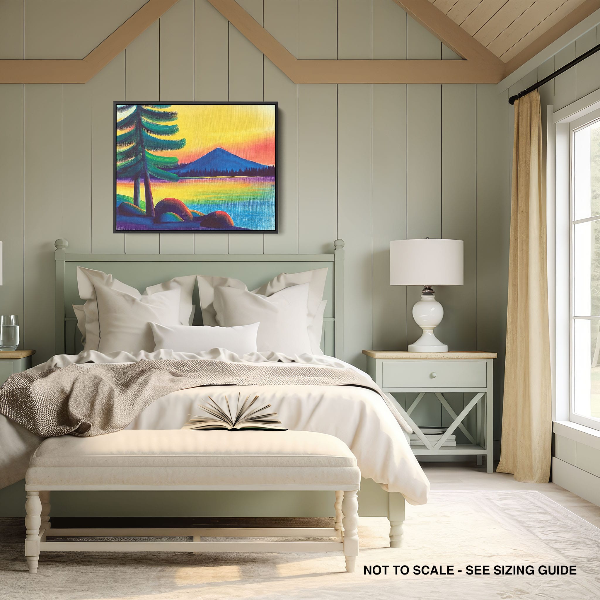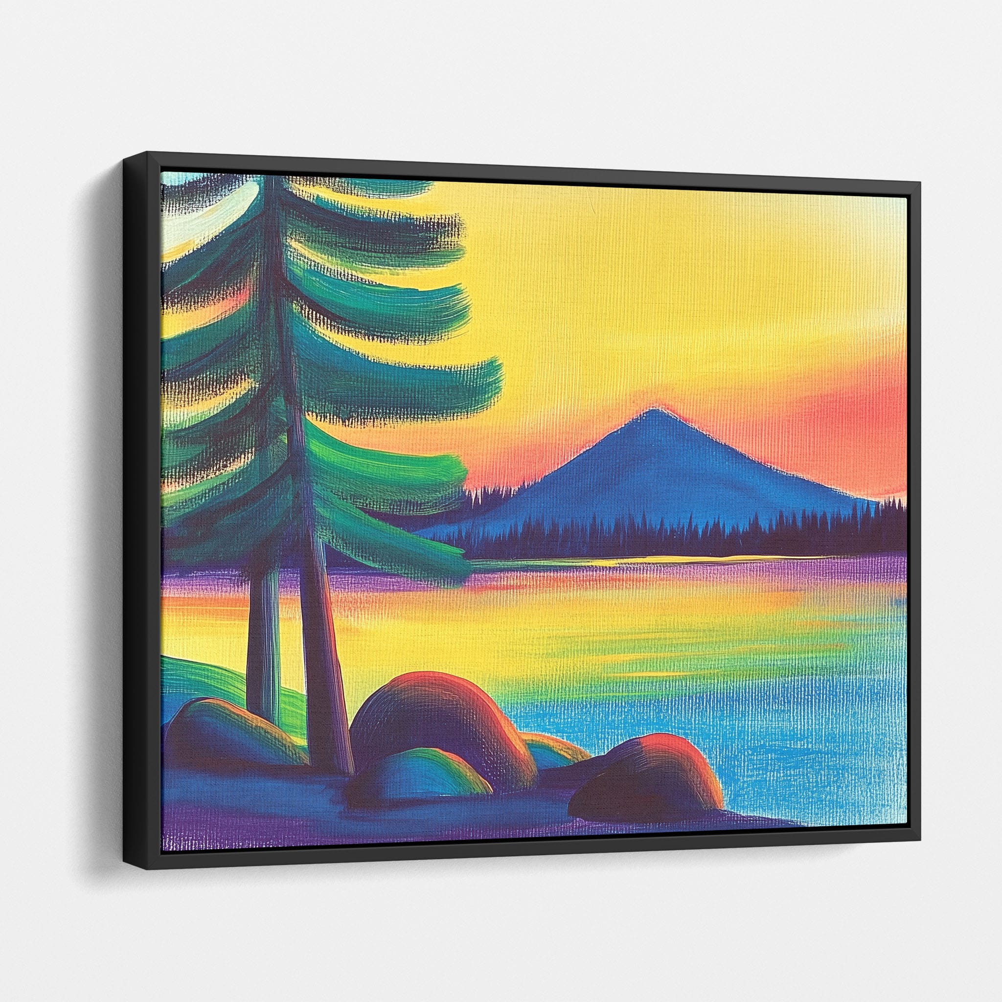This striking painting captures a serene lakeside at sunset, with vibrantly expressed hues casting a spell over the scenery. Strong brushstrokes depict the tranquility of a mountain backdrop, mirrored waters, and silhouetted pines standing tall against a tapestry of orange, purple, and blue. Perfect for modern art lovers, this piece brings a touch of calm modernity and expressive color to any space, making it an ideal choice for those looking to enhance their living or work environment with a serene yet vibrant visual escape. Add this picturesque scene to your decor and transform any room with its soothing colors and bold expressionist style.