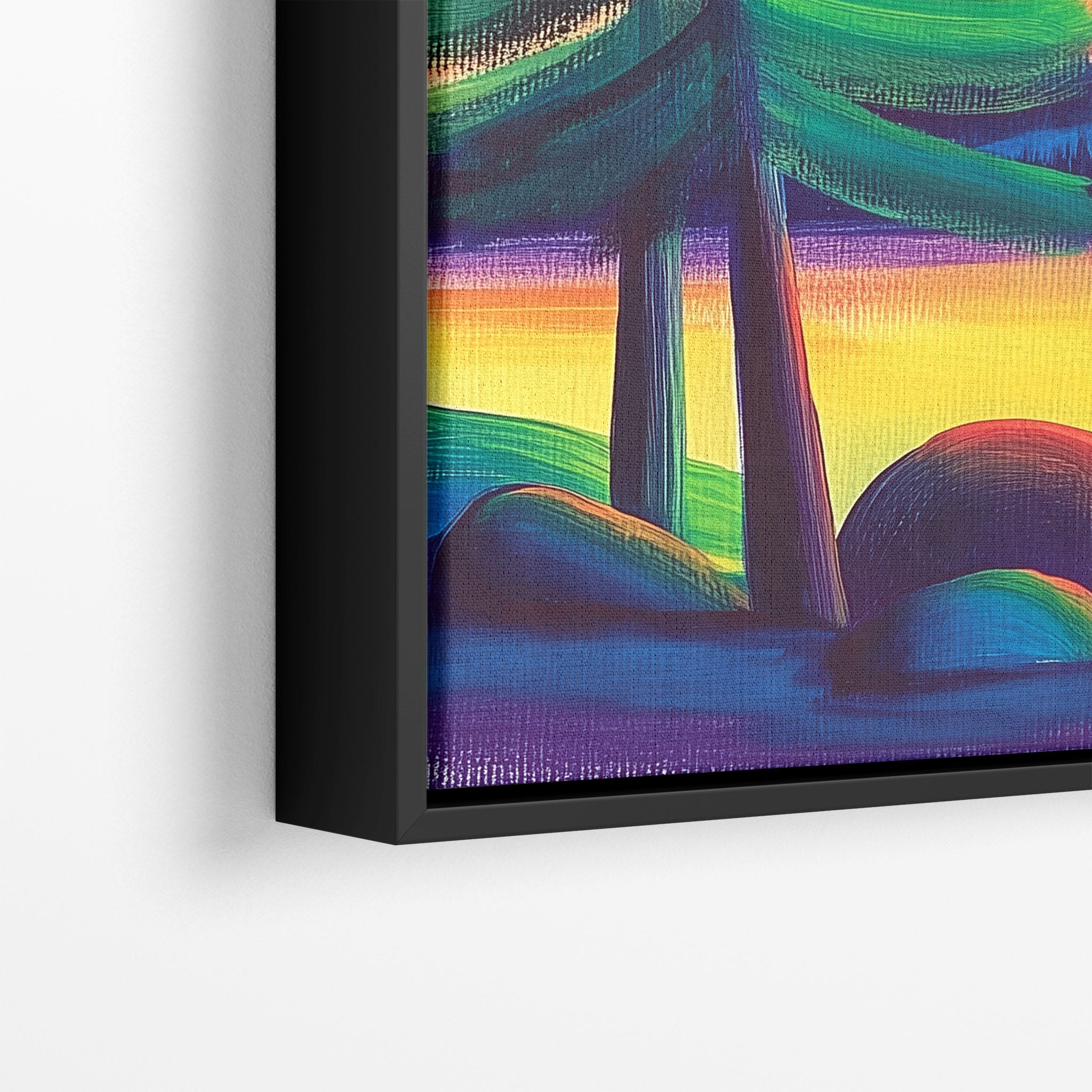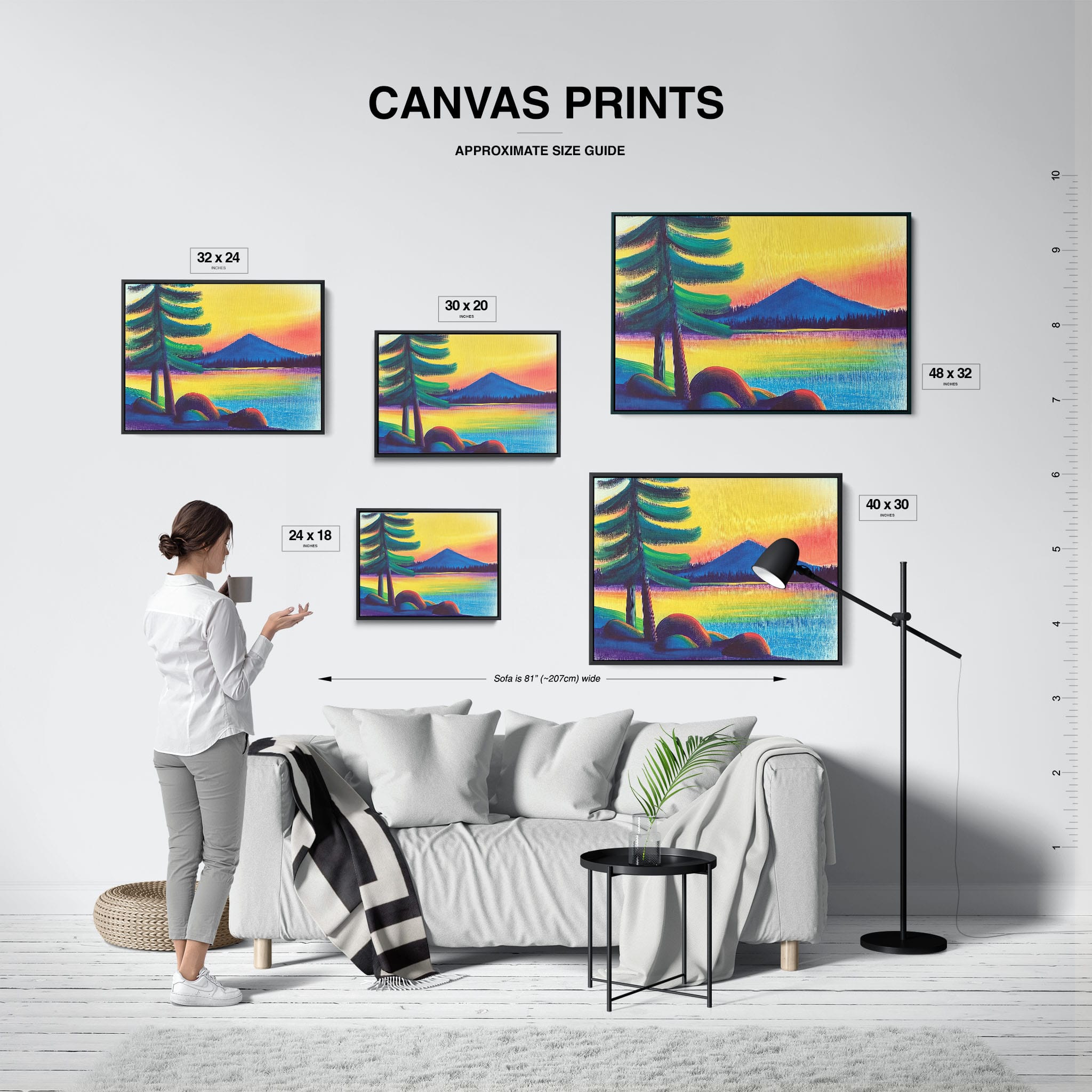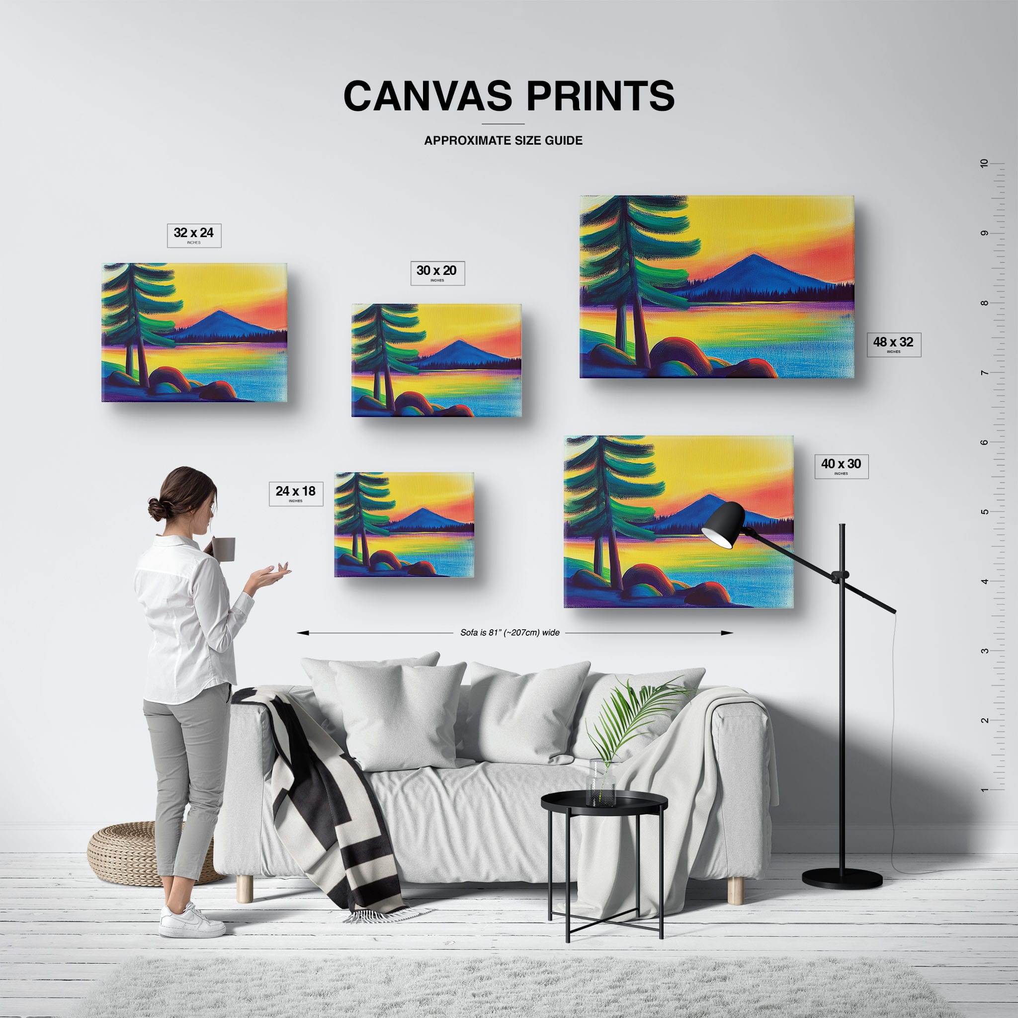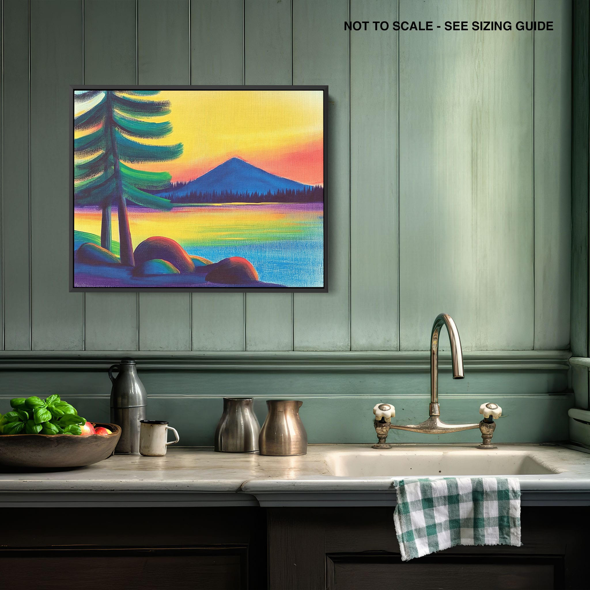 This striking painting captures a serene lakeside at sunset, with vibrantly expressed hues casting a spell over the scenery. Strong brushstrokes depict the tranquility of a mountain backdrop, mirrored waters, and silhouetted pines standing tall against a tapestry of orange, purple, and blue. Perfect for modern art lovers, this piece brings a touch of calm modernity and expressive color to any space, making it an ideal choice for those looking to enhance their living or work environment with a serene yet vibrant visual escape. Add this picturesque scene to your decor and transform any room with its soothing colors and bold expressionist style.