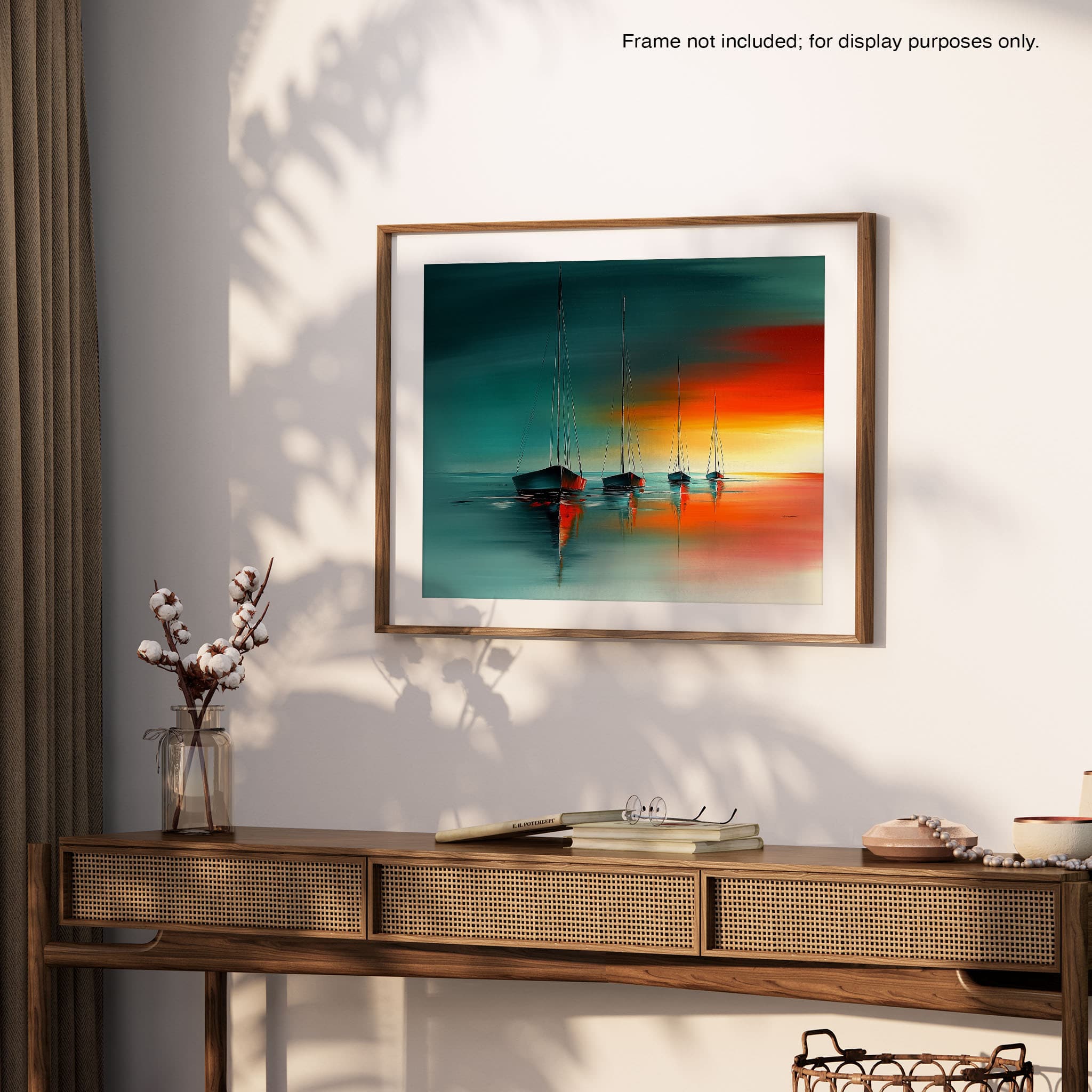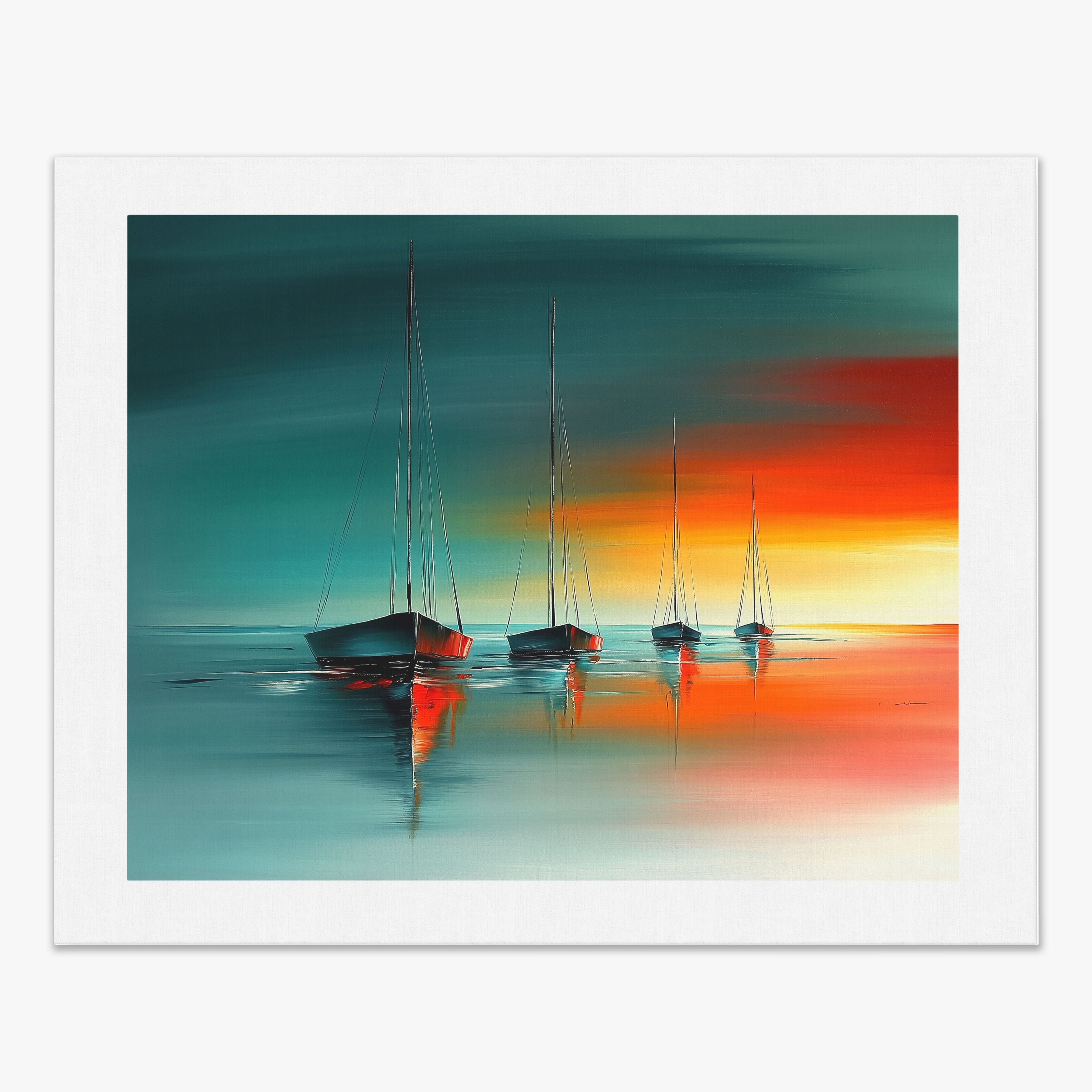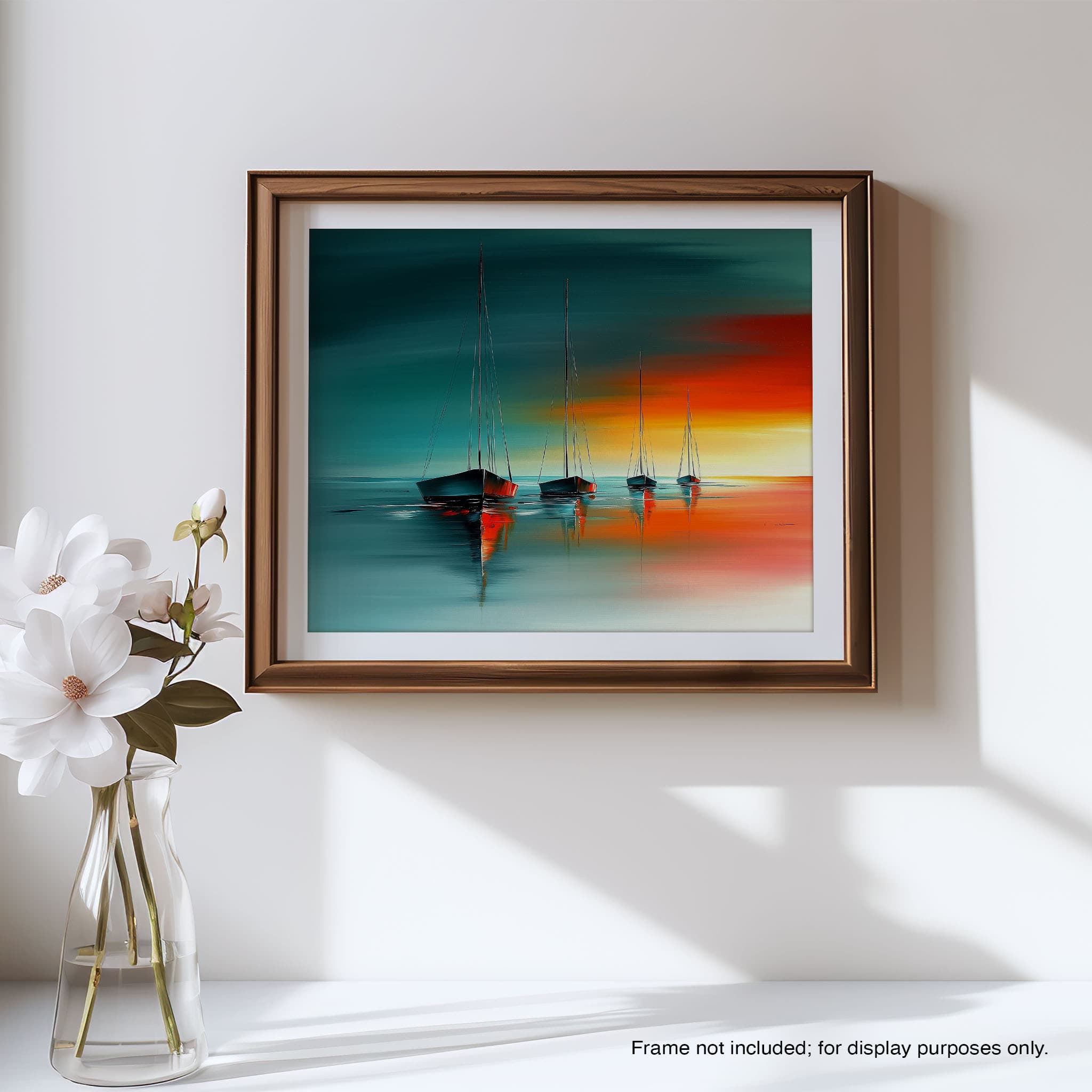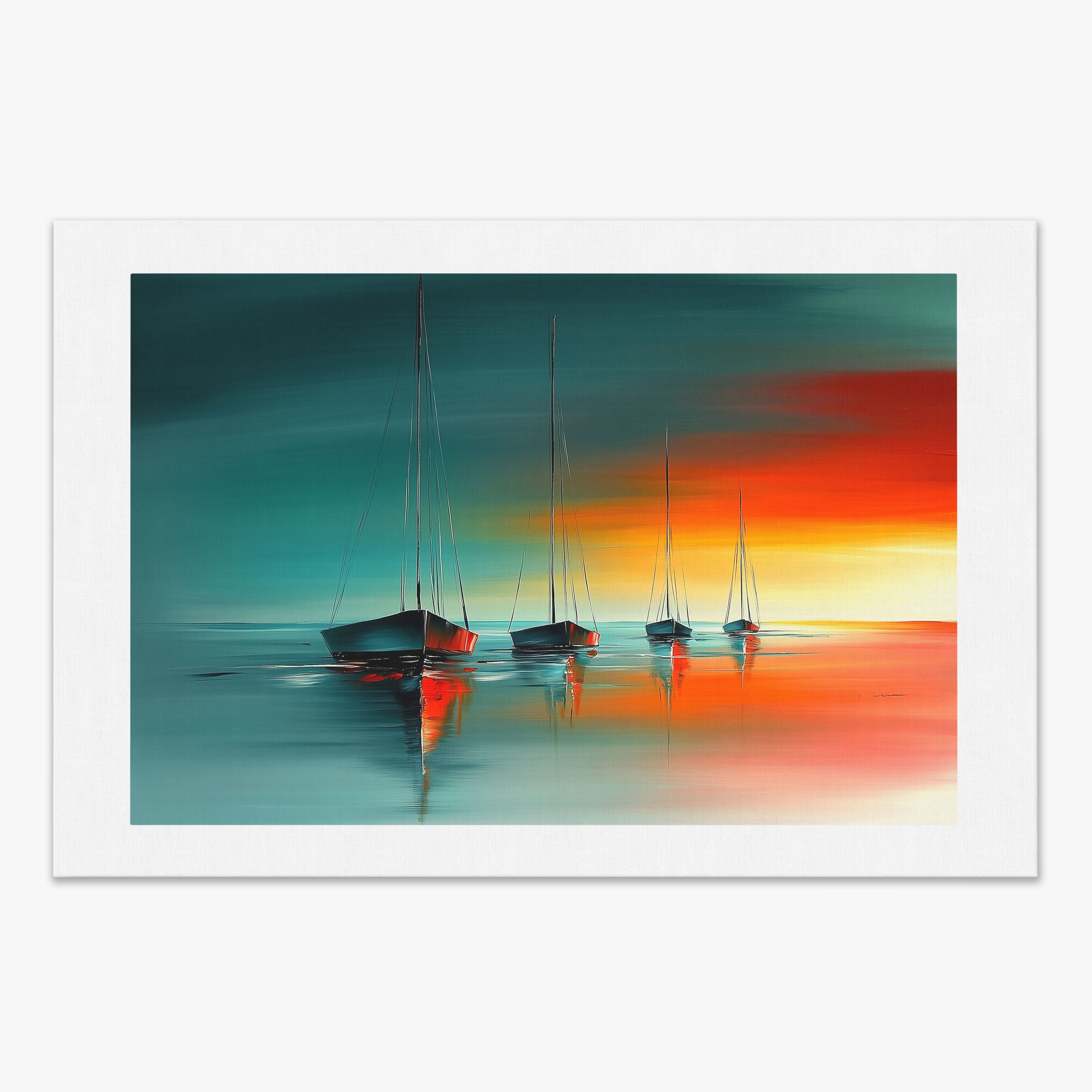 Experience the tranquility of a sunset voyage with Sunset Serenity Voyage. This stunning digital illustration captures the serene beauty of sailboats gliding across a calm sea, reflecting the vibrant hues of a setting sun. The blending of impressionistic and modern styles creates an ethereal atmosphere where the sky's fiery orange and the cool turquoise sea meld seamlessly. Perfect for lovers of nautical scenes and captivating sunsets, this artwork brings a sense of peace and wonder to any space. Let this piece transport you to a tranquil horizon, perfect for brightening up your home or office with its serene and vibrant aura.
