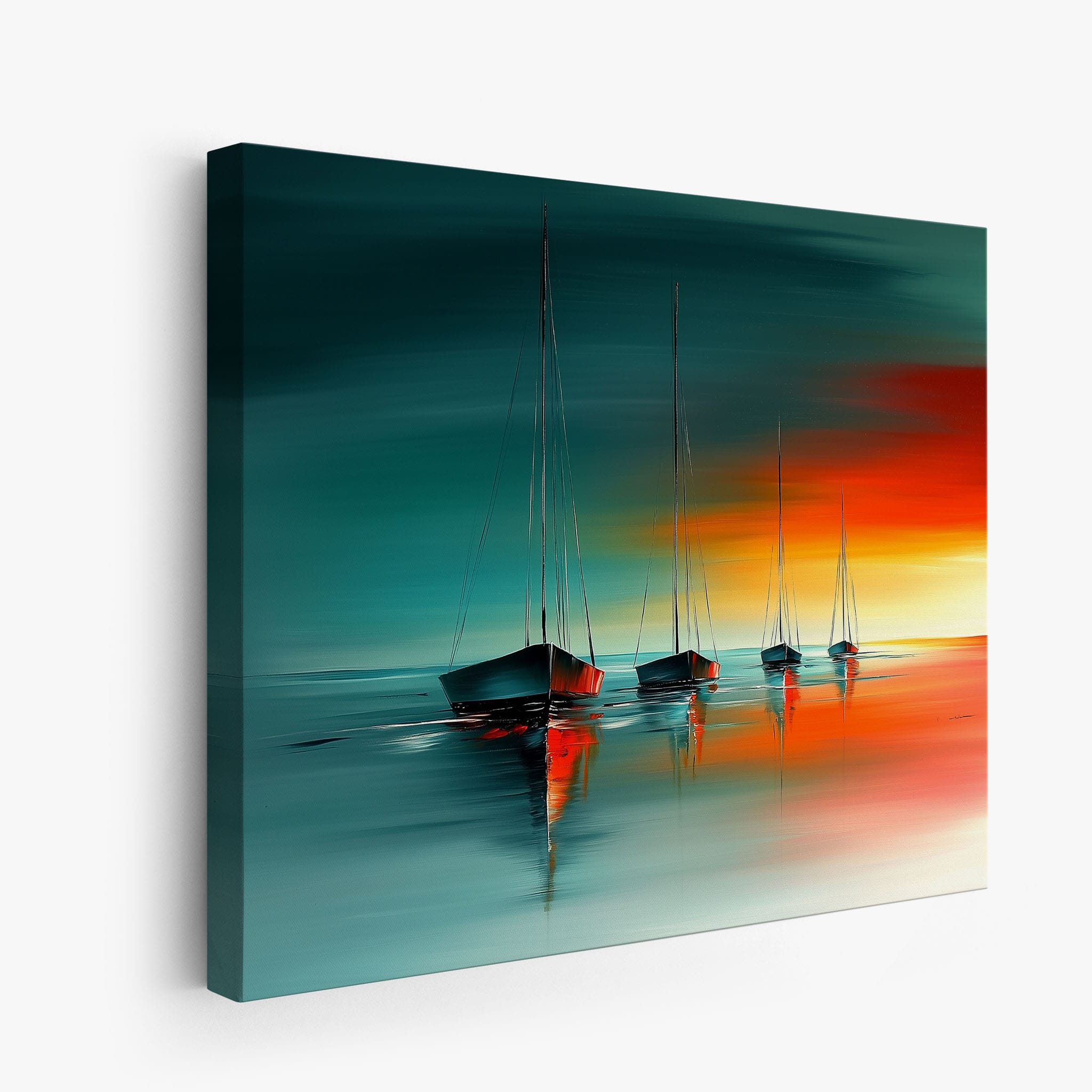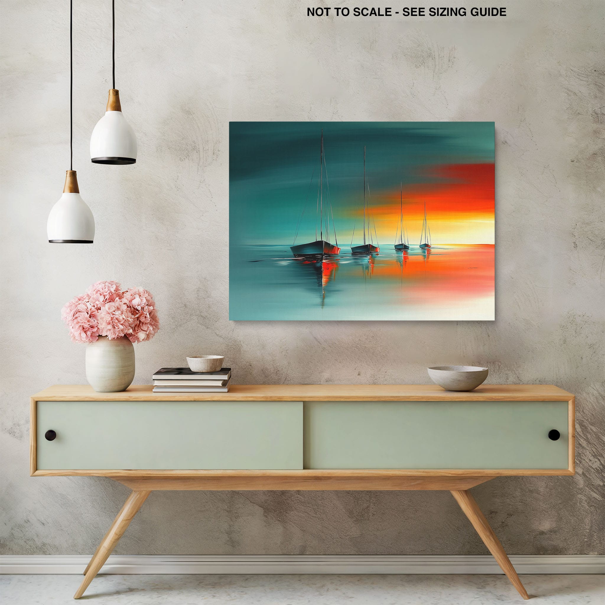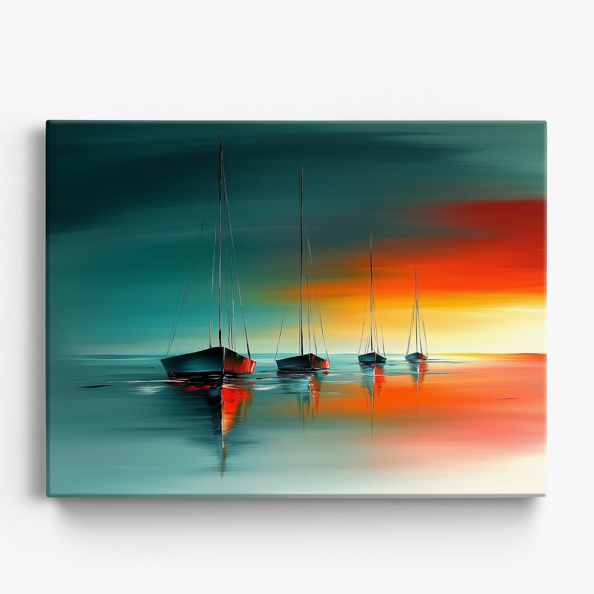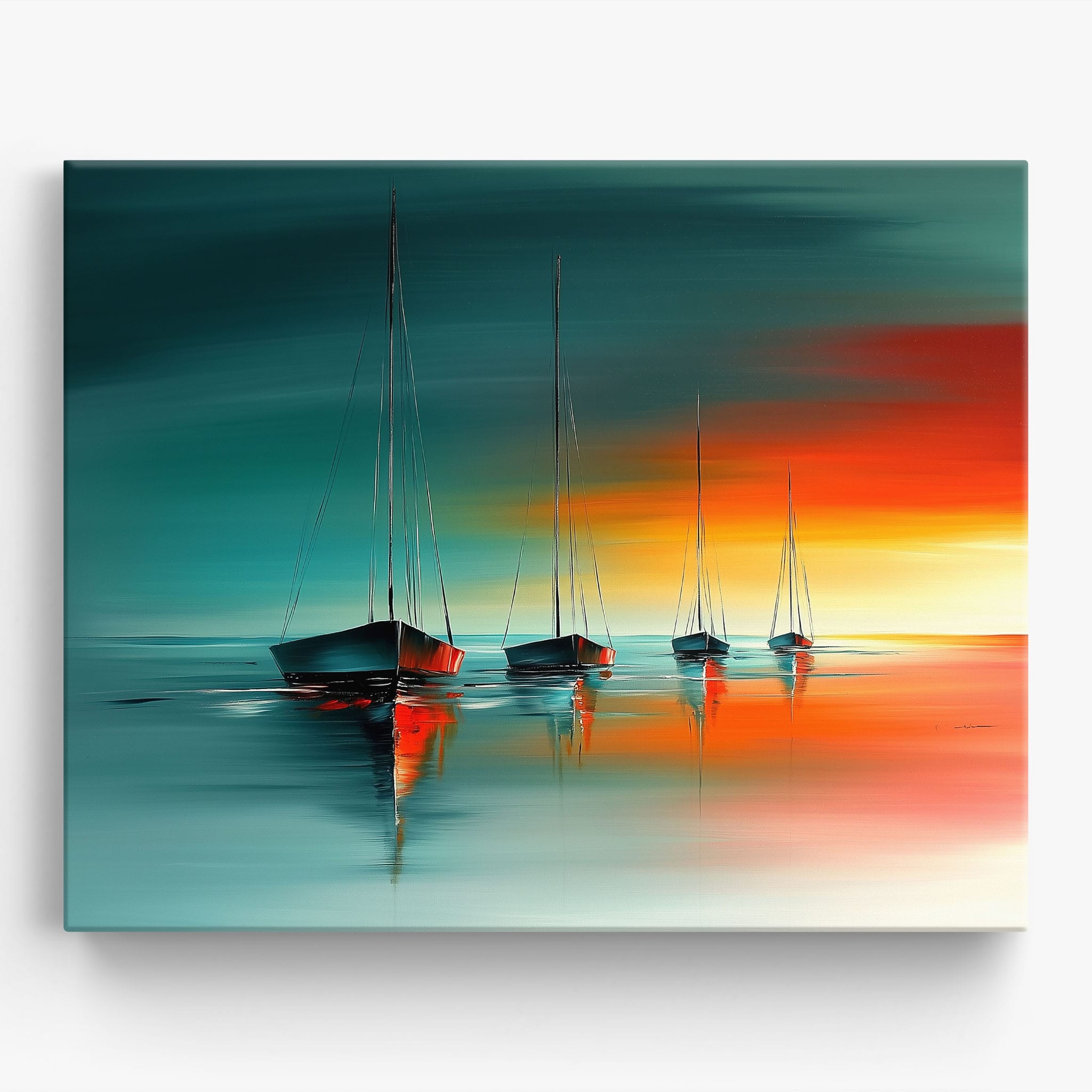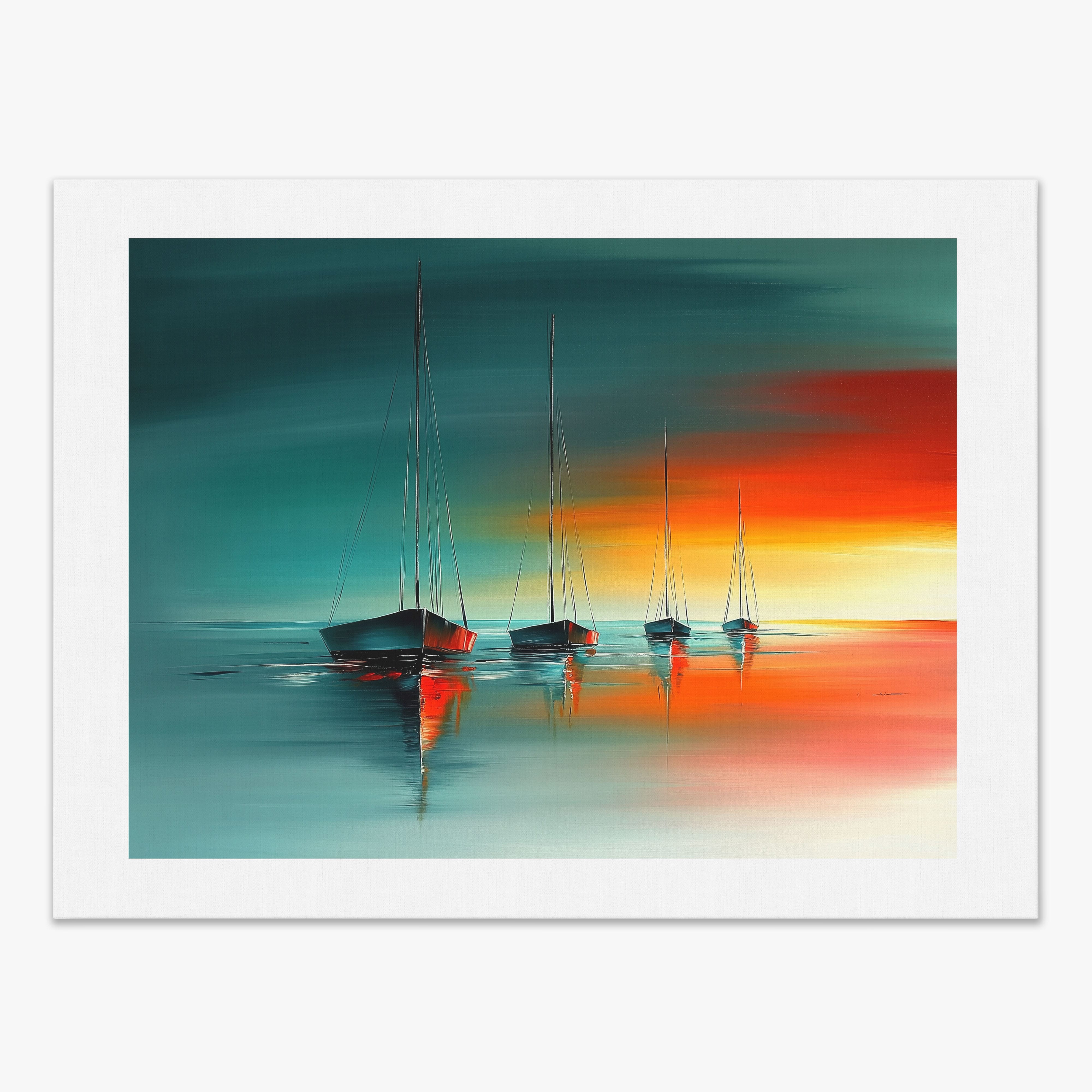 Experience the tranquility of a sunset voyage with Sunset Serenity Voyage. This stunning digital illustration captures the serene beauty of sailboats gliding across a calm sea, reflecting the vibrant hues of a setting sun. The blending of impressionistic and modern styles creates an ethereal atmosphere where the sky's fiery orange and the cool turquoise sea meld seamlessly. Perfect for lovers of nautical scenes and captivating sunsets, this artwork brings a sense of peace and wonder to any space. Let this piece transport you to a tranquil horizon, perfect for brightening up your home or office with its serene and vibrant aura.