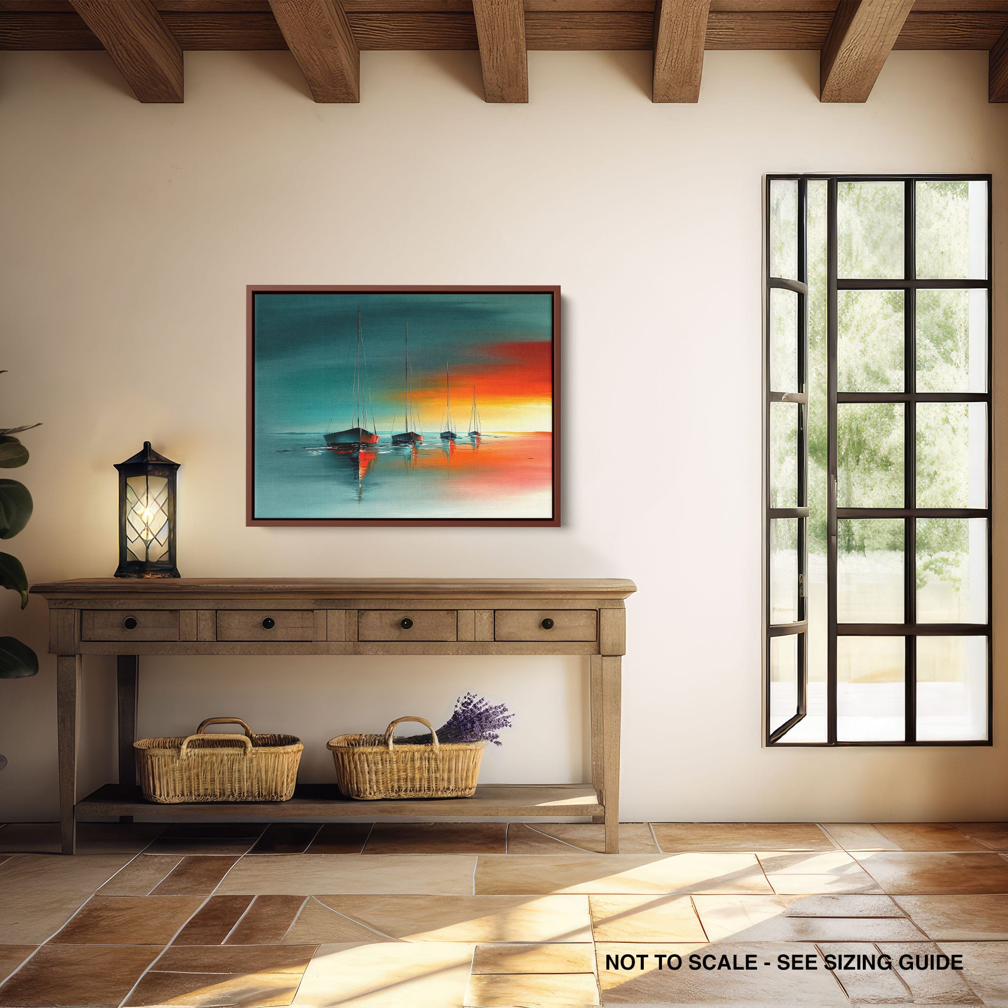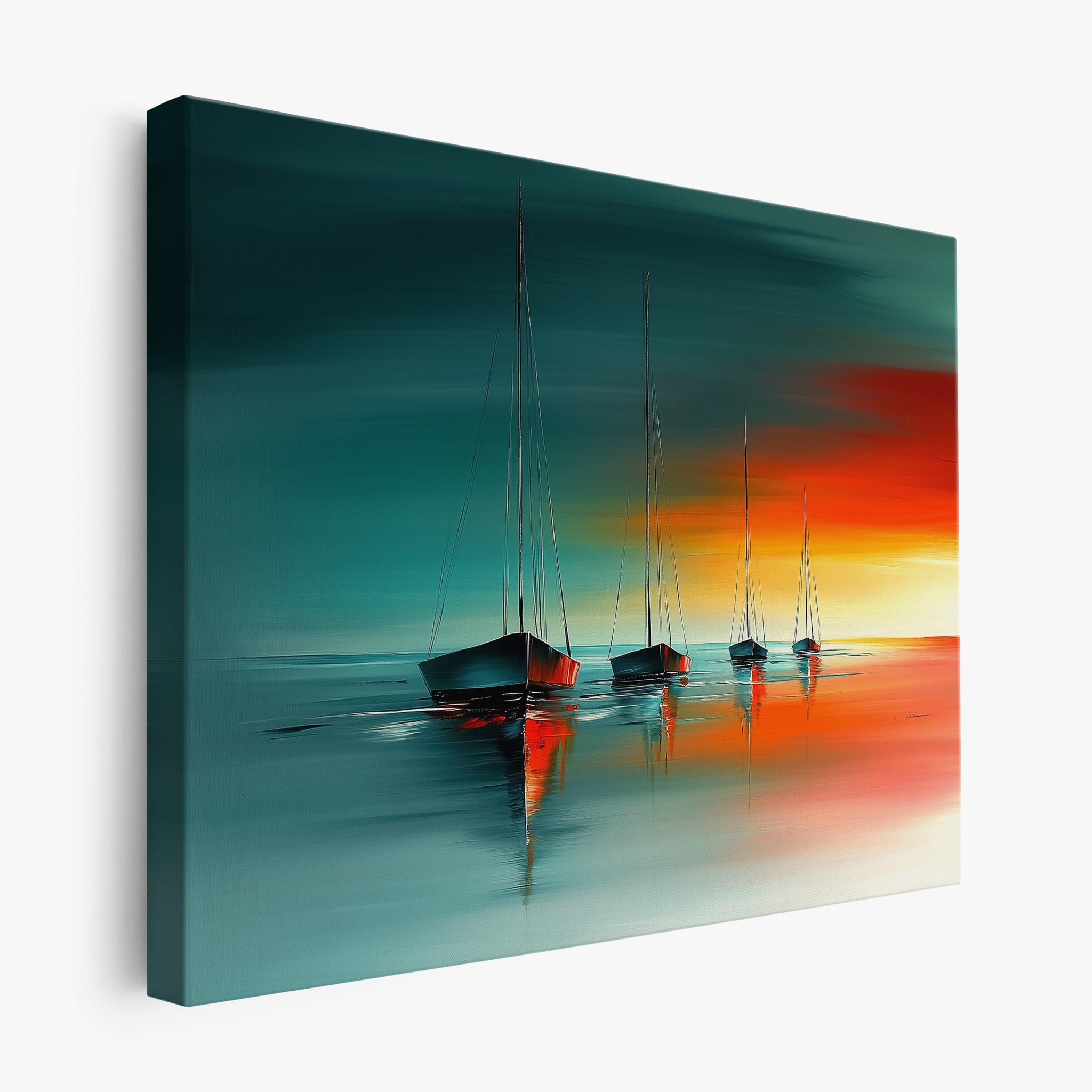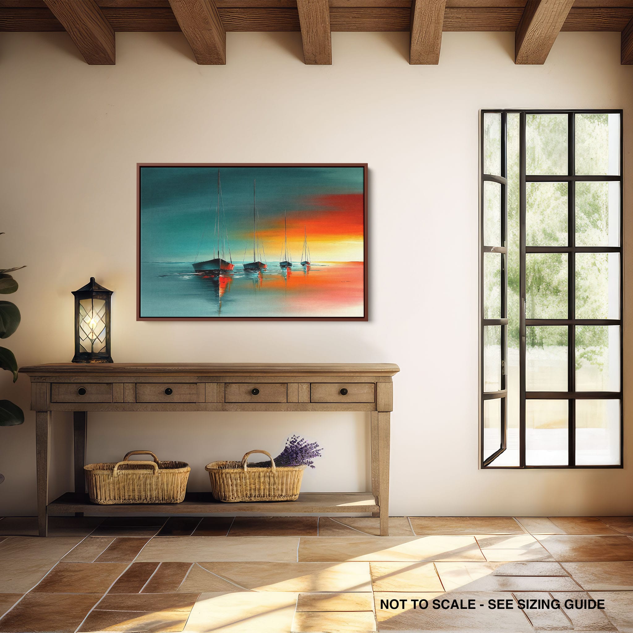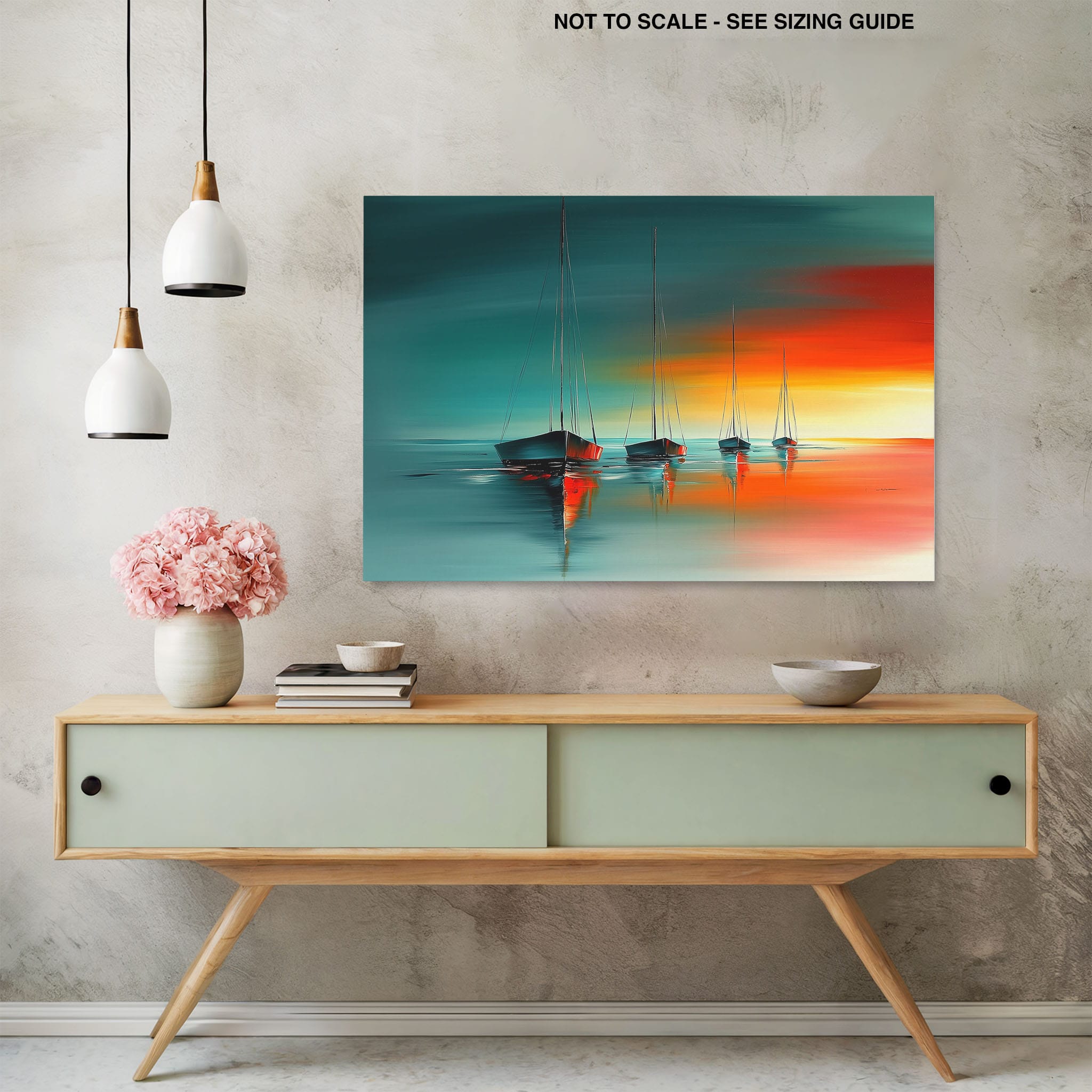 Experience the tranquility of a sunset voyage with Sunset Serenity Voyage. This stunning digital illustration captures the serene beauty of sailboats gliding across a calm sea, reflecting the vibrant hues of a setting sun. The blending of impressionistic and modern styles creates an ethereal atmosphere where the sky's fiery orange and the cool turquoise sea meld seamlessly. Perfect for lovers of nautical scenes and captivating sunsets, this artwork brings a sense of peace and wonder to any space. Let this piece transport you to a tranquil horizon, perfect for brightening up your home or office with its serene and vibrant aura.
