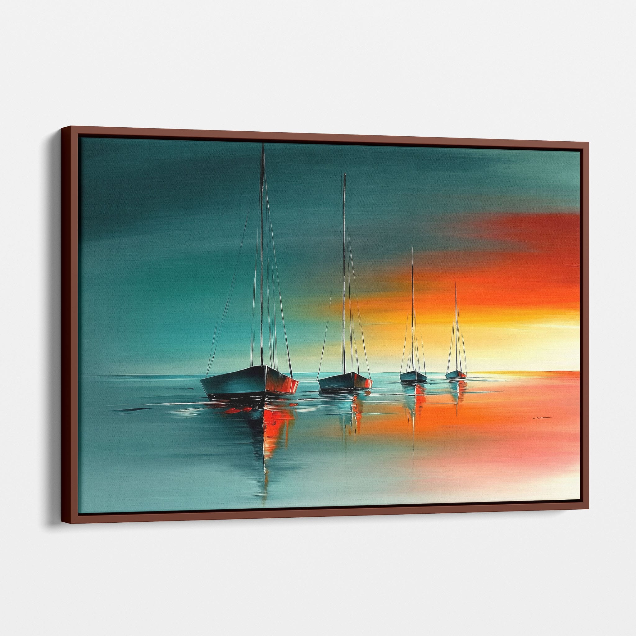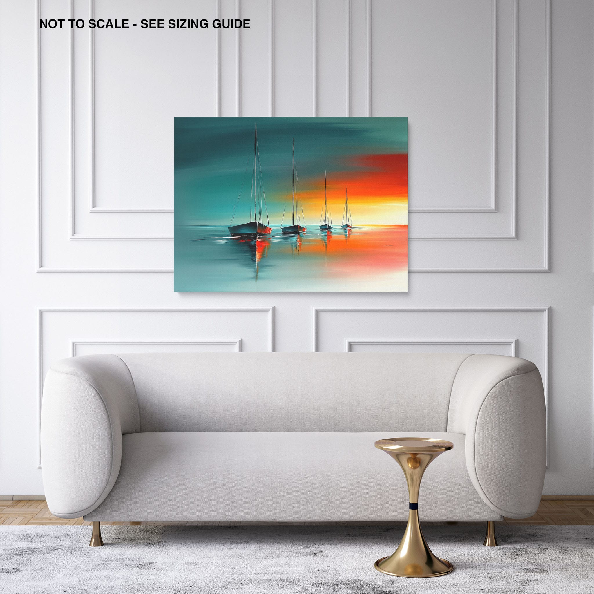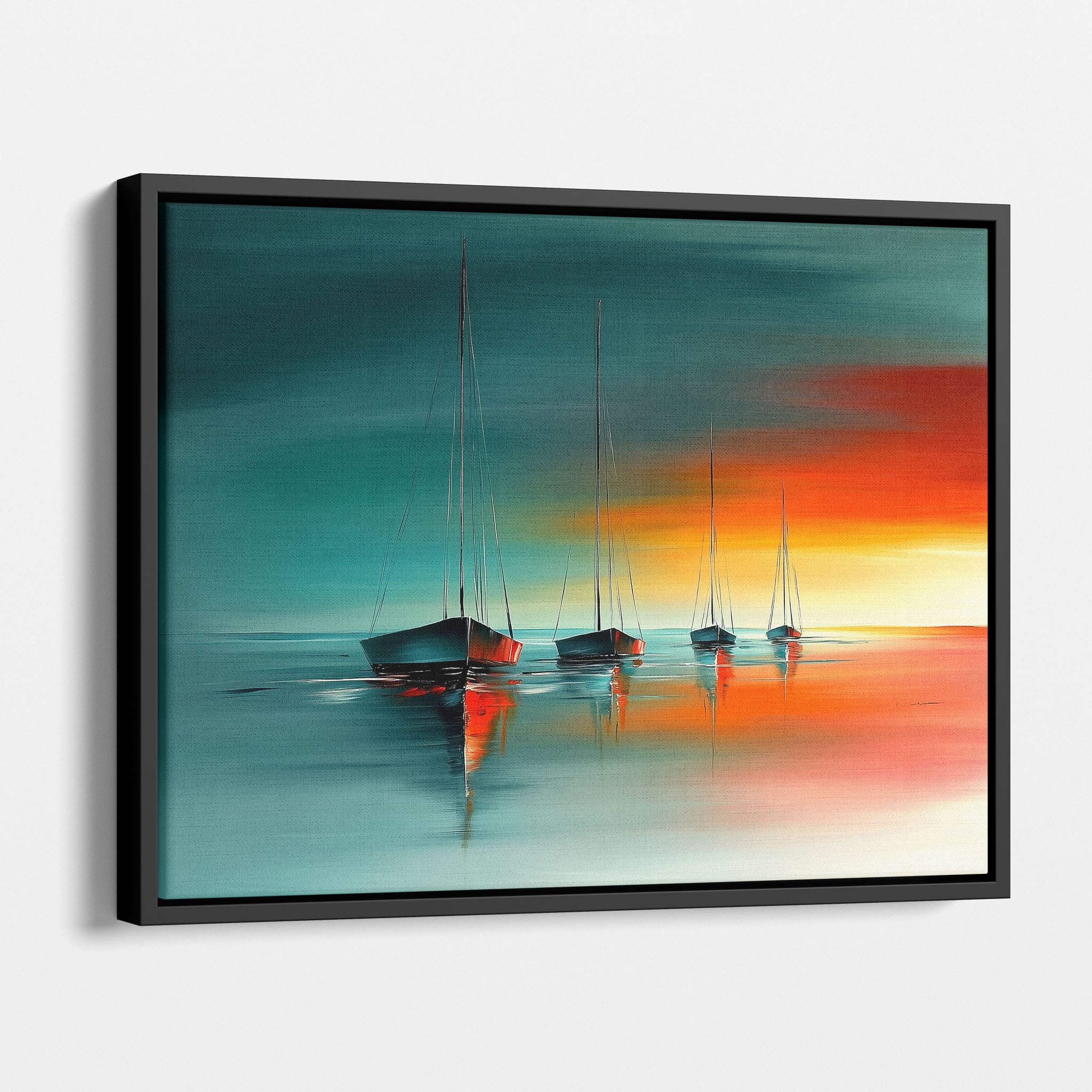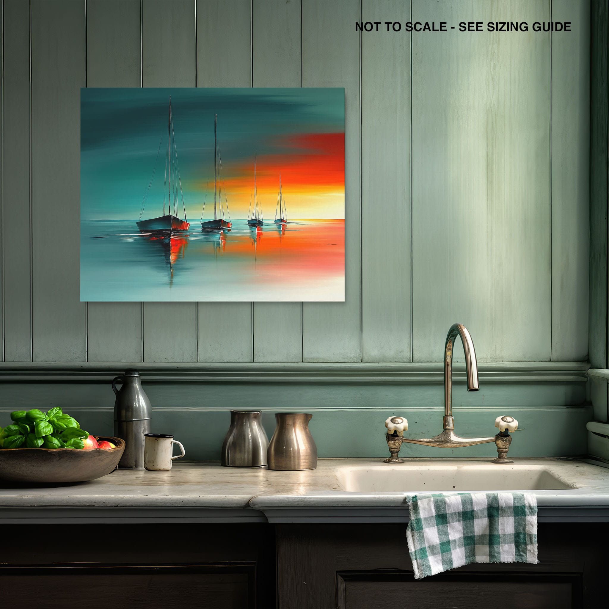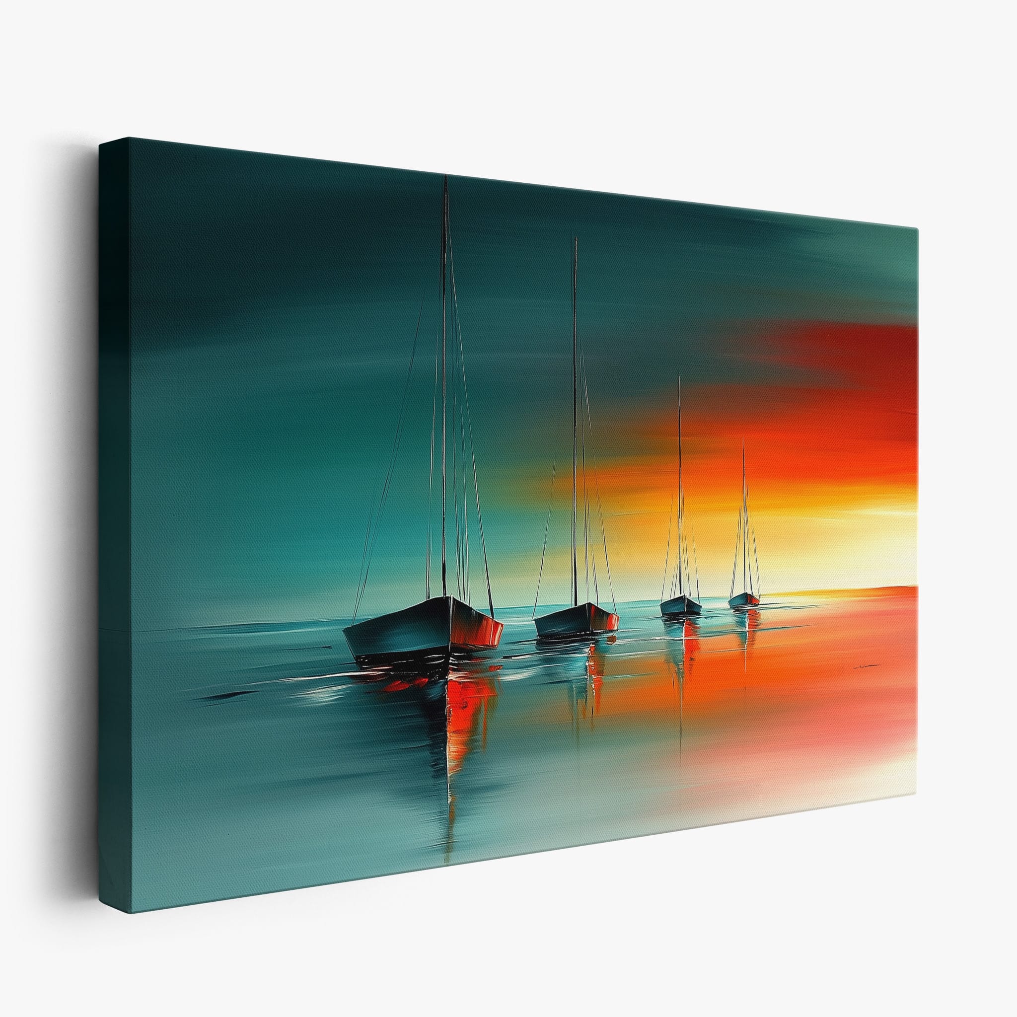 Experience the tranquility of a sunset voyage with Sunset Serenity Voyage. This stunning digital illustration captures the serene beauty of sailboats gliding across a calm sea, reflecting the vibrant hues of a setting sun. The blending of impressionistic and modern styles creates an ethereal atmosphere where the sky's fiery orange and the cool turquoise sea meld seamlessly. Perfect for lovers of nautical scenes and captivating sunsets, this artwork brings a sense of peace and wonder to any space. Let this piece transport you to a tranquil horizon, perfect for brightening up your home or office with its serene and vibrant aura.
