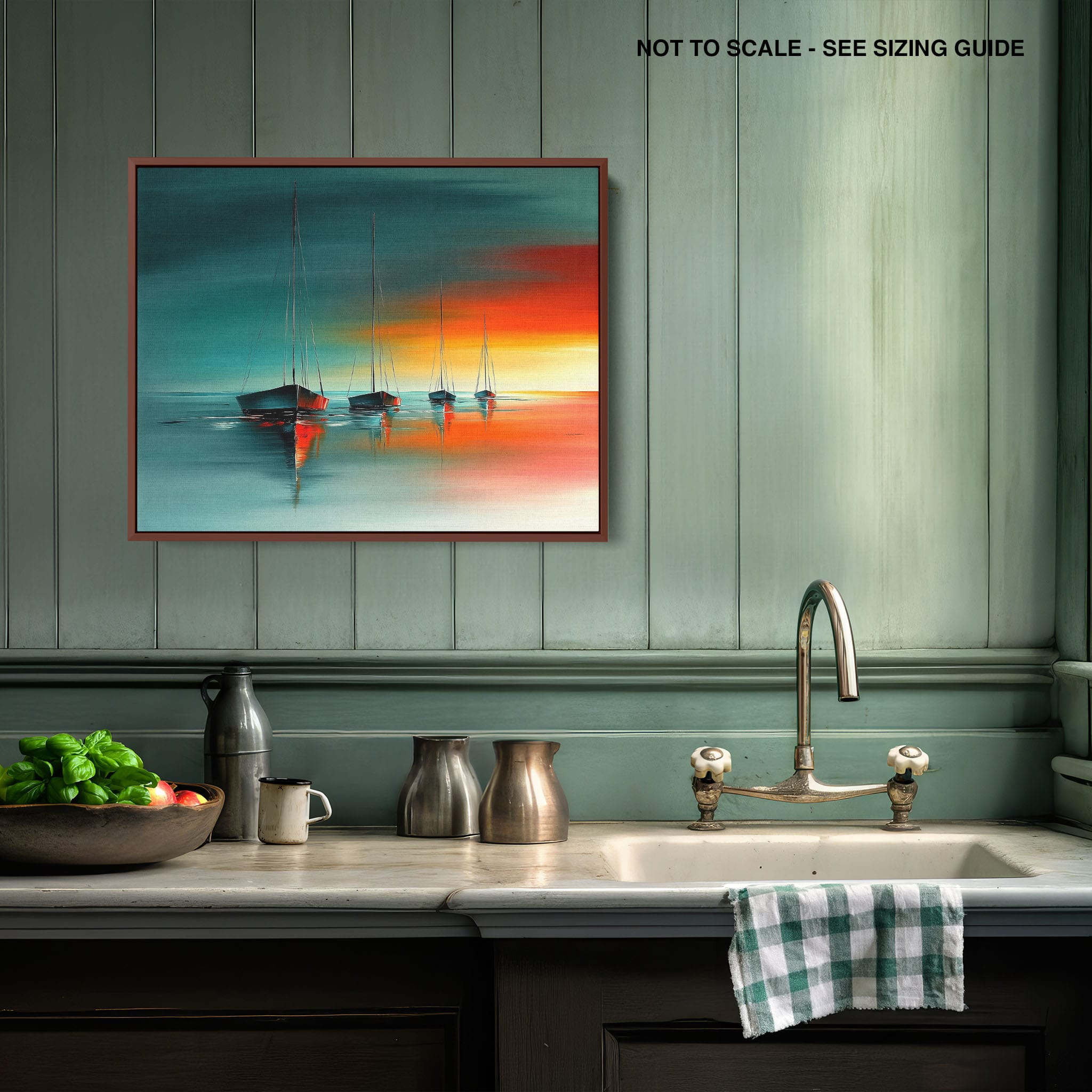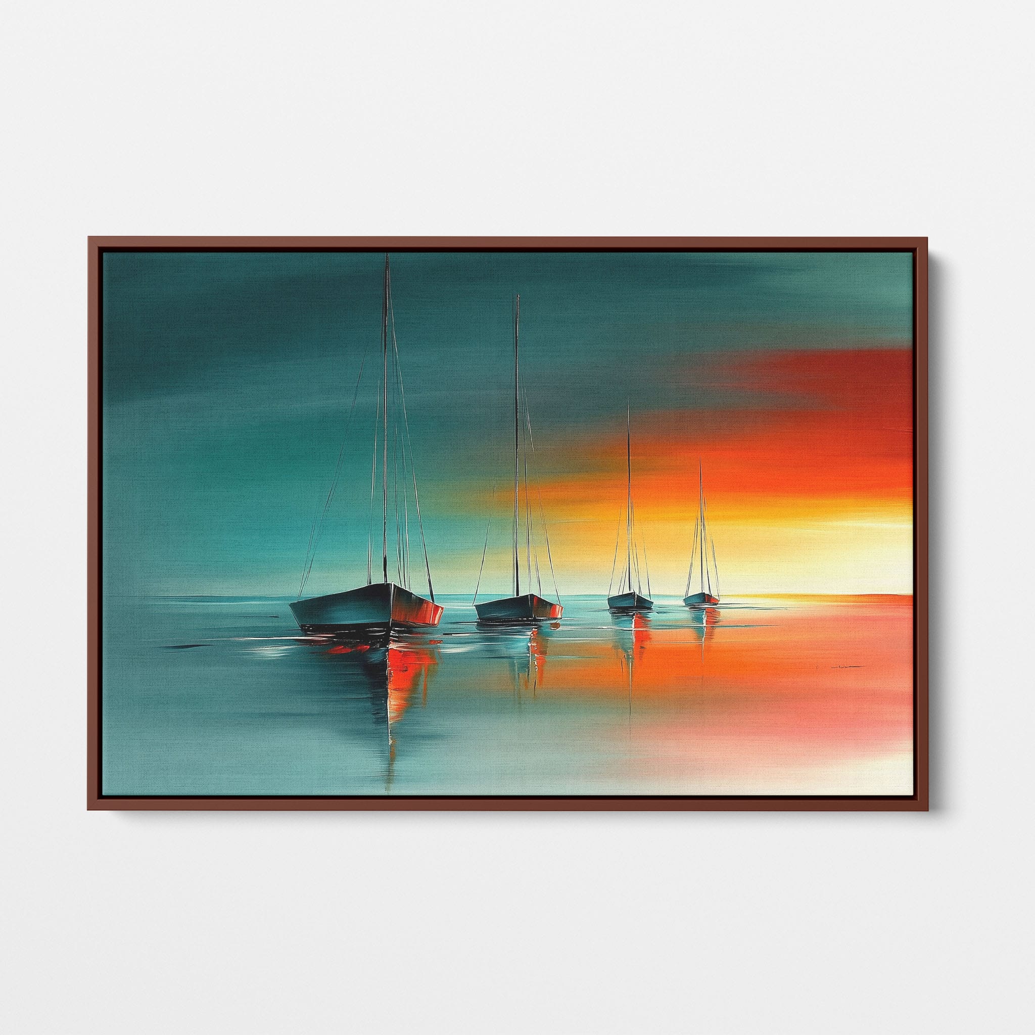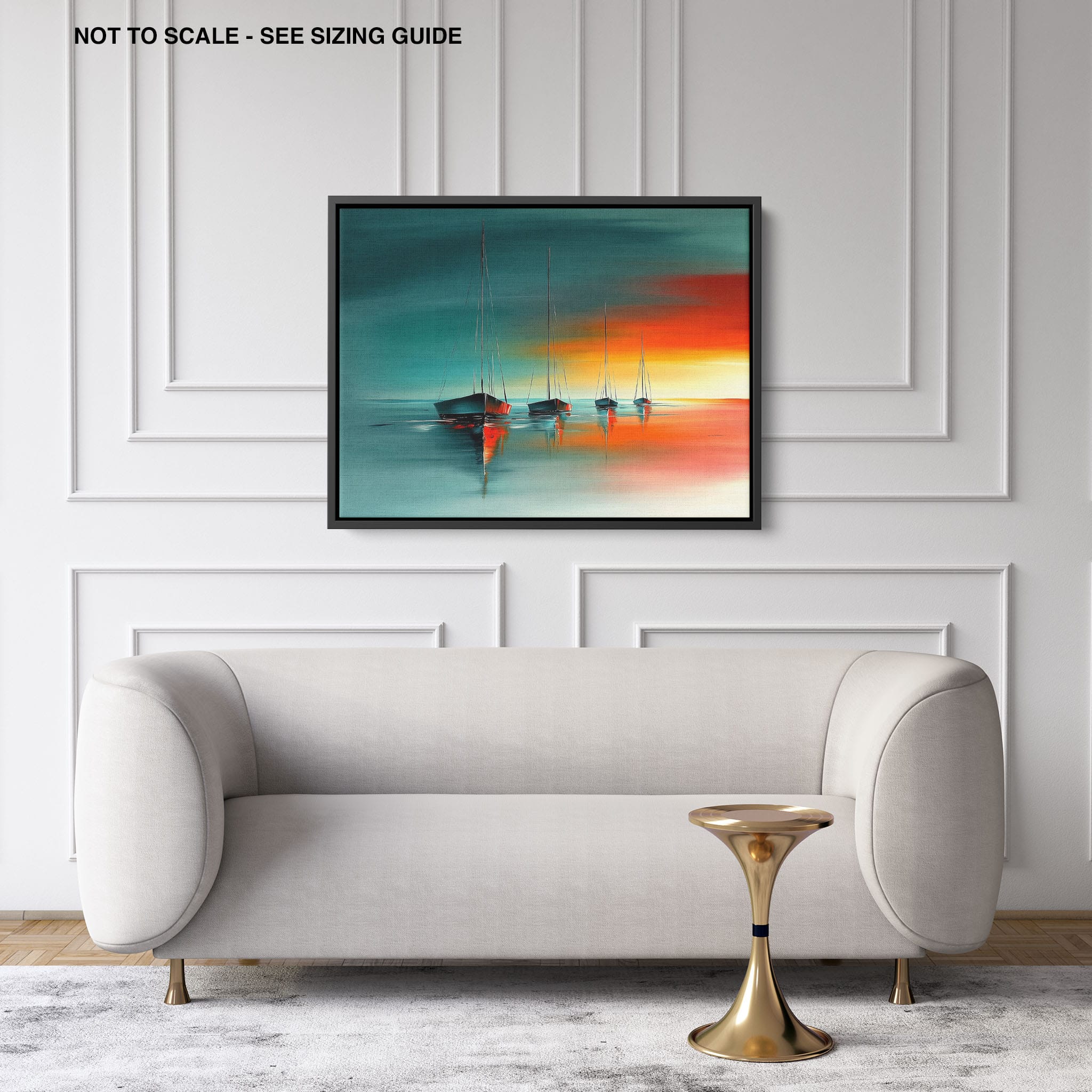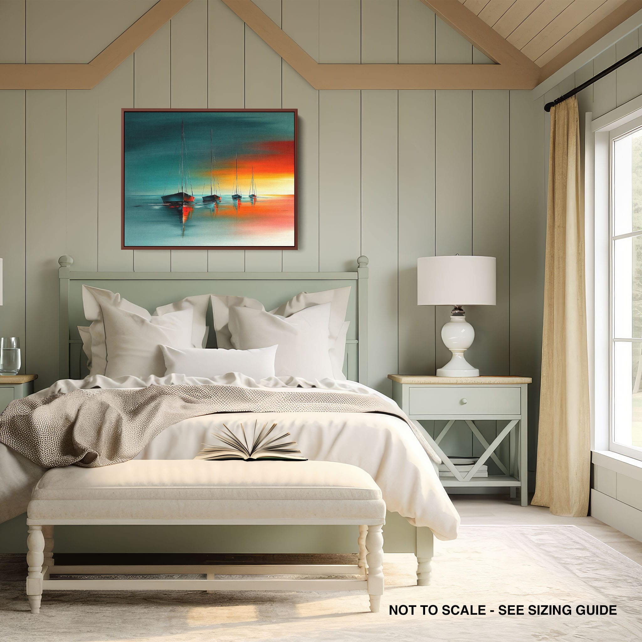 Experience the tranquility of a sunset voyage with Sunset Serenity Voyage. This stunning digital illustration captures the serene beauty of sailboats gliding across a calm sea, reflecting the vibrant hues of a setting sun. The blending of impressionistic and modern styles creates an ethereal atmosphere where the sky's fiery orange and the cool turquoise sea meld seamlessly. Perfect for lovers of nautical scenes and captivating sunsets, this artwork brings a sense of peace and wonder to any space. Let this piece transport you to a tranquil horizon, perfect for brightening up your home or office with its serene and vibrant aura.