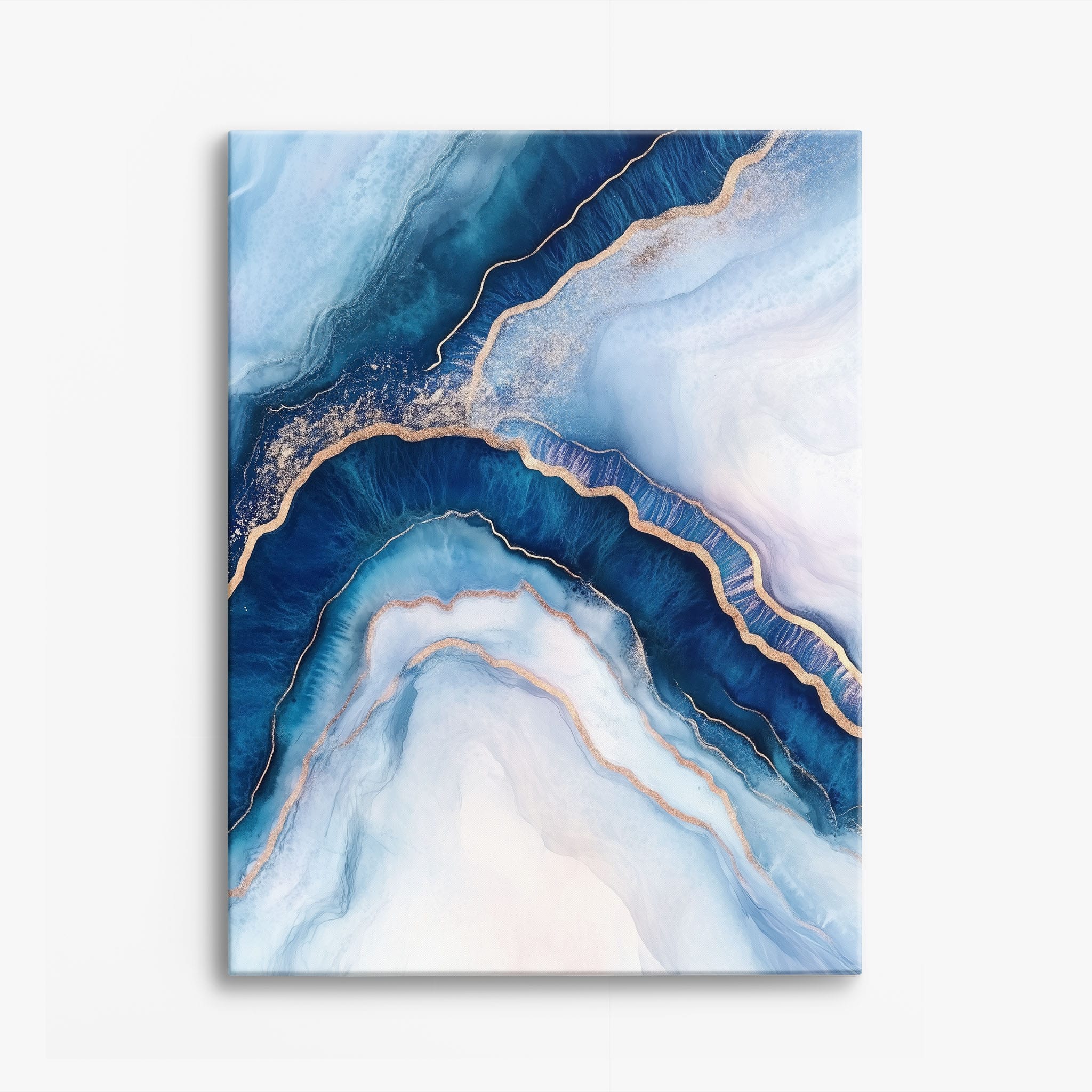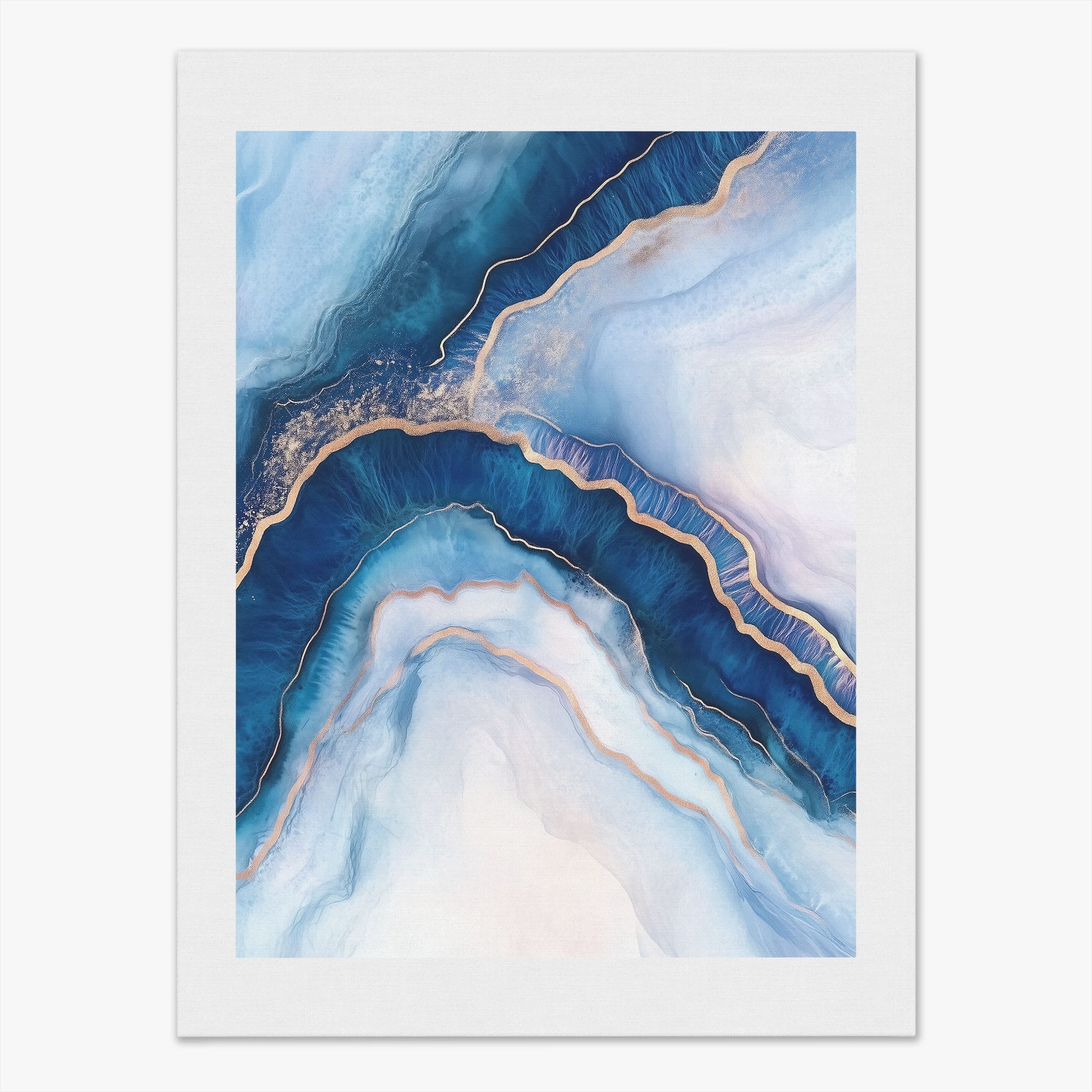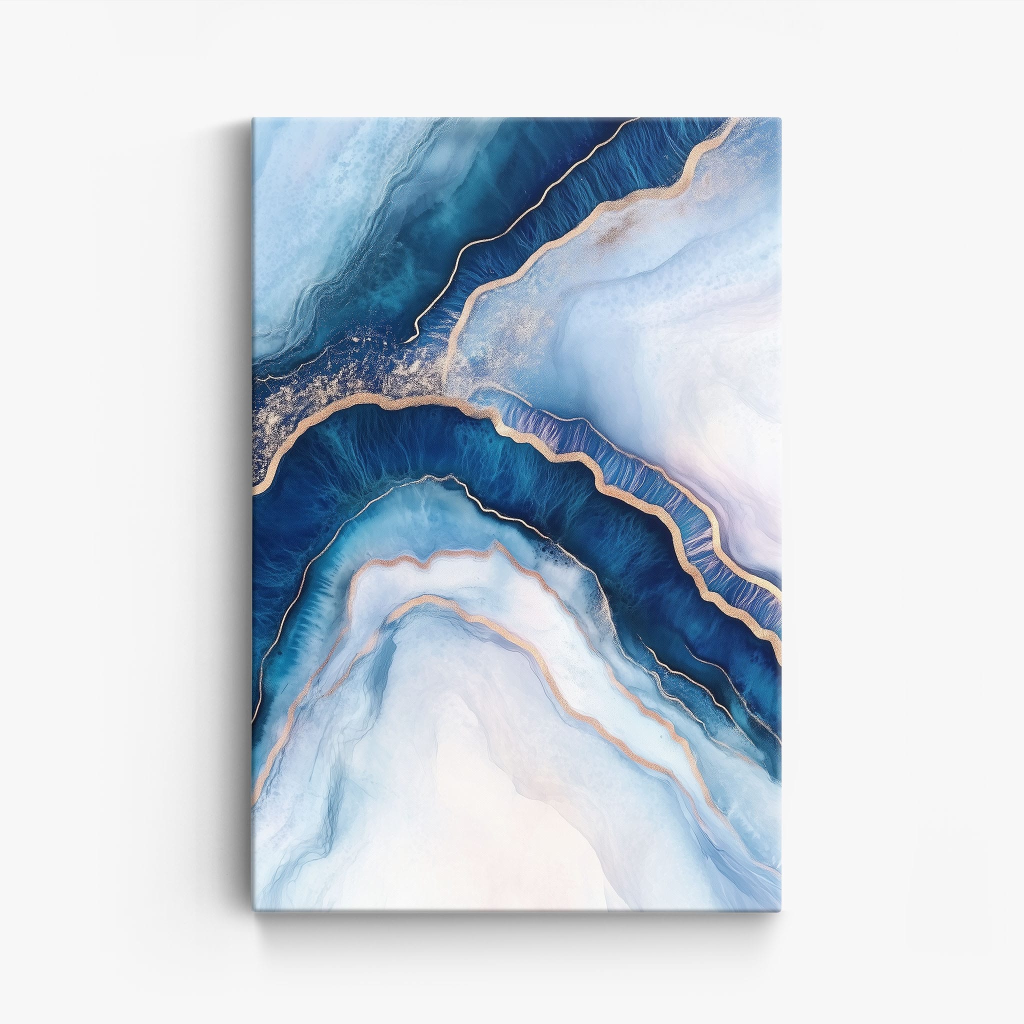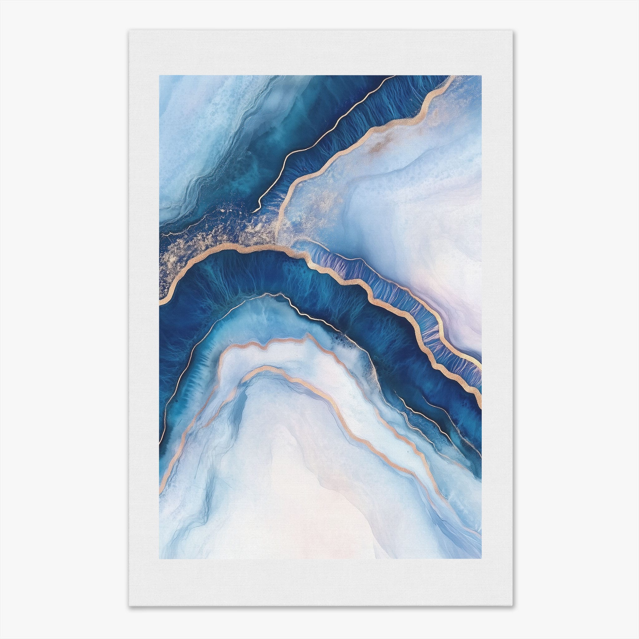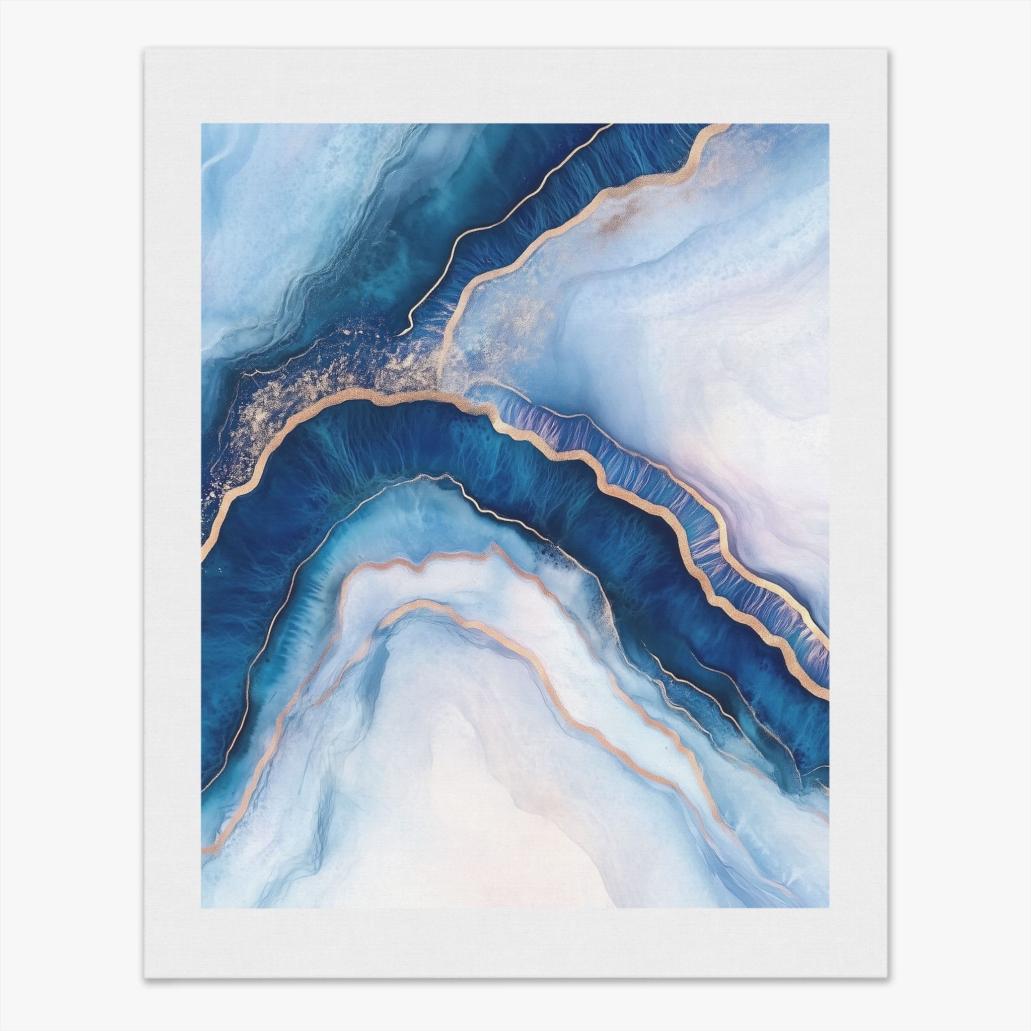 Marvel at the fluid motion captured in Tranquil Waves of Calming Blues, a mixed media artwork that skillfully intertwines deep blue hues with layers of creamy whites and gold accents. The abstract design mimics serene ocean waves rolling in a calm, rhythmic pattern, evoking a sense of peace and stillness. Perfect for any contemporary or minimalistic space, this piece instantly adds a touch of soothing elegance. Add this serene seascape to your space to enjoy a daily glimpse of oceanic tranquility.