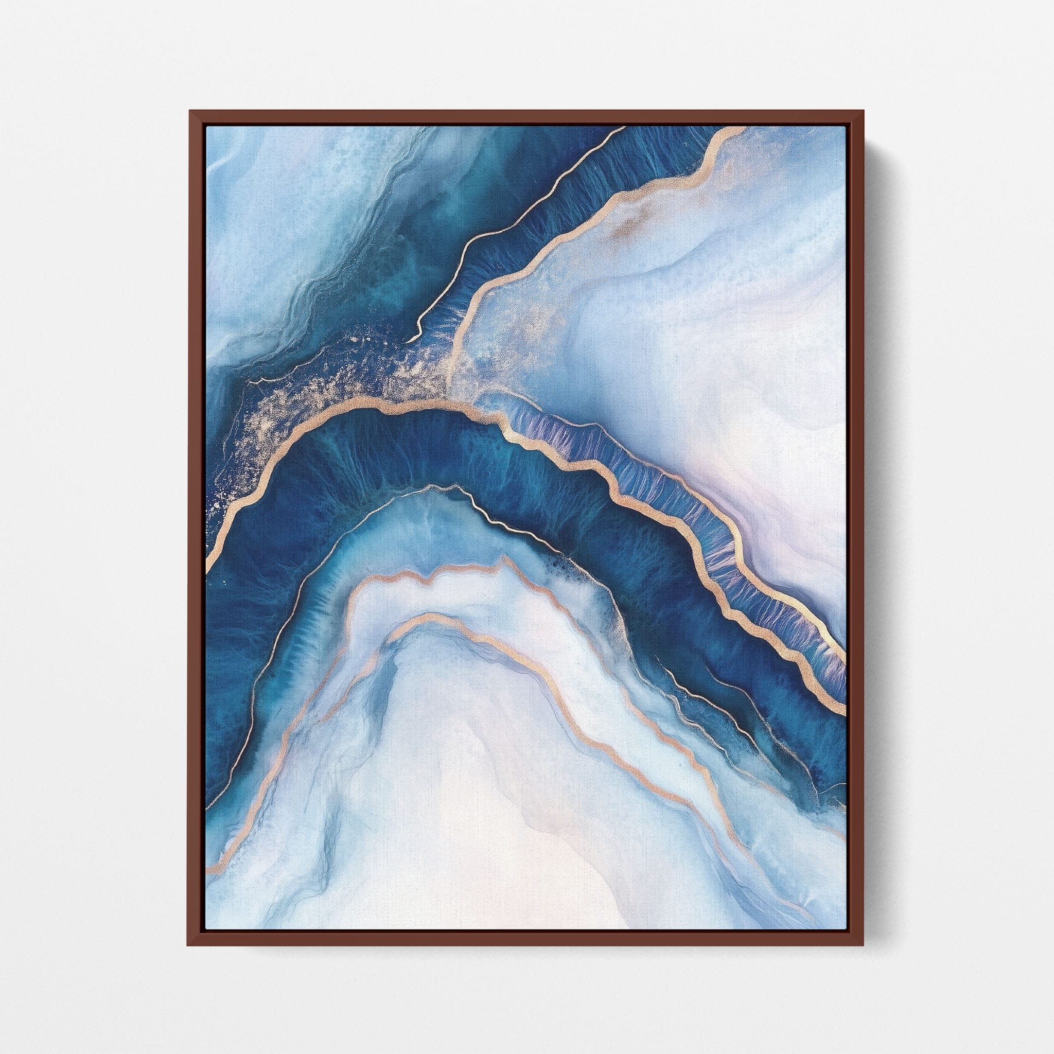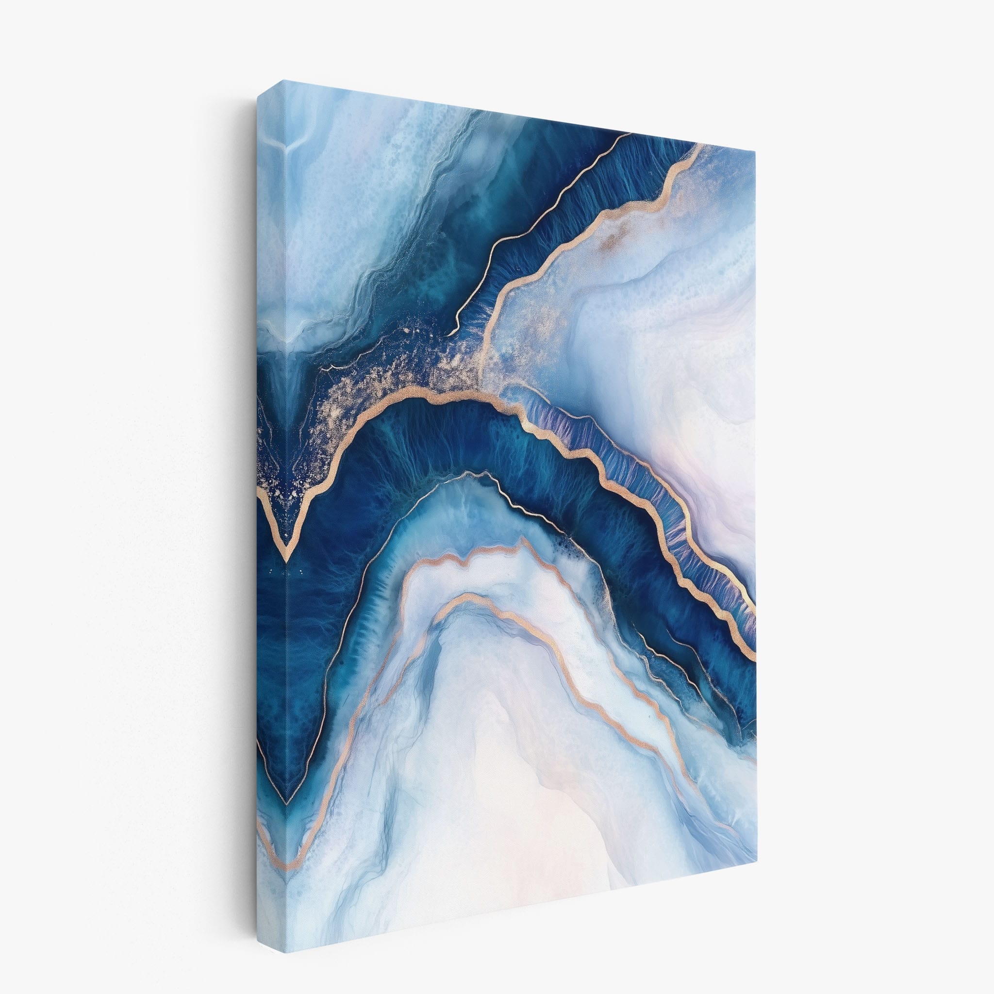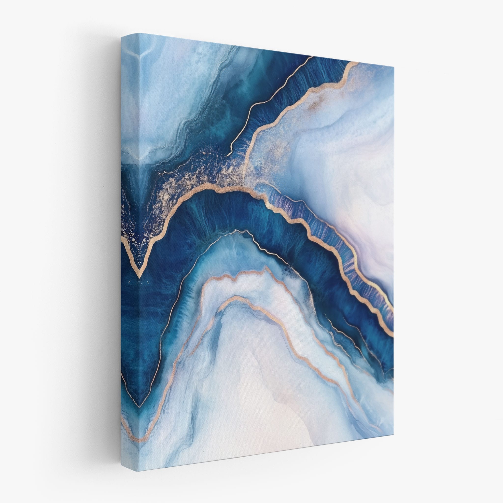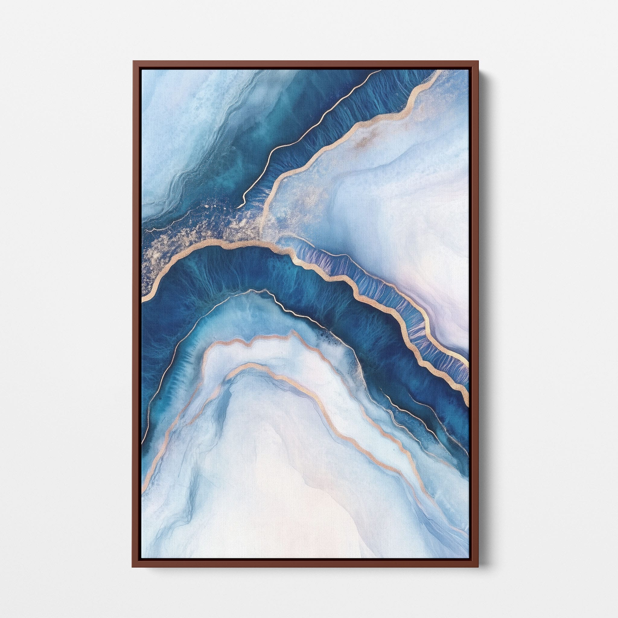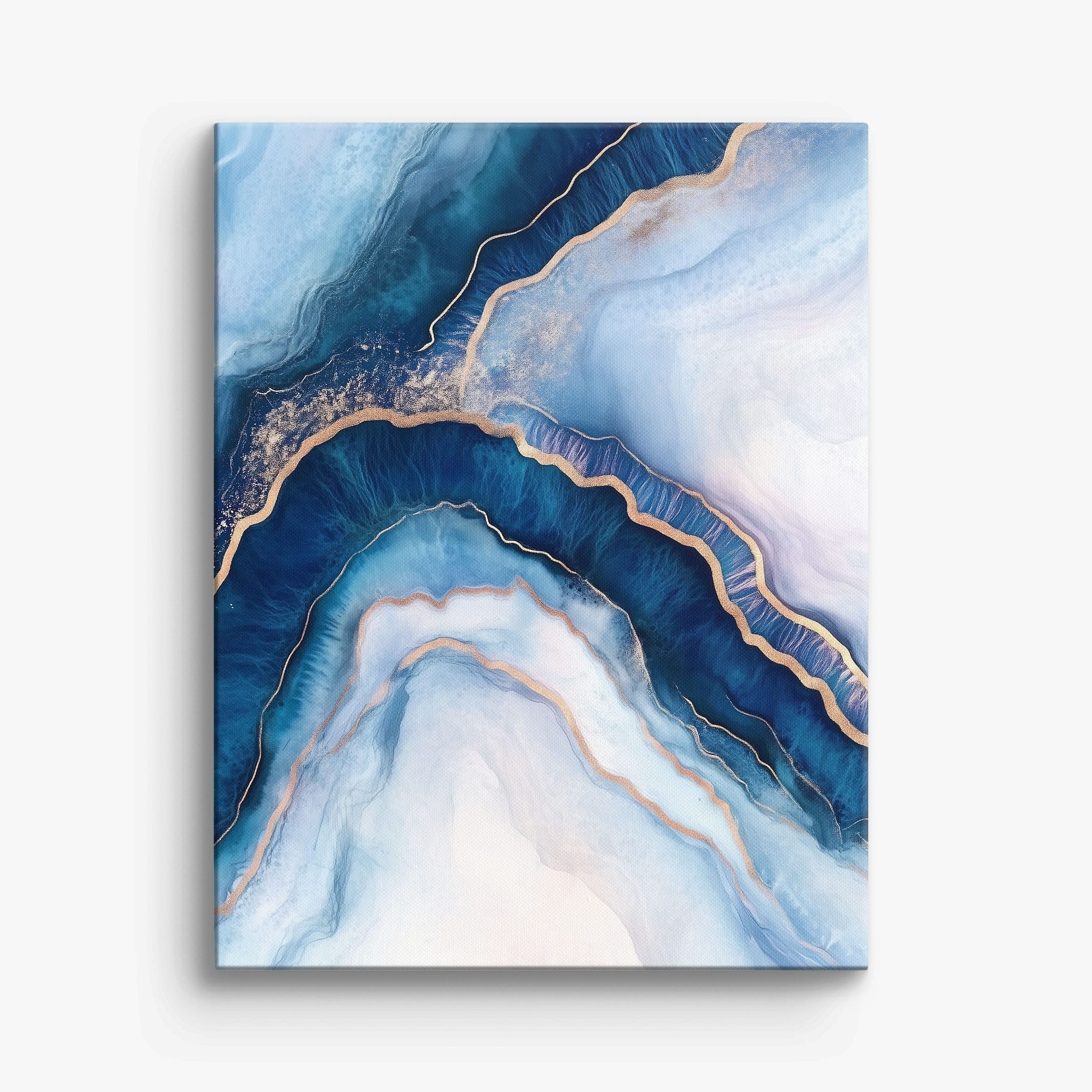 Marvel at the fluid motion captured in Tranquil Waves of Calming Blues, a mixed media artwork that skillfully intertwines deep blue hues with layers of creamy whites and gold accents. The abstract design mimics serene ocean waves rolling in a calm, rhythmic pattern, evoking a sense of peace and stillness. Perfect for any contemporary or minimalistic space, this piece instantly adds a touch of soothing elegance. Add this serene seascape to your space to enjoy a daily glimpse of oceanic tranquility.