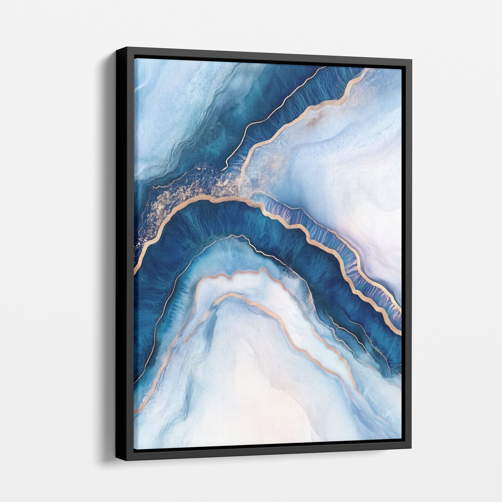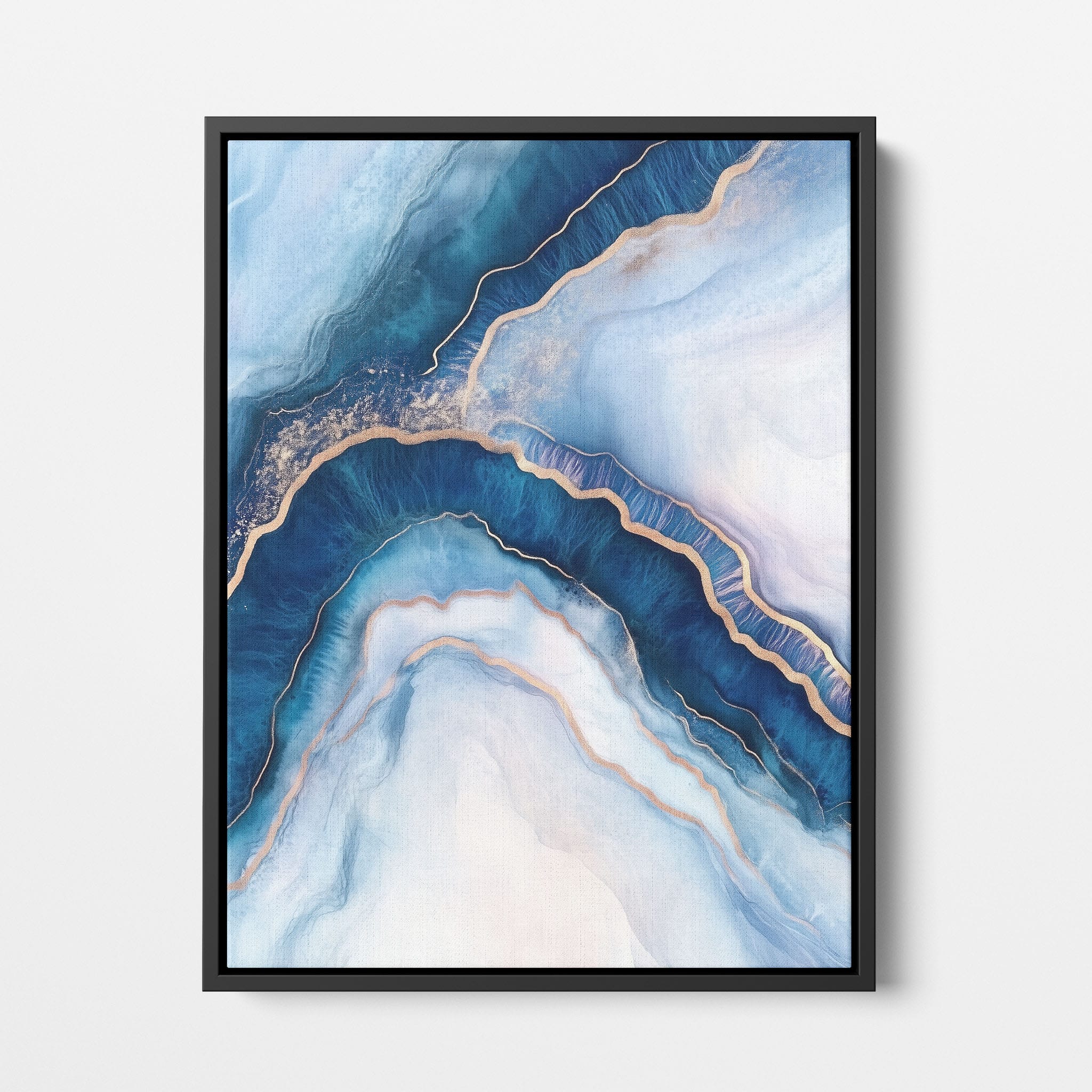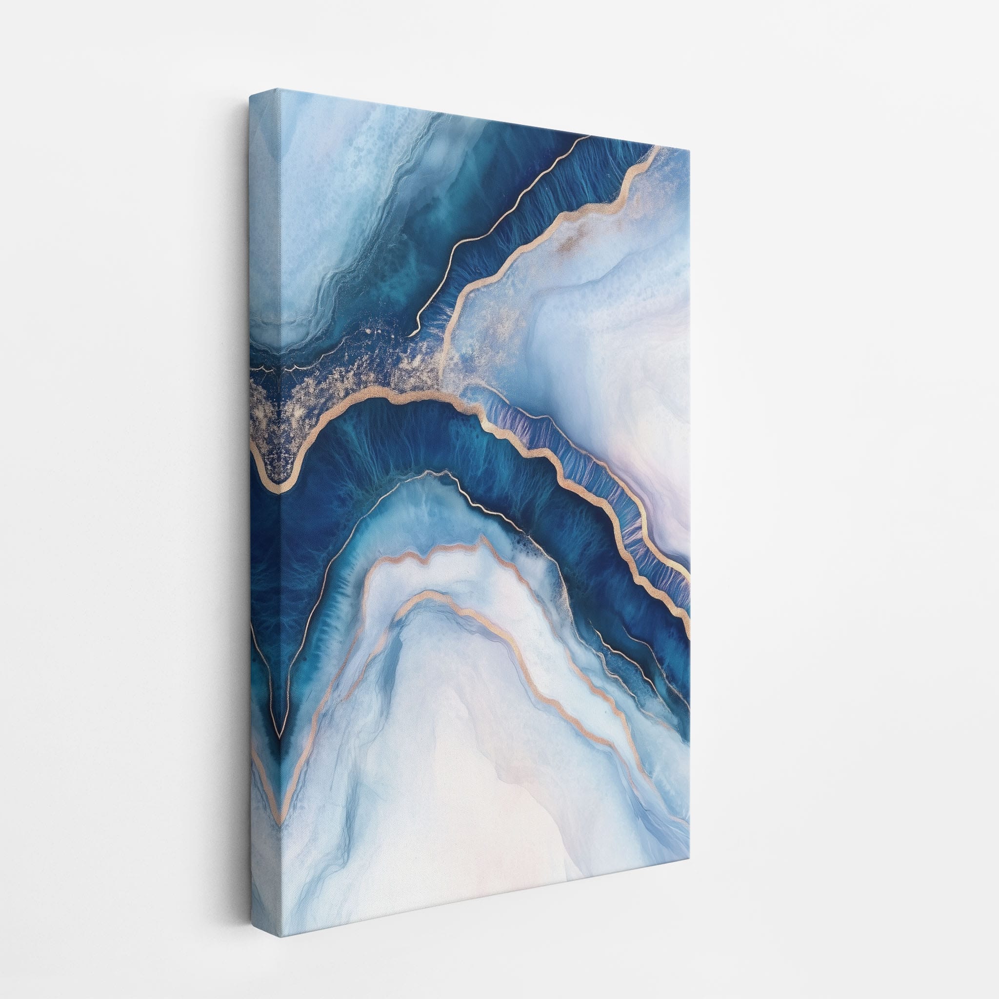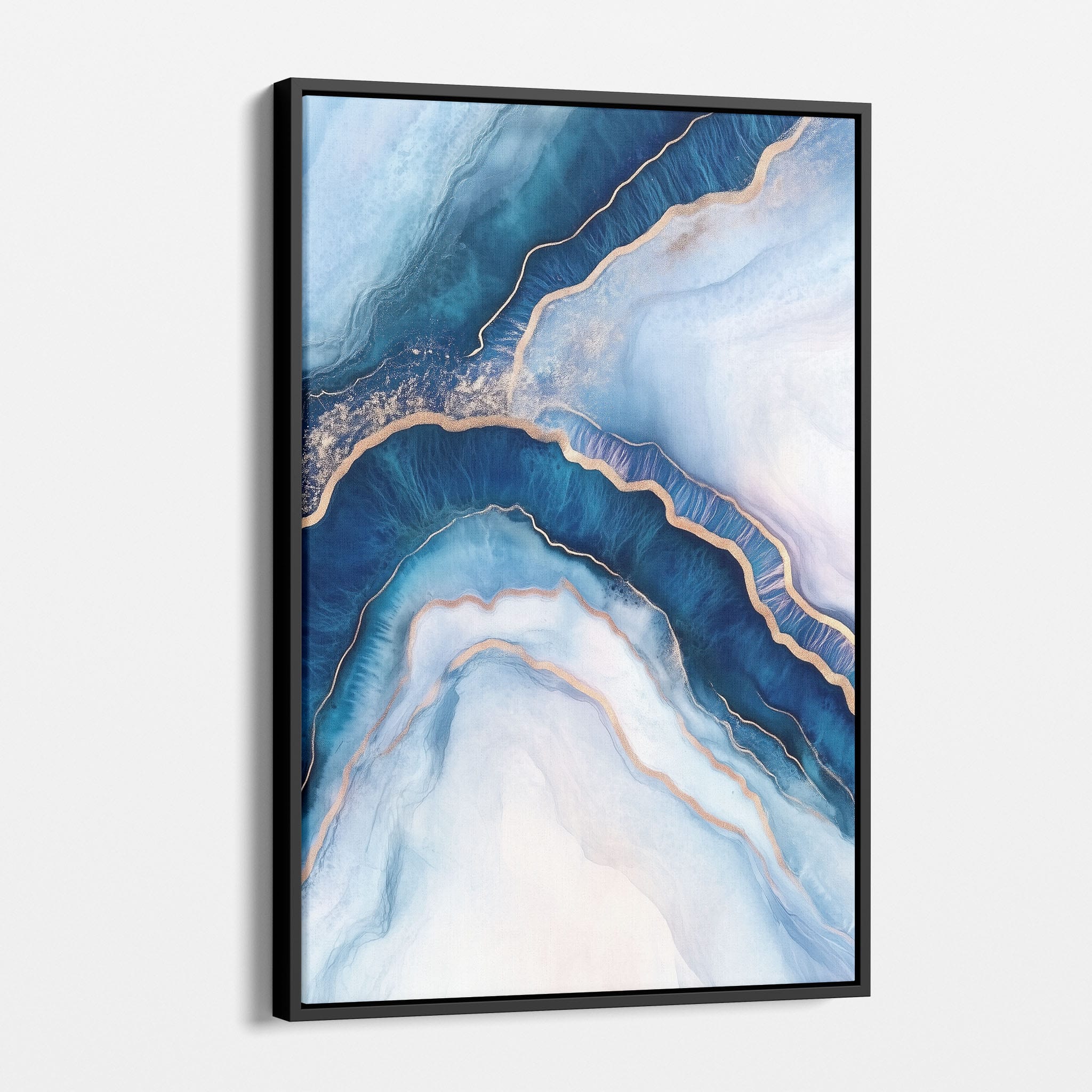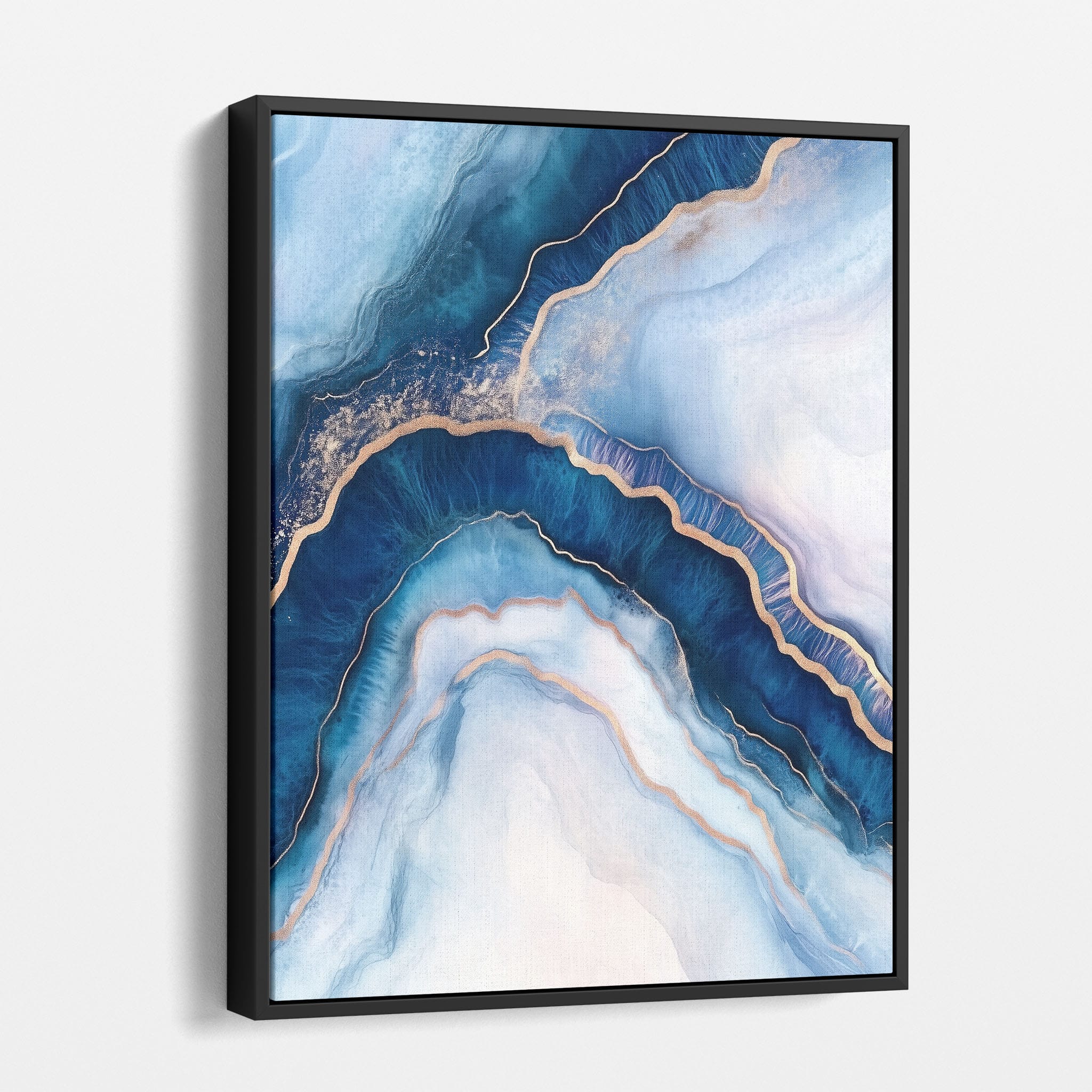 Marvel at the fluid motion captured in Tranquil Waves of Calming Blues, a mixed media artwork that skillfully intertwines deep blue hues with layers of creamy whites and gold accents. The abstract design mimics serene ocean waves rolling in a calm, rhythmic pattern, evoking a sense of peace and stillness. Perfect for any contemporary or minimalistic space, this piece instantly adds a touch of soothing elegance. Add this serene seascape to your space to enjoy a daily glimpse of oceanic tranquility.
