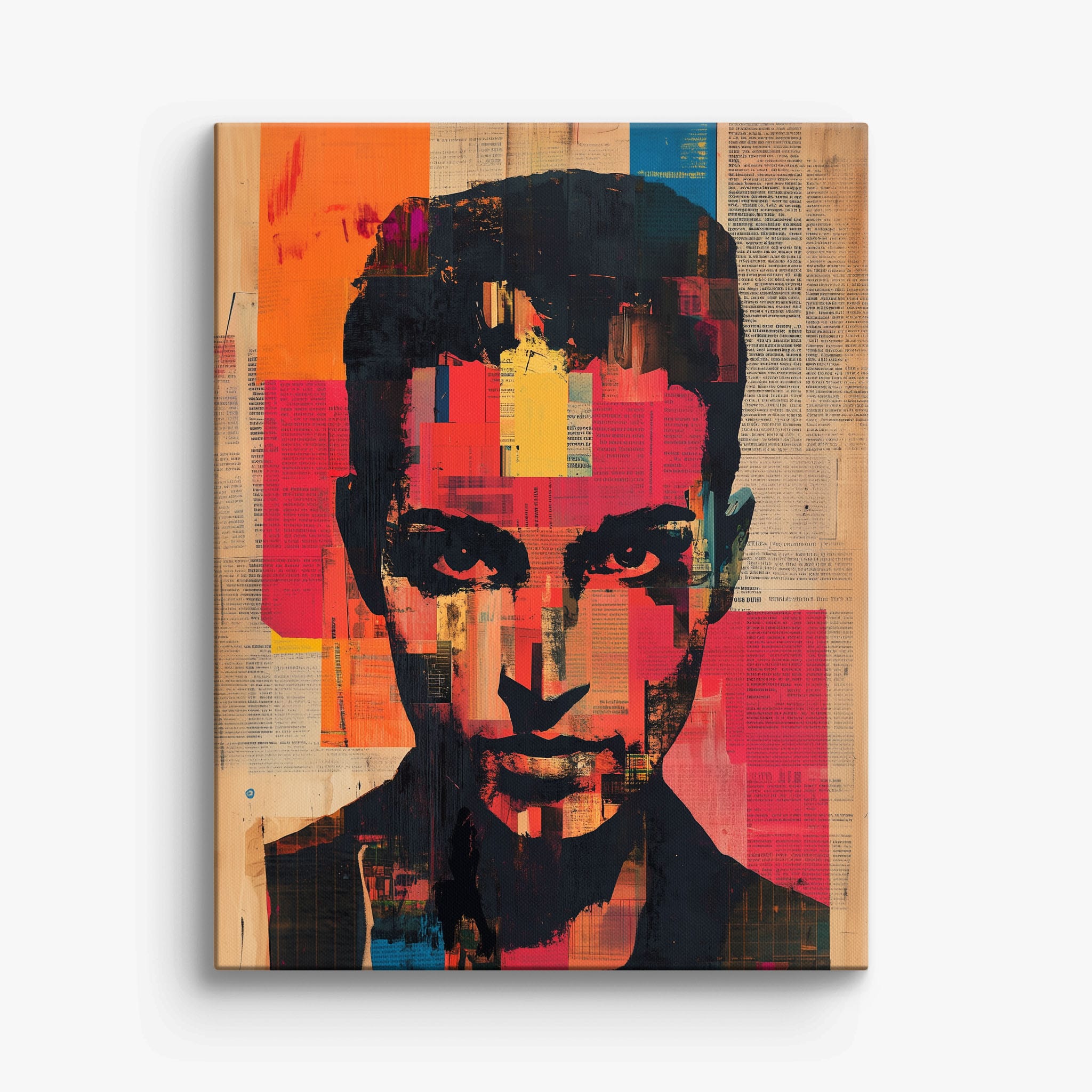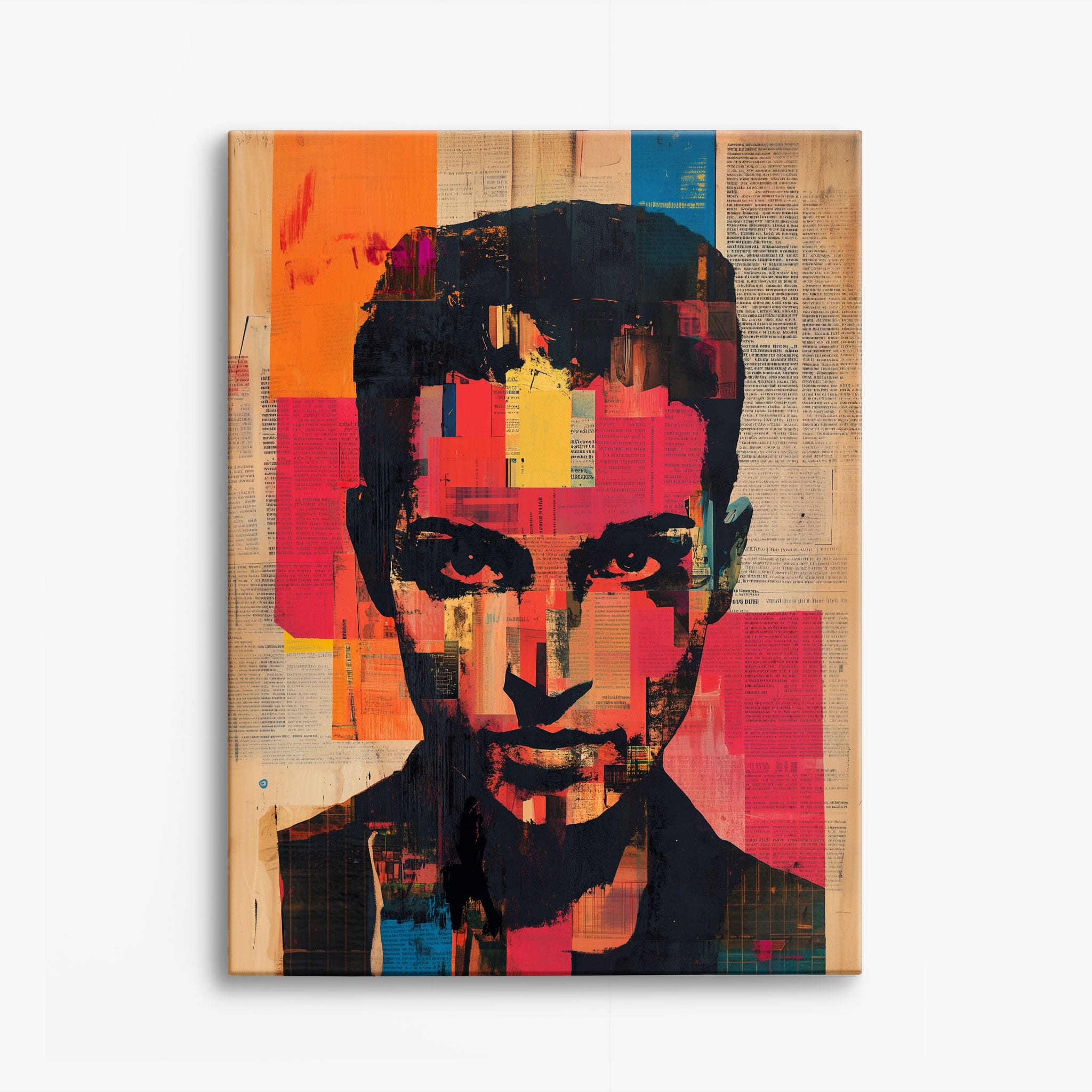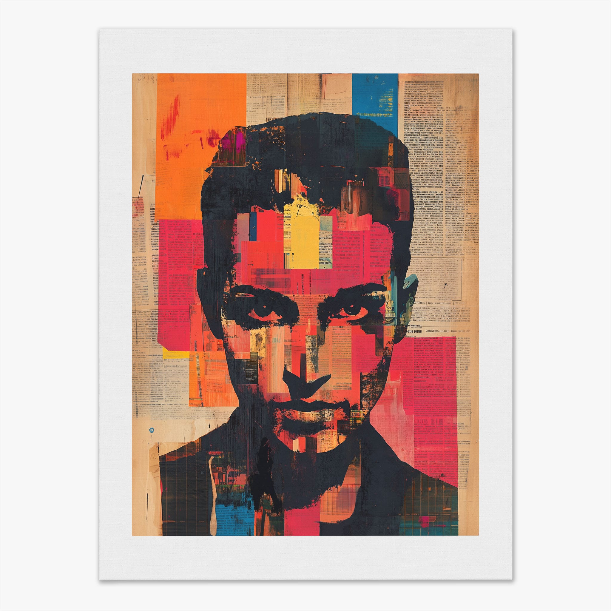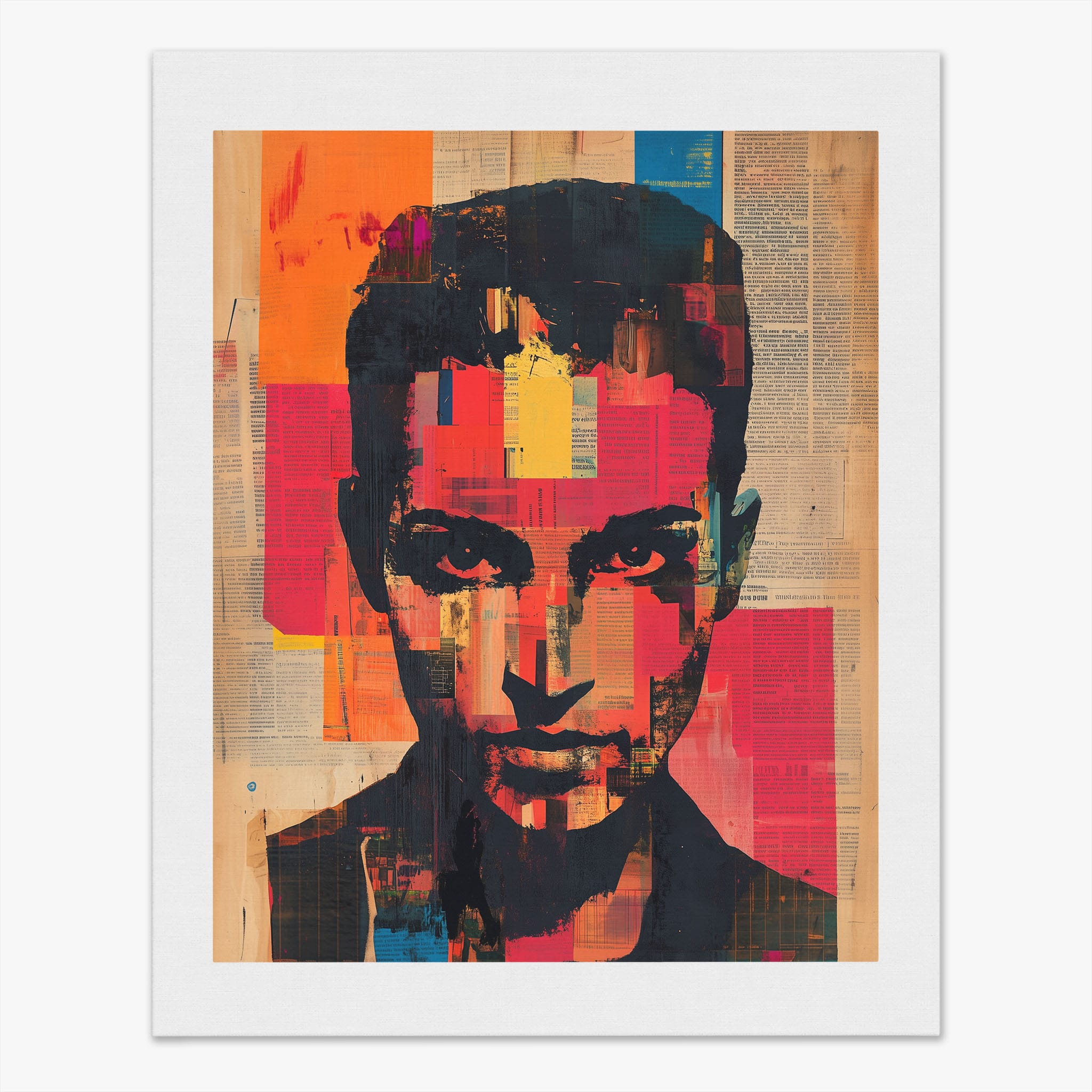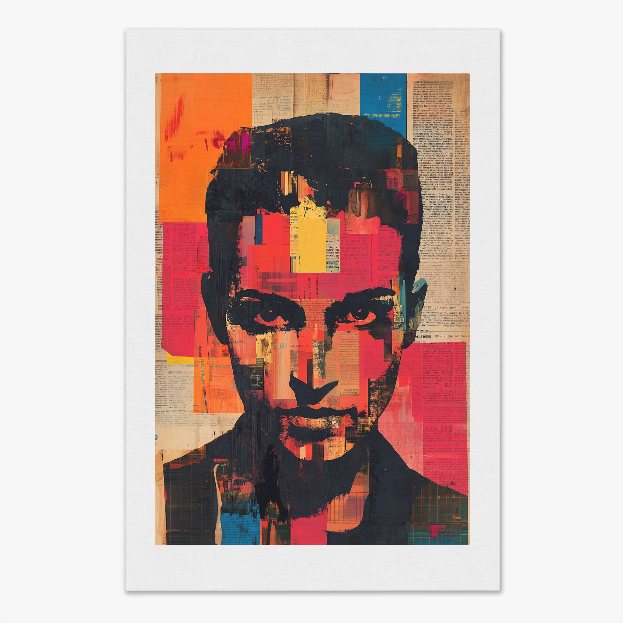 This mixed media masterpiece marries vivid modern art with abstract elements to convey a mesmerizing figurative representation. Shades of orange and blue contrast sharply against a textured backdrop of newspaper clippings, creating a captivating visual narrative. The bold, fragmented features of the central figure gaze hauntingly at the viewer, compelling one to ponder the stories layered beneath the brush strokes. Ideal for enhancing any modern living space or office, this artwork invites admiration and discussion, resonating with those who appreciate depth and dynamic color in art.