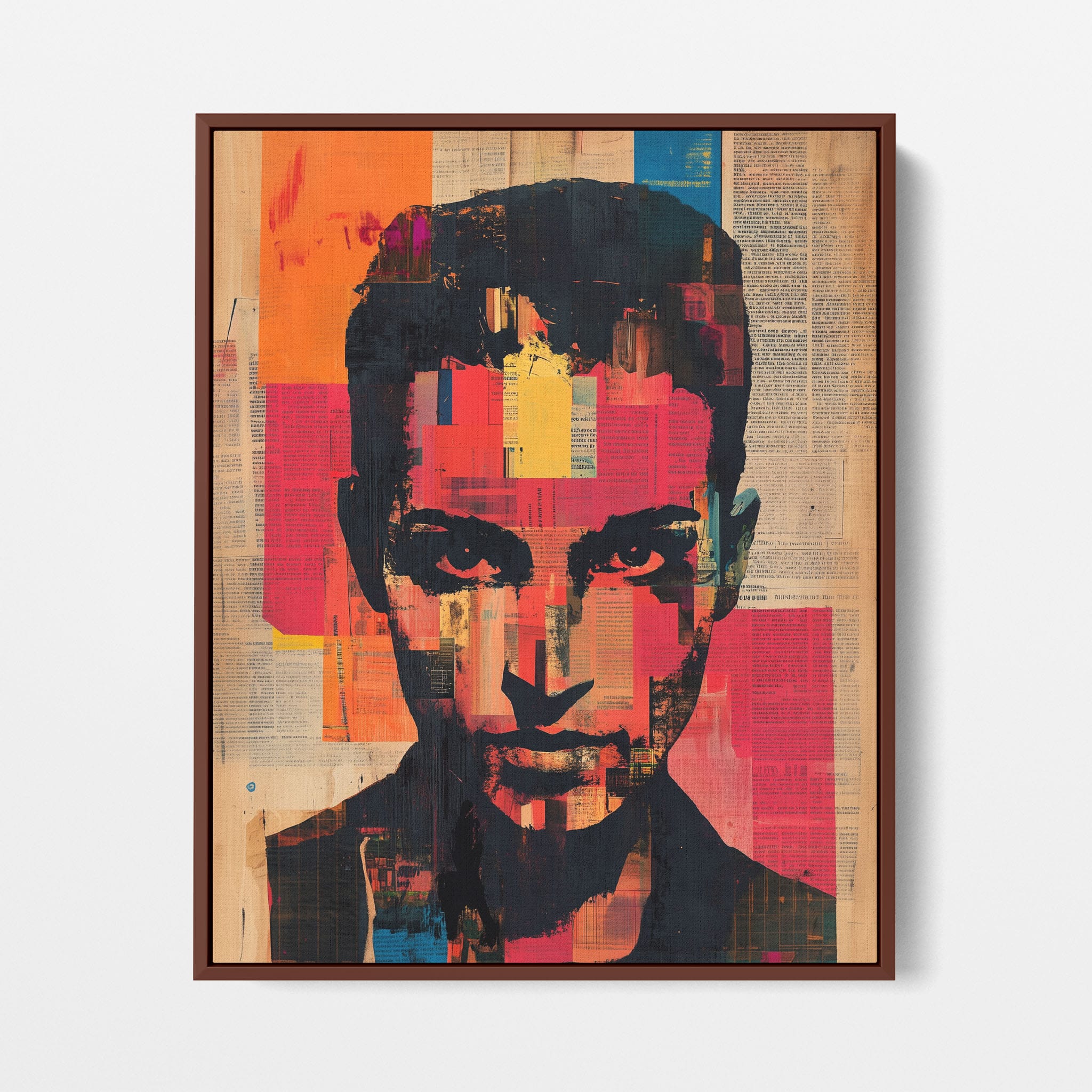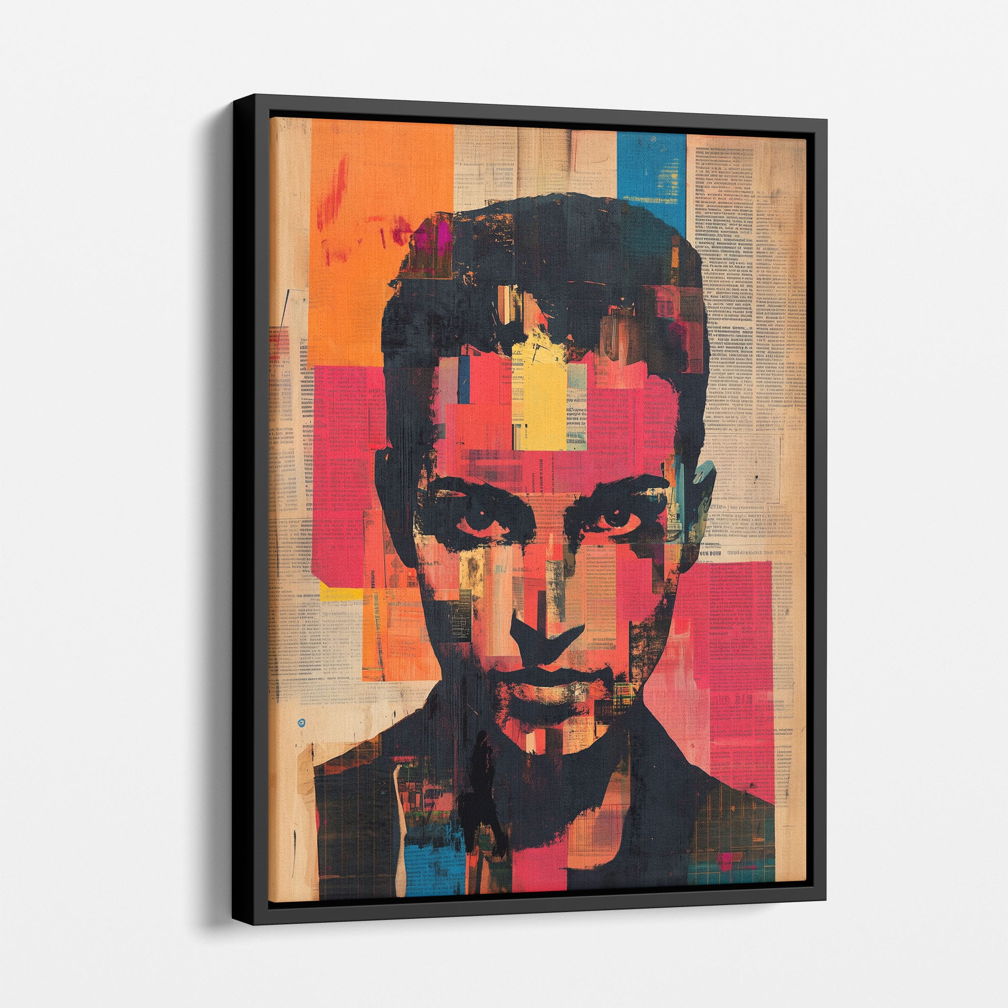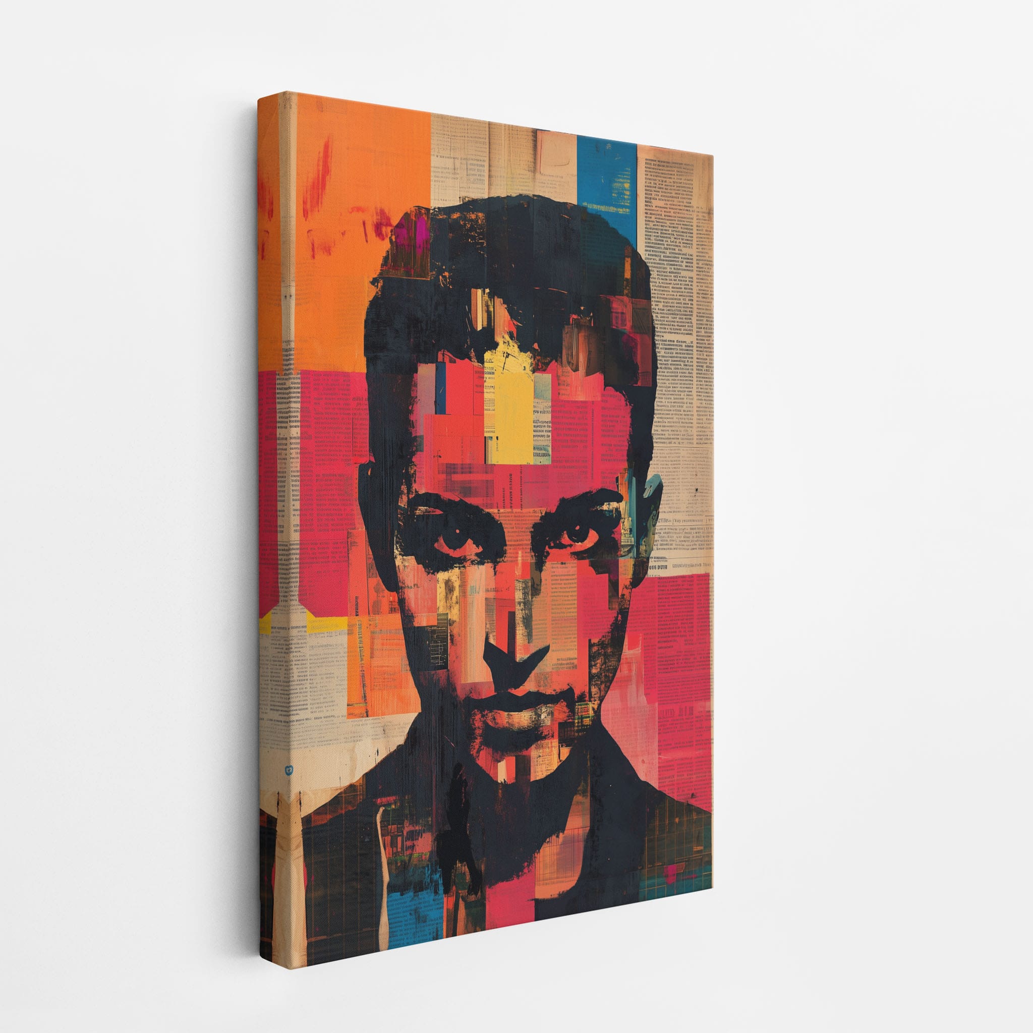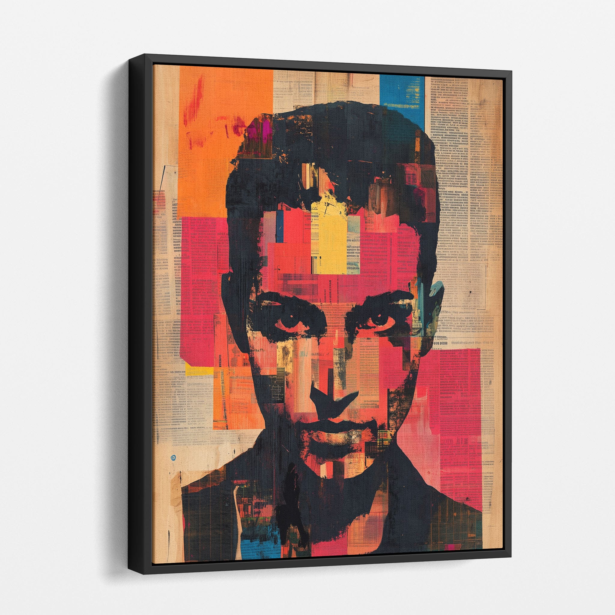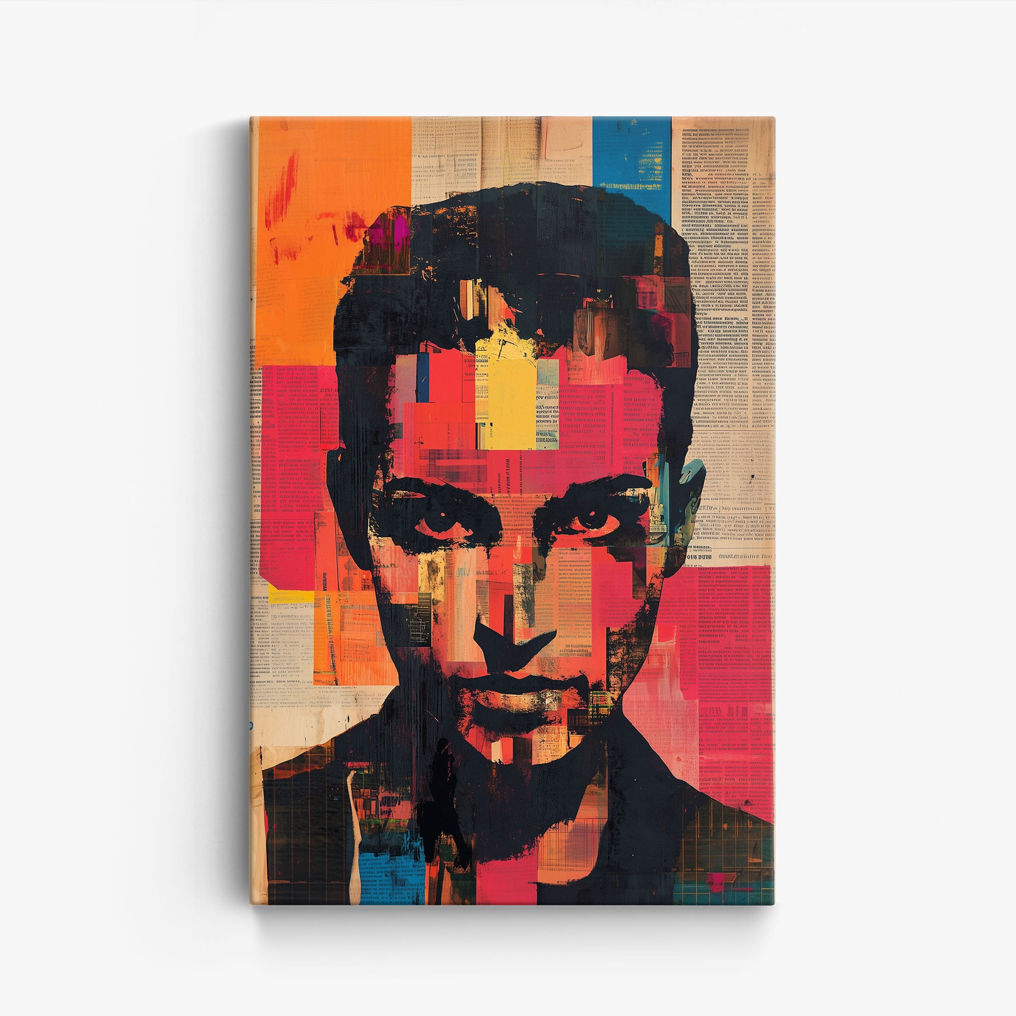 This mixed media masterpiece marries vivid modern art with abstract elements to convey a mesmerizing figurative representation. Shades of orange and blue contrast sharply against a textured backdrop of newspaper clippings, creating a captivating visual narrative. The bold, fragmented features of the central figure gaze hauntingly at the viewer, compelling one to ponder the stories layered beneath the brush strokes. Ideal for enhancing any modern living space or office, this artwork invites admiration and discussion, resonating with those who appreciate depth and dynamic color in art.