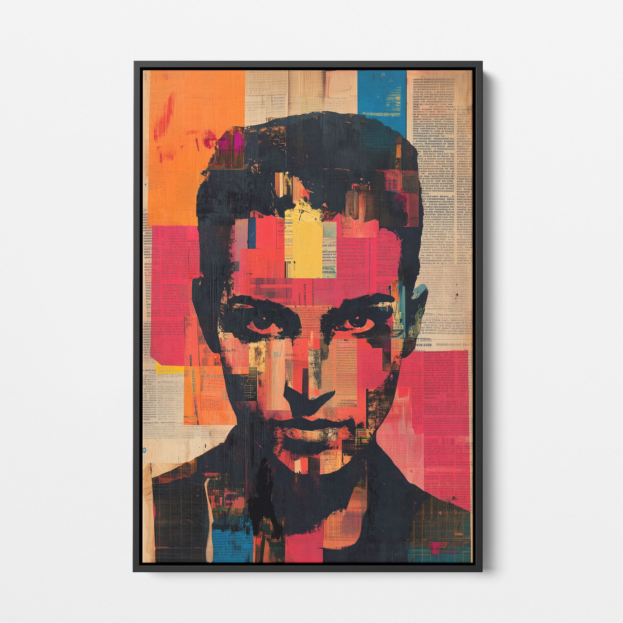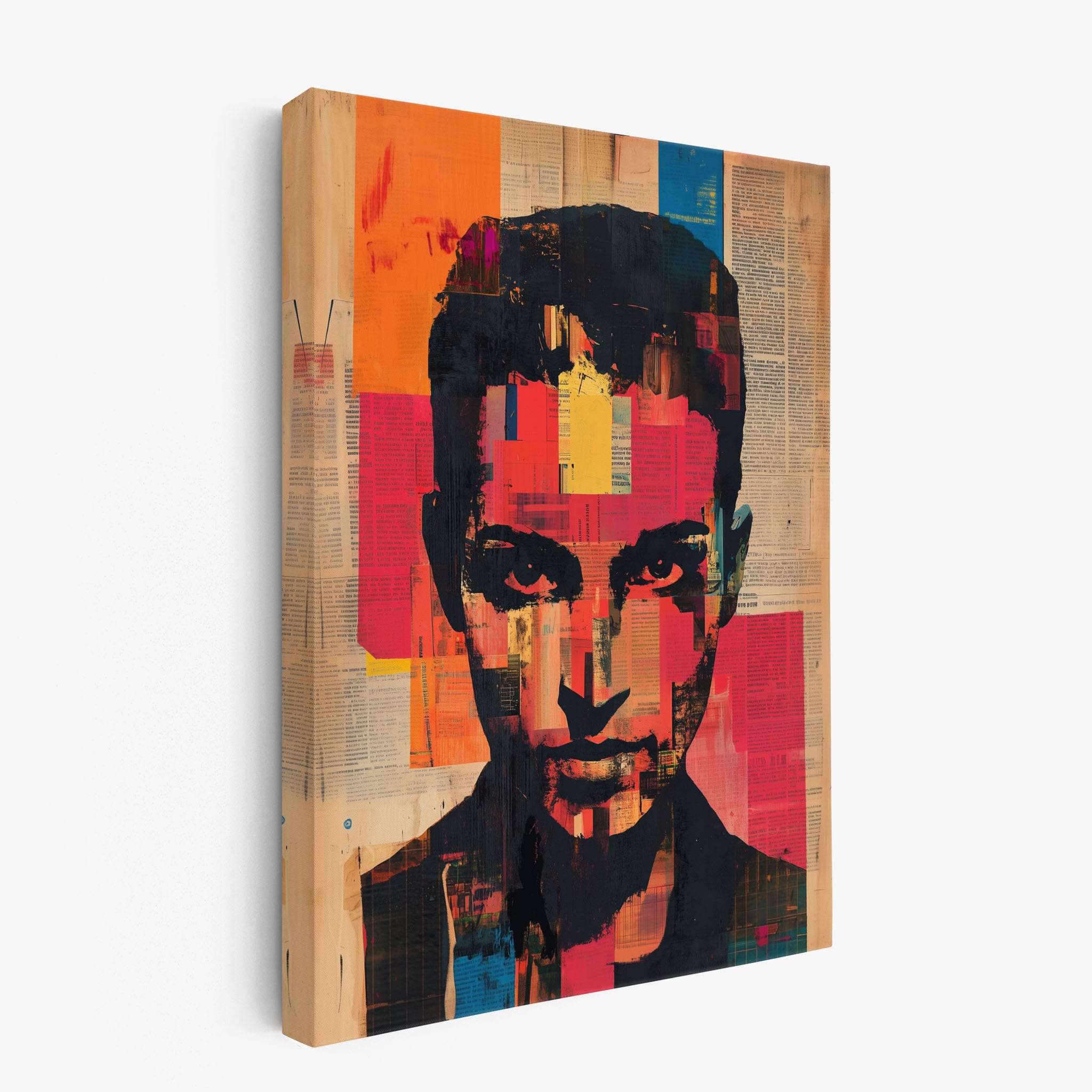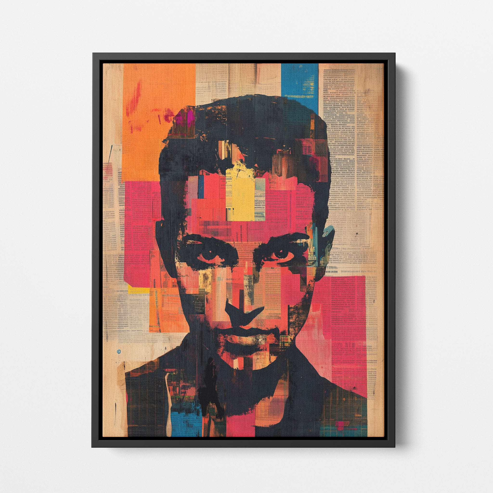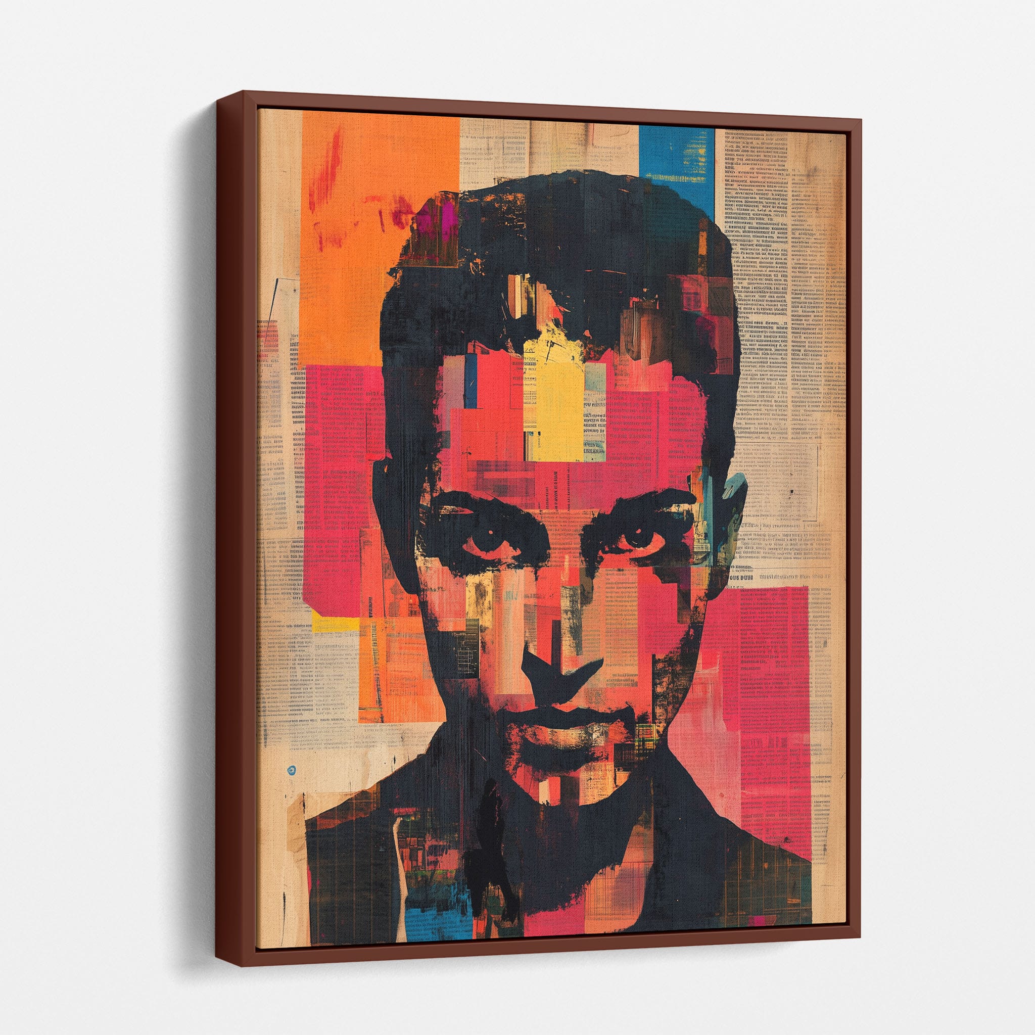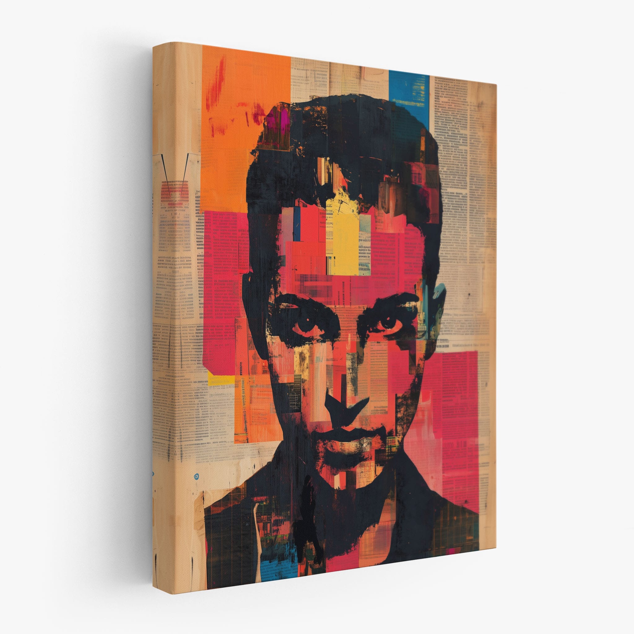 This mixed media masterpiece marries vivid modern art with abstract elements to convey a mesmerizing figurative representation. Shades of orange and blue contrast sharply against a textured backdrop of newspaper clippings, creating a captivating visual narrative. The bold, fragmented features of the central figure gaze hauntingly at the viewer, compelling one to ponder the stories layered beneath the brush strokes. Ideal for enhancing any modern living space or office, this artwork invites admiration and discussion, resonating with those who appreciate depth and dynamic color in art.