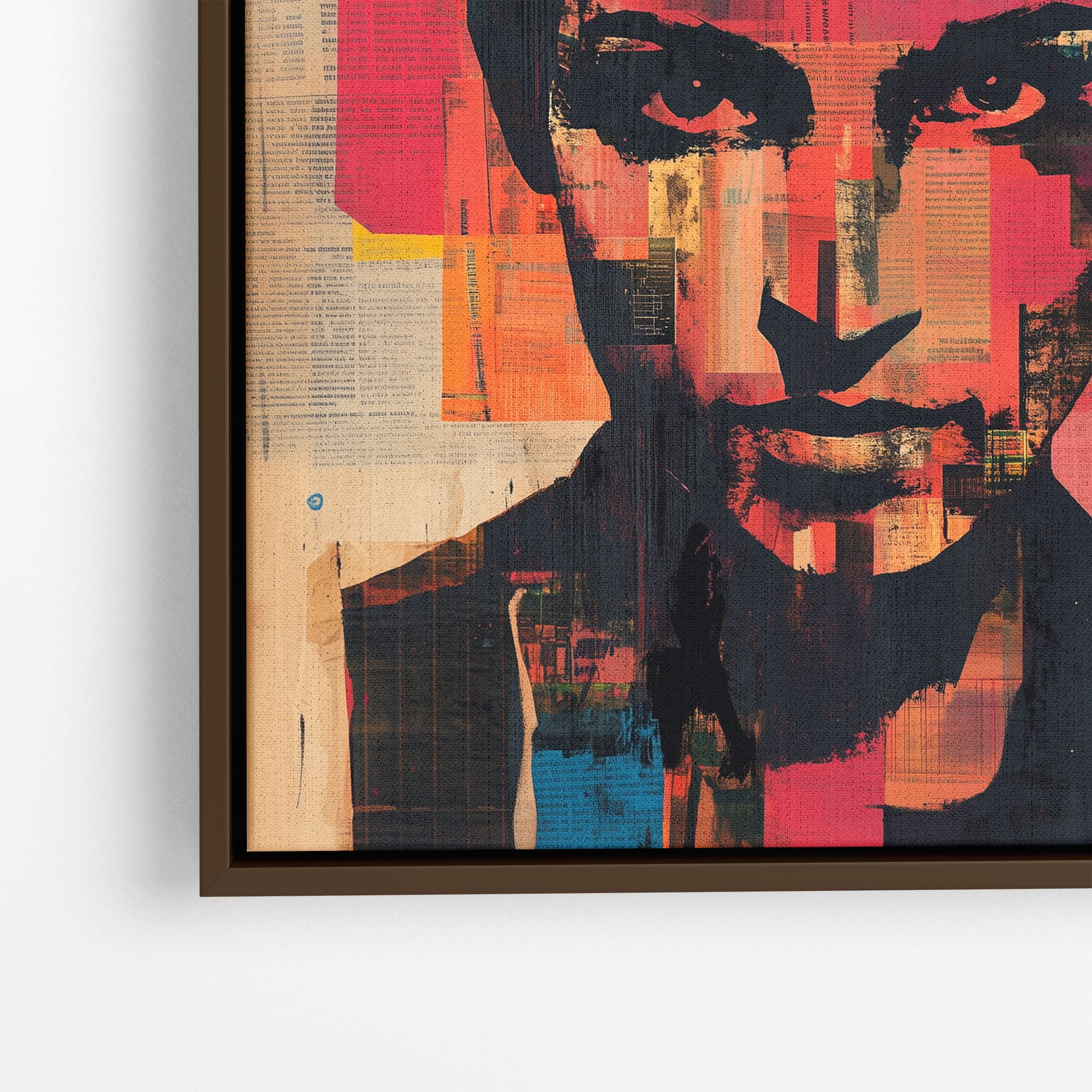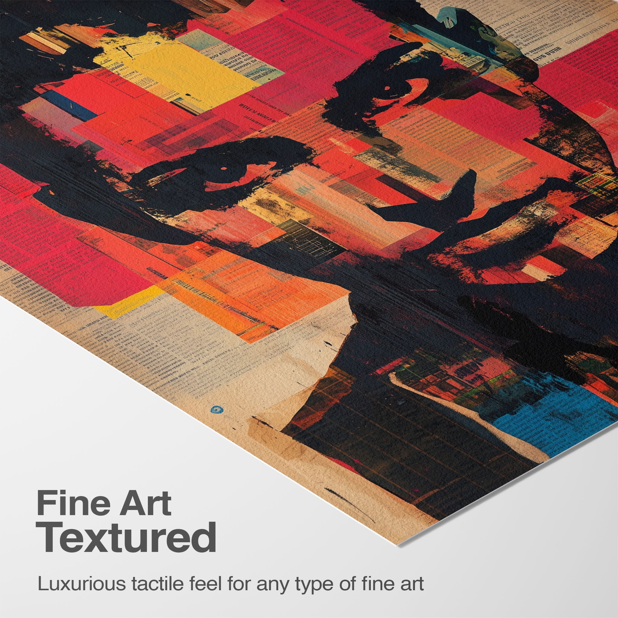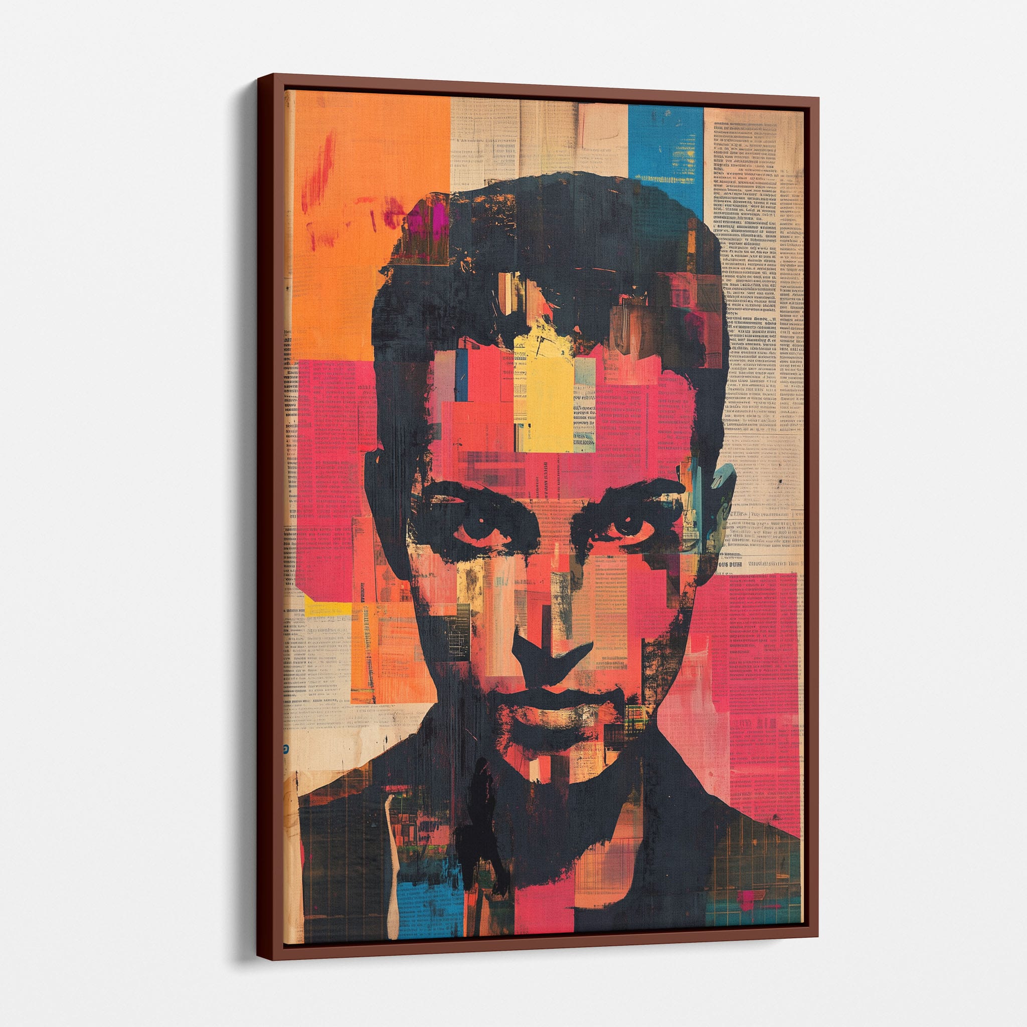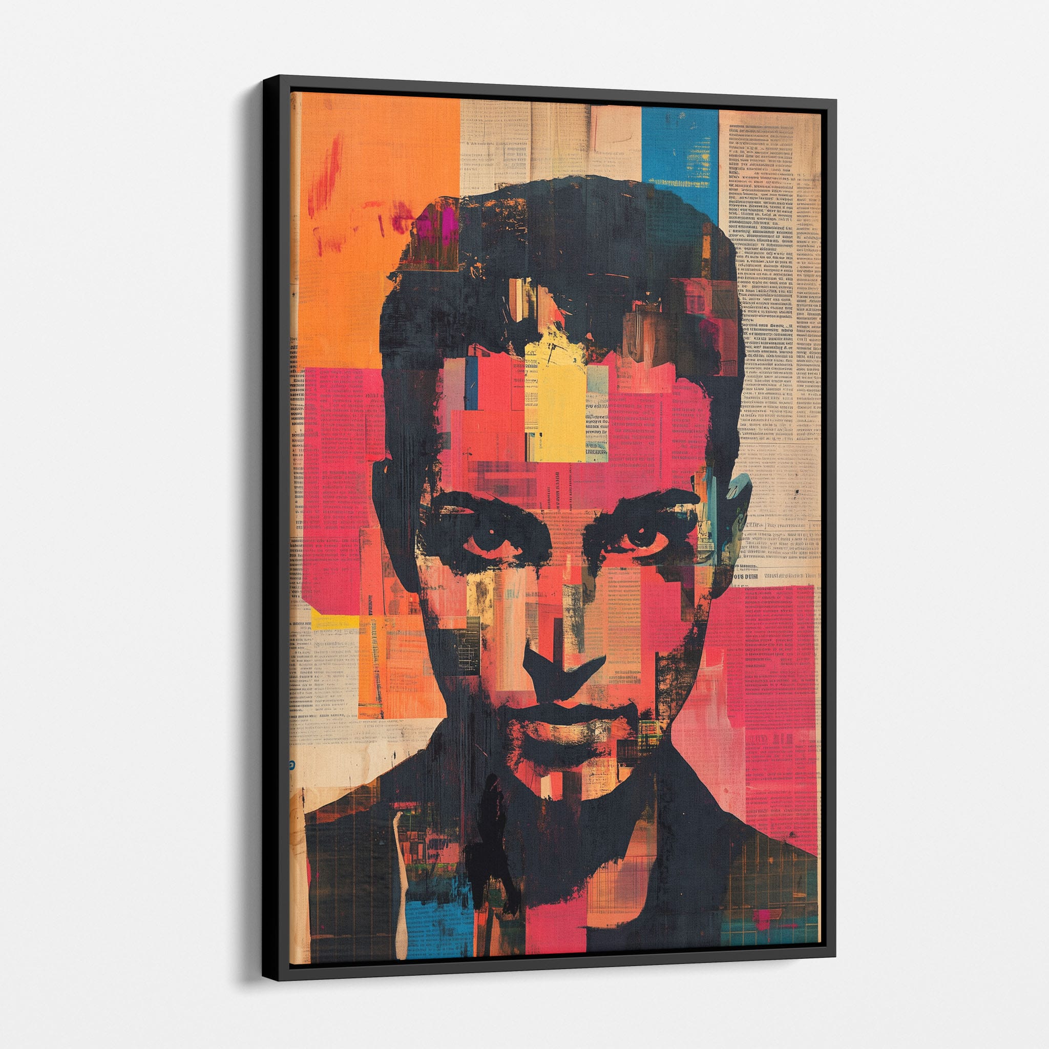 This mixed media masterpiece marries vivid modern art with abstract elements to convey a mesmerizing figurative representation. Shades of orange and blue contrast sharply against a textured backdrop of newspaper clippings, creating a captivating visual narrative. The bold, fragmented features of the central figure gaze hauntingly at the viewer, compelling one to ponder the stories layered beneath the brush strokes. Ideal for enhancing any modern living space or office, this artwork invites admiration and discussion, resonating with those who appreciate depth and dynamic color in art.