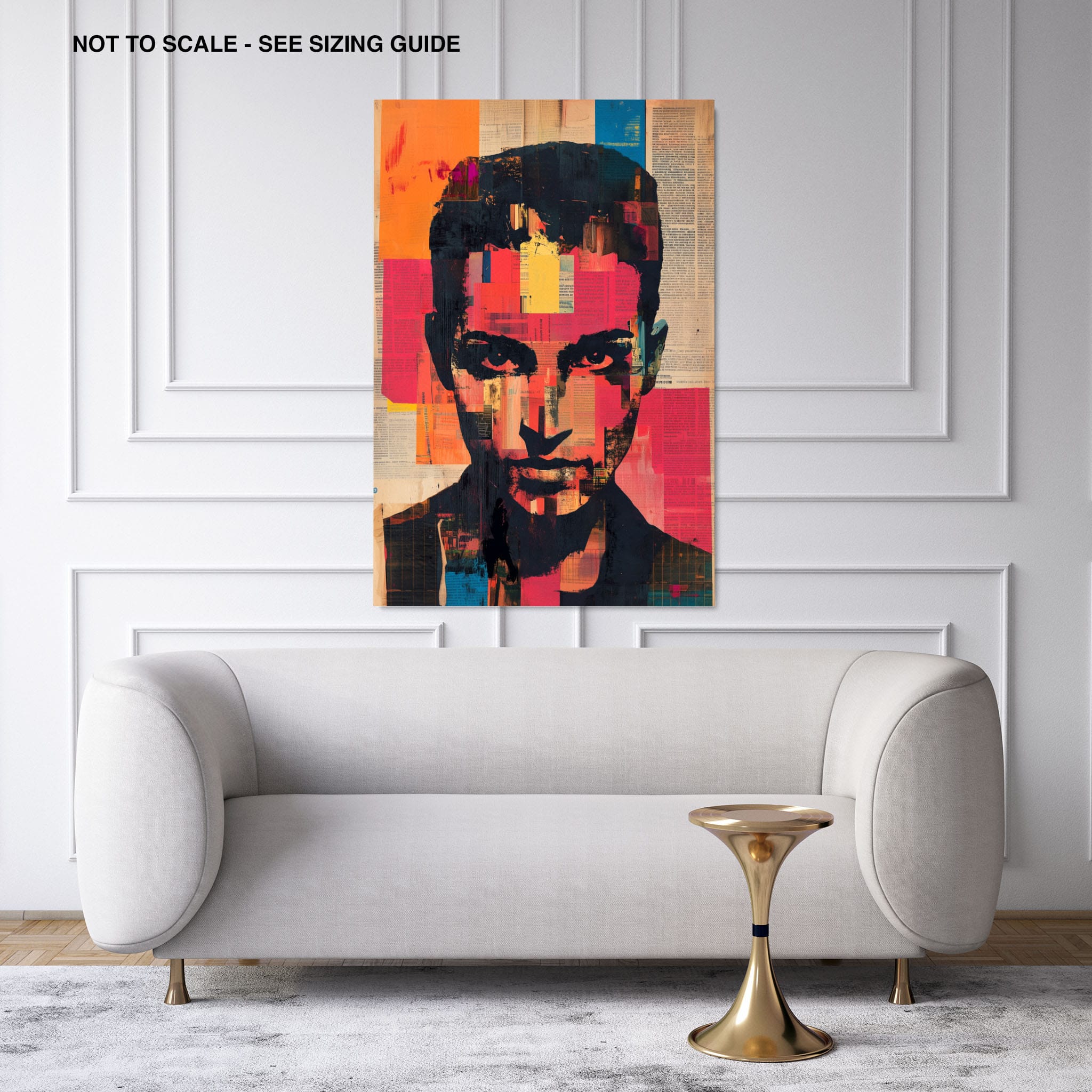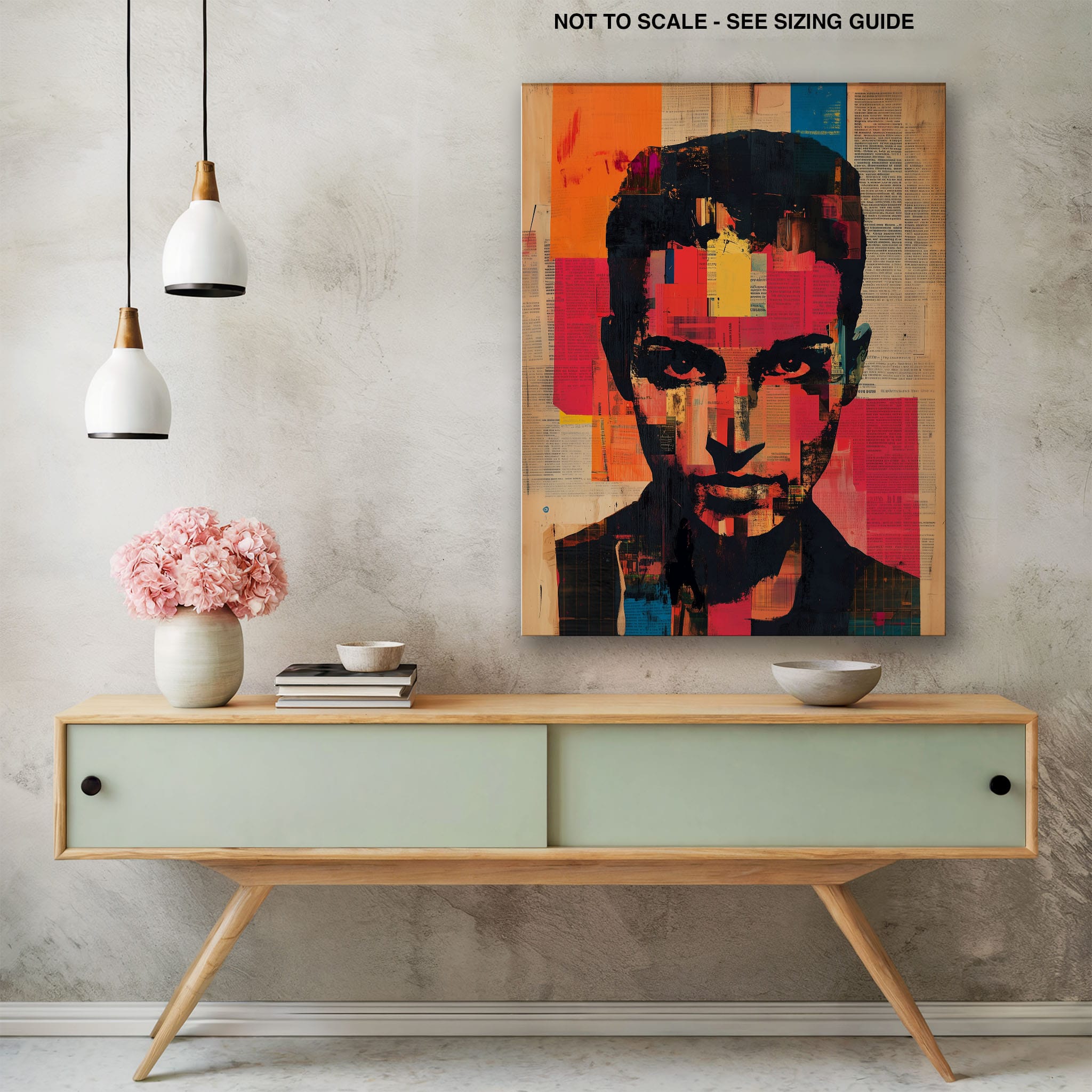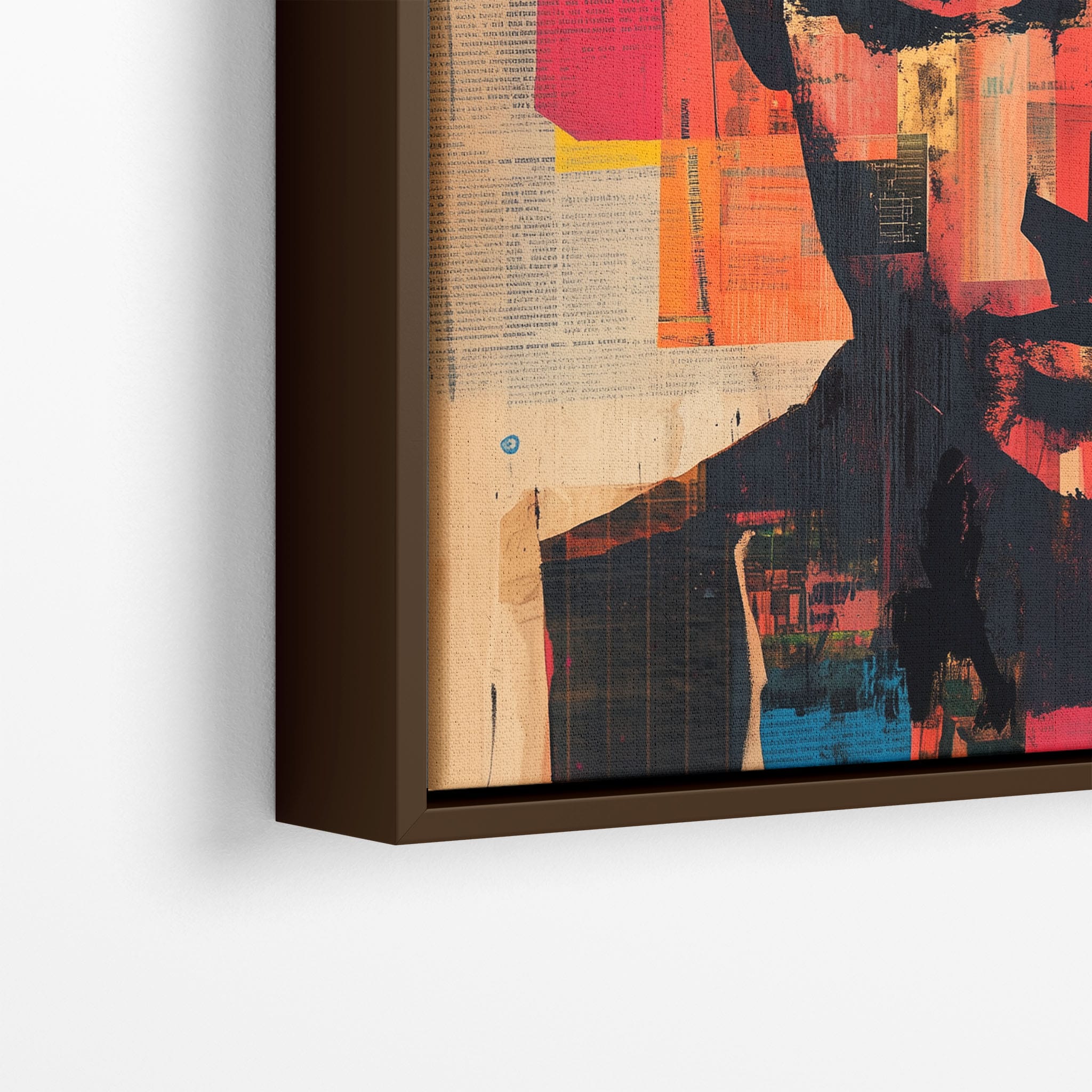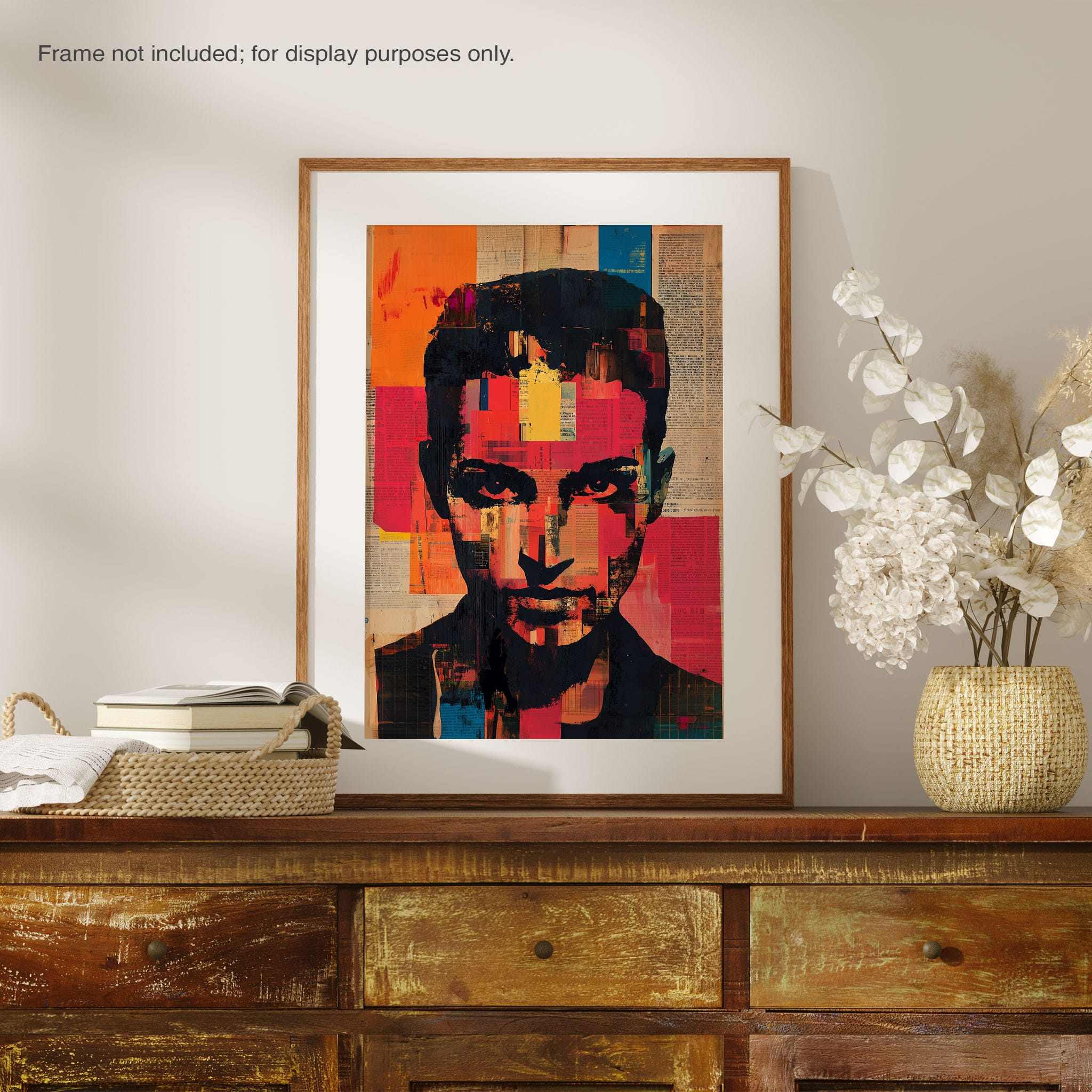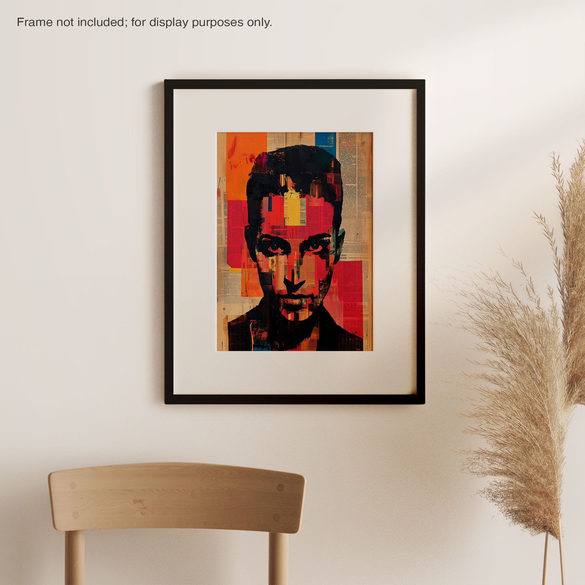 This mixed media masterpiece marries vivid modern art with abstract elements to convey a mesmerizing figurative representation. Shades of orange and blue contrast sharply against a textured backdrop of newspaper clippings, creating a captivating visual narrative. The bold, fragmented features of the central figure gaze hauntingly at the viewer, compelling one to ponder the stories layered beneath the brush strokes. Ideal for enhancing any modern living space or office, this artwork invites admiration and discussion, resonating with those who appreciate depth and dynamic color in art.