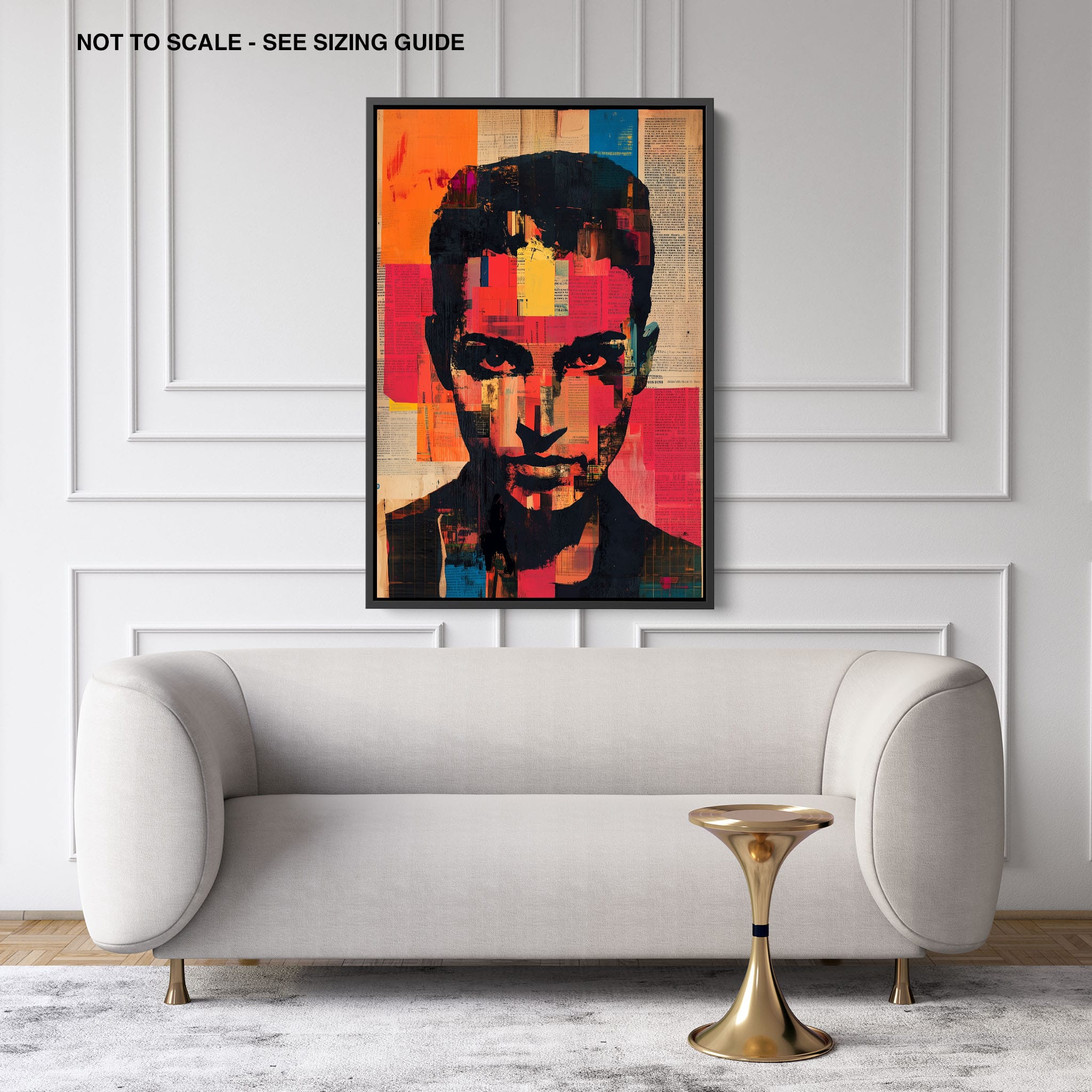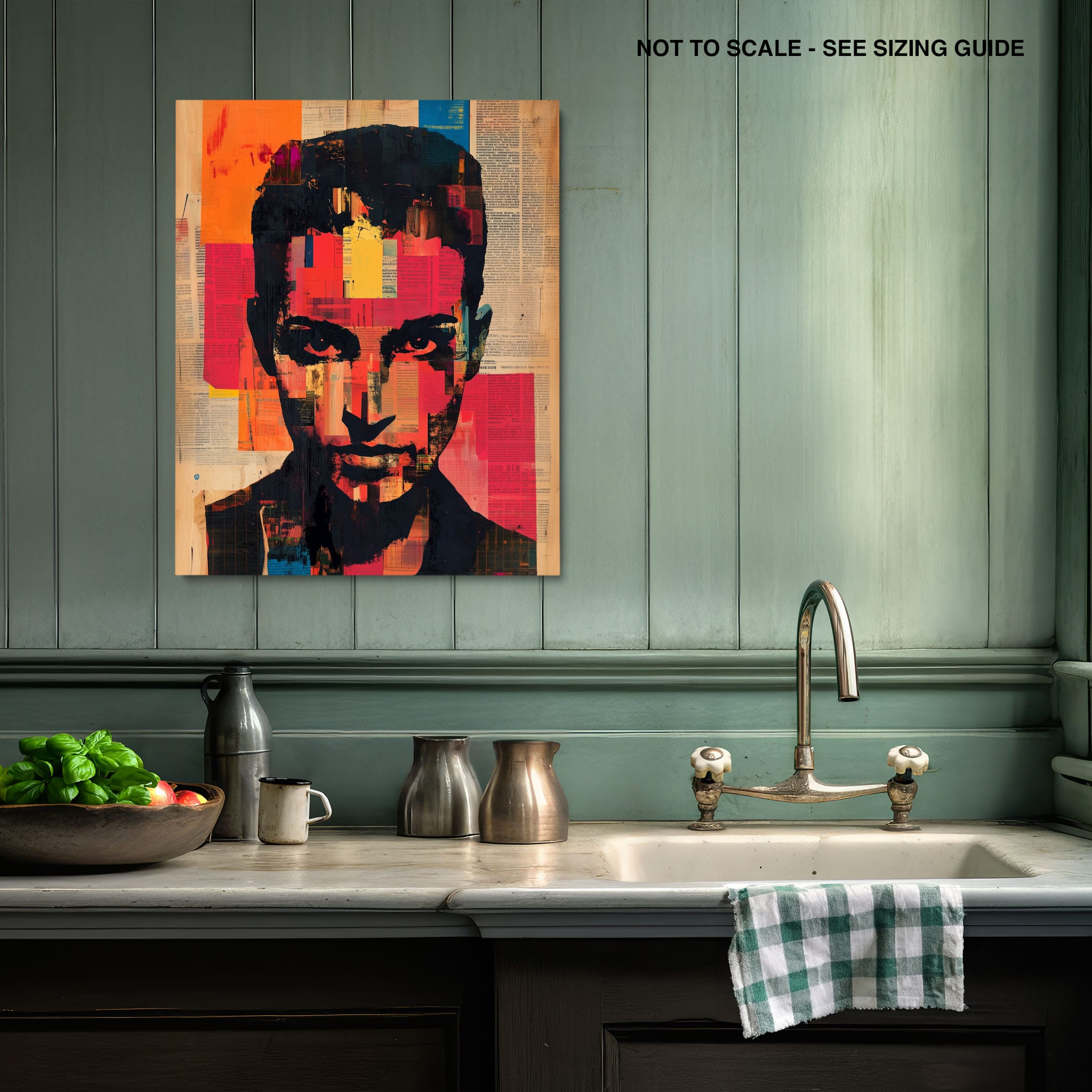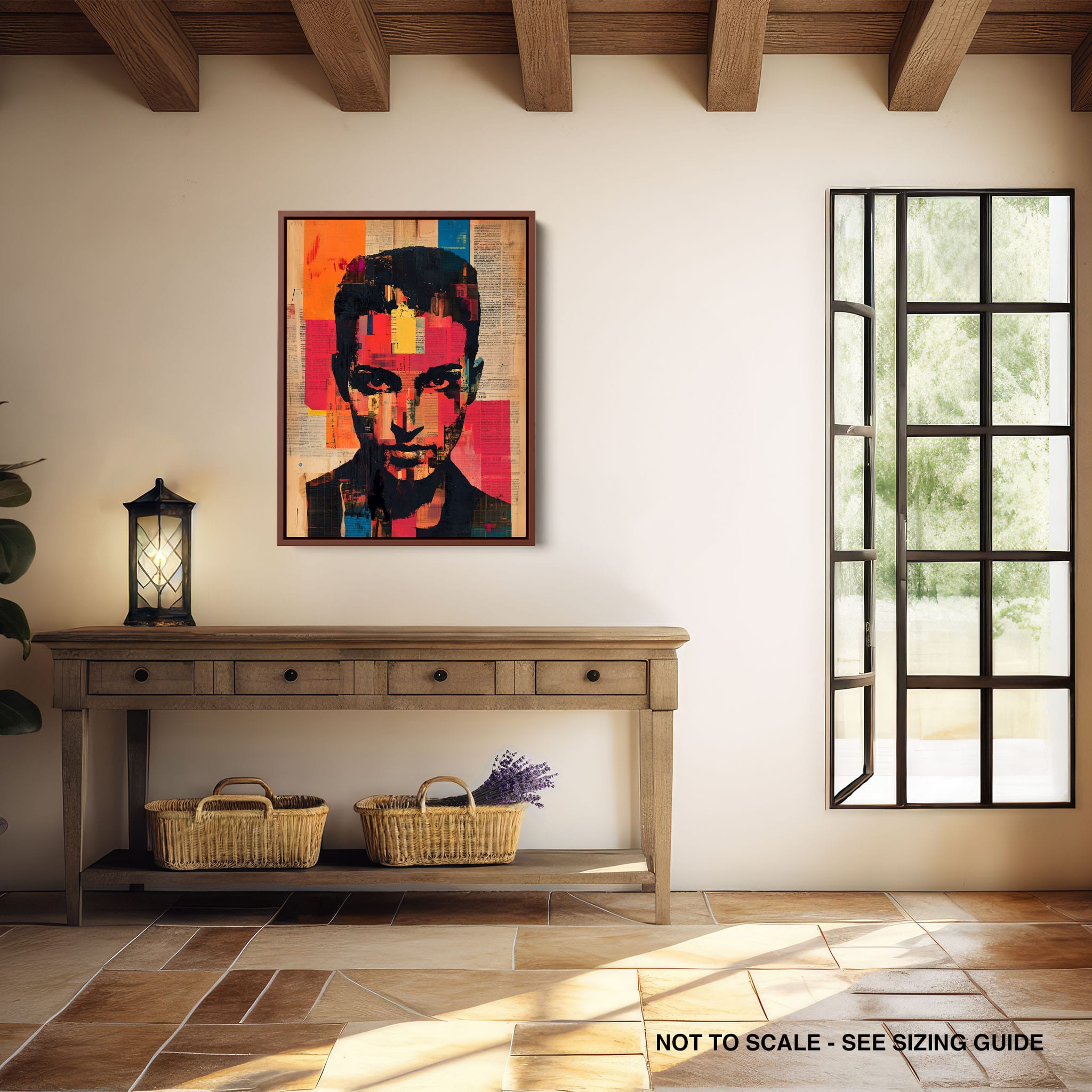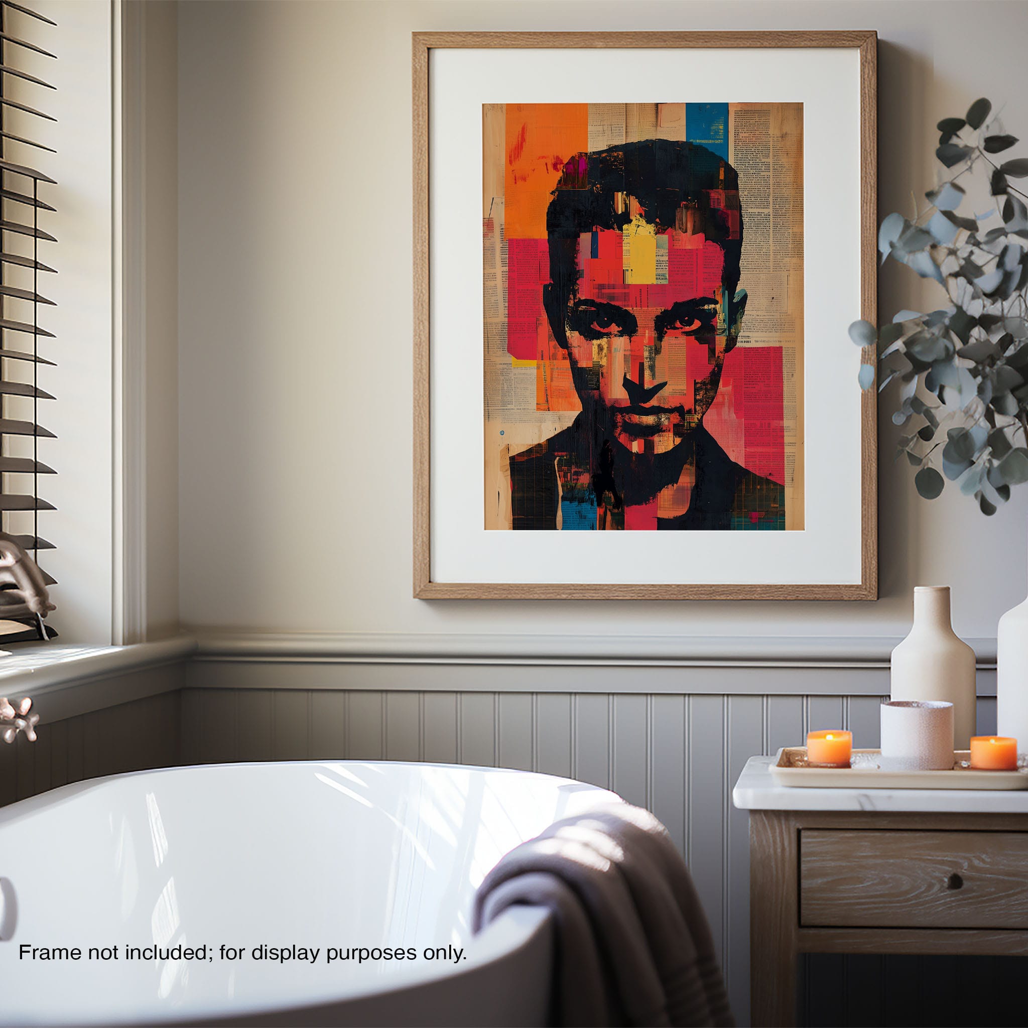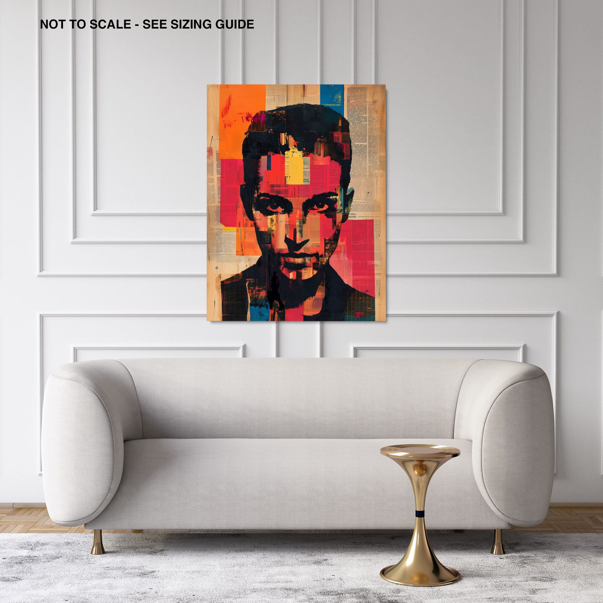 This mixed media masterpiece marries vivid modern art with abstract elements to convey a mesmerizing figurative representation. Shades of orange and blue contrast sharply against a textured backdrop of newspaper clippings, creating a captivating visual narrative. The bold, fragmented features of the central figure gaze hauntingly at the viewer, compelling one to ponder the stories layered beneath the brush strokes. Ideal for enhancing any modern living space or office, this artwork invites admiration and discussion, resonating with those who appreciate depth and dynamic color in art.