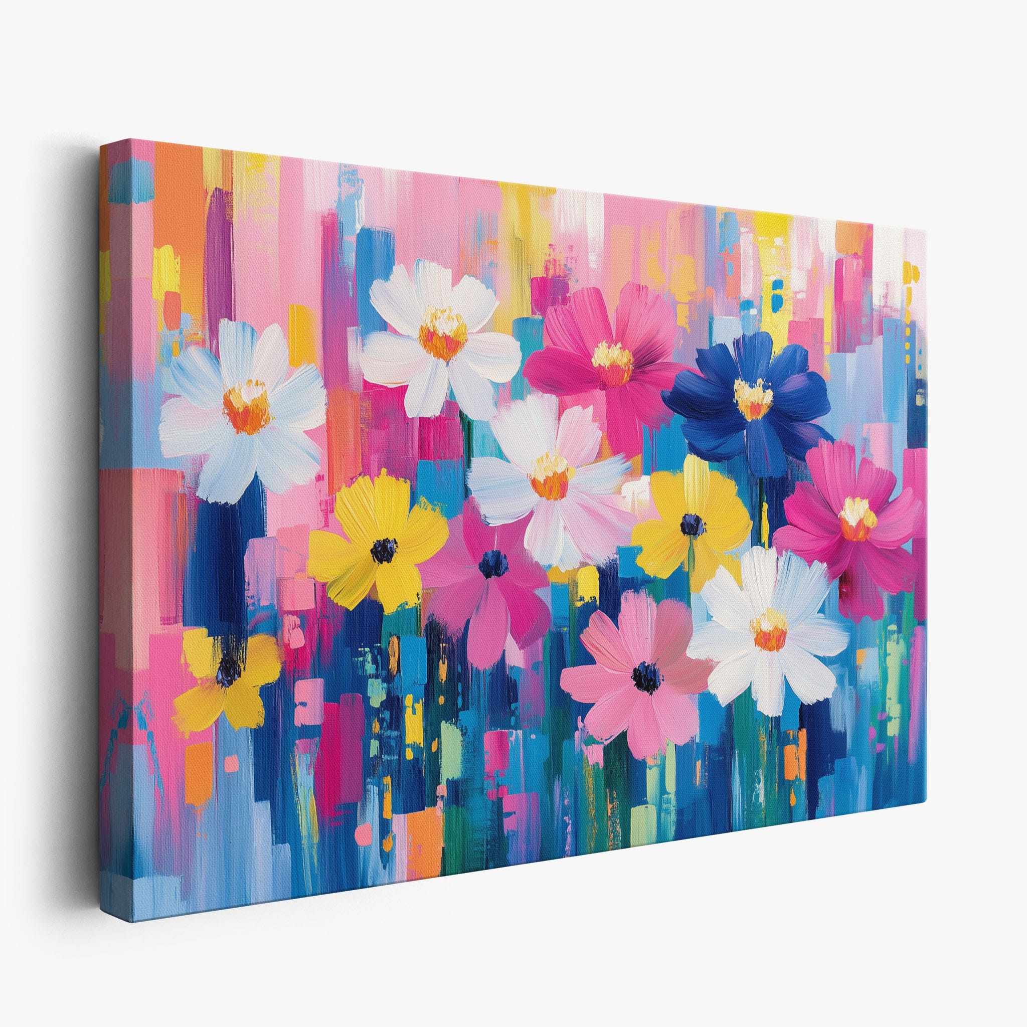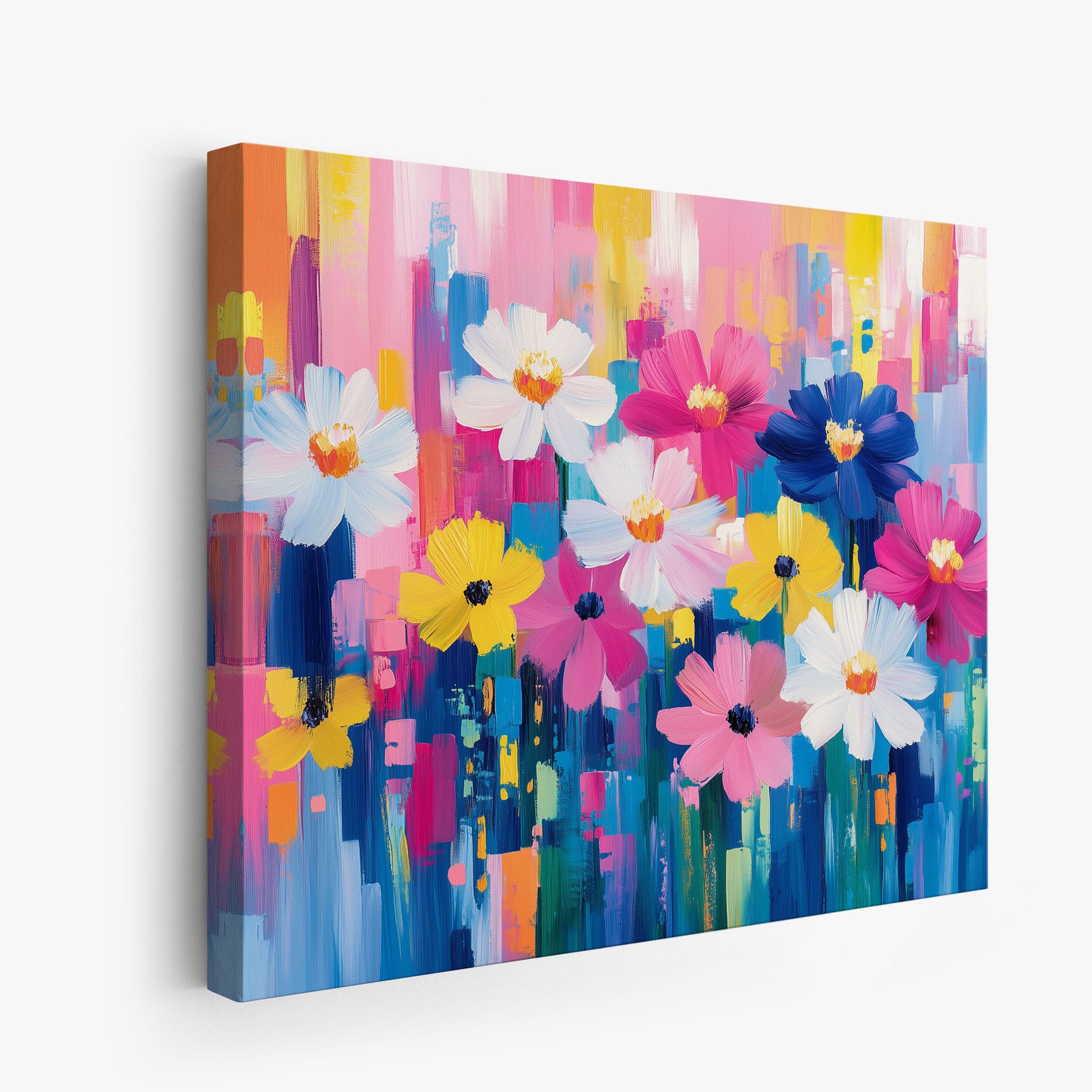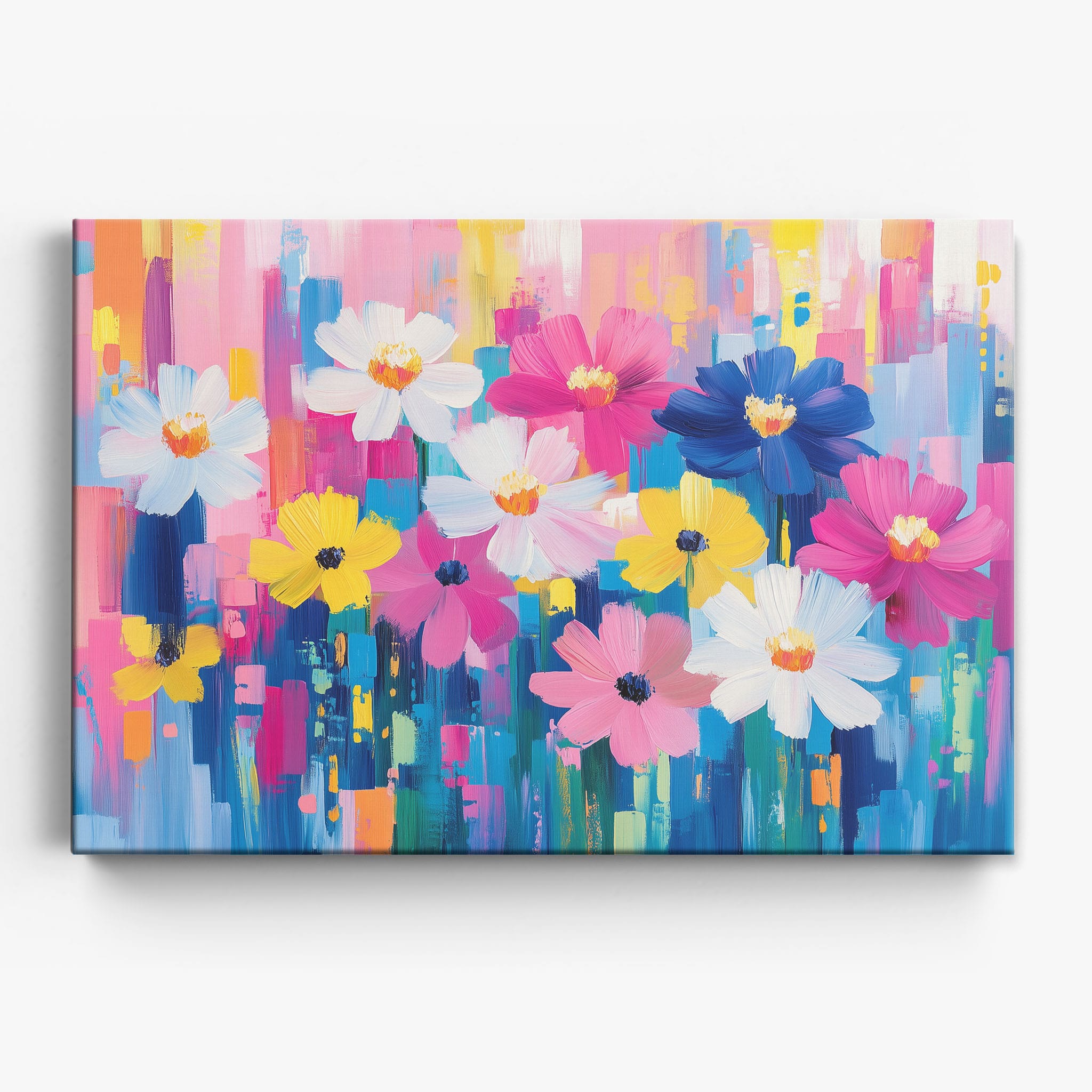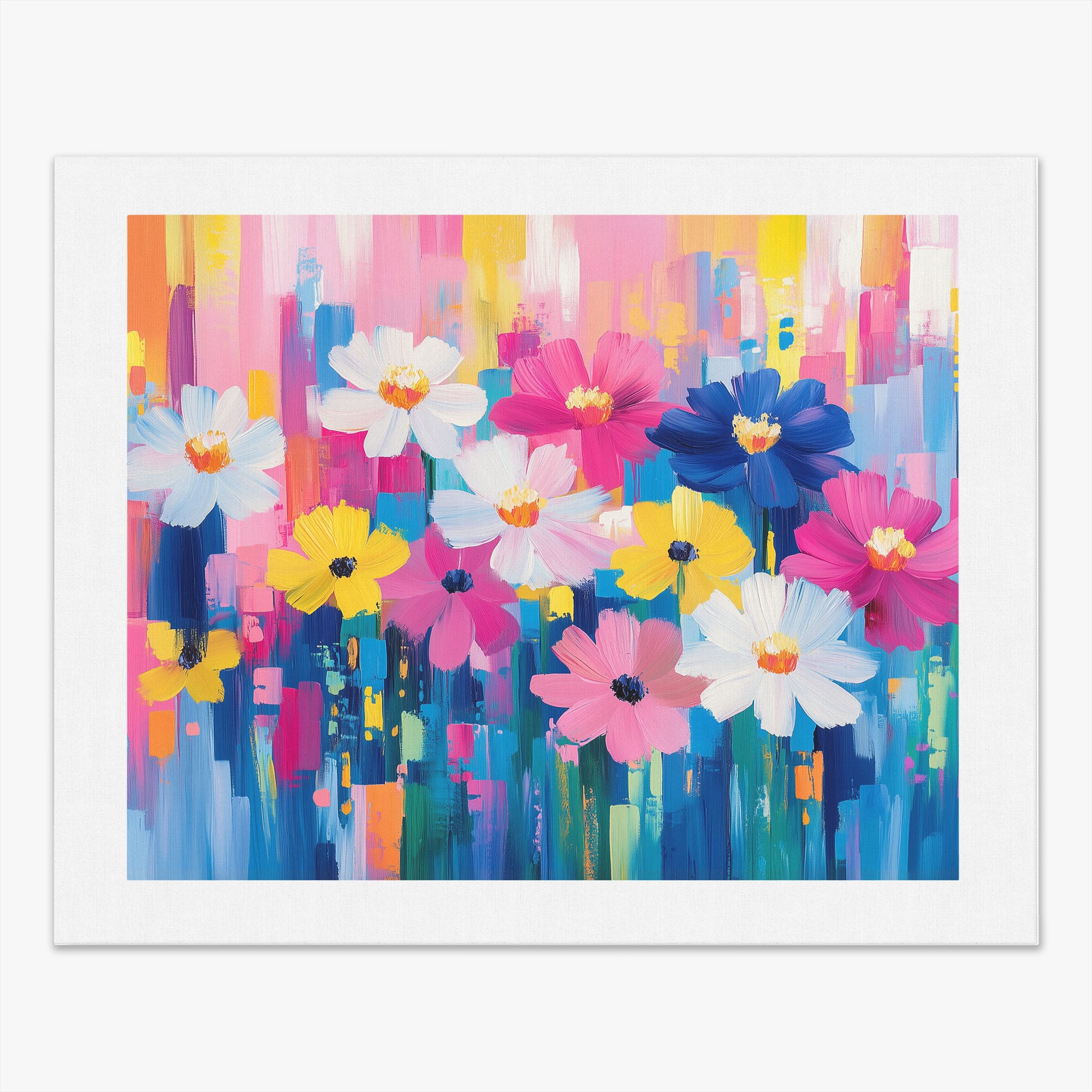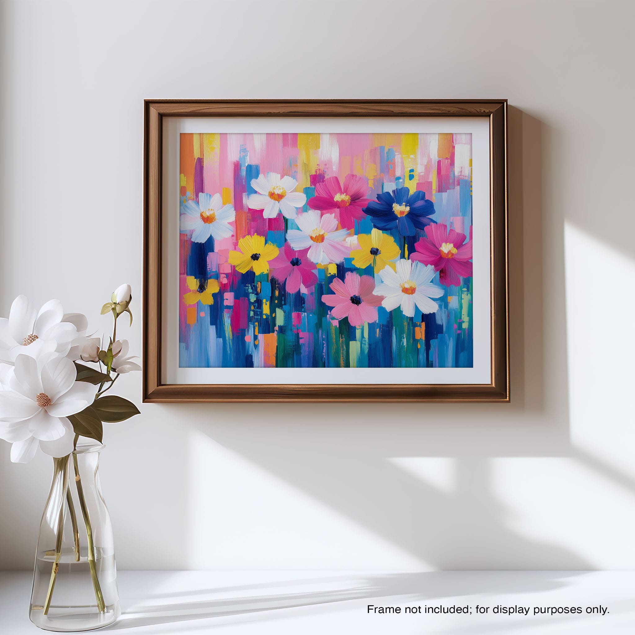 Splashes of vibrant hues and expressive brush strokes distinguish this stunning floral painting. A garden of multi-colored flowers pops against a lively background that shifts from deep blues to bright pinks and subtle whites. This artwork captures the essence of Impressionism with a modern twist, making it a perfect addition for those looking to introduce a burst of color and joy into their living spaces. Light up your home or office with this cheerful, contemporary piece that stands out for its bold, playful approach to traditional floral subjects. Ideal for art lovers seeking a fresh and uplifting artwork to brighten their environment.