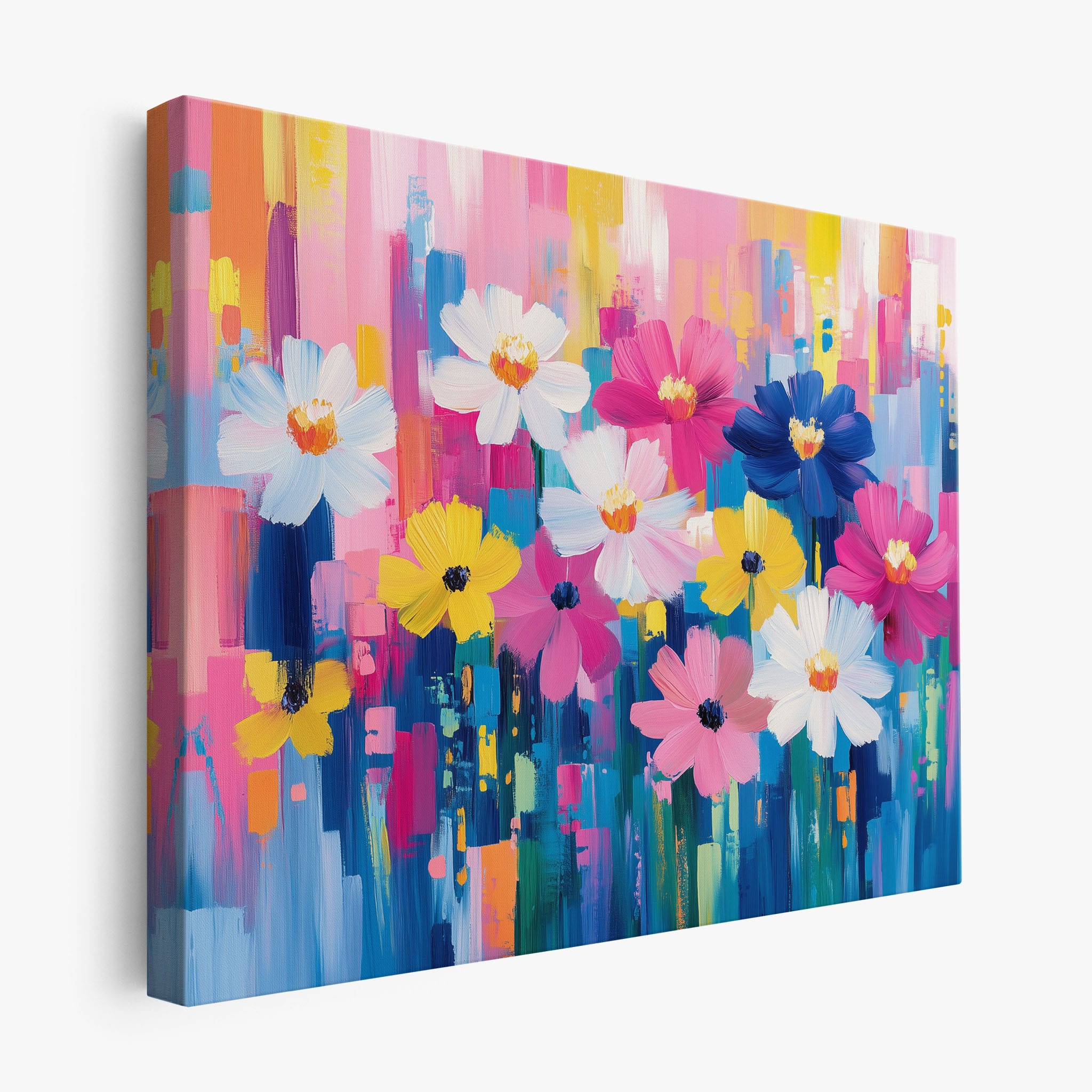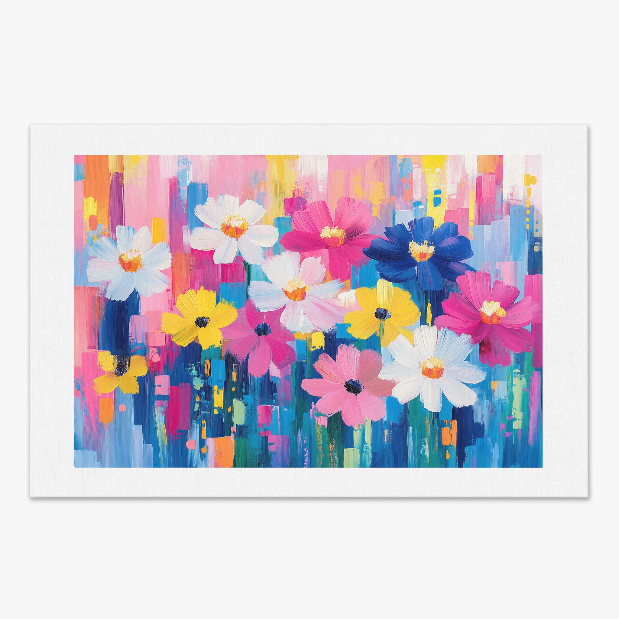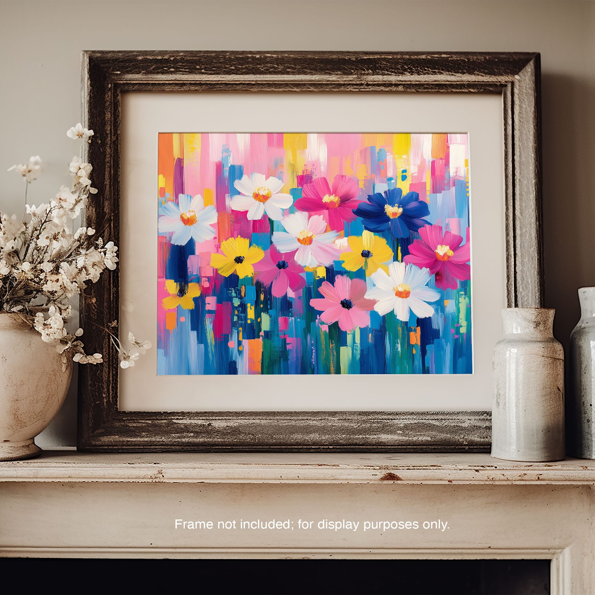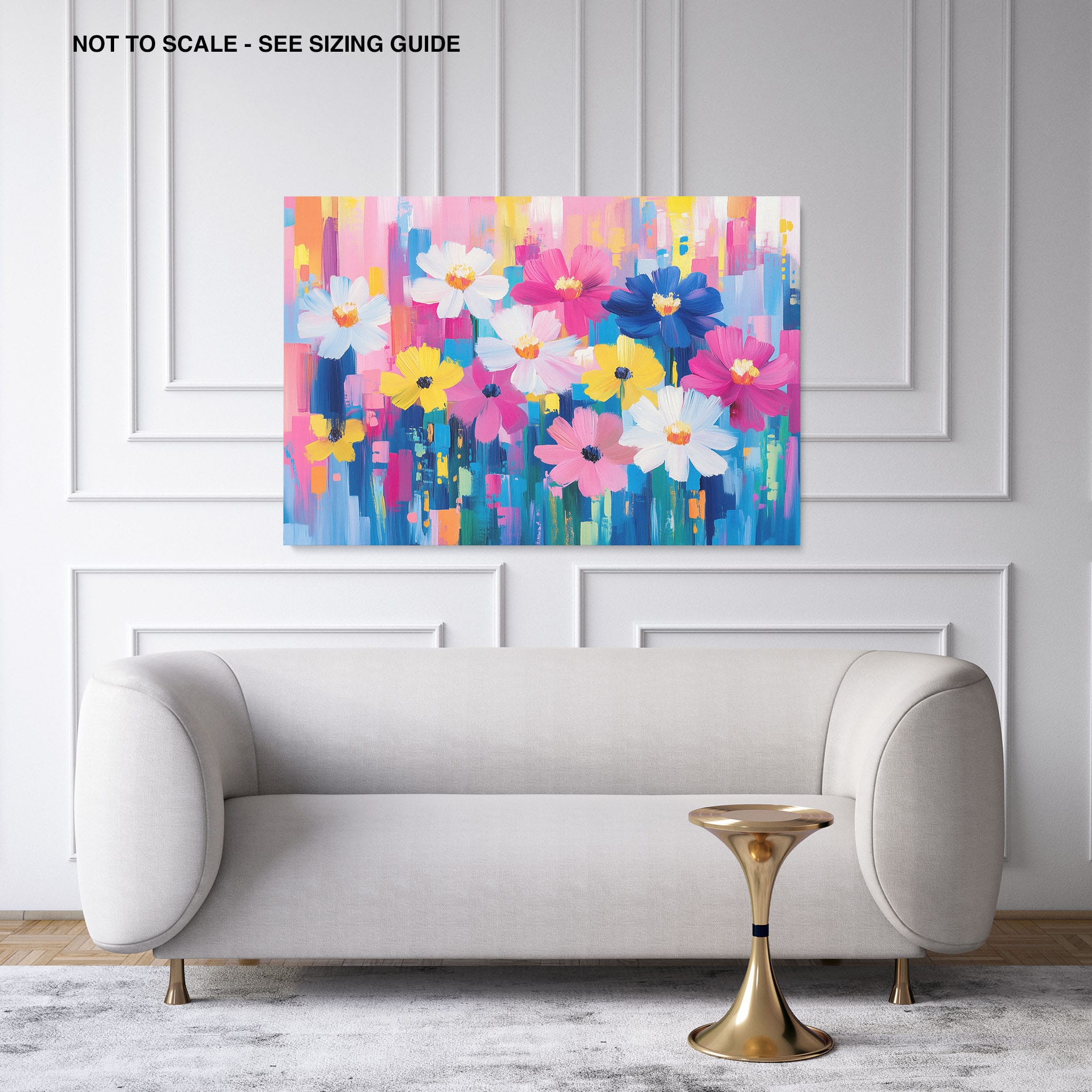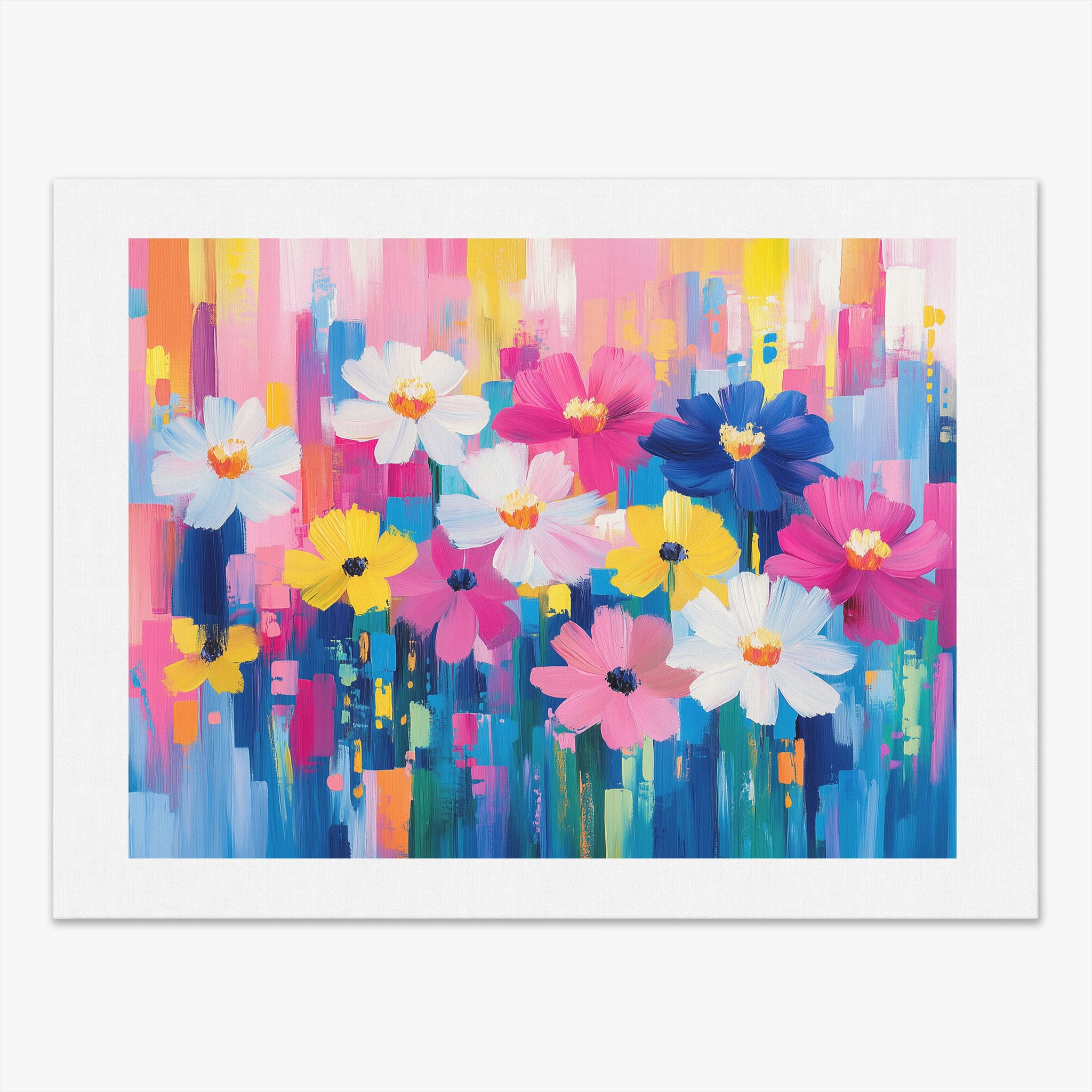 Splashes of vibrant hues and expressive brush strokes distinguish this stunning floral painting. A garden of multi-colored flowers pops against a lively background that shifts from deep blues to bright pinks and subtle whites. This artwork captures the essence of Impressionism with a modern twist, making it a perfect addition for those looking to introduce a burst of color and joy into their living spaces. Light up your home or office with this cheerful, contemporary piece that stands out for its bold, playful approach to traditional floral subjects. Ideal for art lovers seeking a fresh and uplifting artwork to brighten their environment.