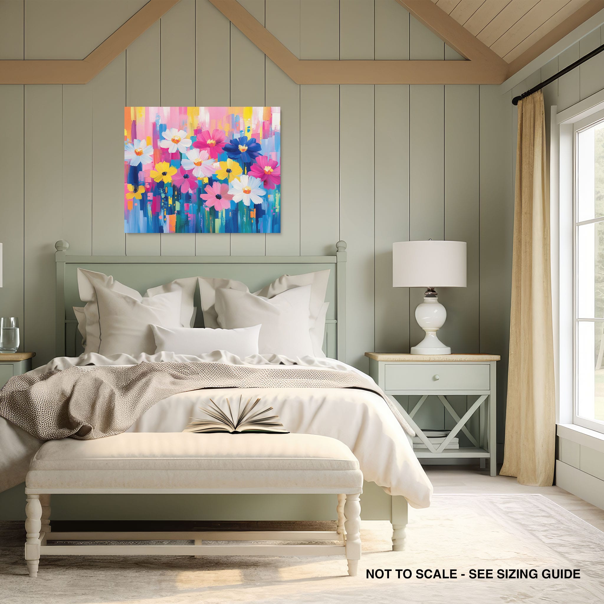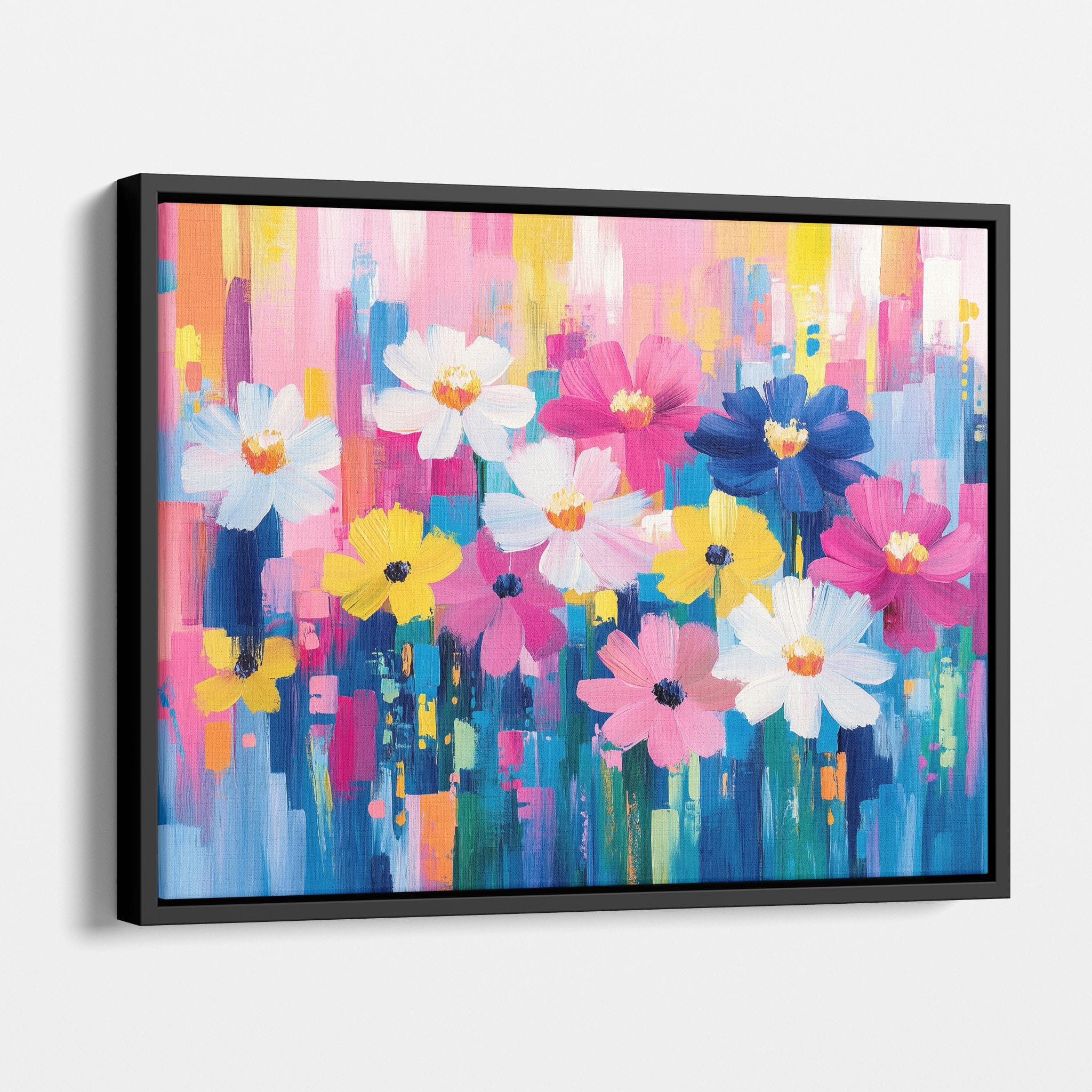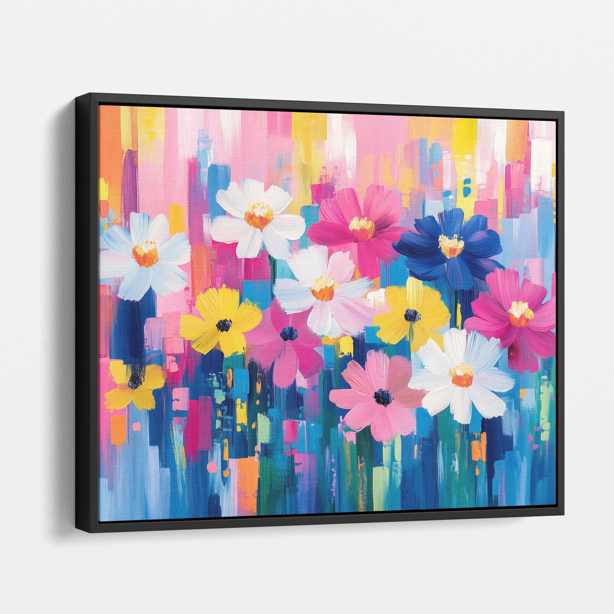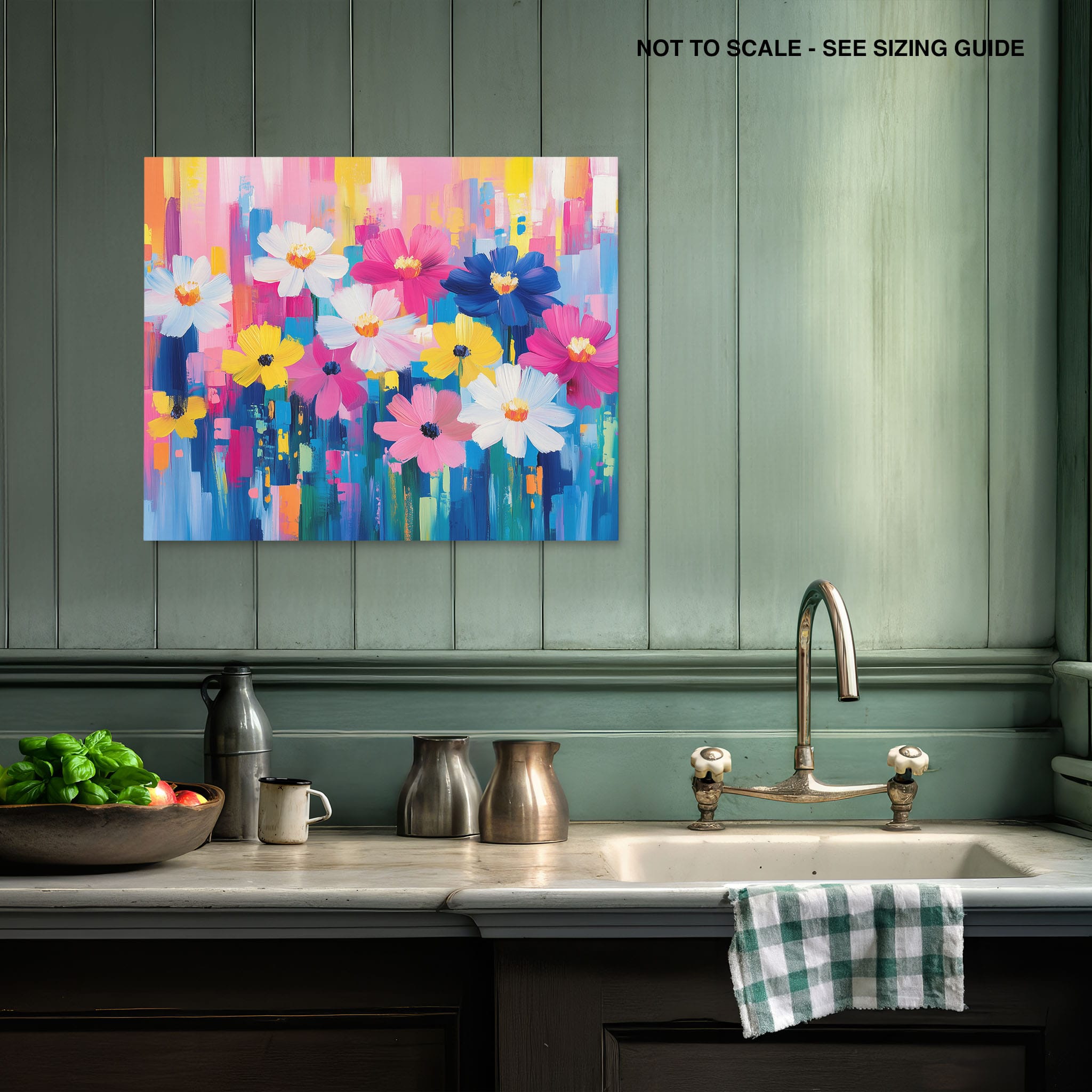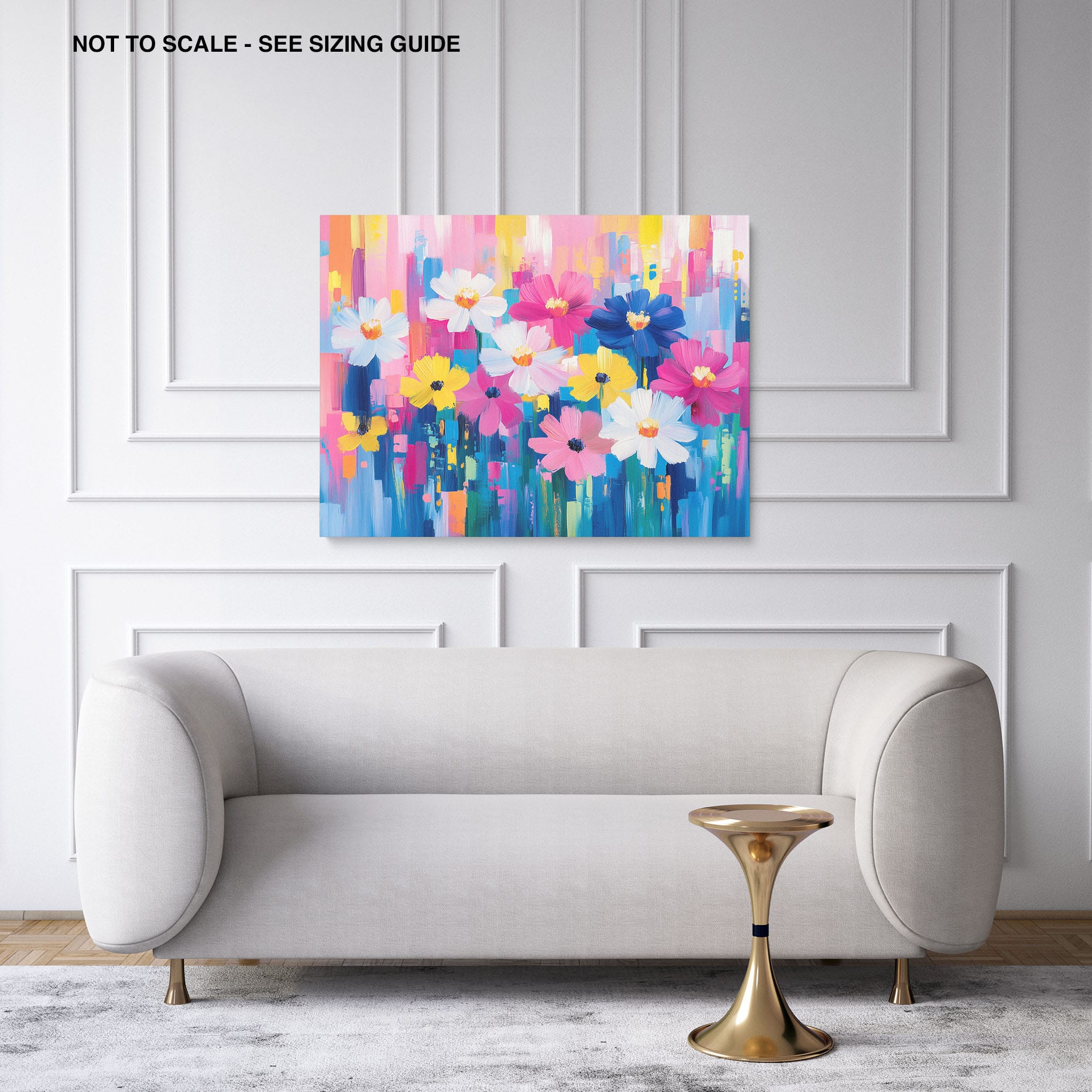 Splashes of vibrant hues and expressive brush strokes distinguish this stunning floral painting. A garden of multi-colored flowers pops against a lively background that shifts from deep blues to bright pinks and subtle whites. This artwork captures the essence of Impressionism with a modern twist, making it a perfect addition for those looking to introduce a burst of color and joy into their living spaces. Light up your home or office with this cheerful, contemporary piece that stands out for its bold, playful approach to traditional floral subjects. Ideal for art lovers seeking a fresh and uplifting artwork to brighten their environment.