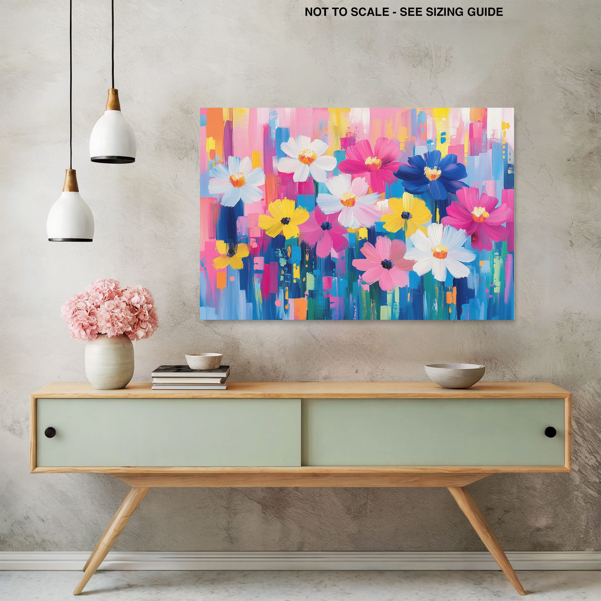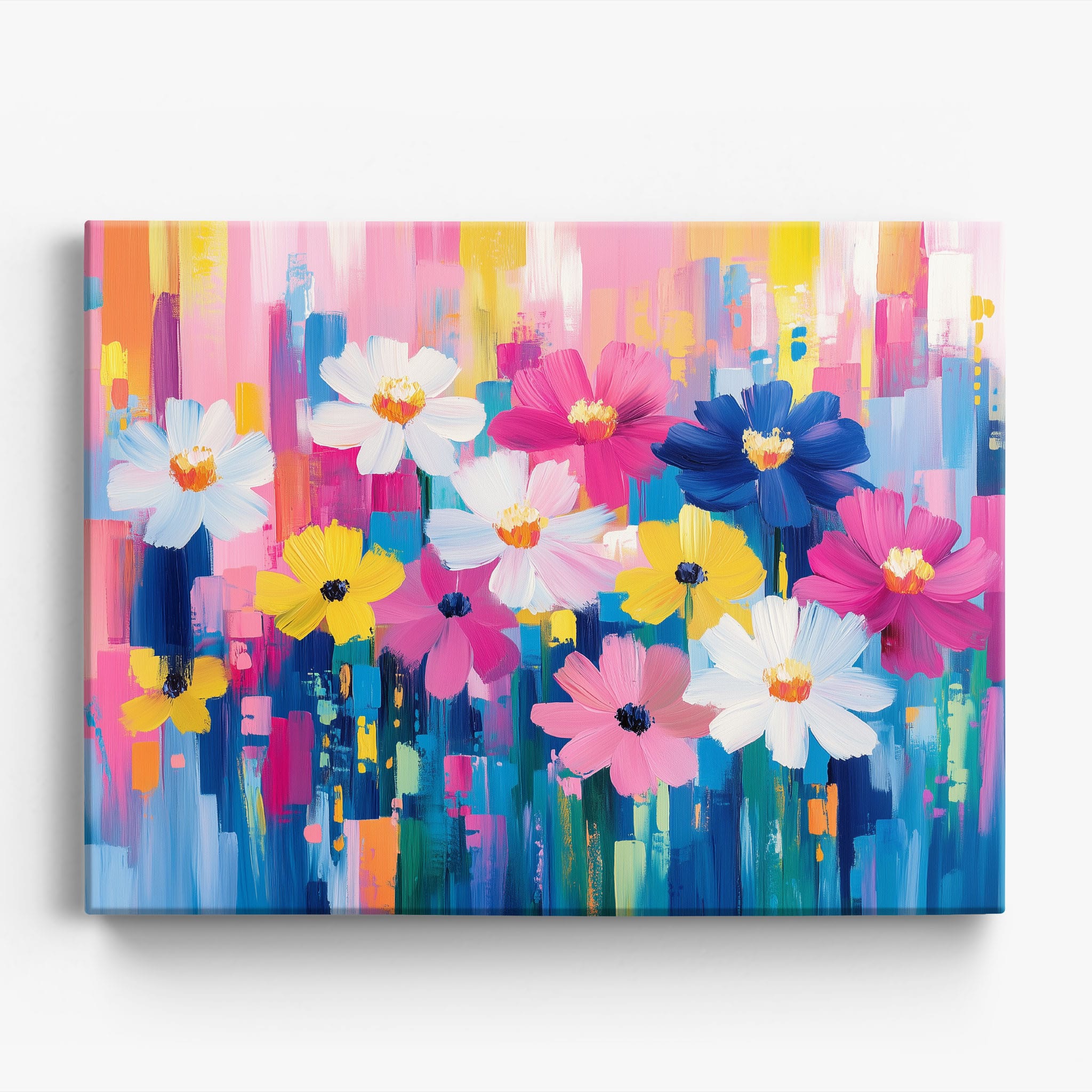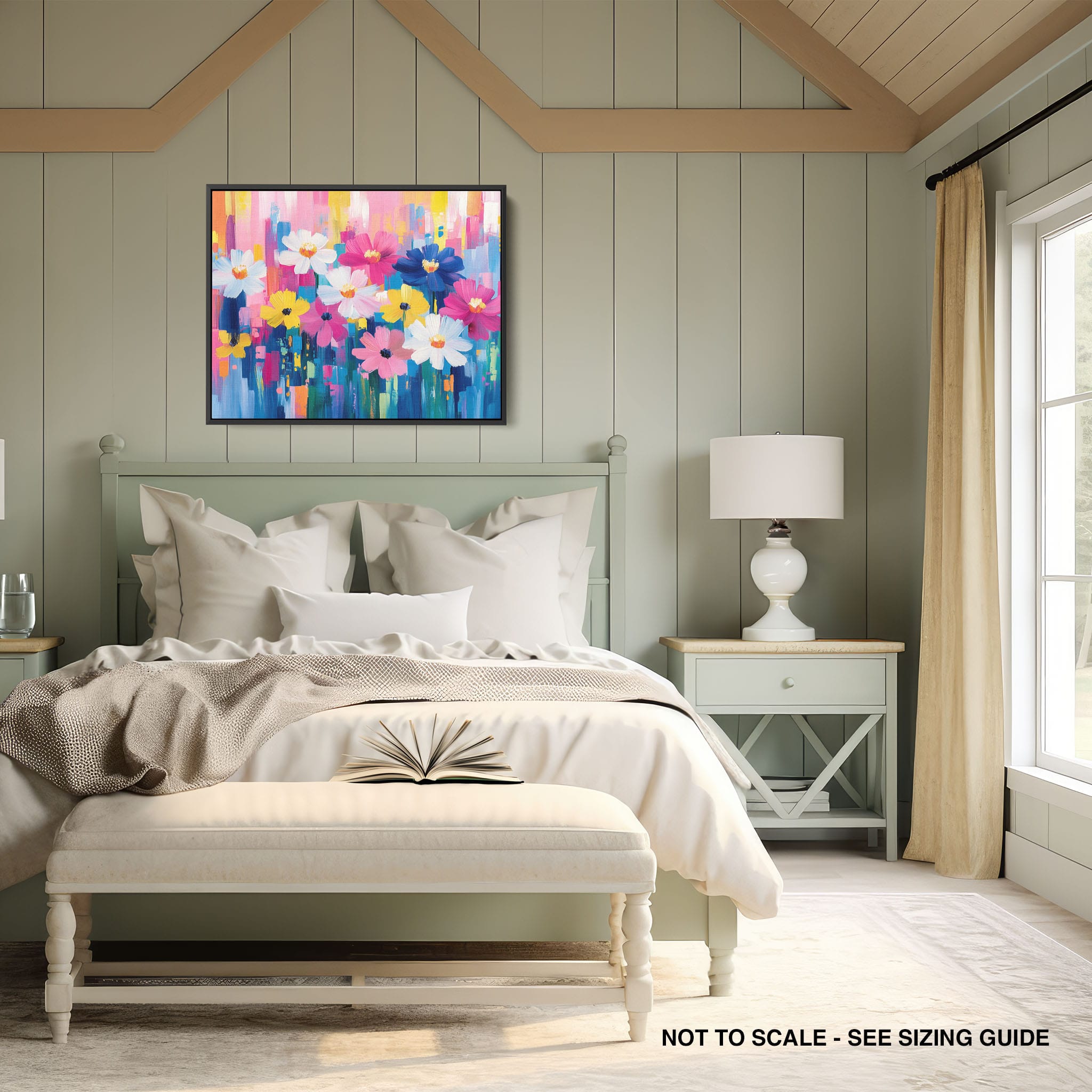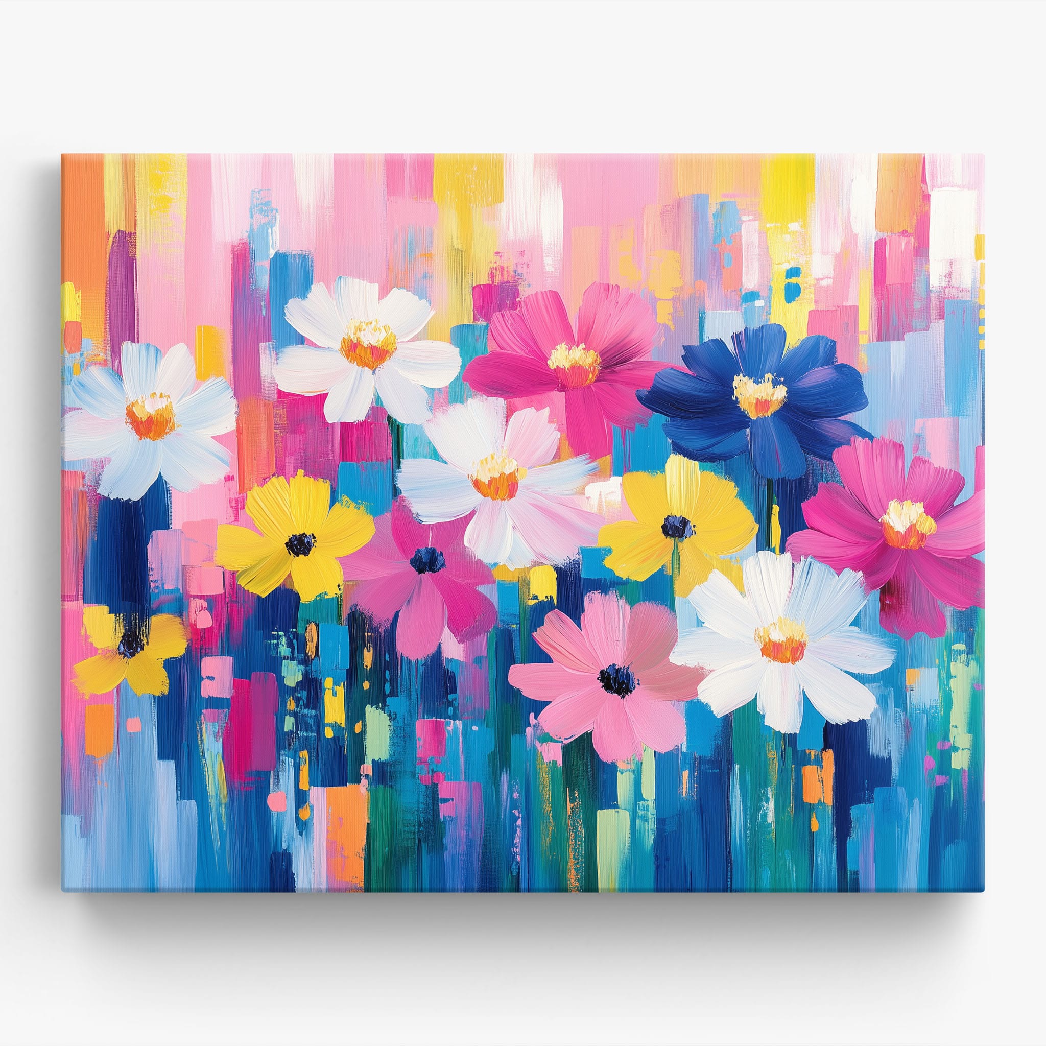 Splashes of vibrant hues and expressive brush strokes distinguish this stunning floral painting. A garden of multi-colored flowers pops against a lively background that shifts from deep blues to bright pinks and subtle whites. This artwork captures the essence of Impressionism with a modern twist, making it a perfect addition for those looking to introduce a burst of color and joy into their living spaces. Light up your home or office with this cheerful, contemporary piece that stands out for its bold, playful approach to traditional floral subjects. Ideal for art lovers seeking a fresh and uplifting artwork to brighten their environment.