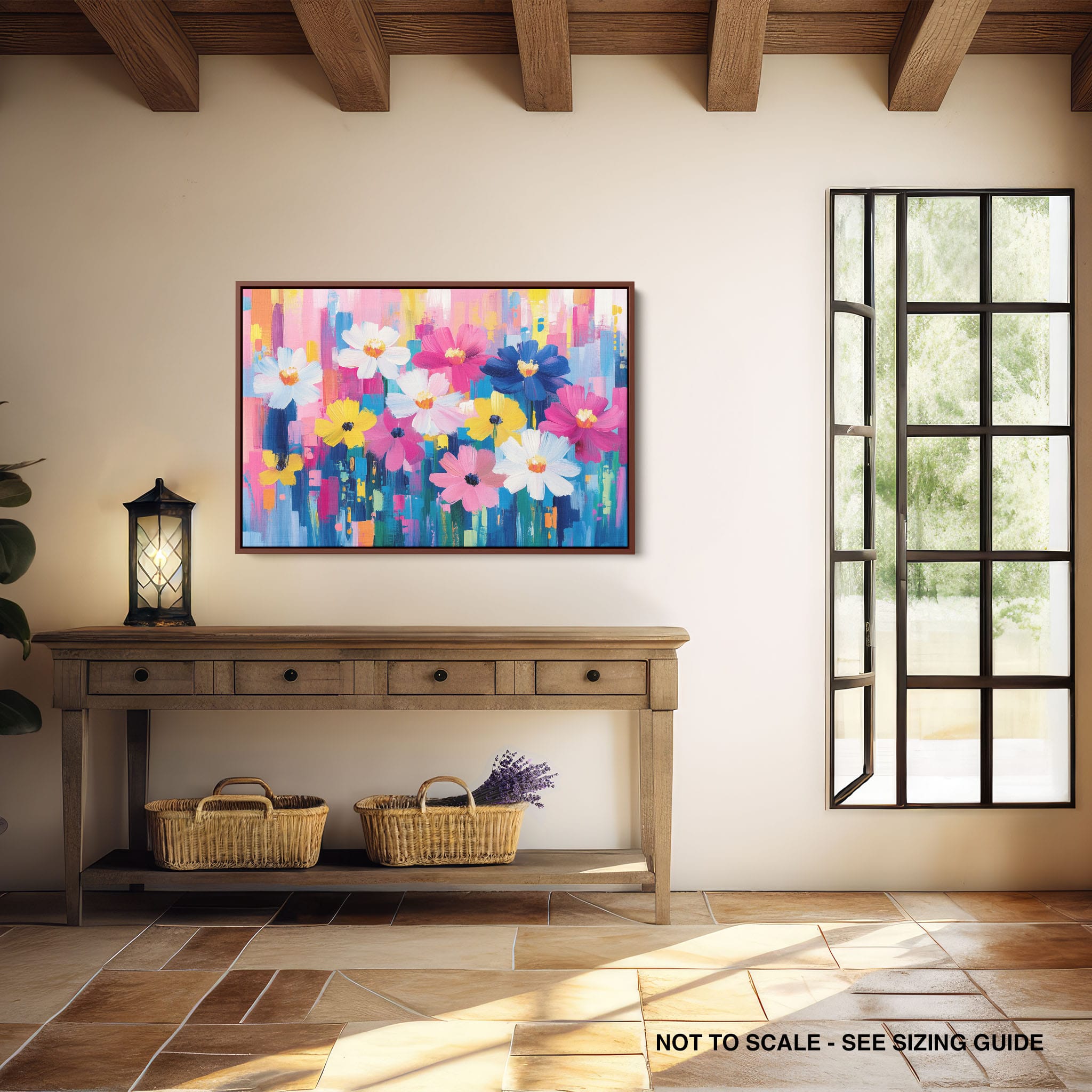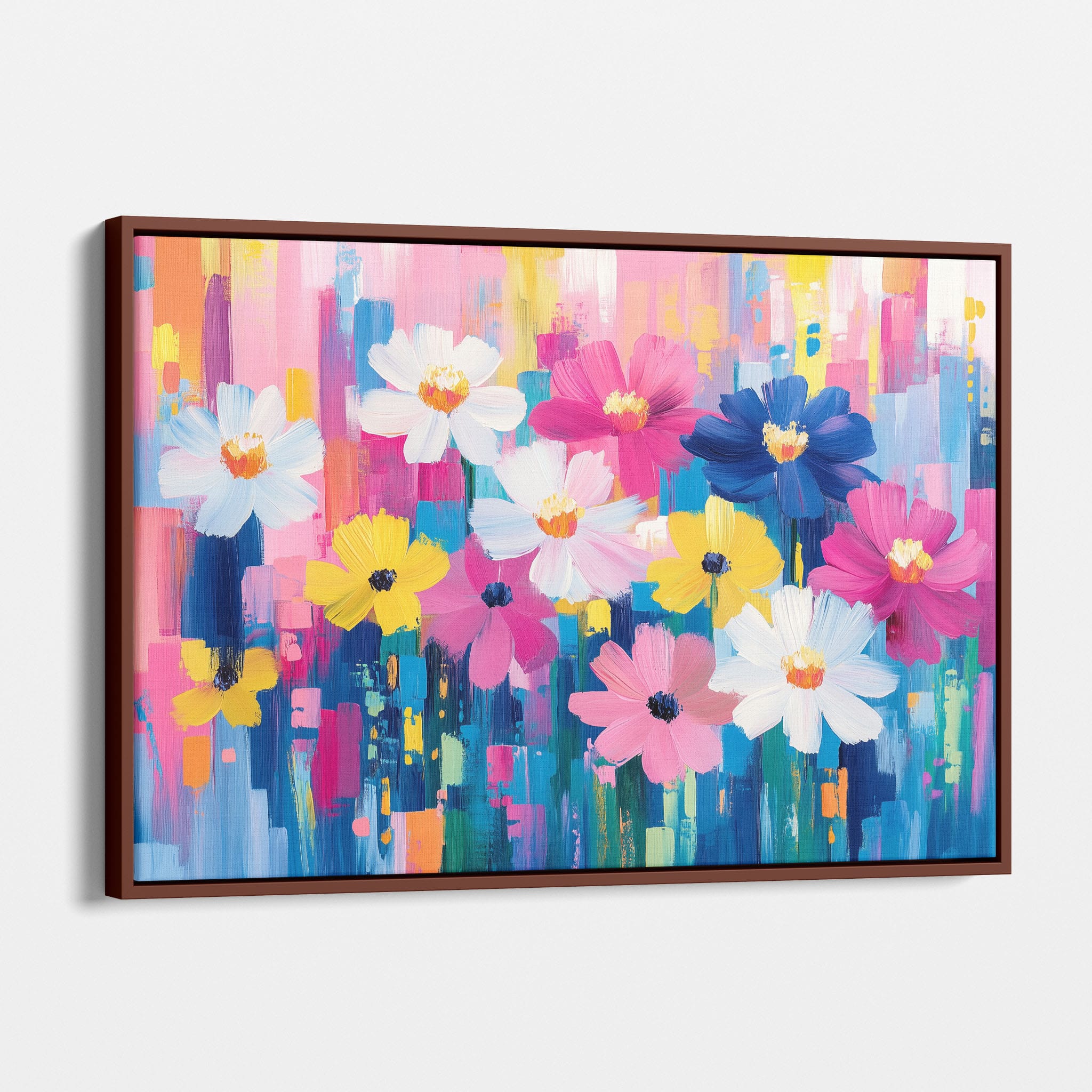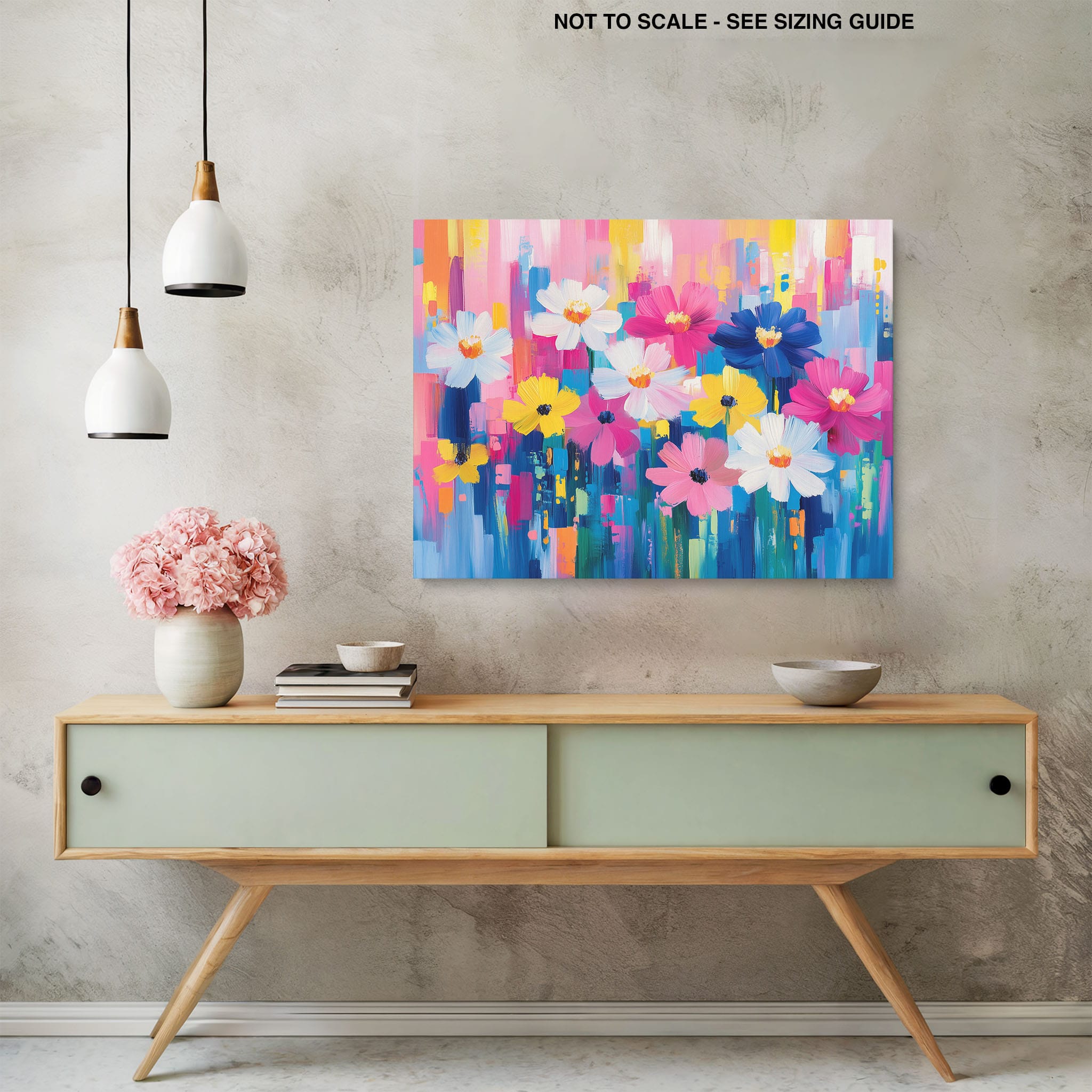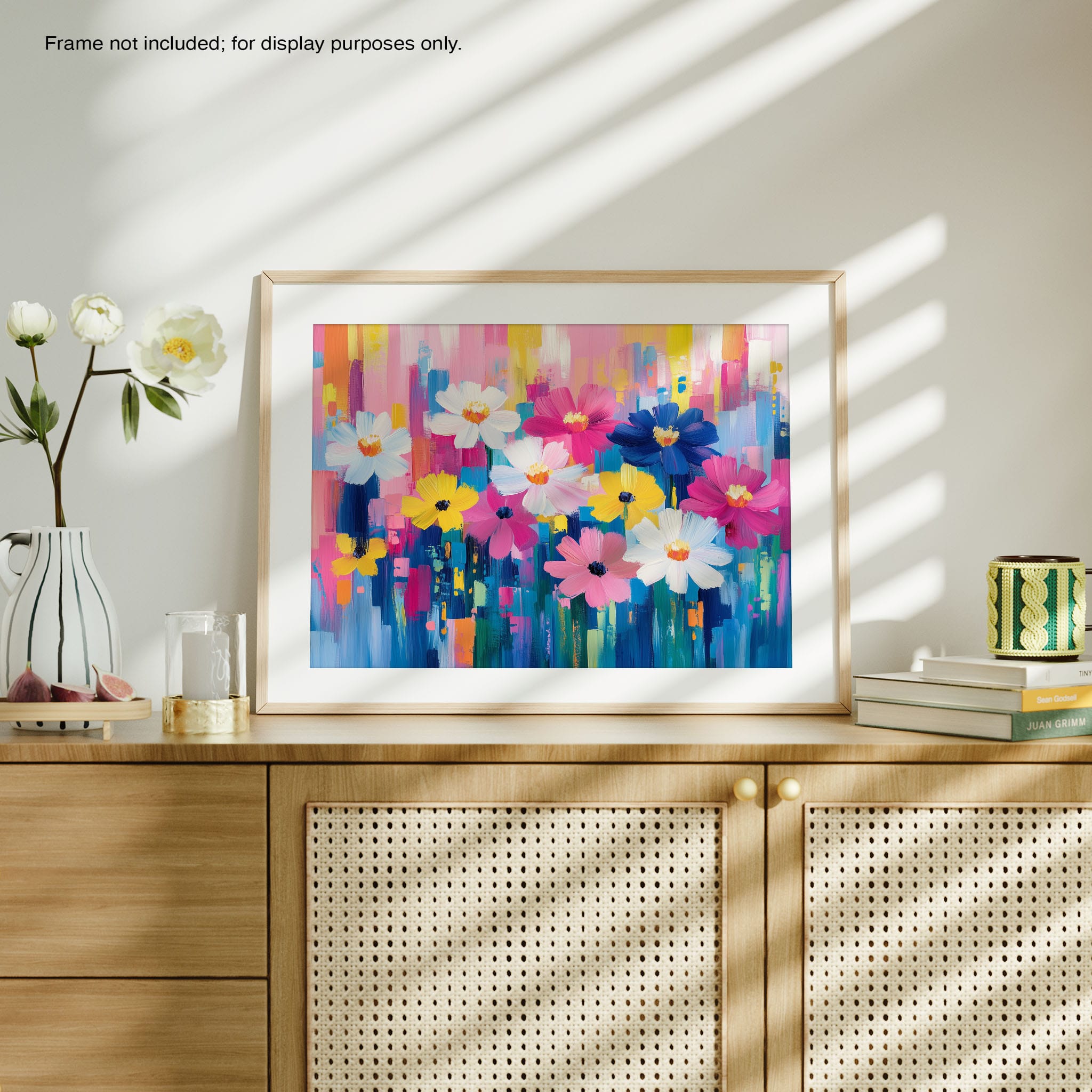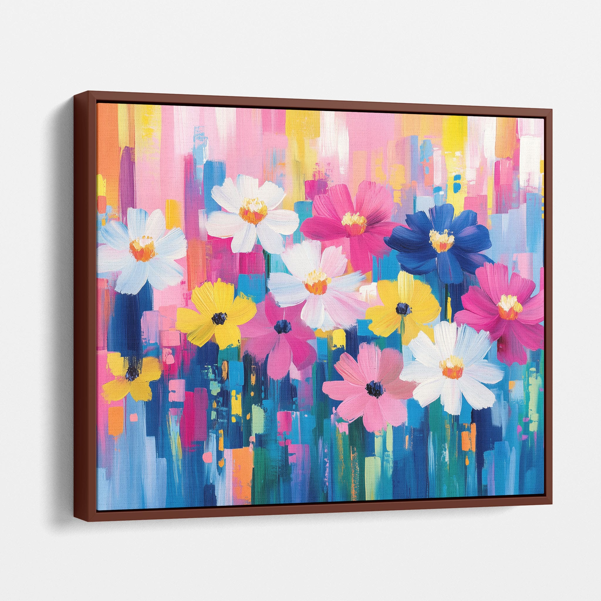 Splashes of vibrant hues and expressive brush strokes distinguish this stunning floral painting. A garden of multi-colored flowers pops against a lively background that shifts from deep blues to bright pinks and subtle whites. This artwork captures the essence of Impressionism with a modern twist, making it a perfect addition for those looking to introduce a burst of color and joy into their living spaces. Light up your home or office with this cheerful, contemporary piece that stands out for its bold, playful approach to traditional floral subjects. Ideal for art lovers seeking a fresh and uplifting artwork to brighten their environment.