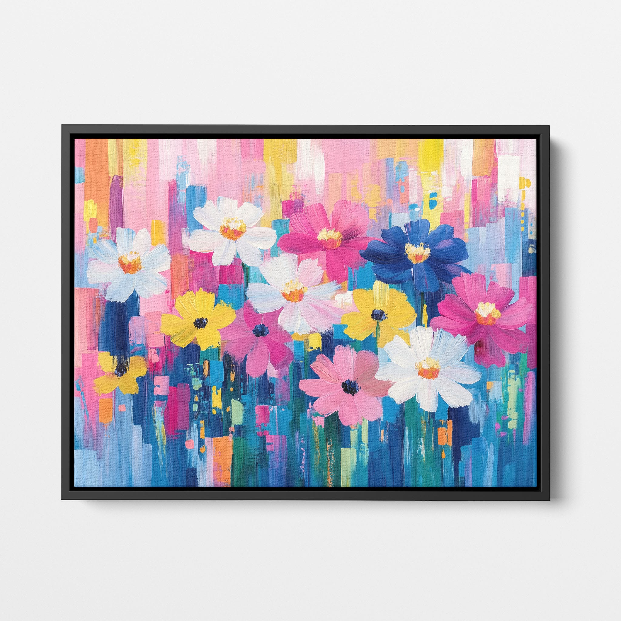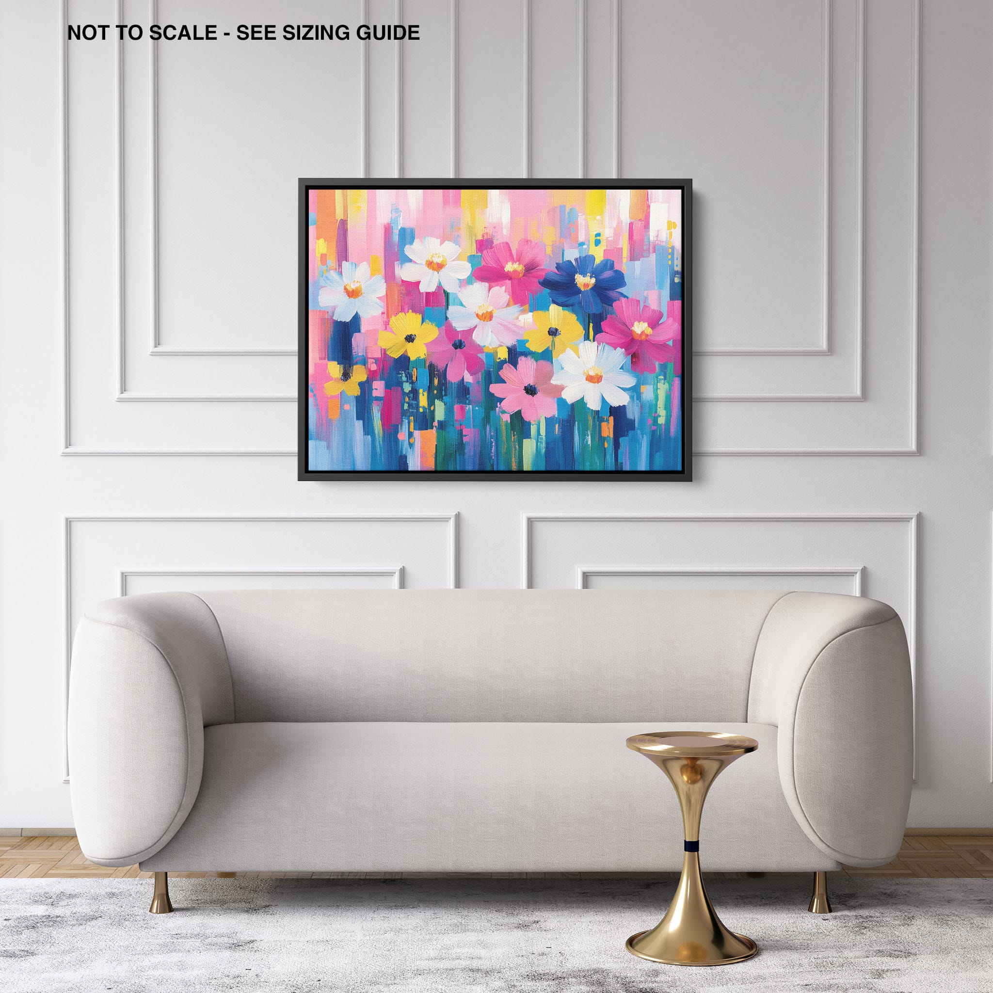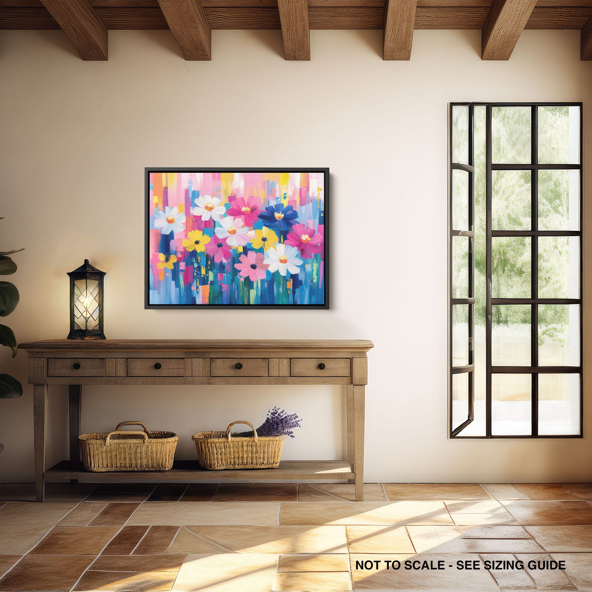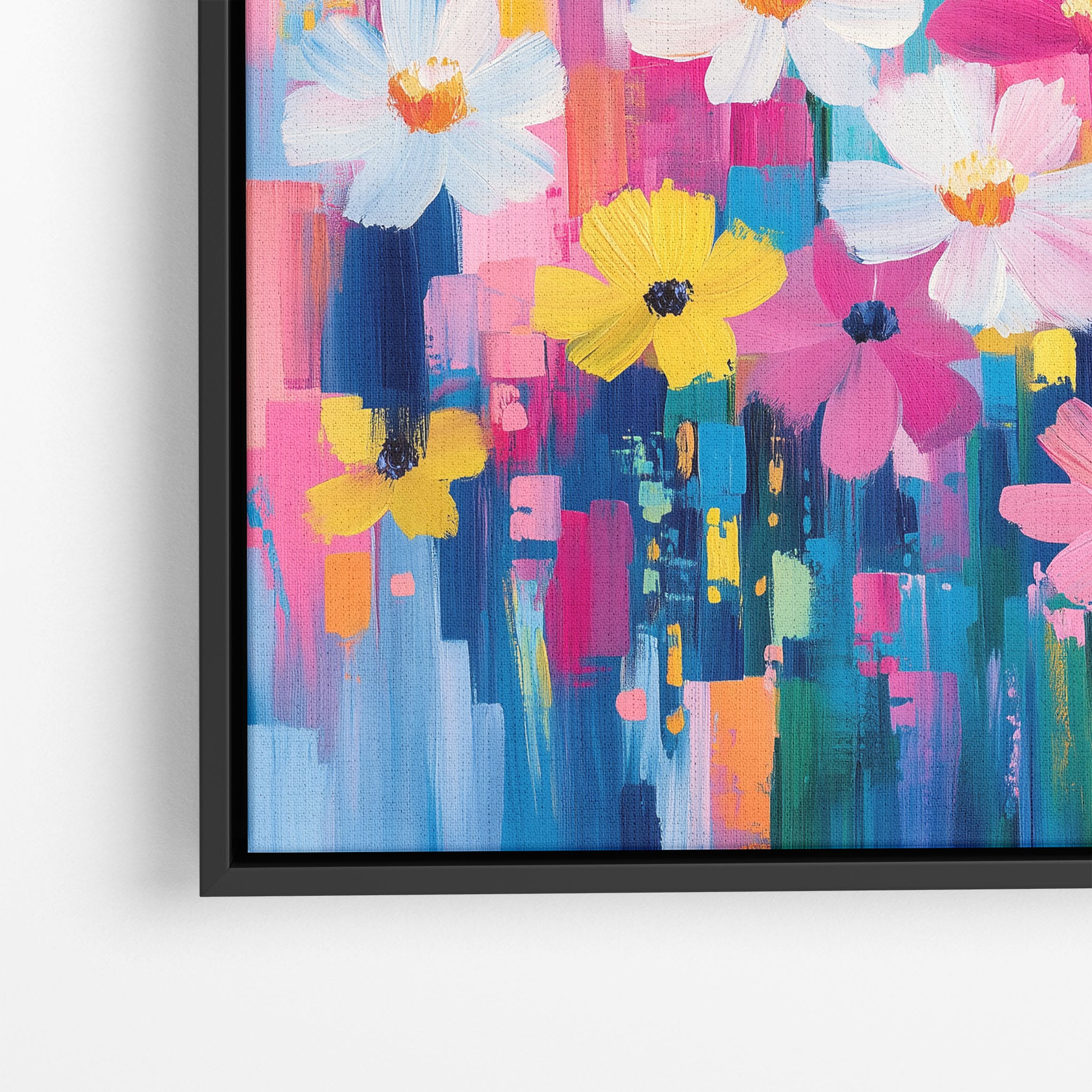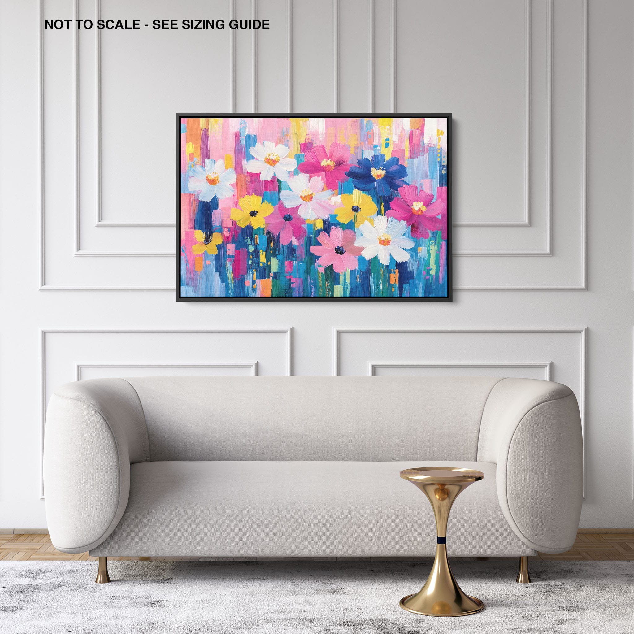 Splashes of vibrant hues and expressive brush strokes distinguish this stunning floral painting. A garden of multi-colored flowers pops against a lively background that shifts from deep blues to bright pinks and subtle whites. This artwork captures the essence of Impressionism with a modern twist, making it a perfect addition for those looking to introduce a burst of color and joy into their living spaces. Light up your home or office with this cheerful, contemporary piece that stands out for its bold, playful approach to traditional floral subjects. Ideal for art lovers seeking a fresh and uplifting artwork to brighten their environment.