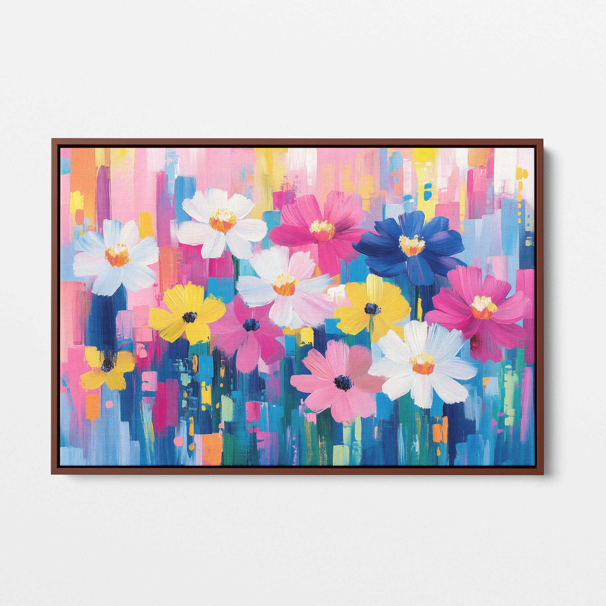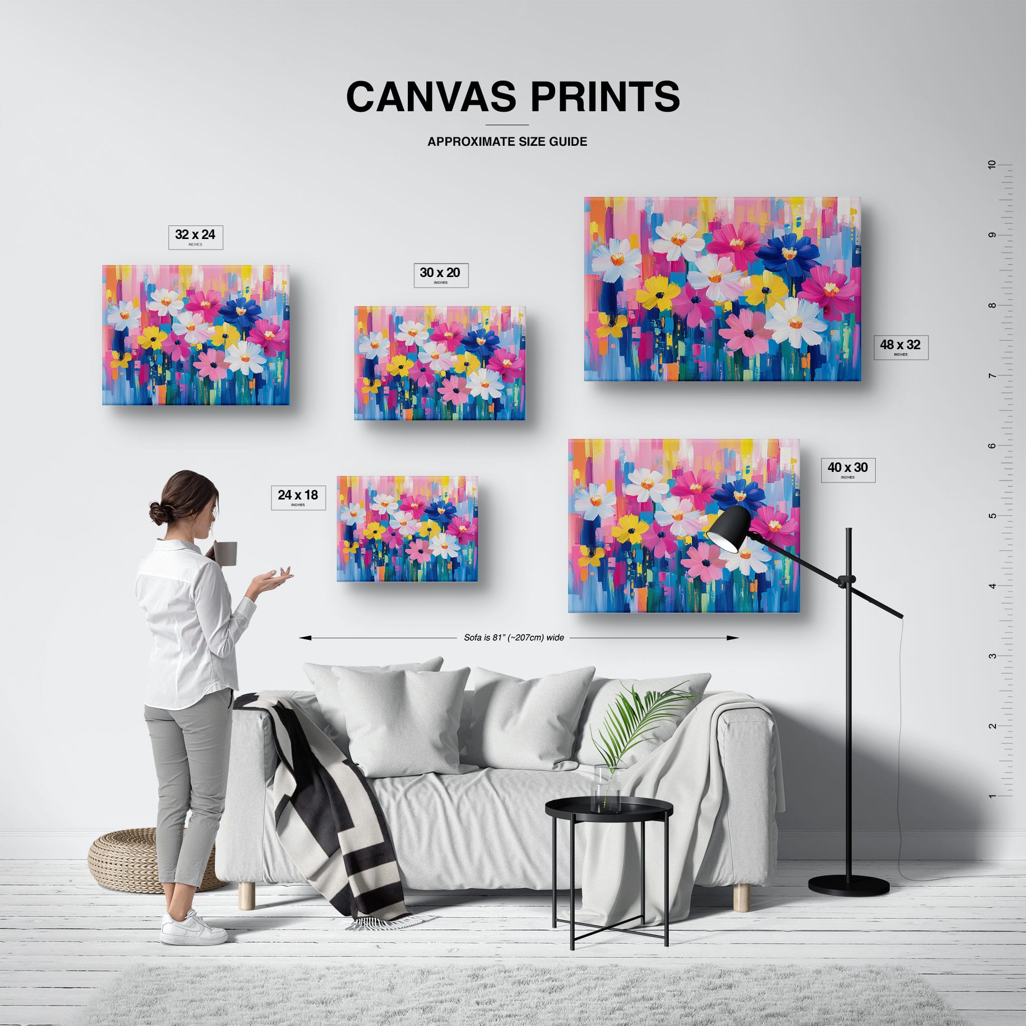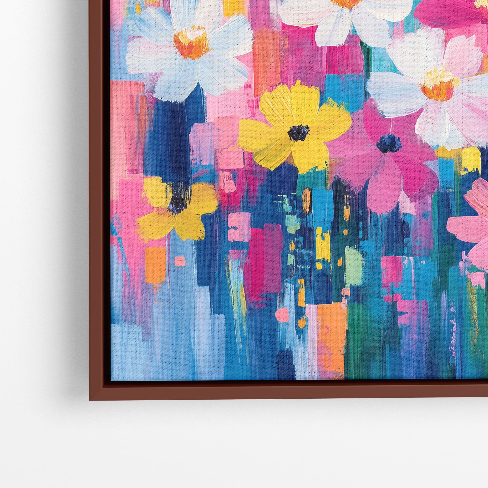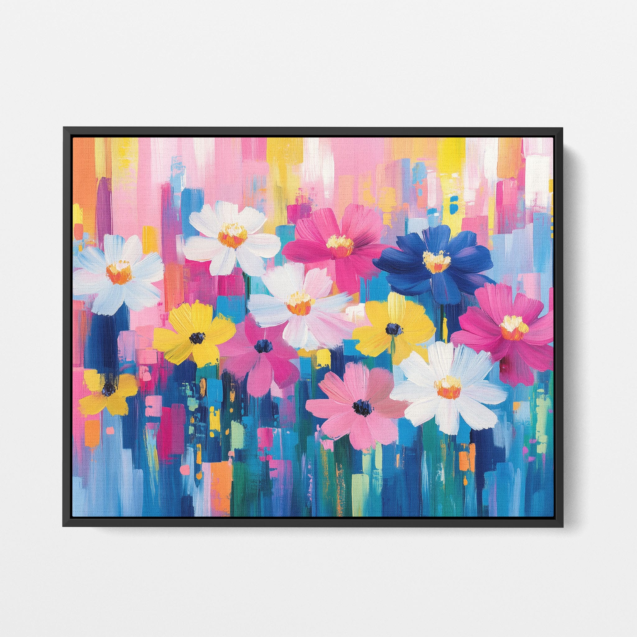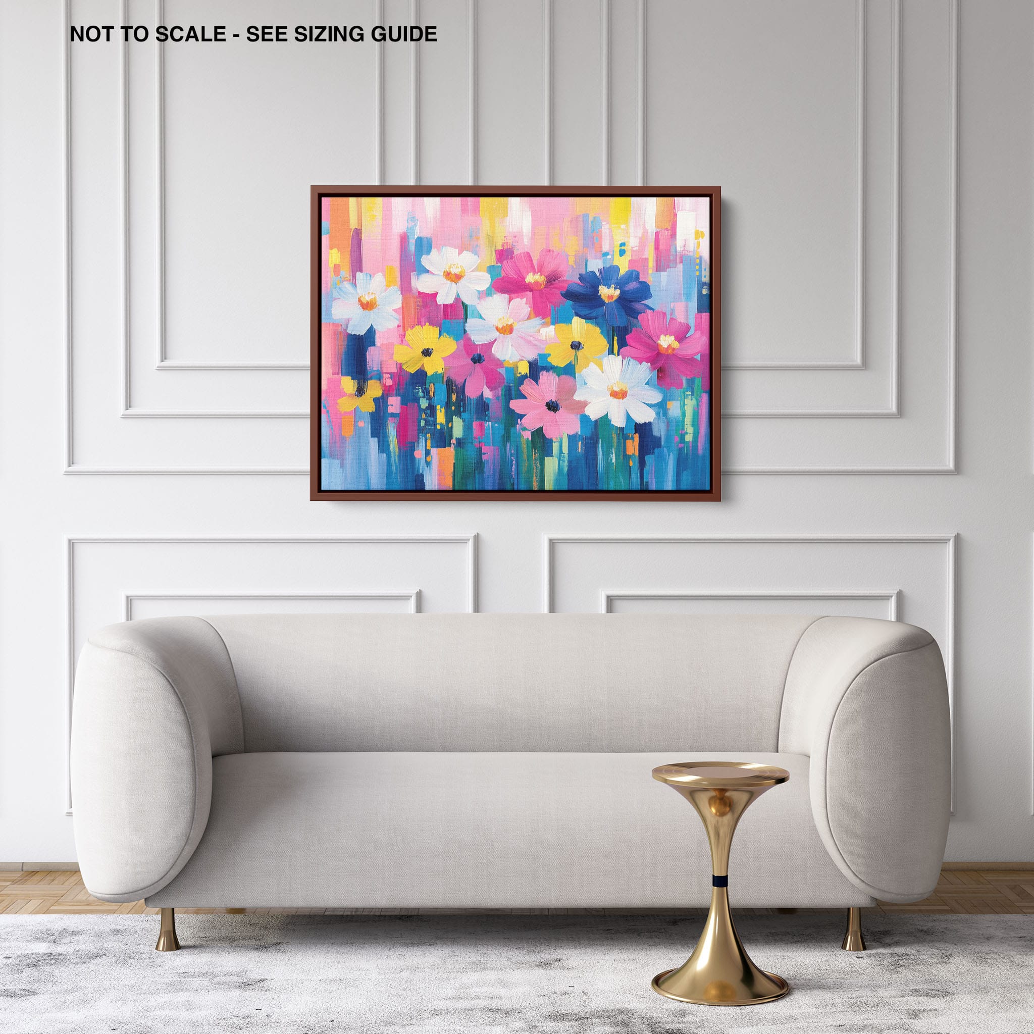 Splashes of vibrant hues and expressive brush strokes distinguish this stunning floral painting. A garden of multi-colored flowers pops against a lively background that shifts from deep blues to bright pinks and subtle whites. This artwork captures the essence of Impressionism with a modern twist, making it a perfect addition for those looking to introduce a burst of color and joy into their living spaces. Light up your home or office with this cheerful, contemporary piece that stands out for its bold, playful approach to traditional floral subjects. Ideal for art lovers seeking a fresh and uplifting artwork to brighten their environment.