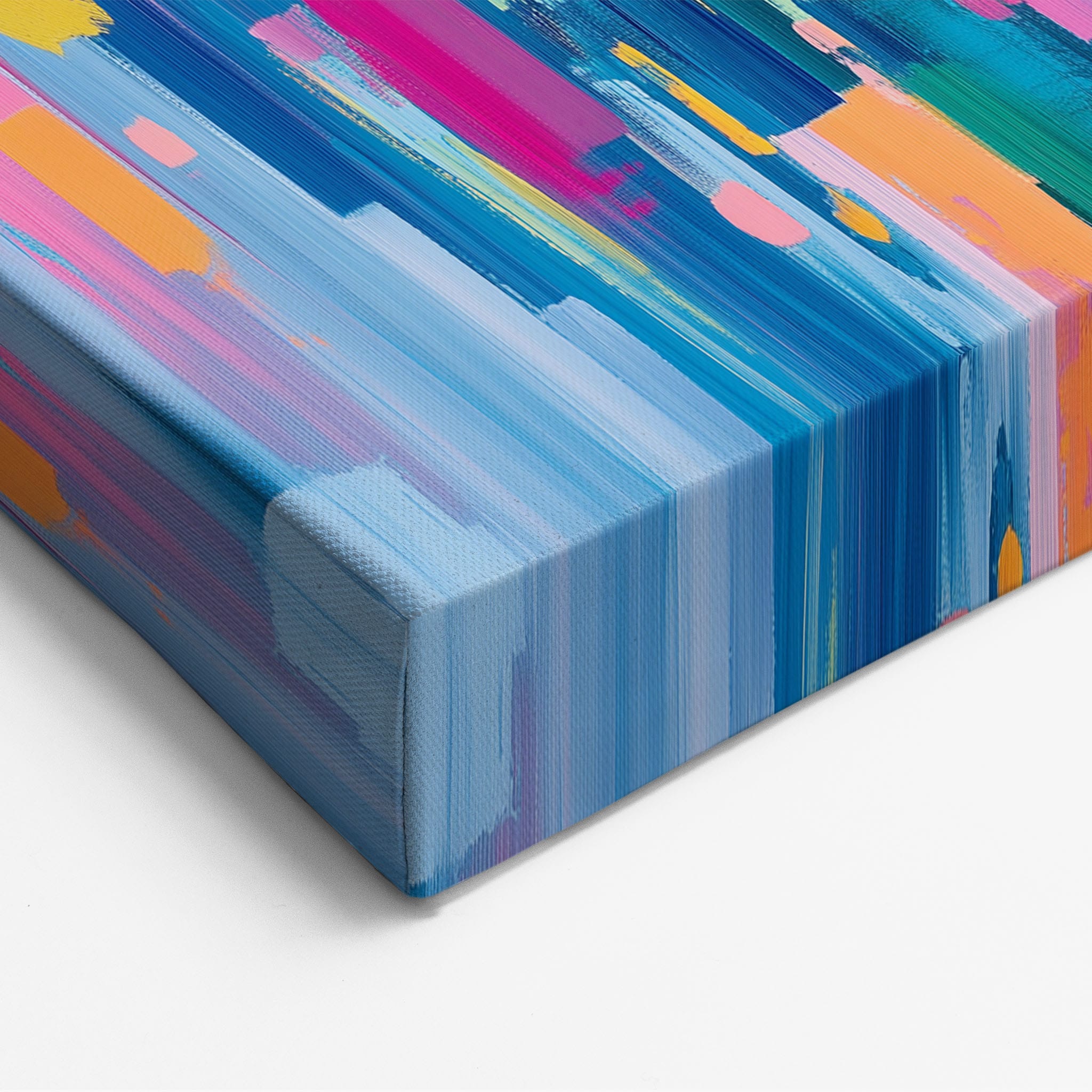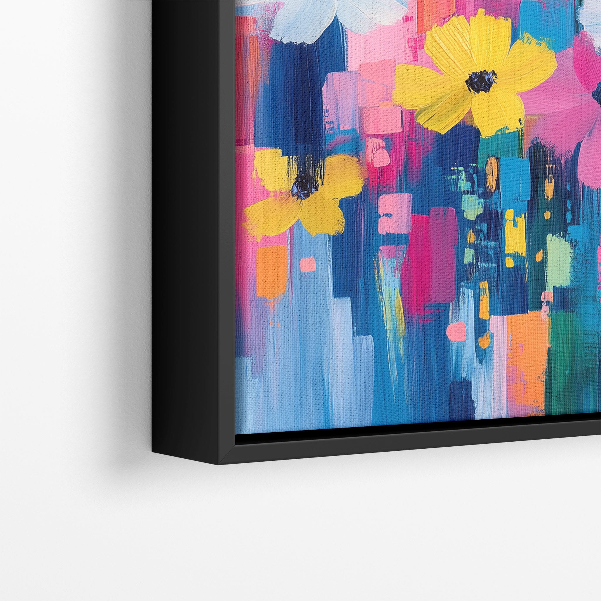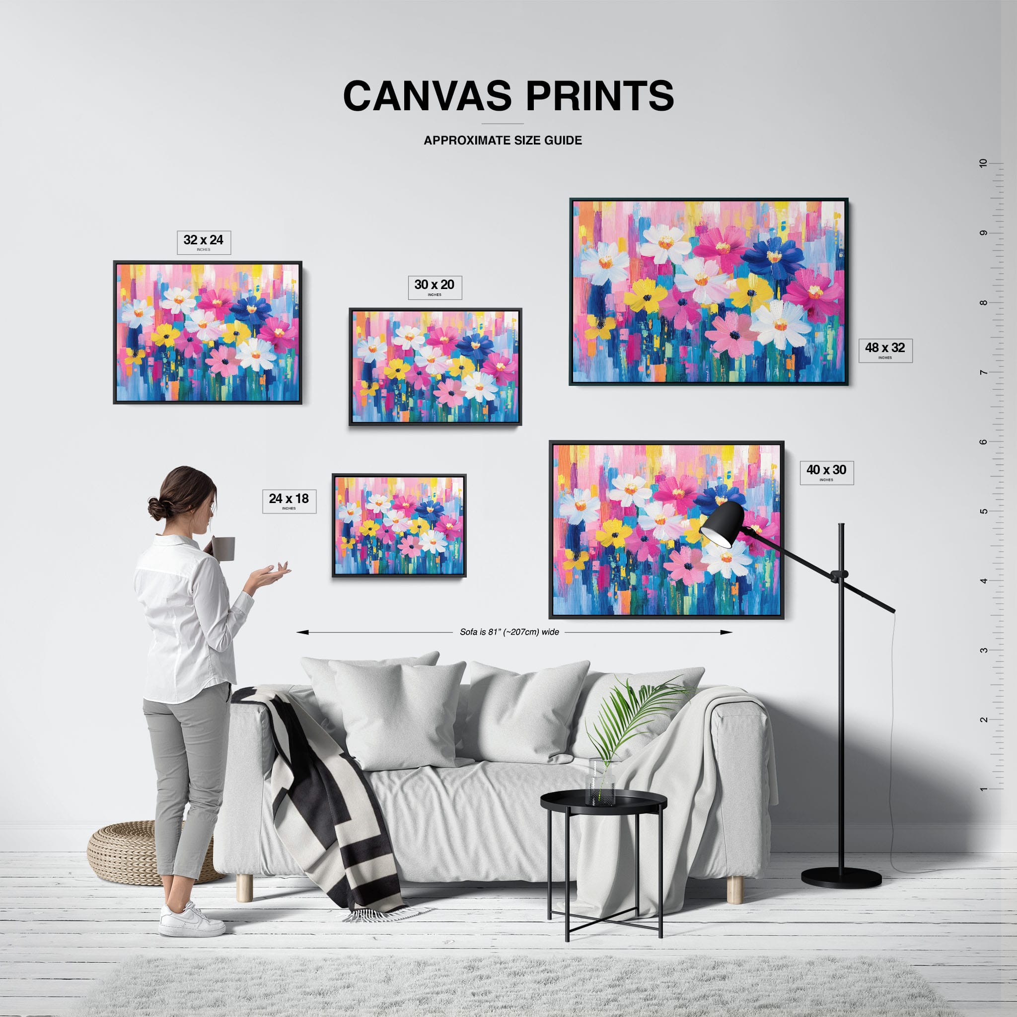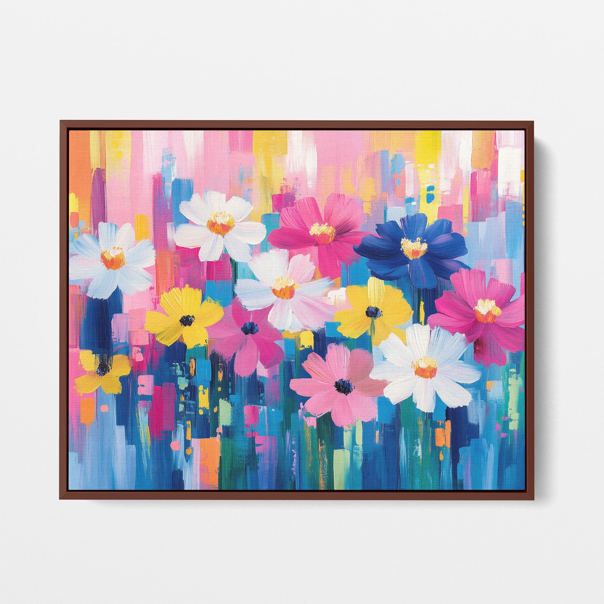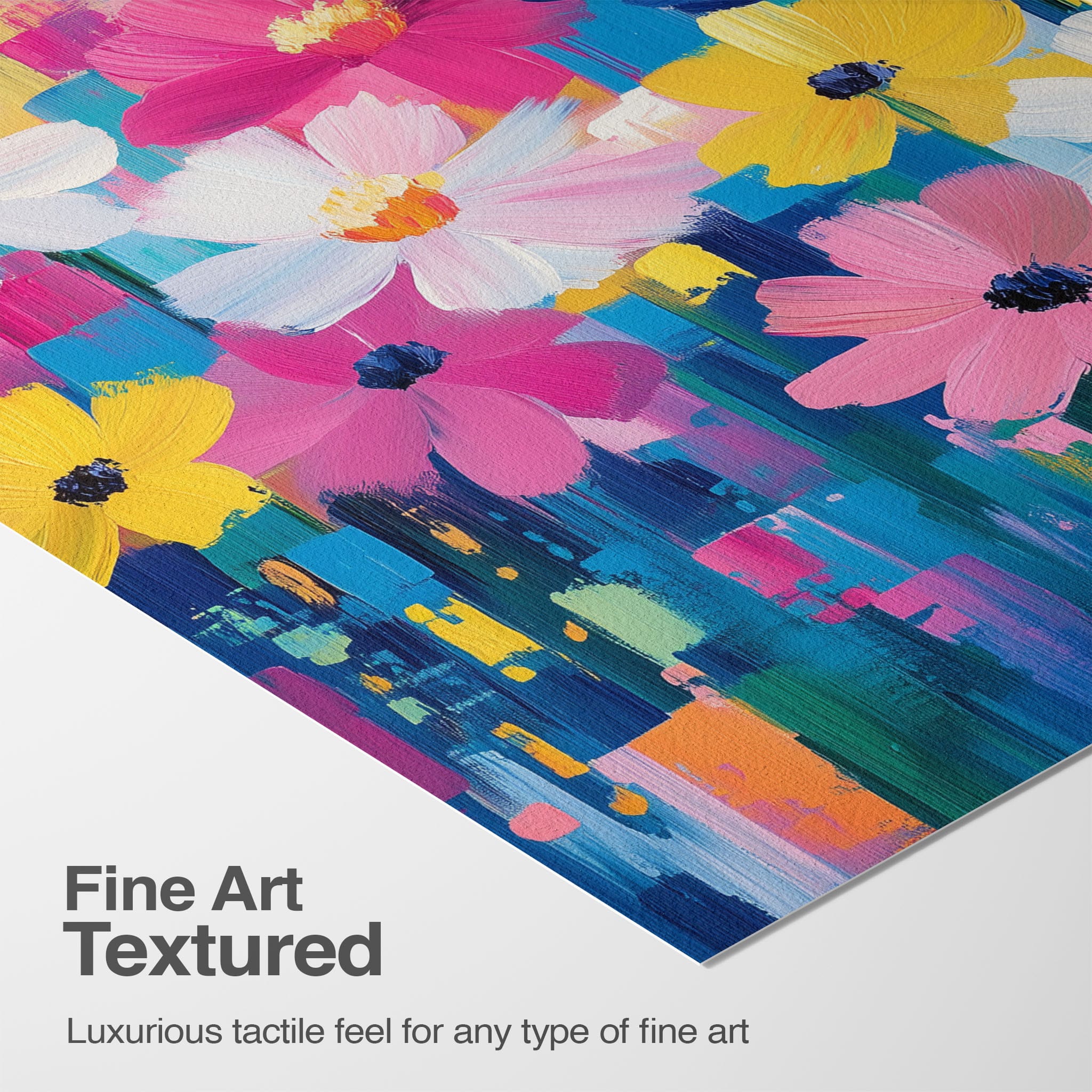 Splashes of vibrant hues and expressive brush strokes distinguish this stunning floral painting. A garden of multi-colored flowers pops against a lively background that shifts from deep blues to bright pinks and subtle whites. This artwork captures the essence of Impressionism with a modern twist, making it a perfect addition for those looking to introduce a burst of color and joy into their living spaces. Light up your home or office with this cheerful, contemporary piece that stands out for its bold, playful approach to traditional floral subjects. Ideal for art lovers seeking a fresh and uplifting artwork to brighten their environment.