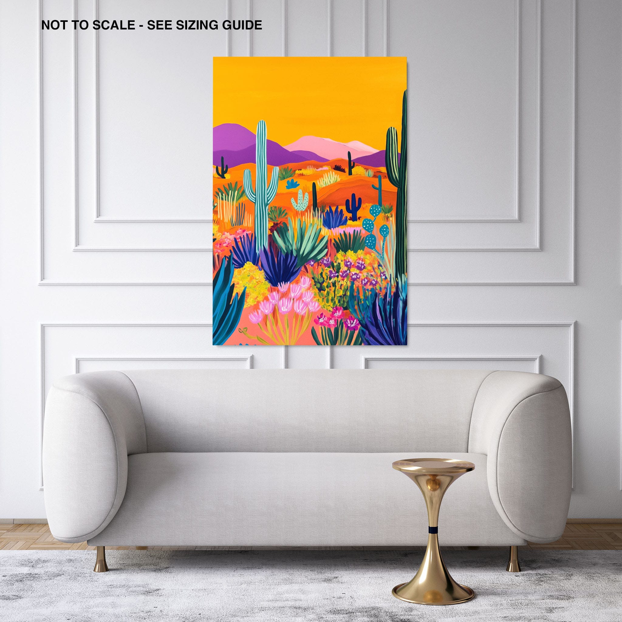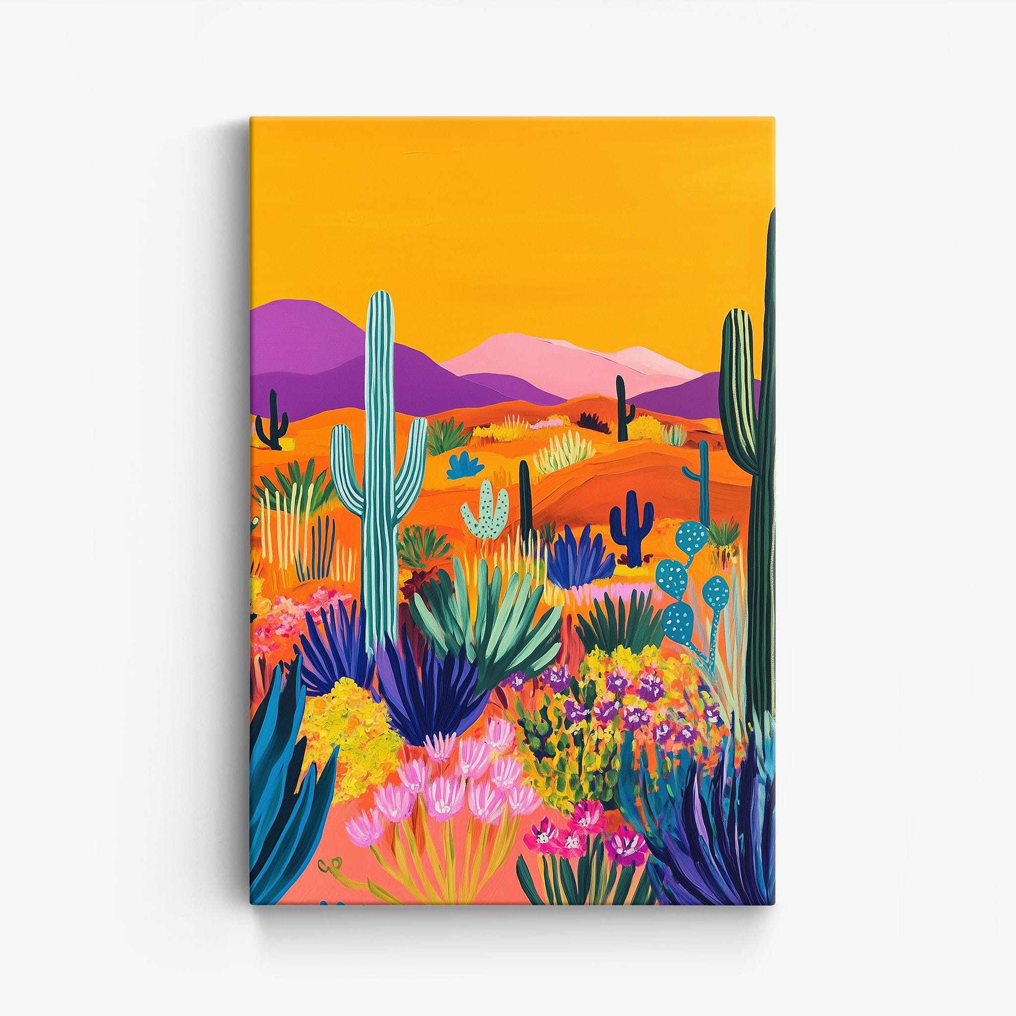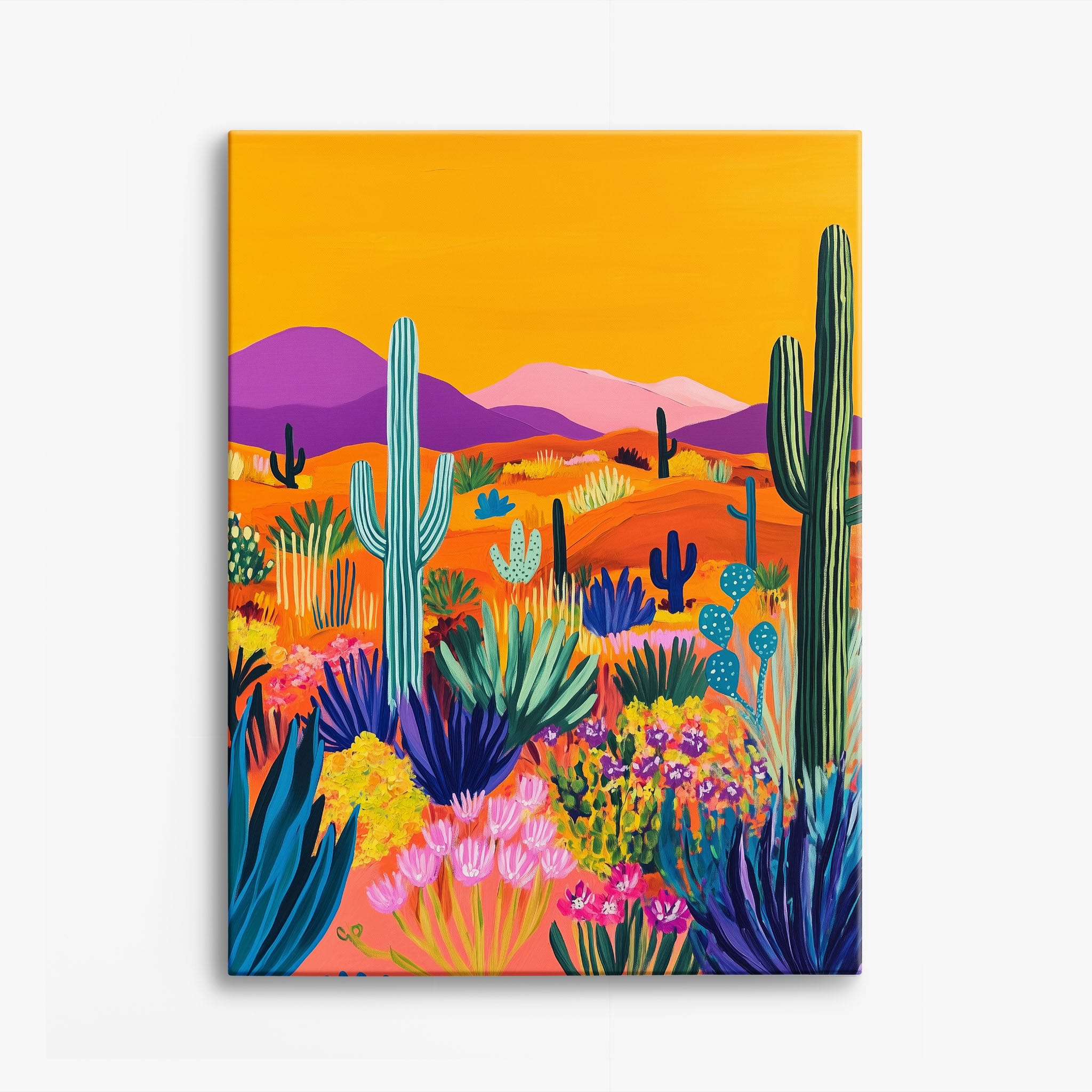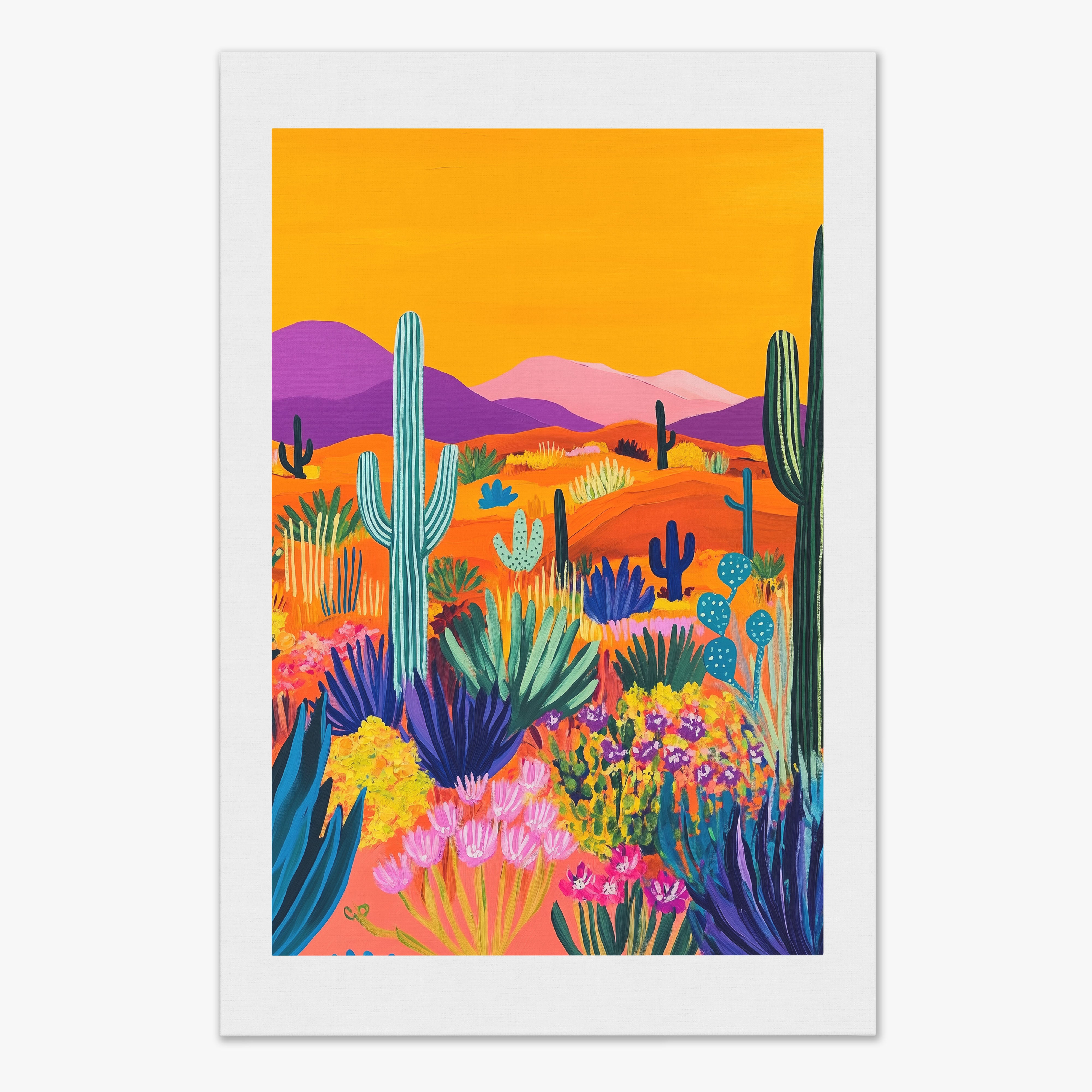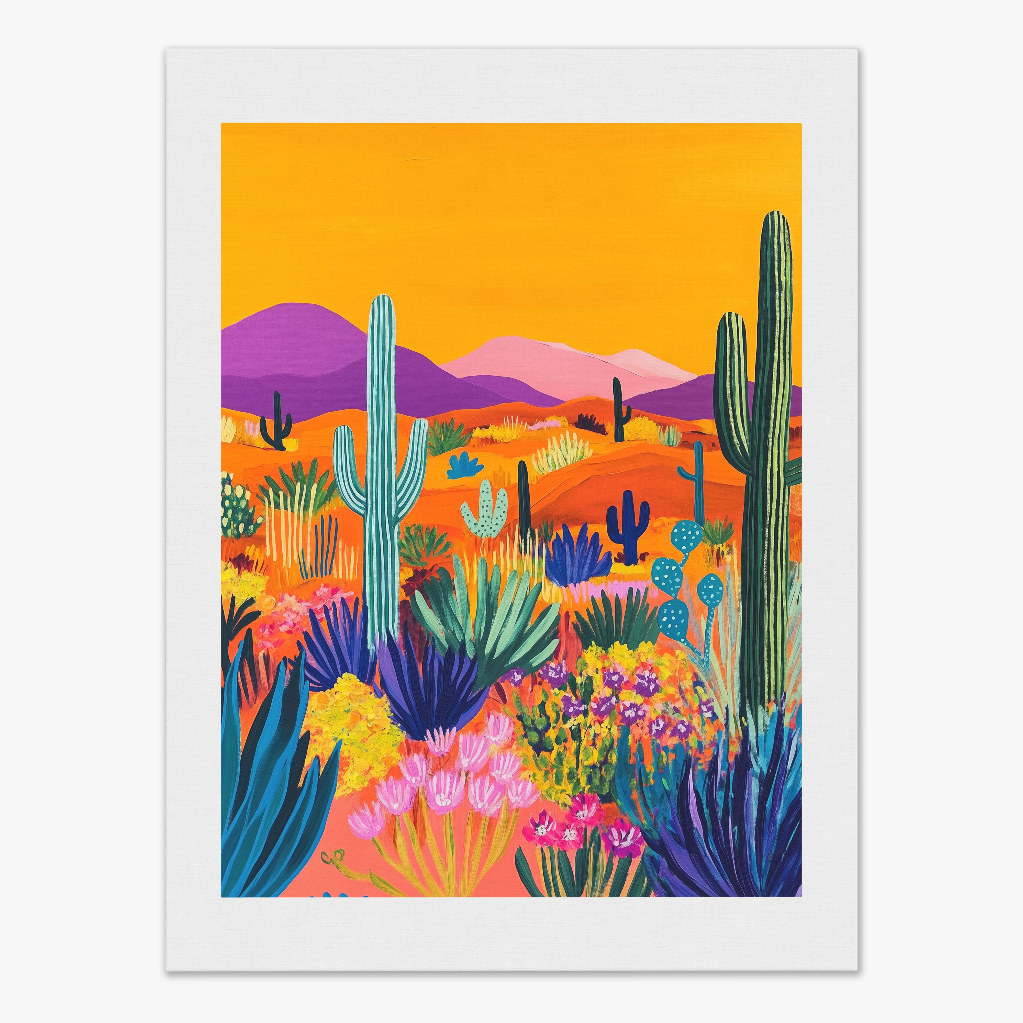 This digital illustration captures a vivid desert landscape, adorned with an array of cacti and foliage in bold, dynamic colors. The artwork blends abstract forms with impressionistic techniques, creating a lively and imaginative scene. The bright oranges and purples bring the desert environment to life, while the intricate details of the cacti and plants invite exploration. Perfect for art enthusiasts looking for a statement piece, this artwork adds a burst of color and a touch of nature-inspired whimsy to any space. Ideal for lovers of abstract and impressionist art, it showcases the beauty of desert flora in an innovative and eye-catching way.
