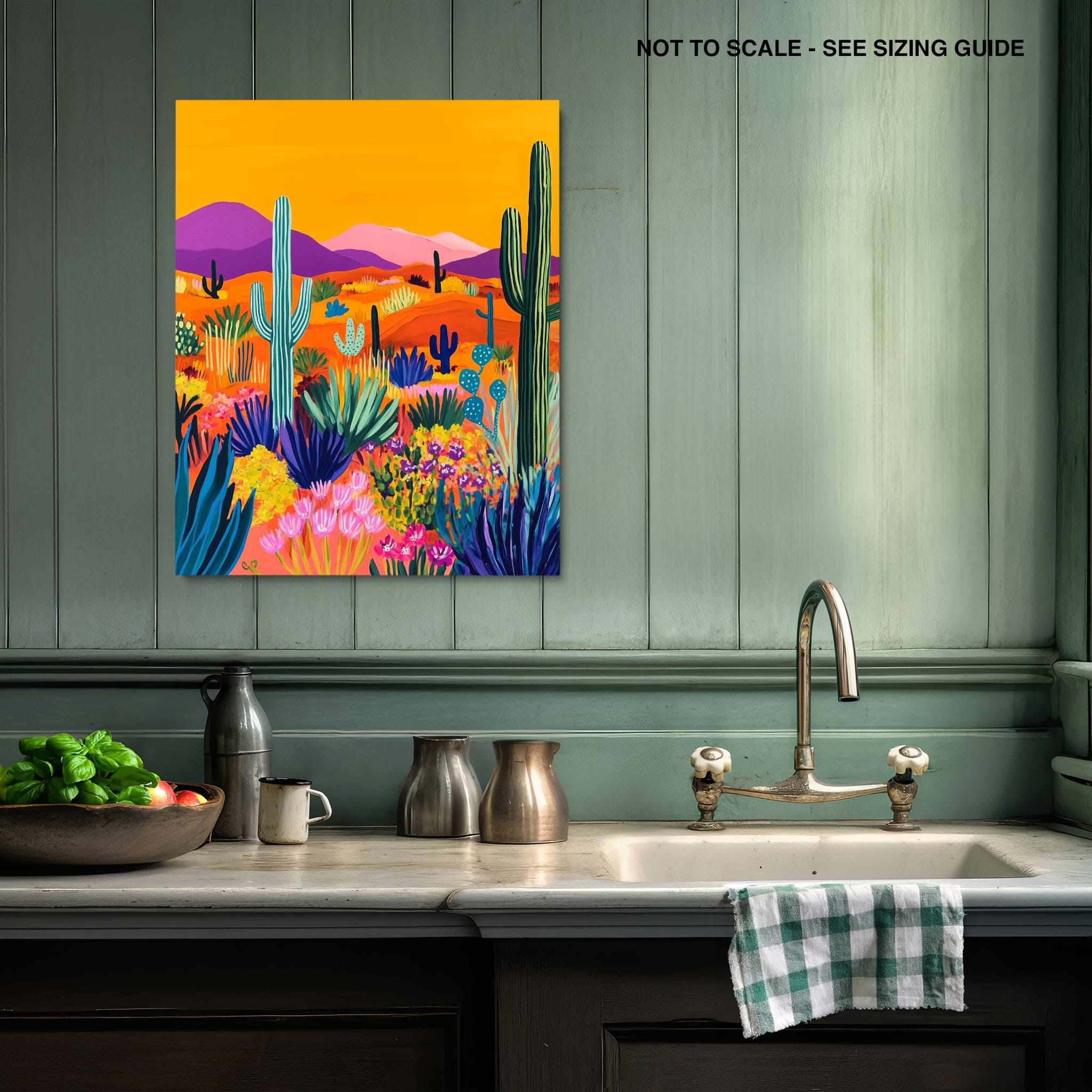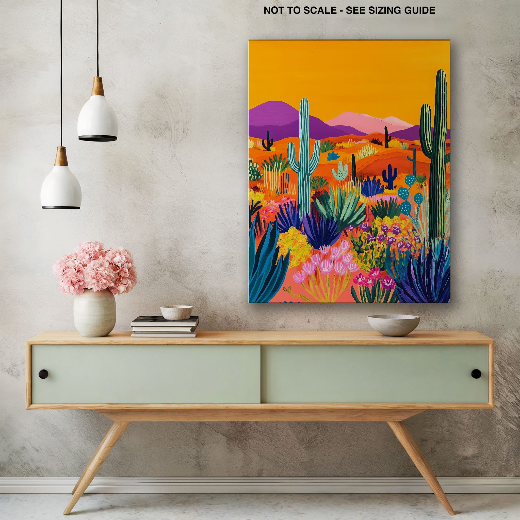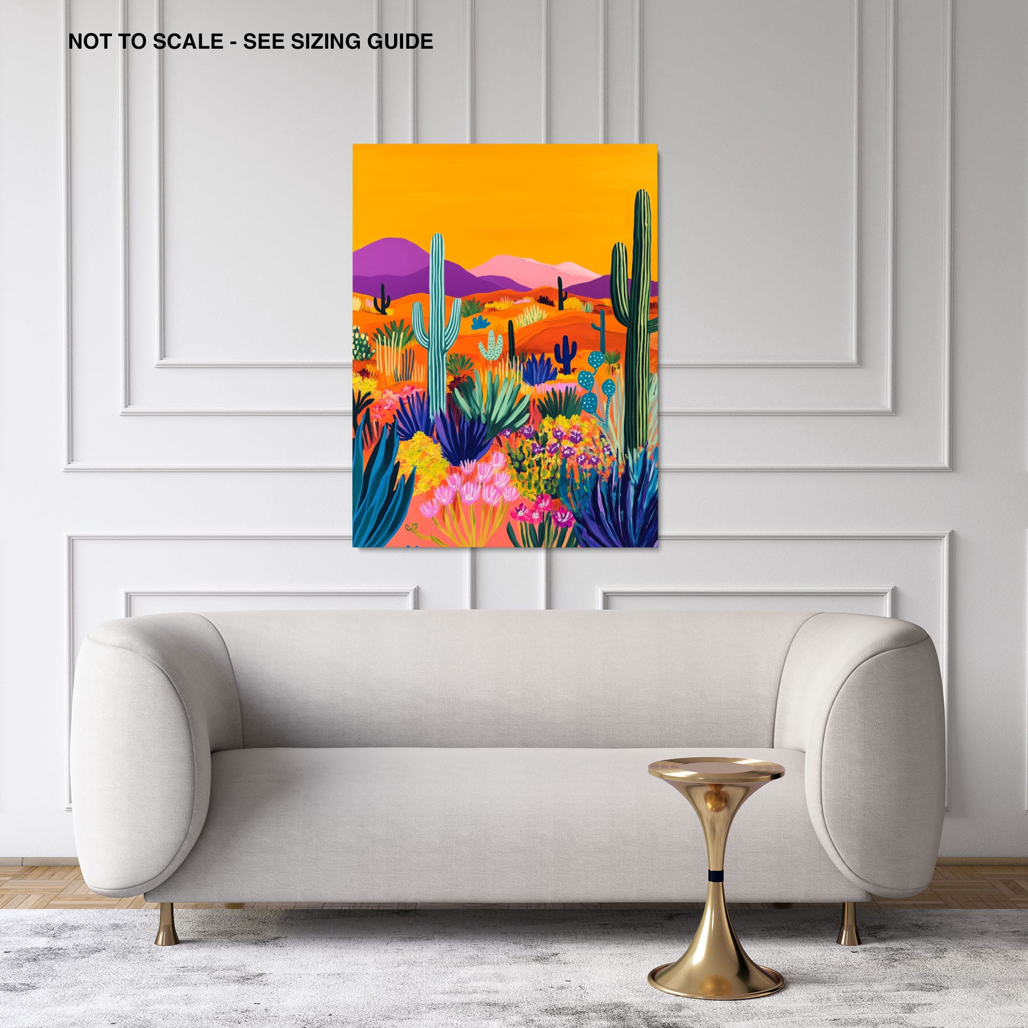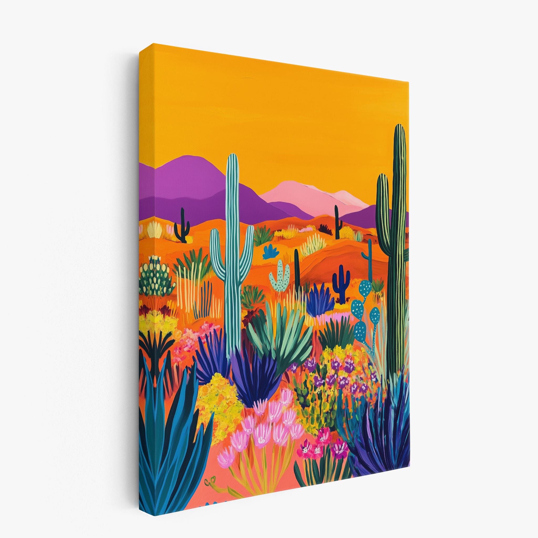 This digital illustration captures a vivid desert landscape, adorned with an array of cacti and foliage in bold, dynamic colors. The artwork blends abstract forms with impressionistic techniques, creating a lively and imaginative scene. The bright oranges and purples bring the desert environment to life, while the intricate details of the cacti and plants invite exploration. Perfect for art enthusiasts looking for a statement piece, this artwork adds a burst of color and a touch of nature-inspired whimsy to any space. Ideal for lovers of abstract and impressionist art, it showcases the beauty of desert flora in an innovative and eye-catching way.