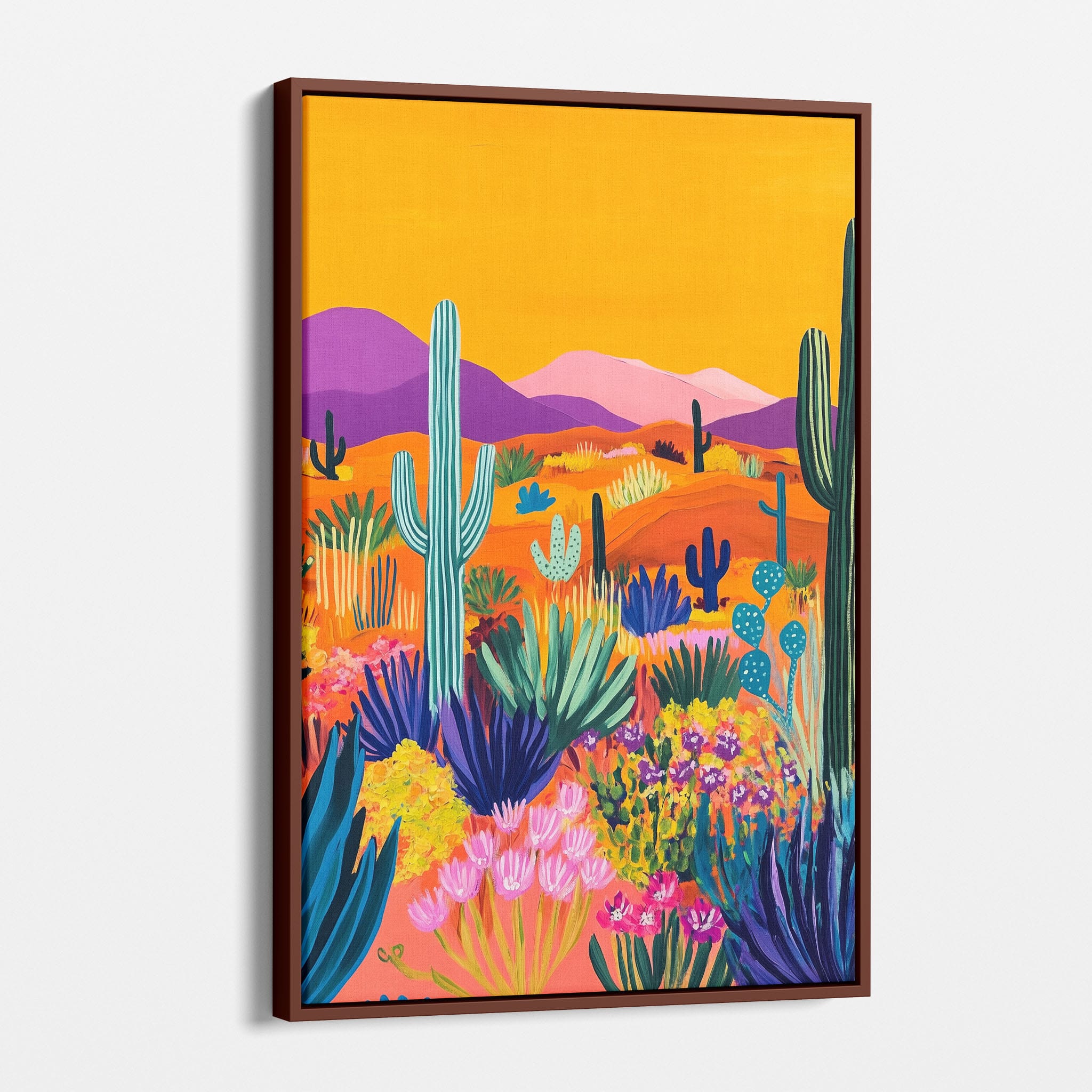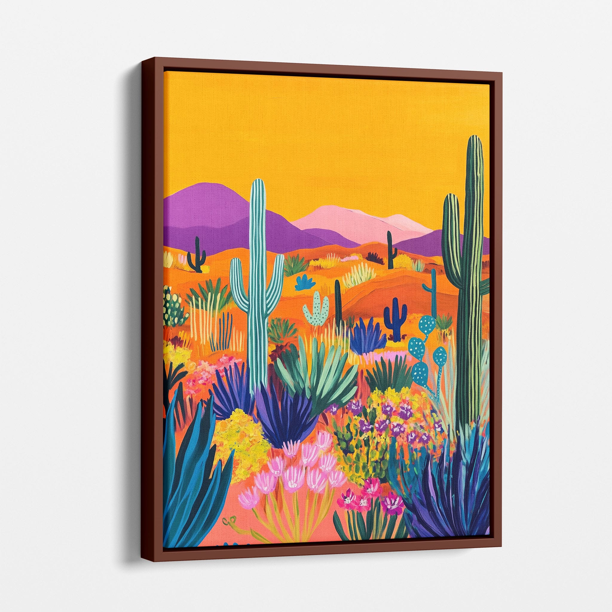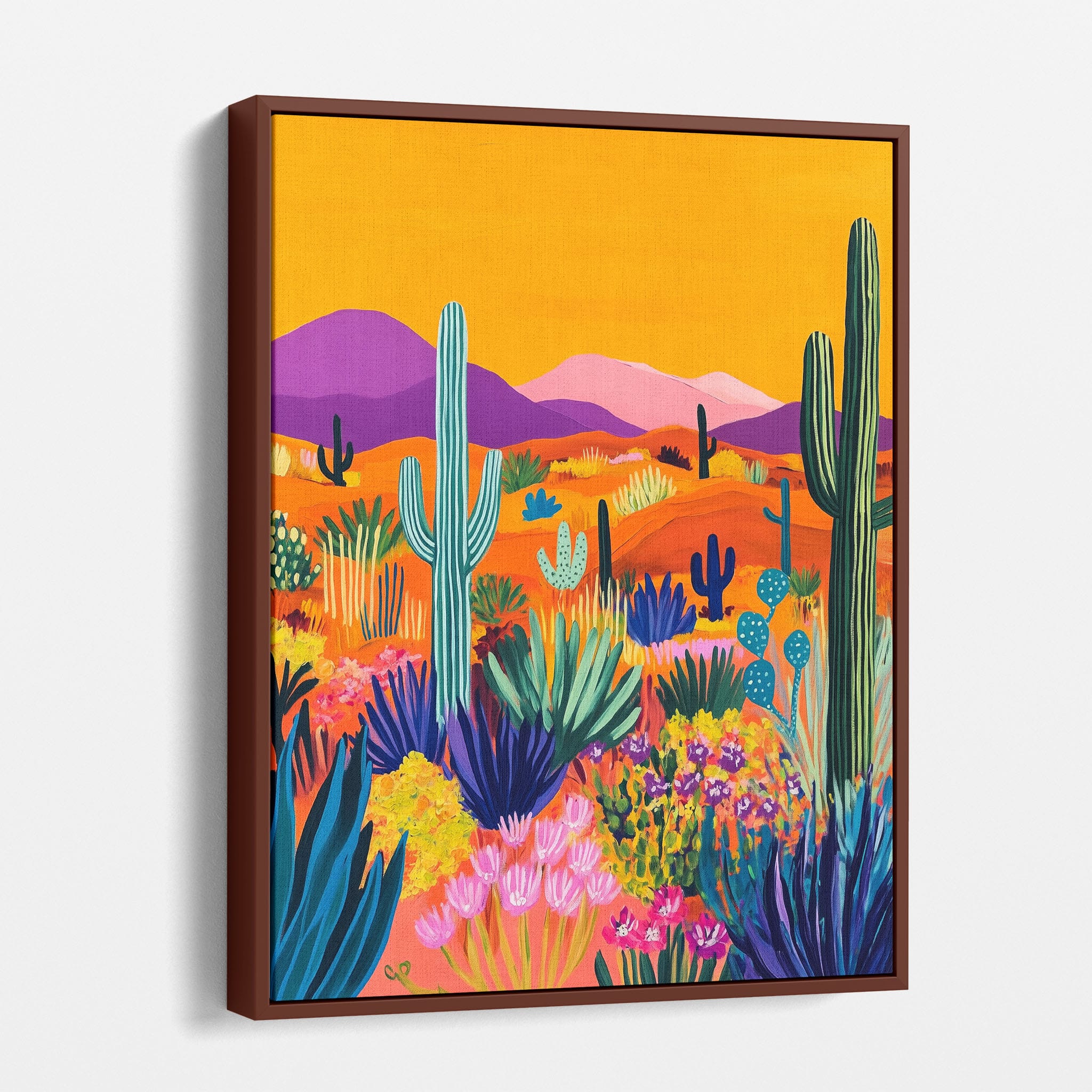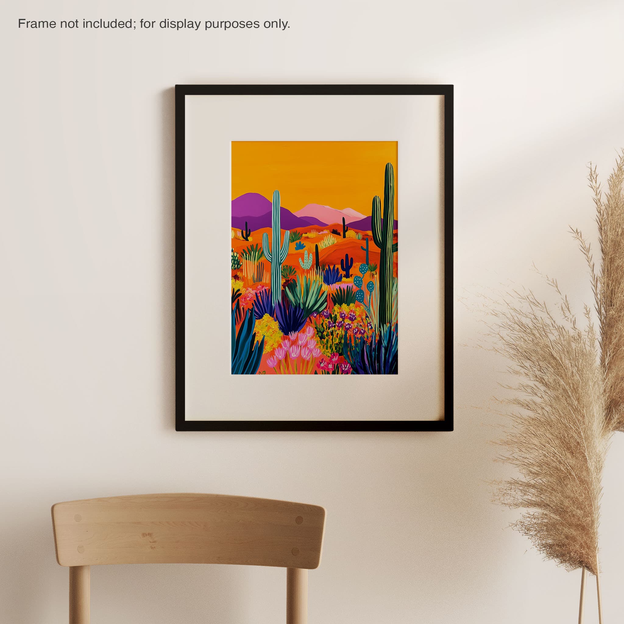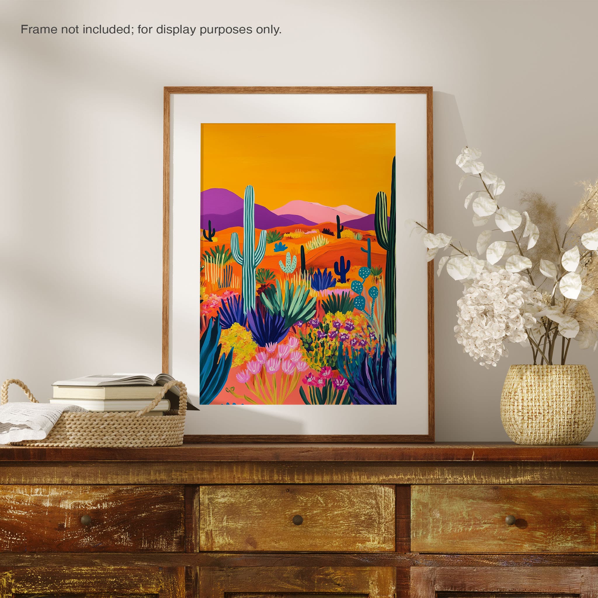 This digital illustration captures a vivid desert landscape, adorned with an array of cacti and foliage in bold, dynamic colors. The artwork blends abstract forms with impressionistic techniques, creating a lively and imaginative scene. The bright oranges and purples bring the desert environment to life, while the intricate details of the cacti and plants invite exploration. Perfect for art enthusiasts looking for a statement piece, this artwork adds a burst of color and a touch of nature-inspired whimsy to any space. Ideal for lovers of abstract and impressionist art, it showcases the beauty of desert flora in an innovative and eye-catching way.