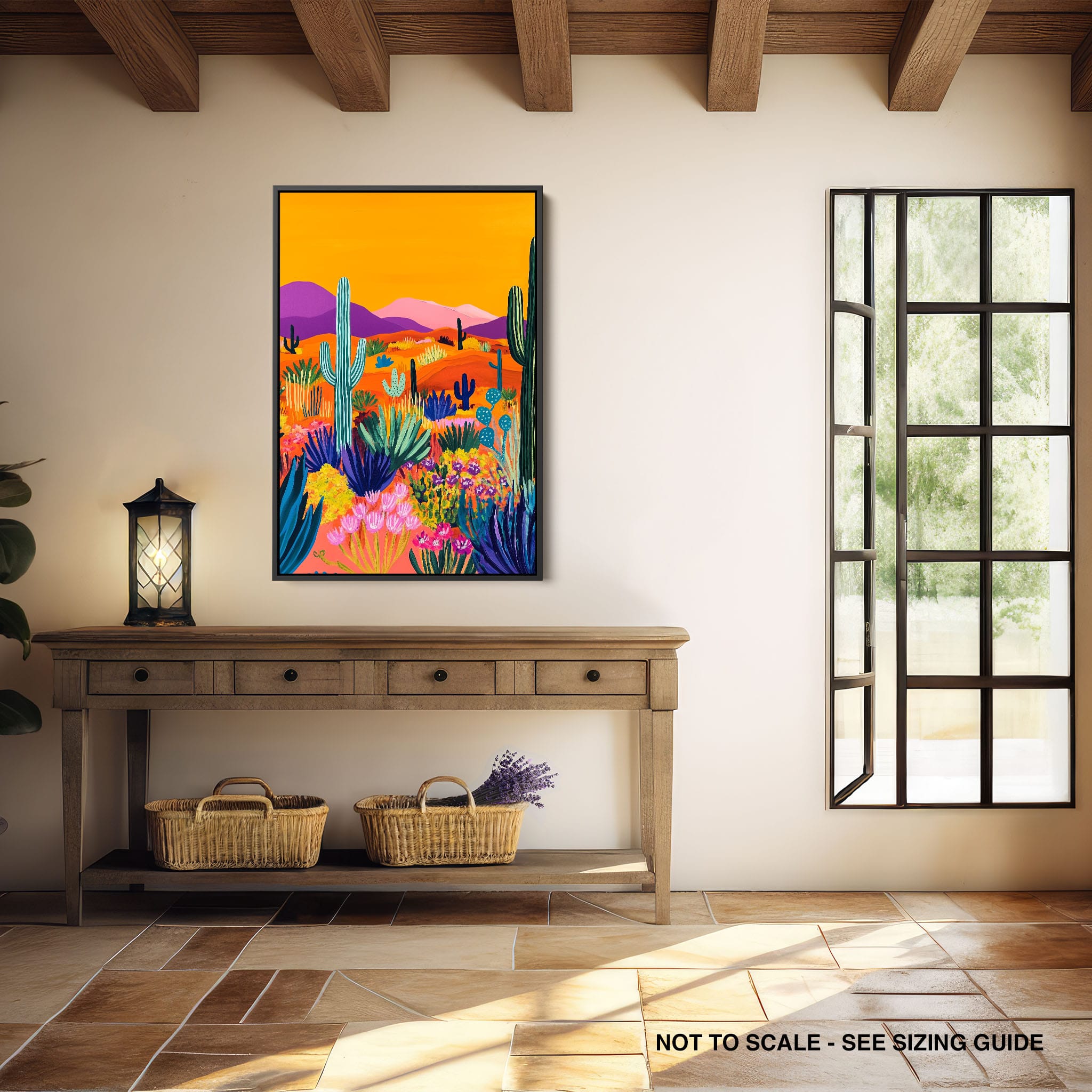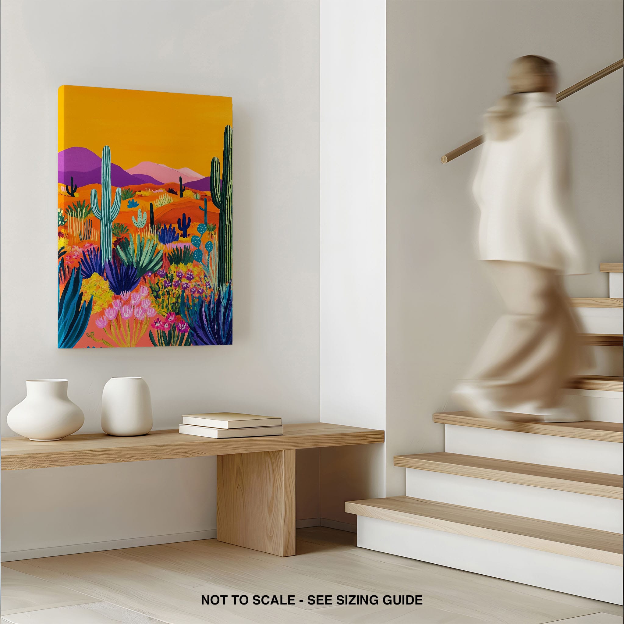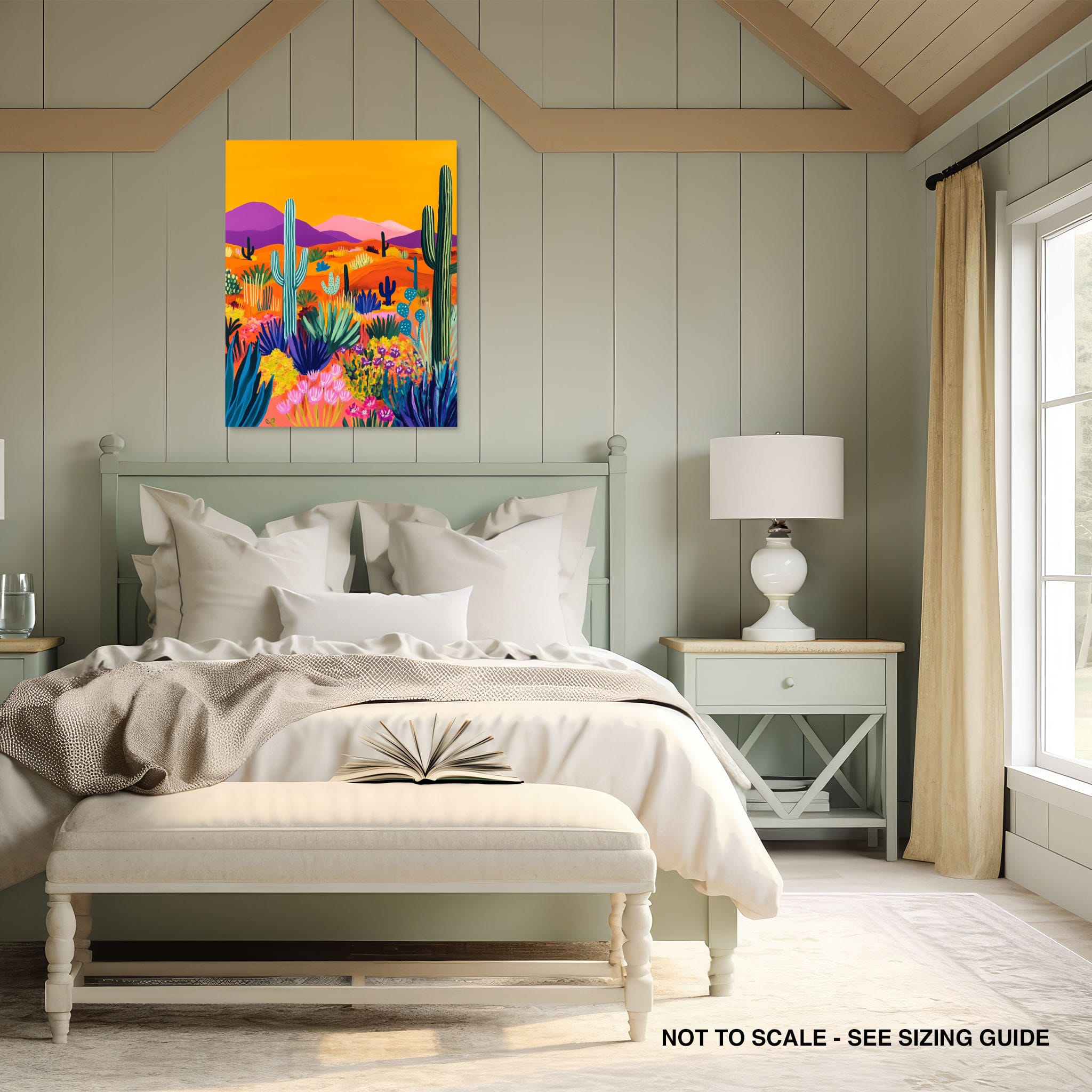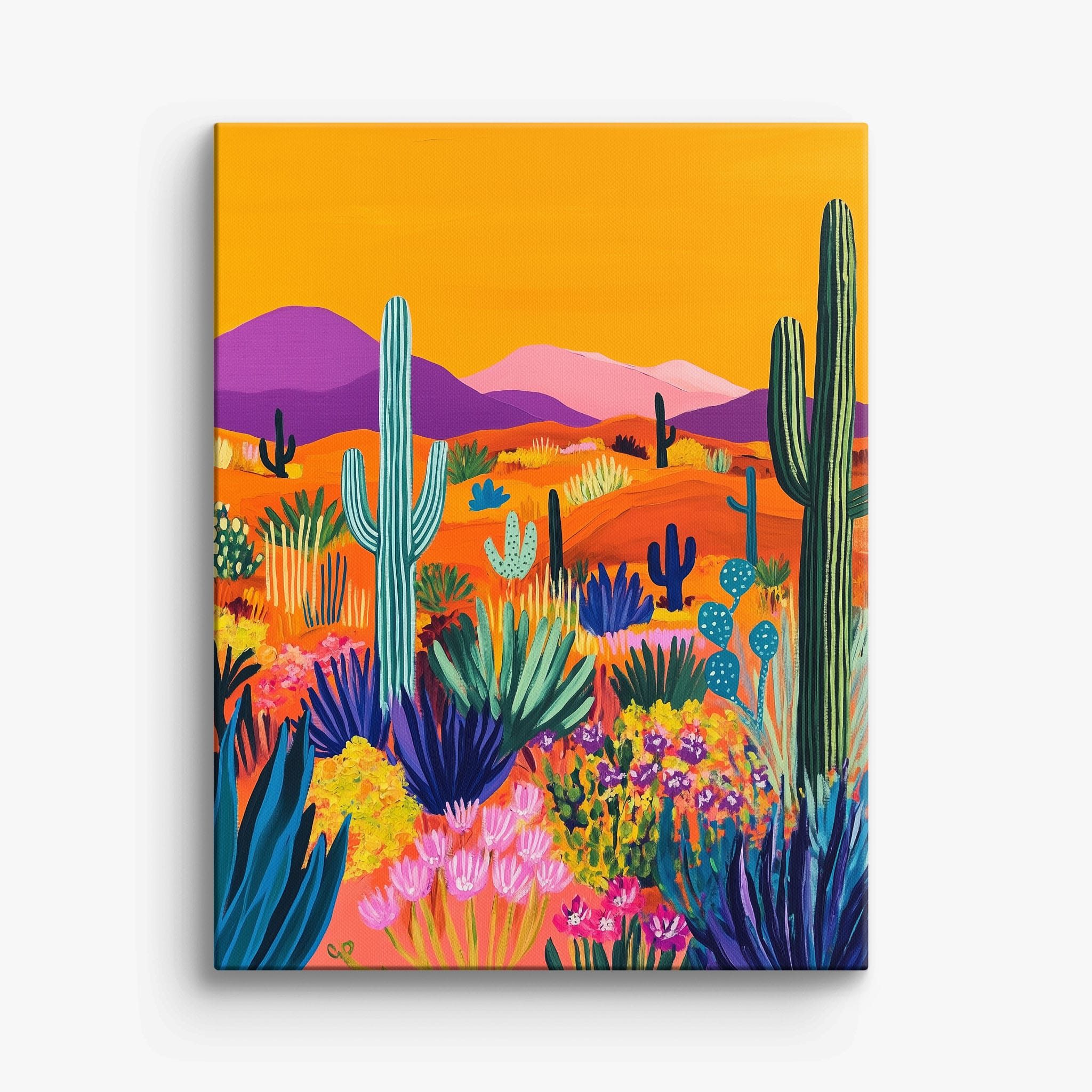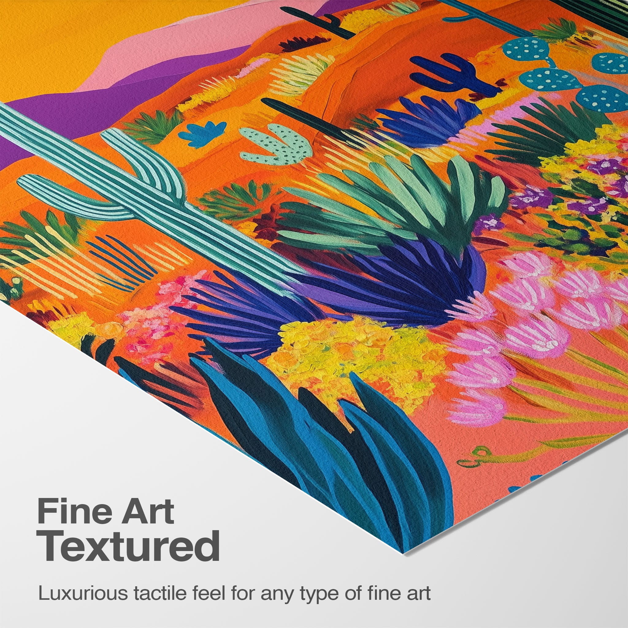 This digital illustration captures a vivid desert landscape, adorned with an array of cacti and foliage in bold, dynamic colors. The artwork blends abstract forms with impressionistic techniques, creating a lively and imaginative scene. The bright oranges and purples bring the desert environment to life, while the intricate details of the cacti and plants invite exploration. Perfect for art enthusiasts looking for a statement piece, this artwork adds a burst of color and a touch of nature-inspired whimsy to any space. Ideal for lovers of abstract and impressionist art, it showcases the beauty of desert flora in an innovative and eye-catching way.