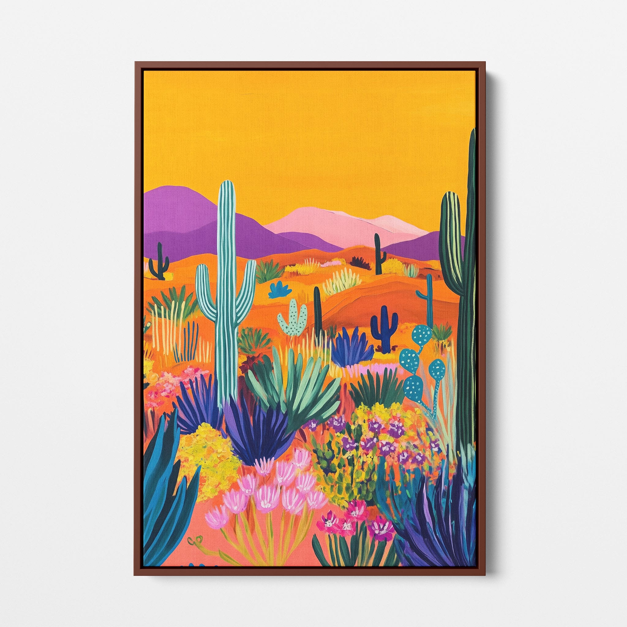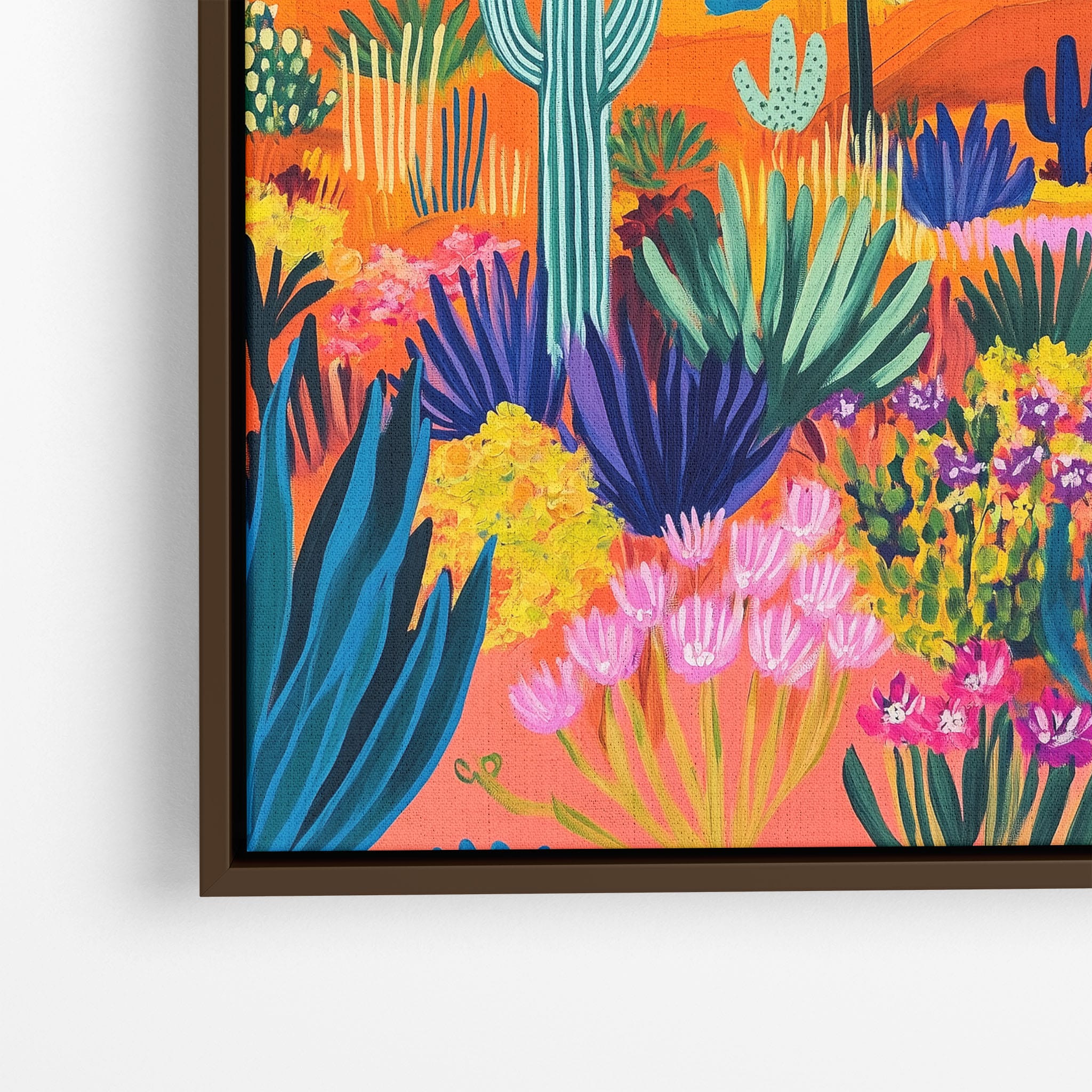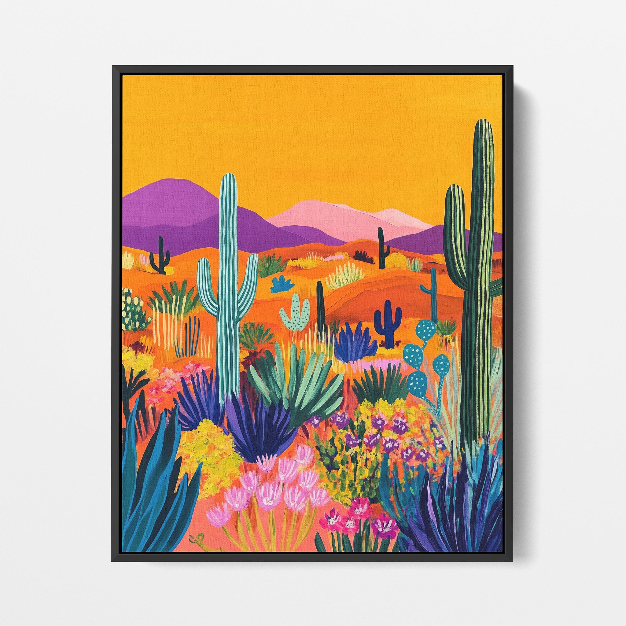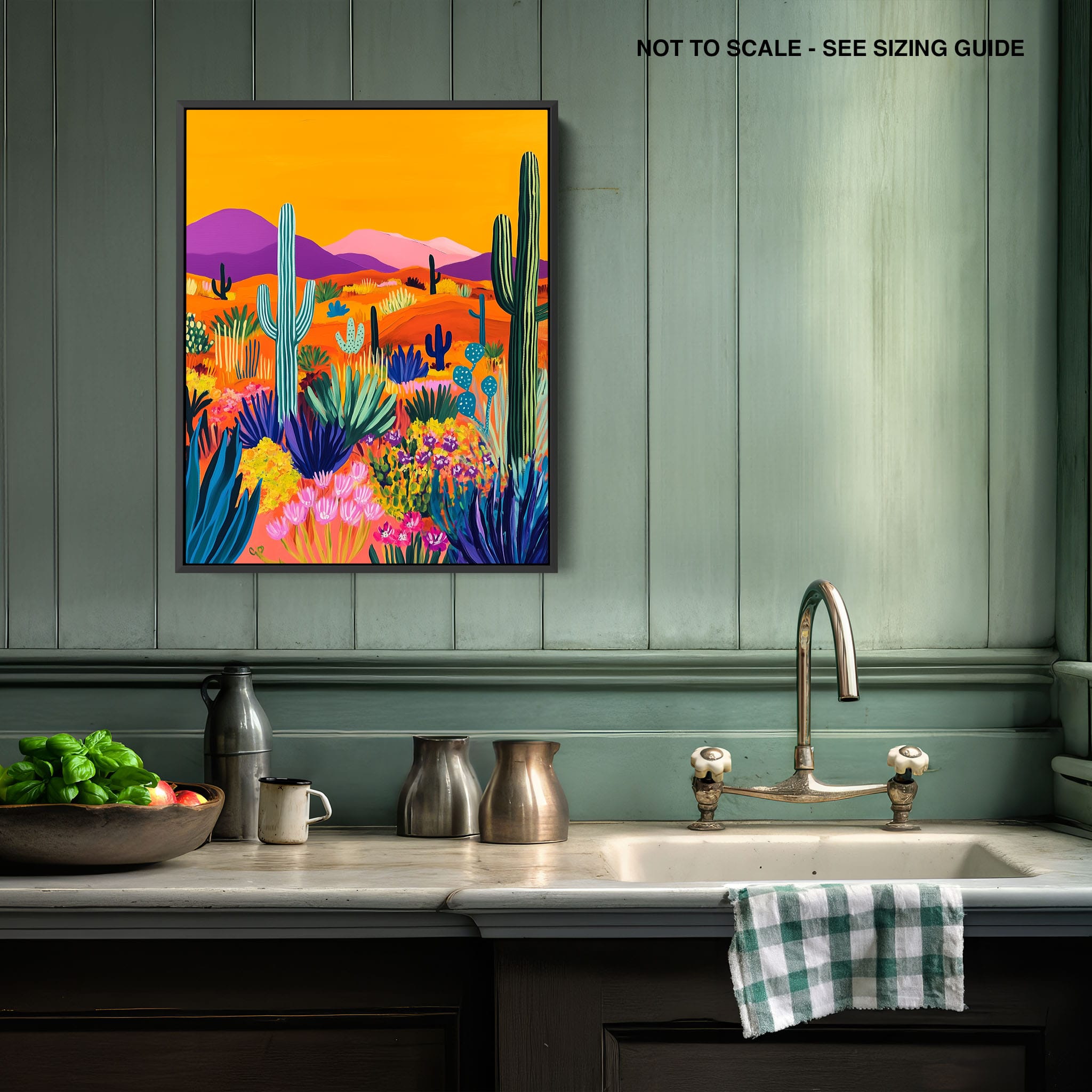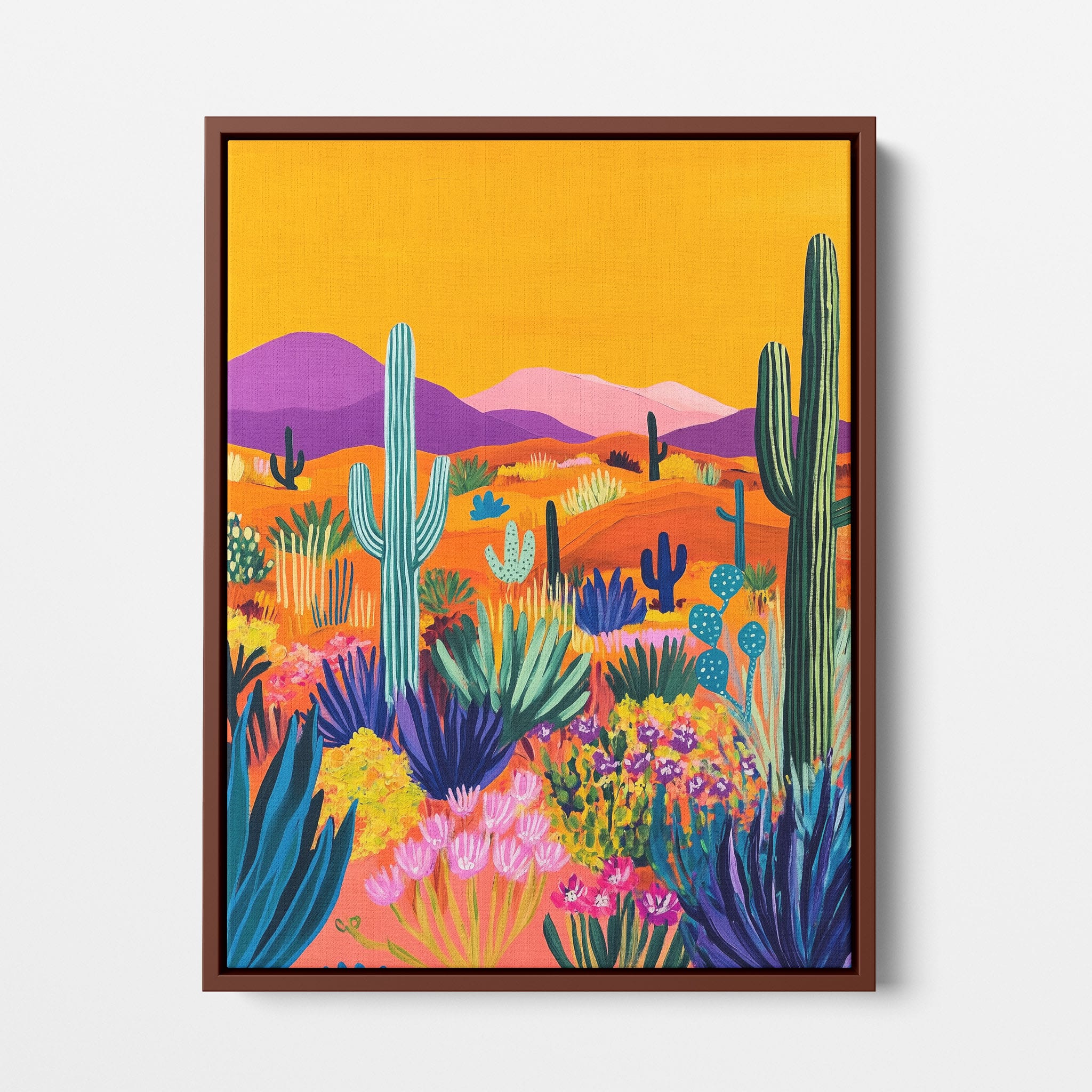 This digital illustration captures a vivid desert landscape, adorned with an array of cacti and foliage in bold, dynamic colors. The artwork blends abstract forms with impressionistic techniques, creating a lively and imaginative scene. The bright oranges and purples bring the desert environment to life, while the intricate details of the cacti and plants invite exploration. Perfect for art enthusiasts looking for a statement piece, this artwork adds a burst of color and a touch of nature-inspired whimsy to any space. Ideal for lovers of abstract and impressionist art, it showcases the beauty of desert flora in an innovative and eye-catching way.