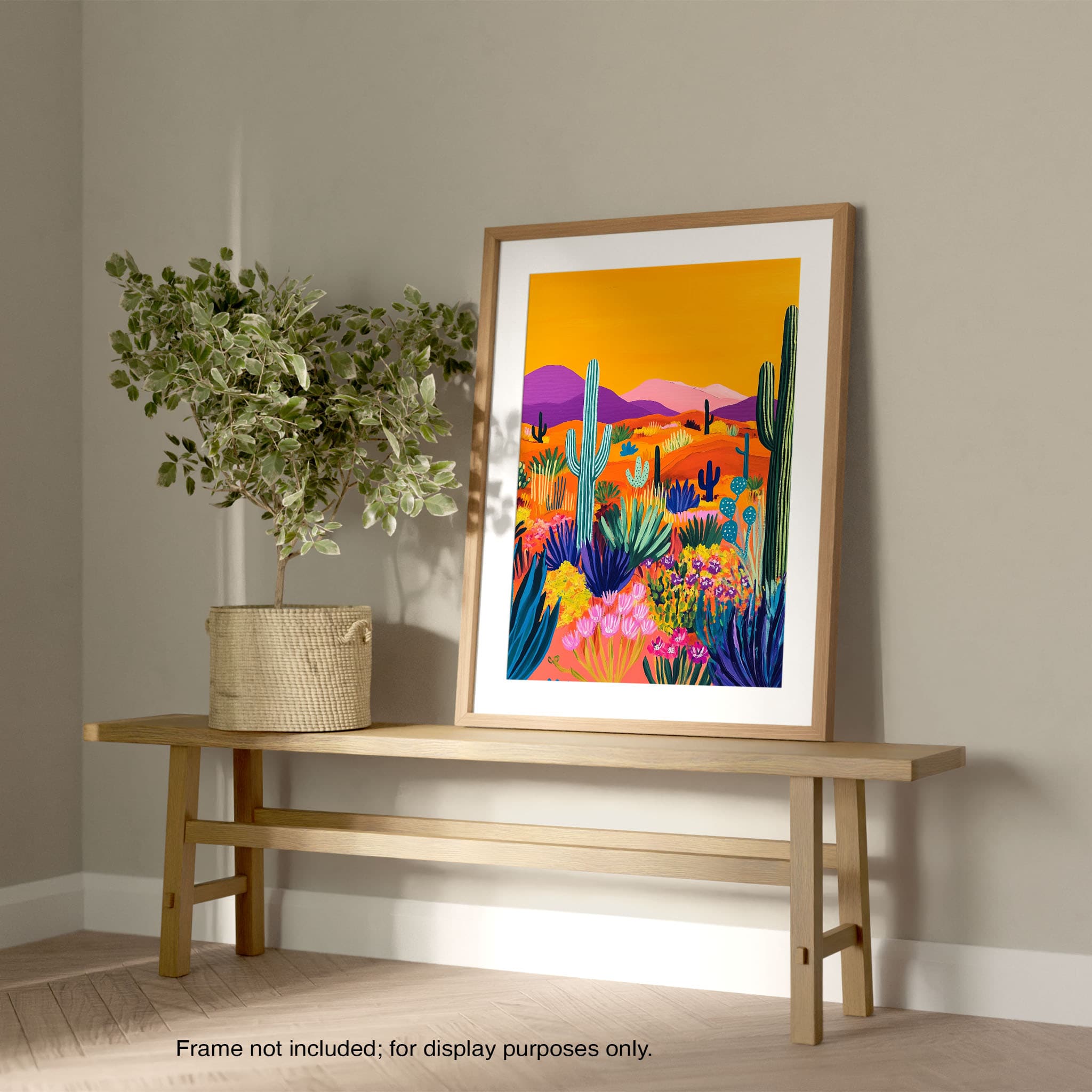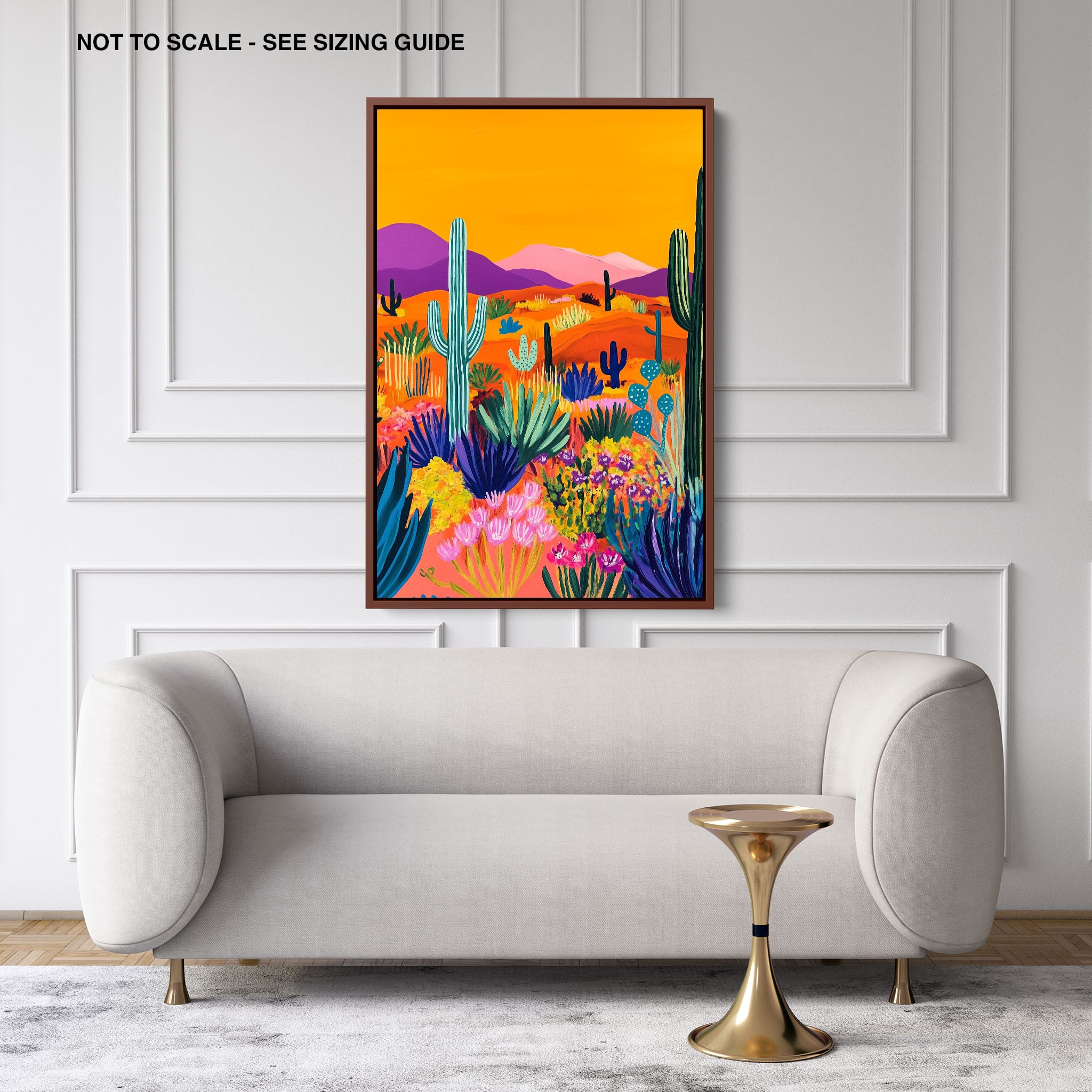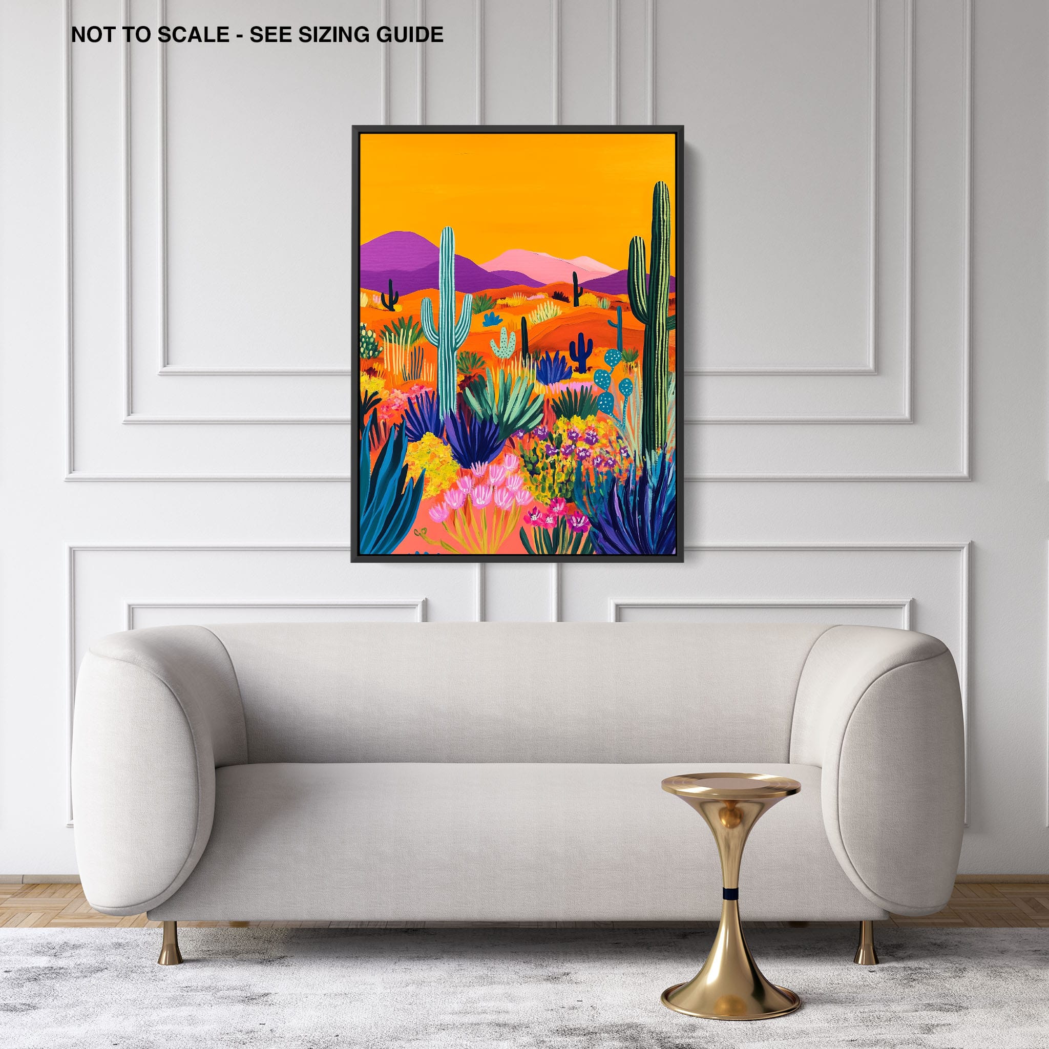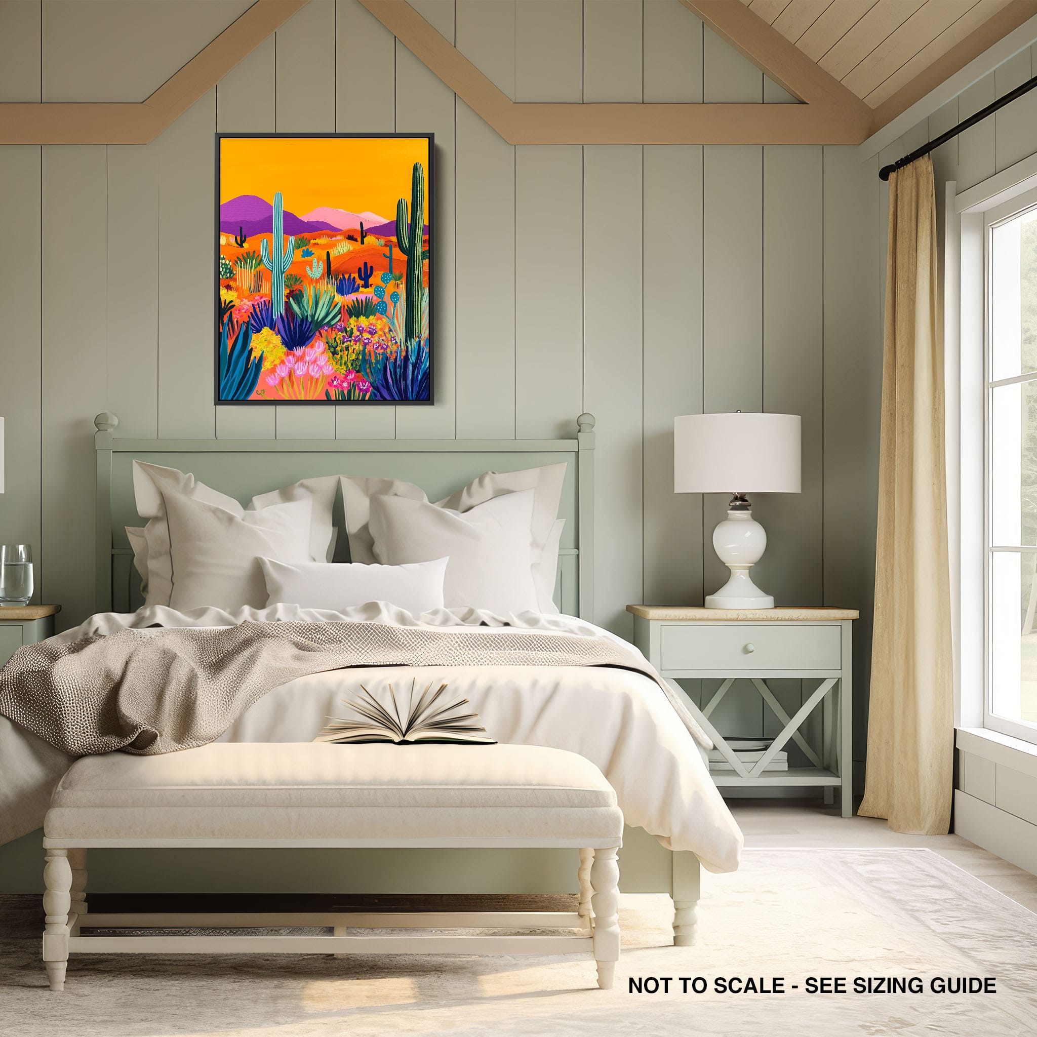 This digital illustration captures a vivid desert landscape, adorned with an array of cacti and foliage in bold, dynamic colors. The artwork blends abstract forms with impressionistic techniques, creating a lively and imaginative scene. The bright oranges and purples bring the desert environment to life, while the intricate details of the cacti and plants invite exploration. Perfect for art enthusiasts looking for a statement piece, this artwork adds a burst of color and a touch of nature-inspired whimsy to any space. Ideal for lovers of abstract and impressionist art, it showcases the beauty of desert flora in an innovative and eye-catching way.