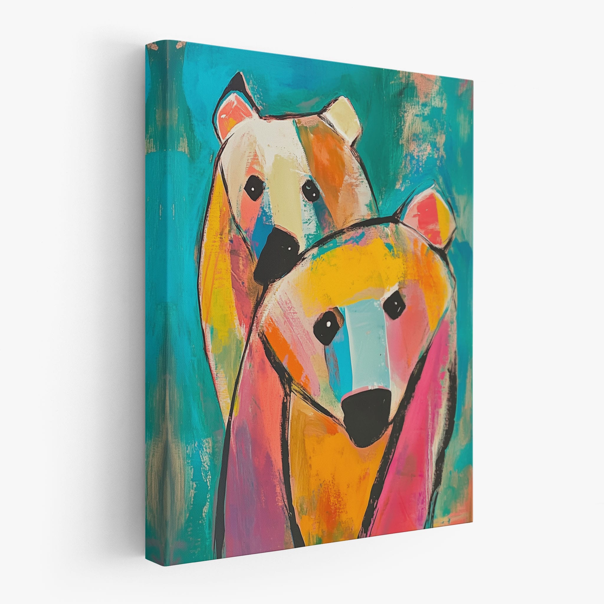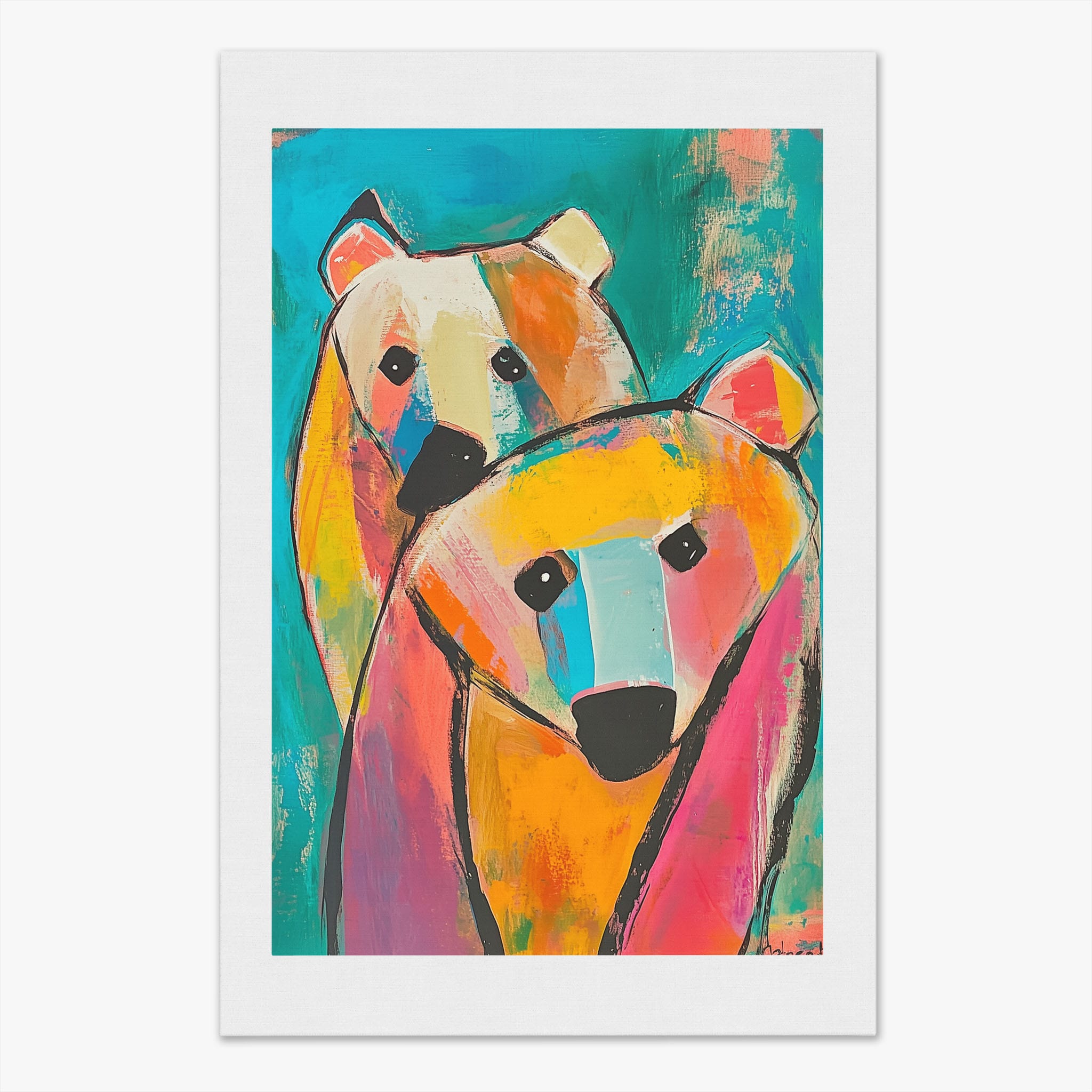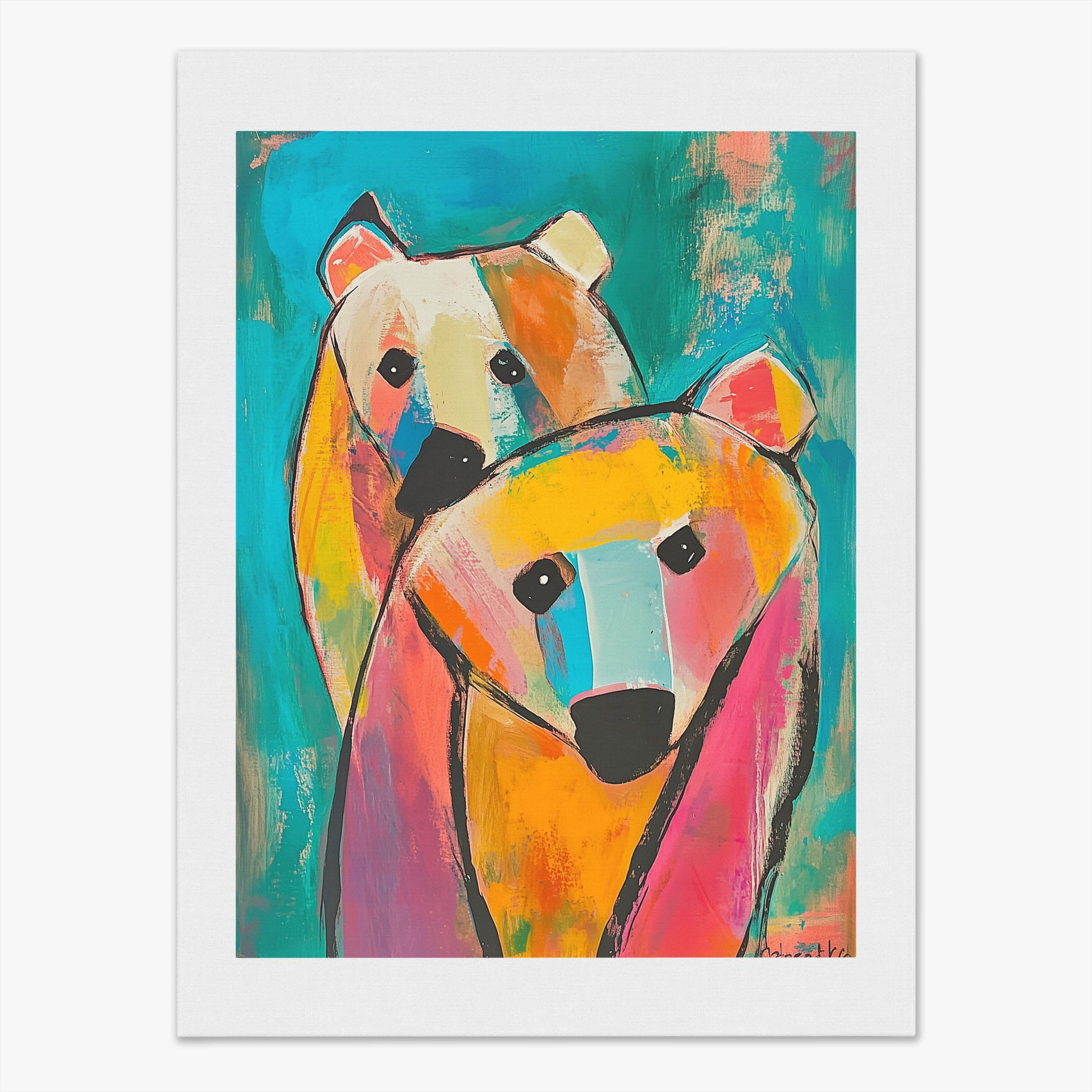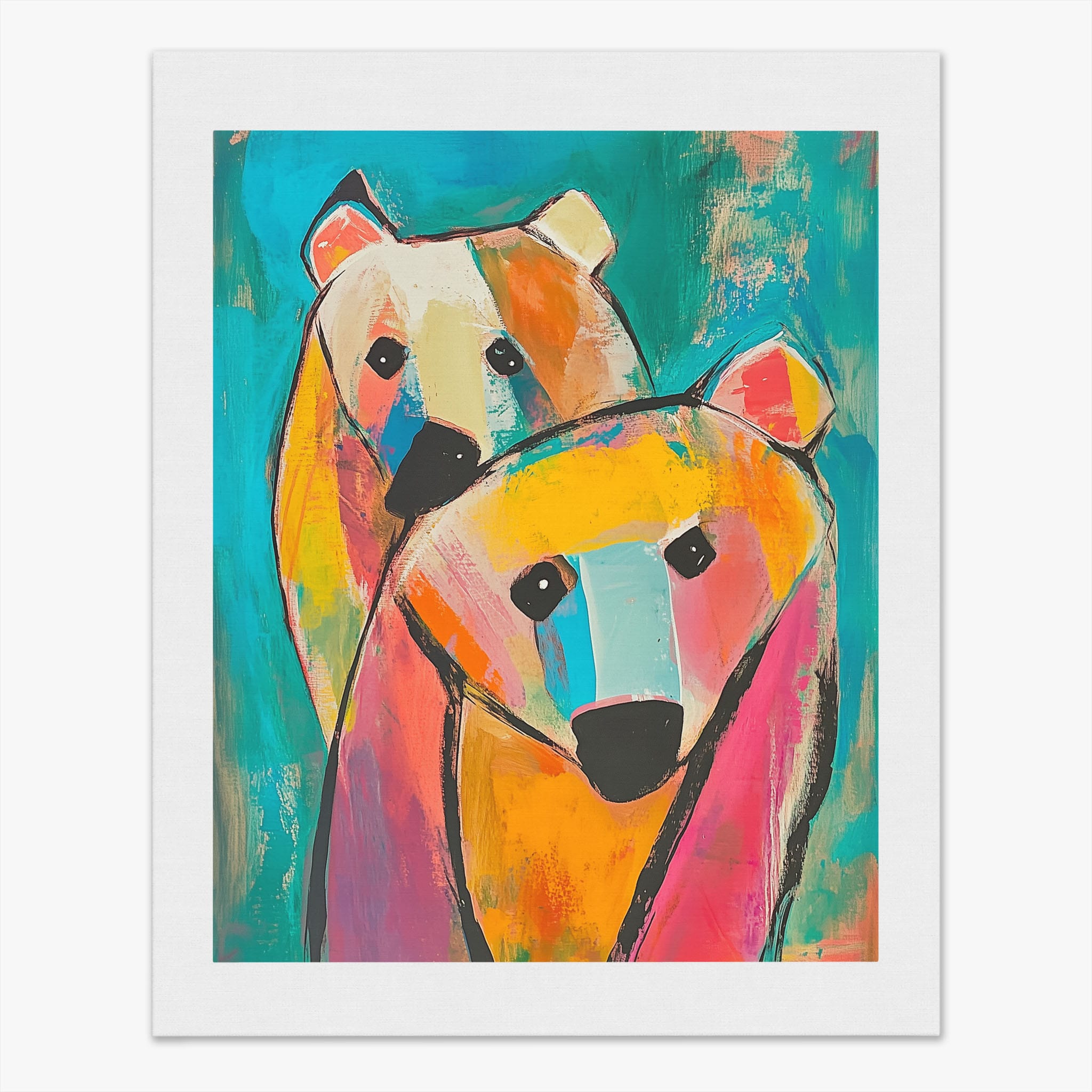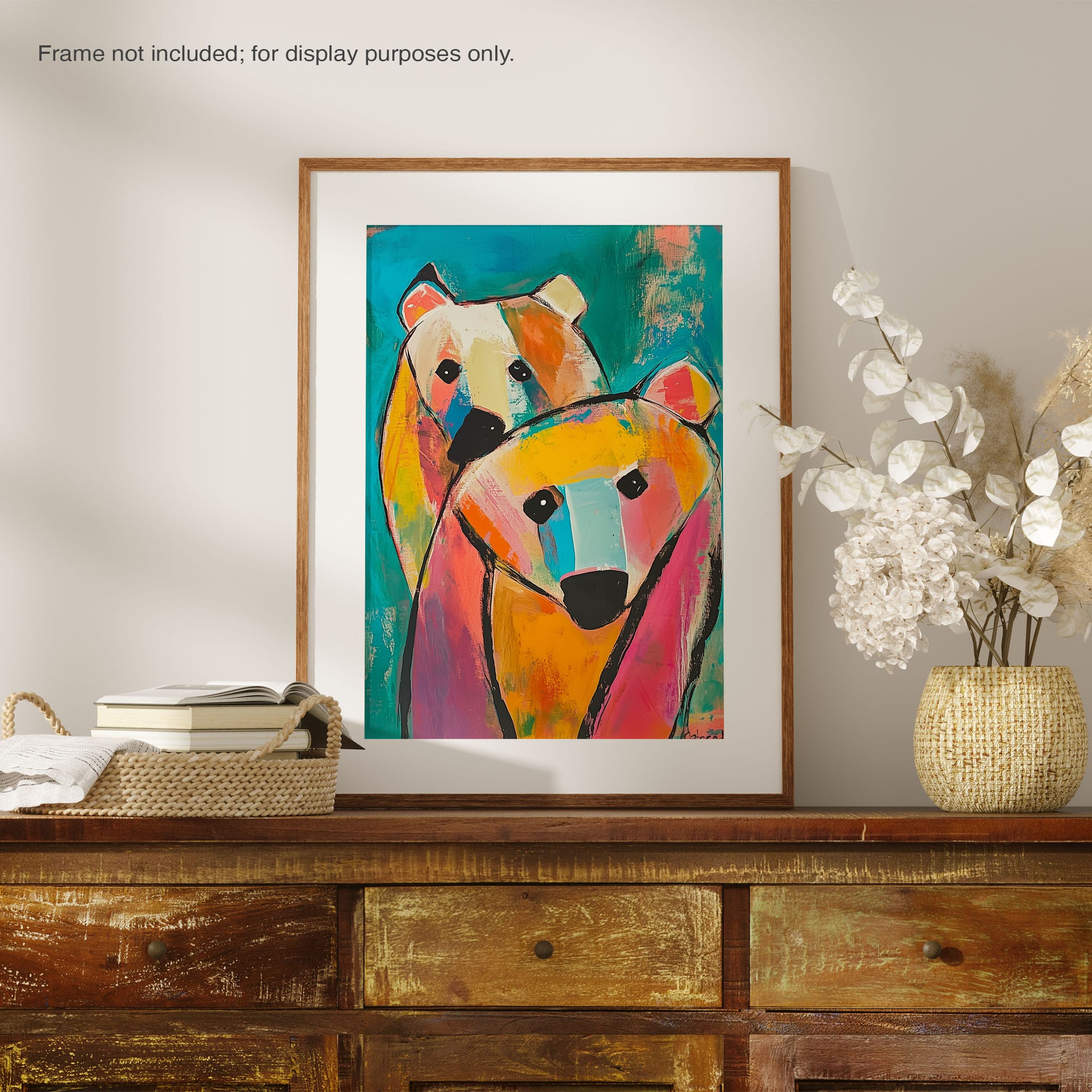 This vibrant digital painting captures the essence of two abstract bears in a sea of rich colors ranging from deep blues to fiery oranges. The expressionist style allows for an explosion of feelings and thoughts as the faces of the bears gaze back with soul-piercing eyes. The bold strokes and vivid palette make this artwork a striking addition to any space, expressing warmth and familial bonds. Ideal for those who appreciate art that speaks and stands out, this piece will draw the eye and heart of any viewer. Elevate your living space with this expressive representation of animal affection.