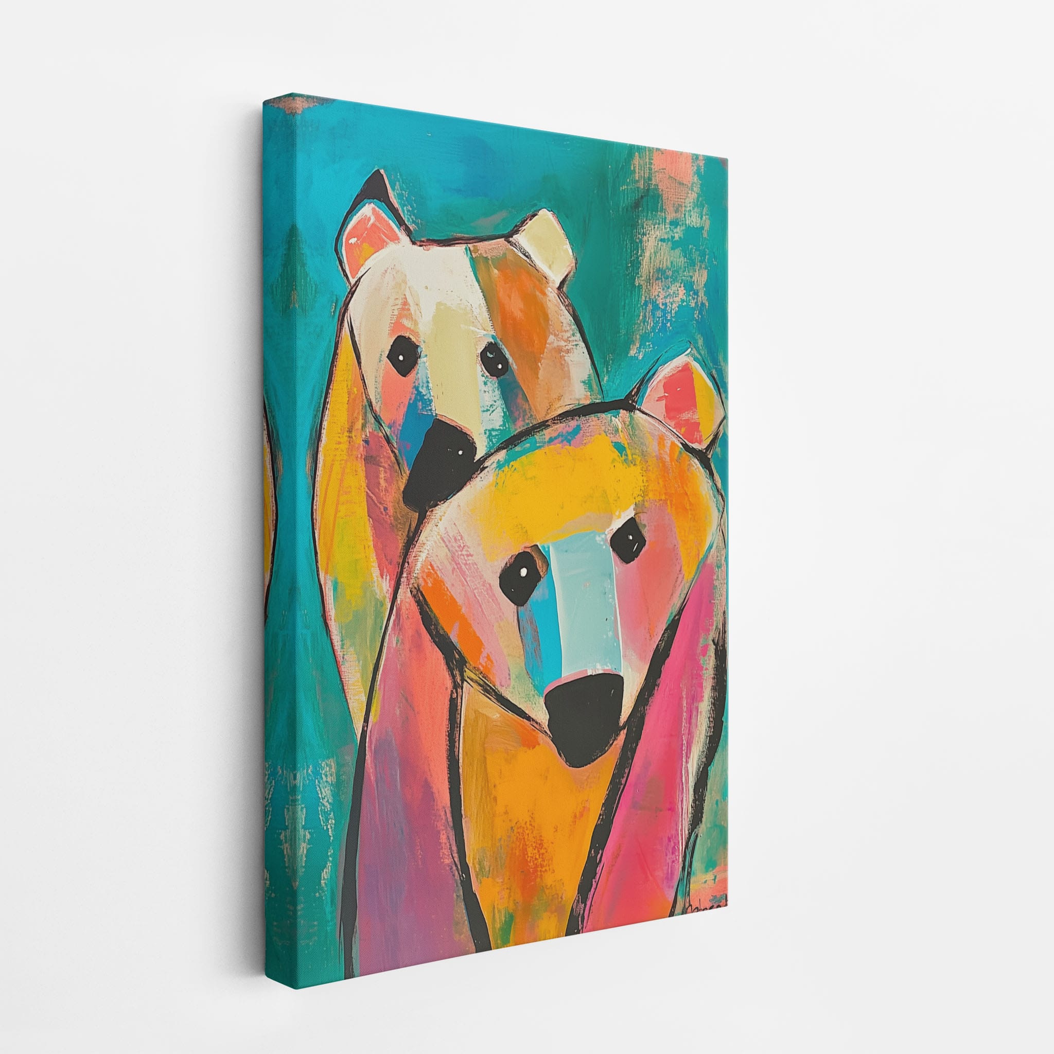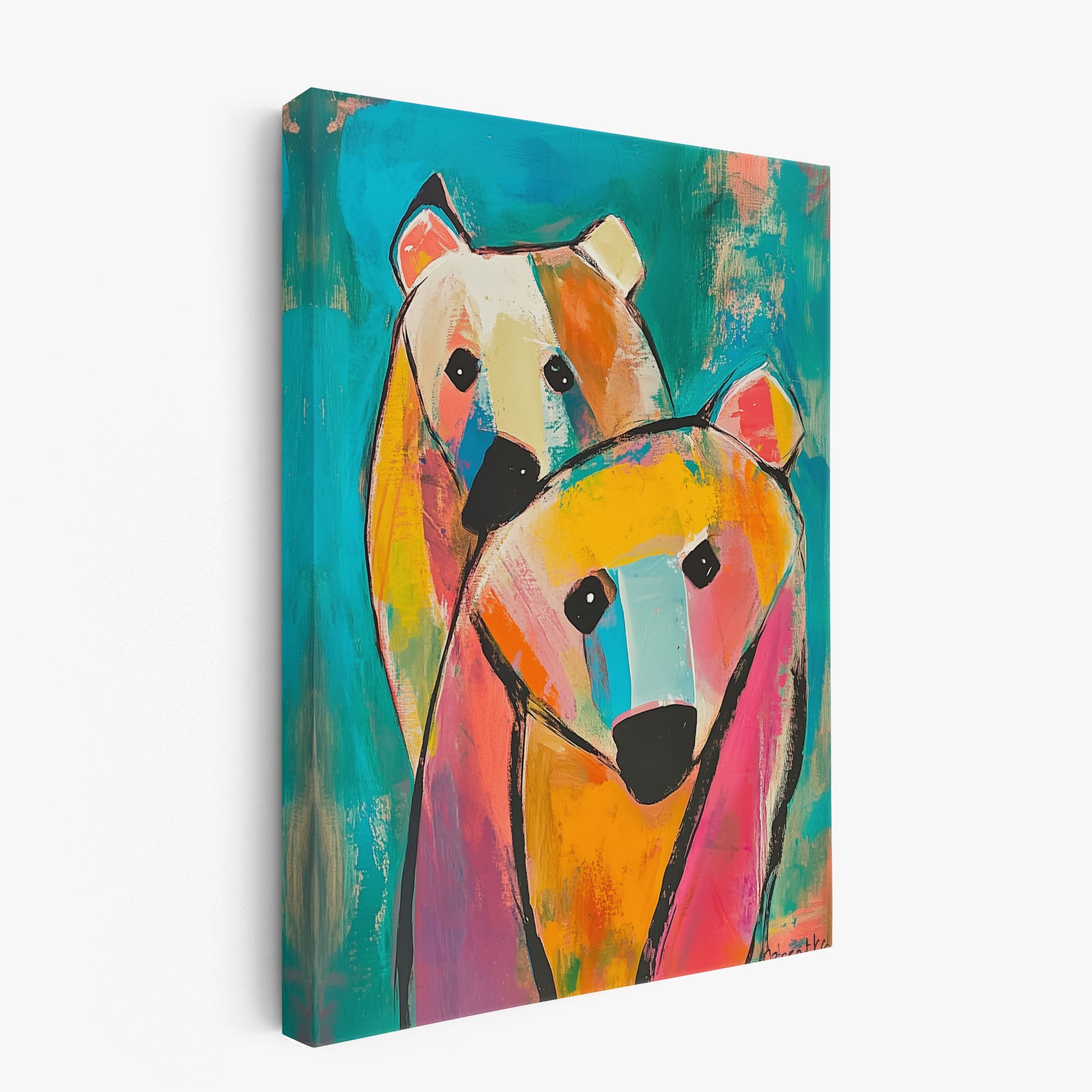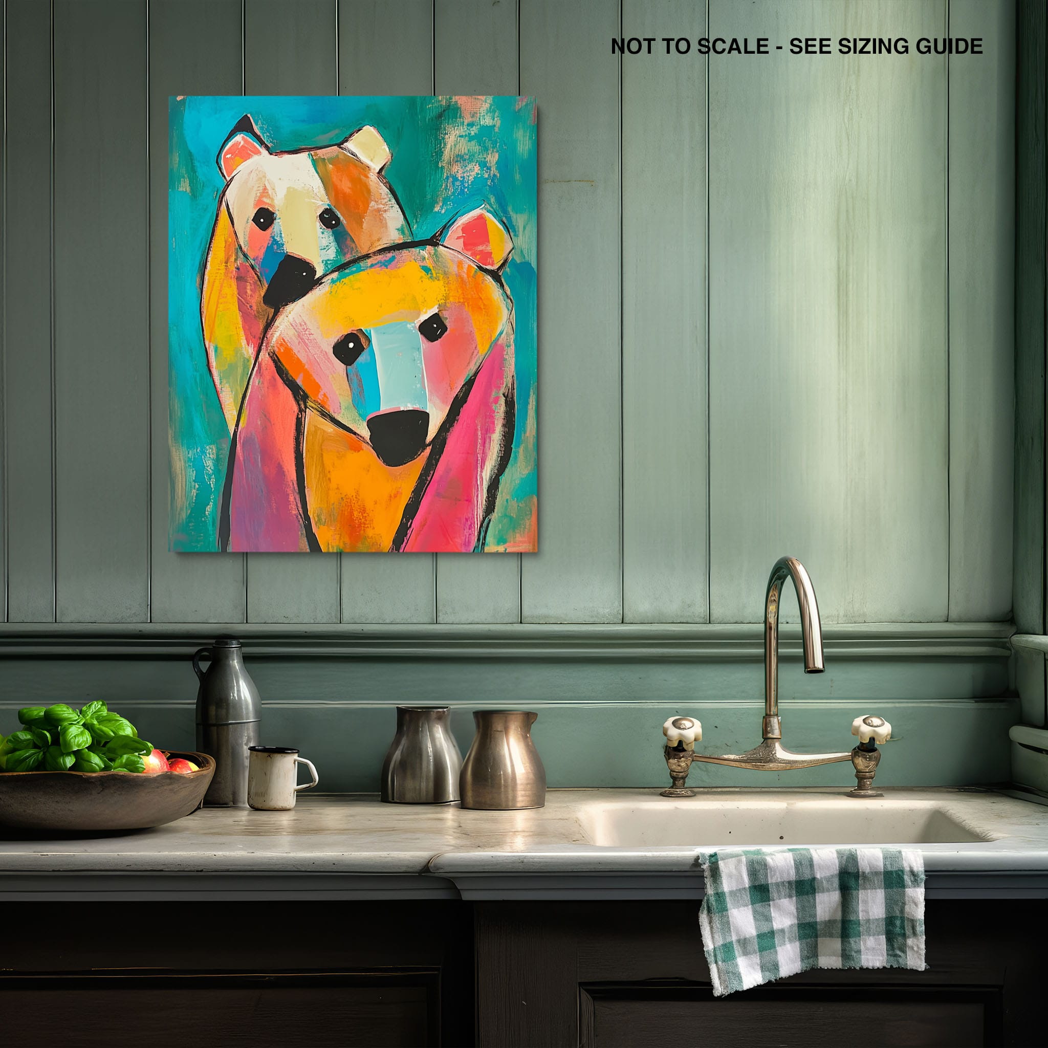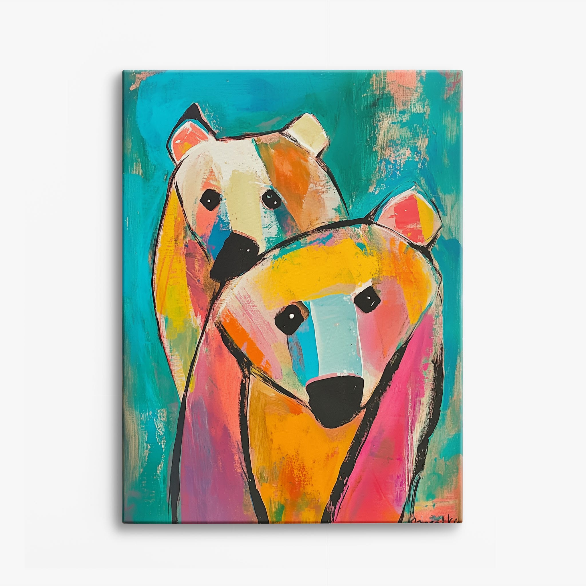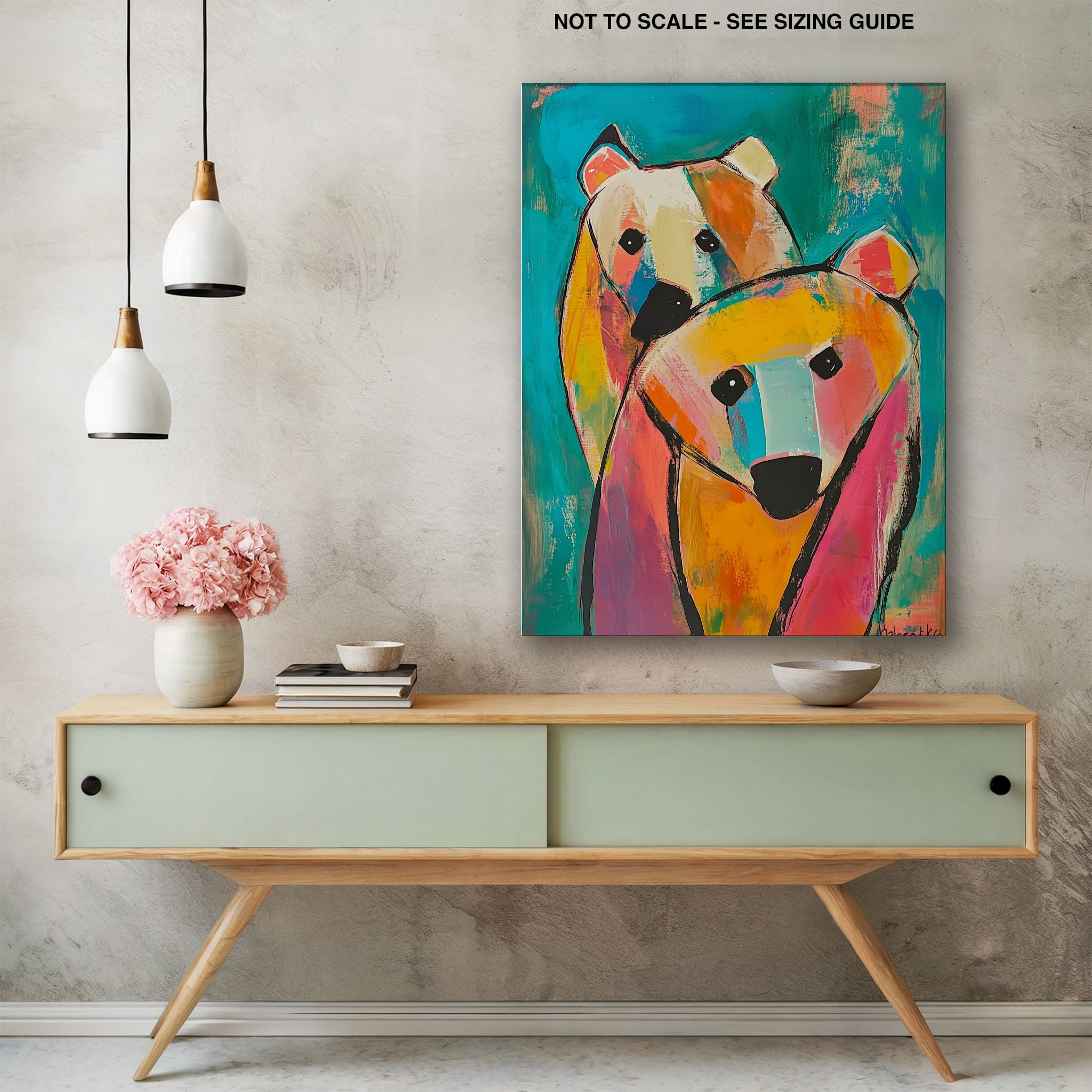 This vibrant digital painting captures the essence of two abstract bears in a sea of rich colors ranging from deep blues to fiery oranges. The expressionist style allows for an explosion of feelings and thoughts as the faces of the bears gaze back with soul-piercing eyes. The bold strokes and vivid palette make this artwork a striking addition to any space, expressing warmth and familial bonds. Ideal for those who appreciate art that speaks and stands out, this piece will draw the eye and heart of any viewer. Elevate your living space with this expressive representation of animal affection.