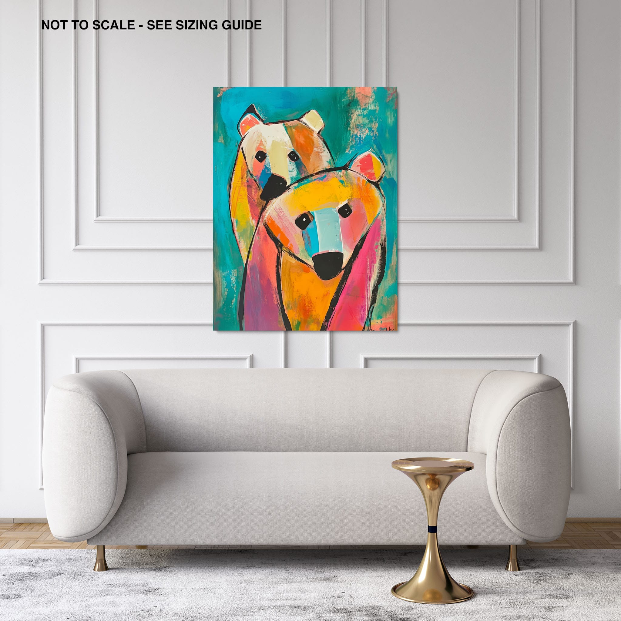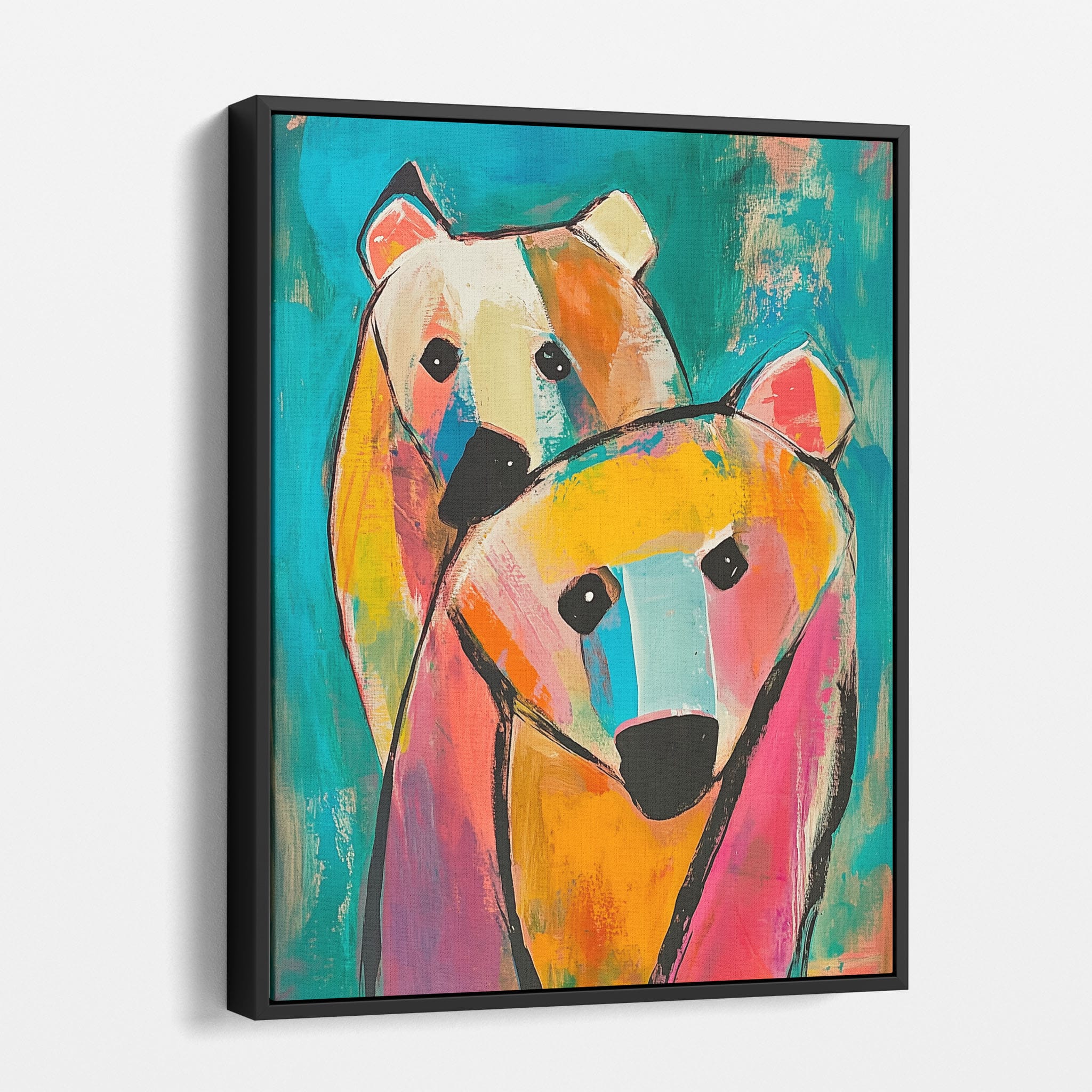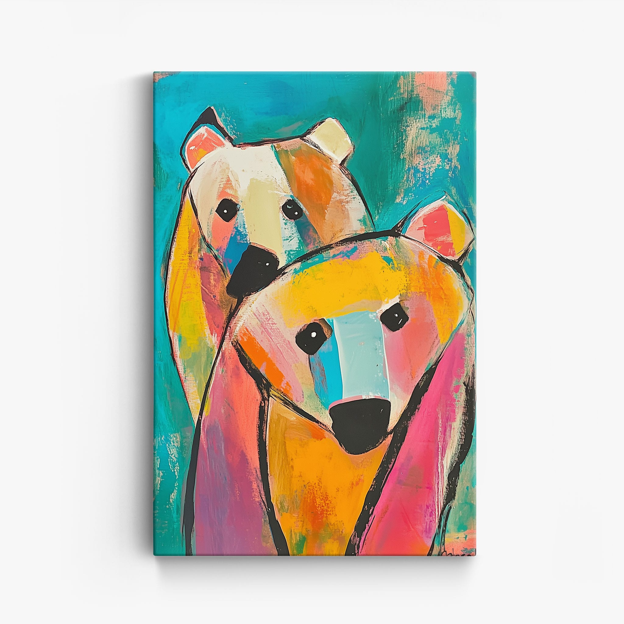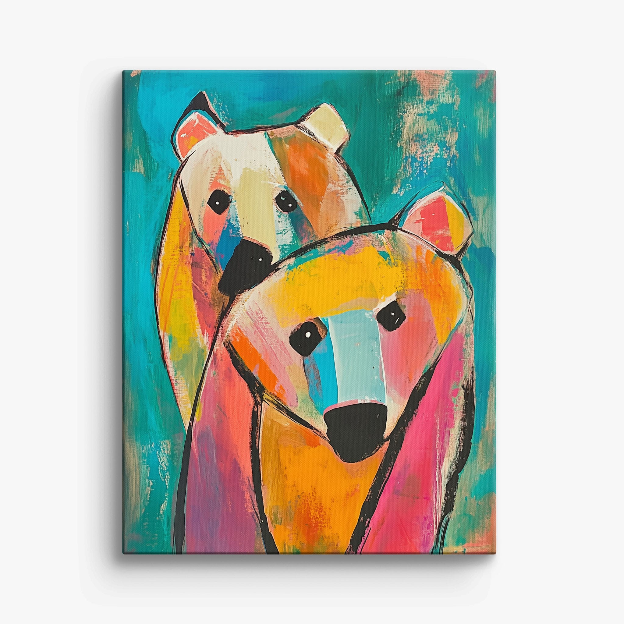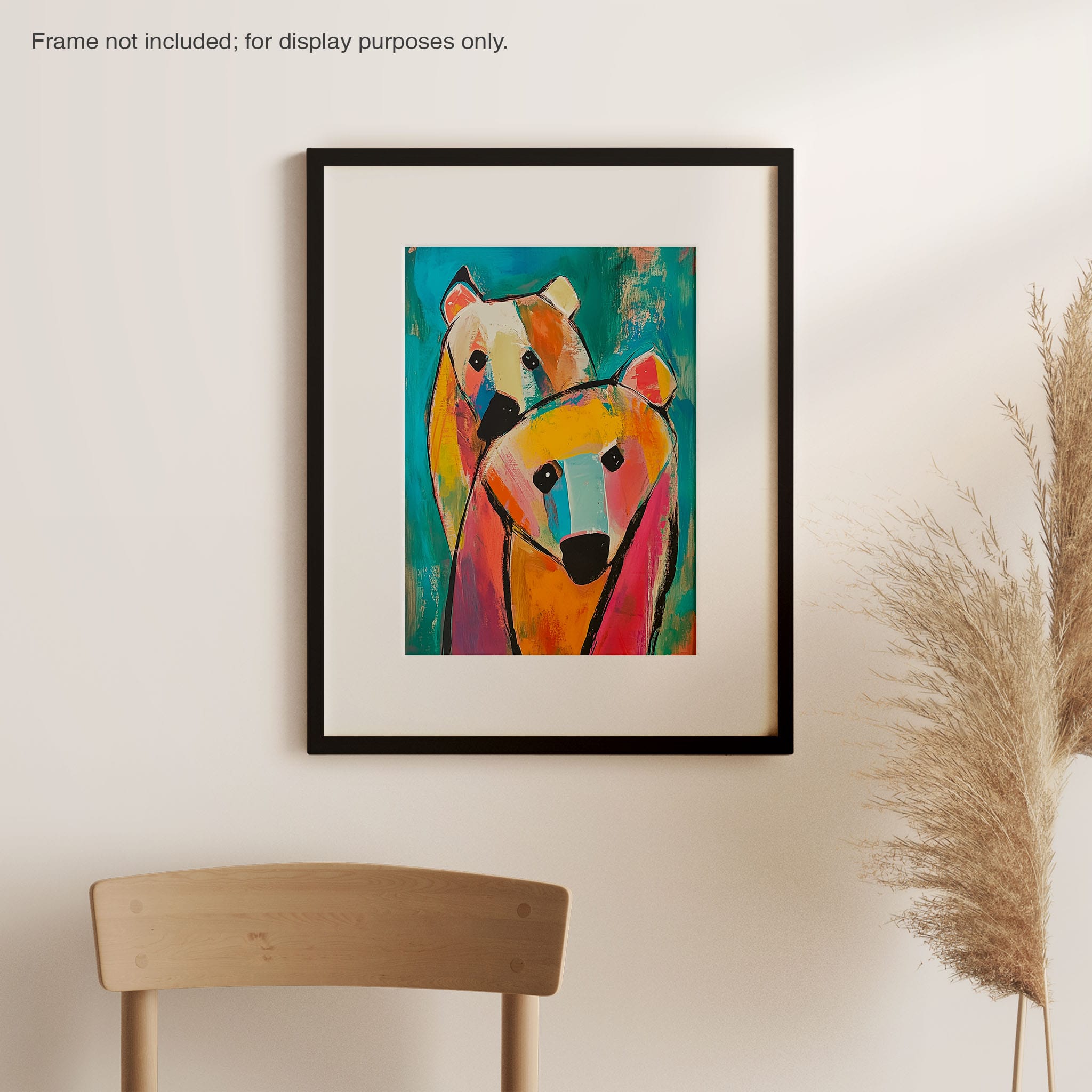 This vibrant digital painting captures the essence of two abstract bears in a sea of rich colors ranging from deep blues to fiery oranges. The expressionist style allows for an explosion of feelings and thoughts as the faces of the bears gaze back with soul-piercing eyes. The bold strokes and vivid palette make this artwork a striking addition to any space, expressing warmth and familial bonds. Ideal for those who appreciate art that speaks and stands out, this piece will draw the eye and heart of any viewer. Elevate your living space with this expressive representation of animal affection.