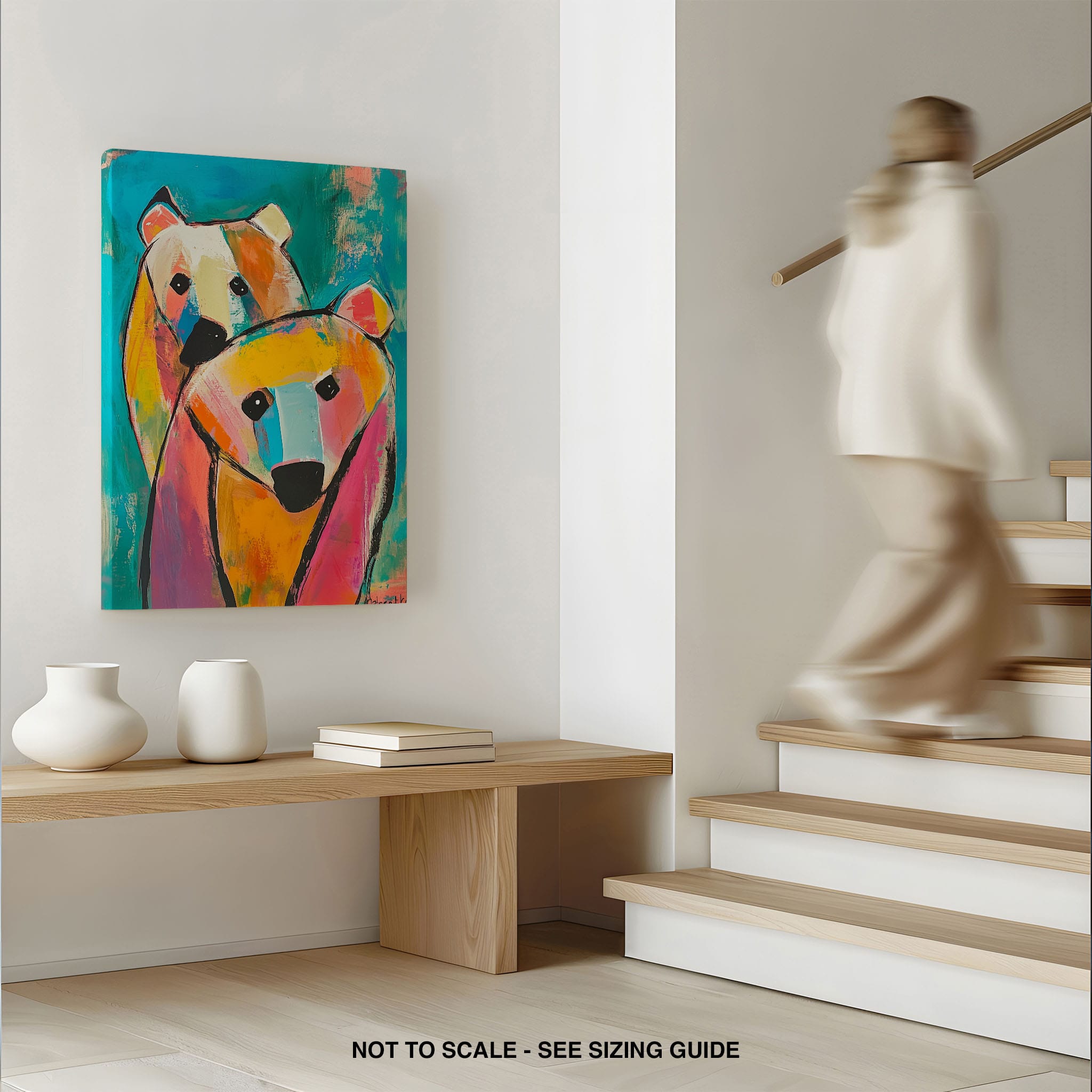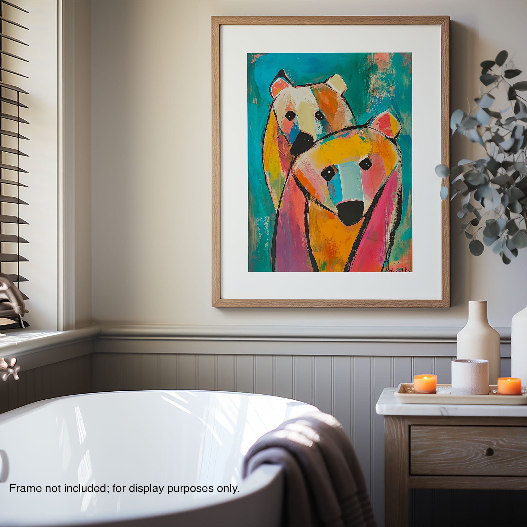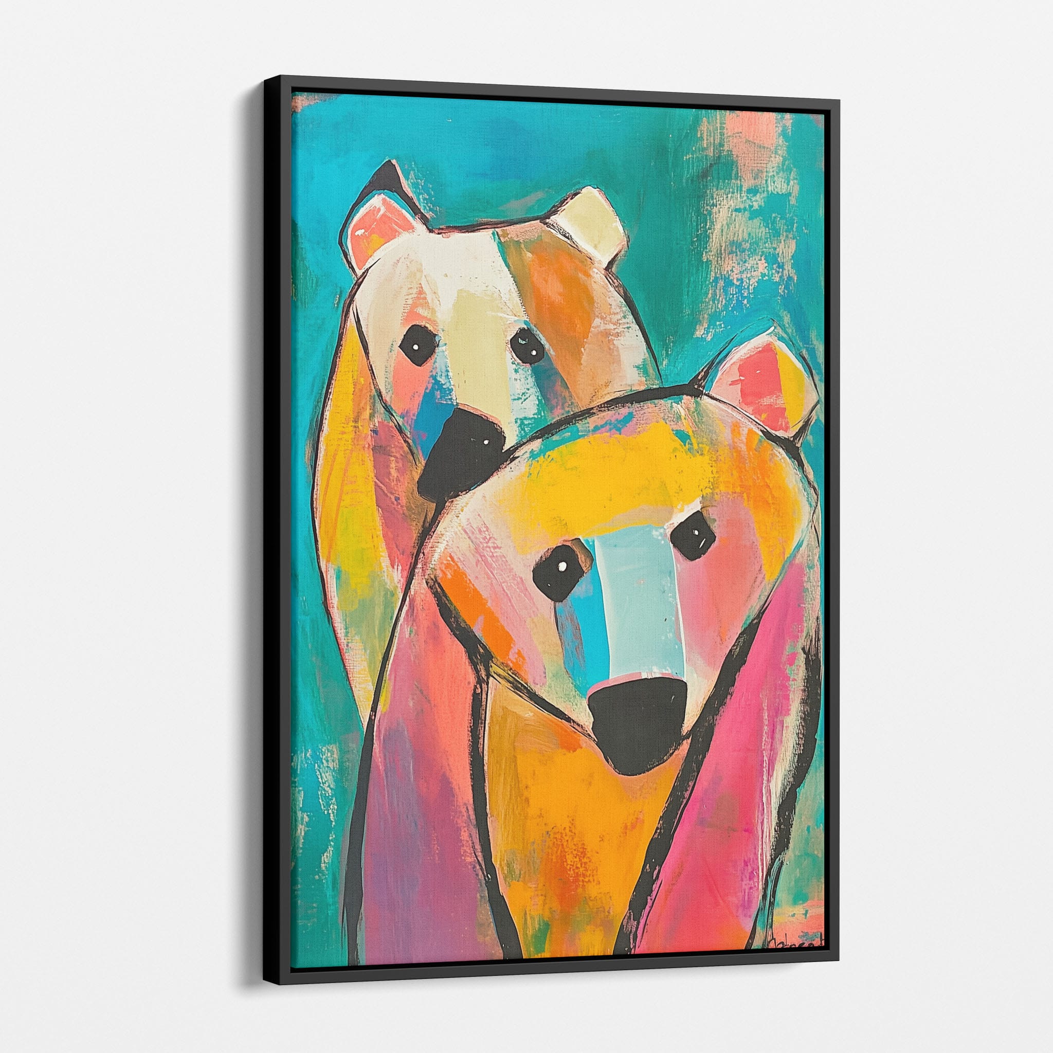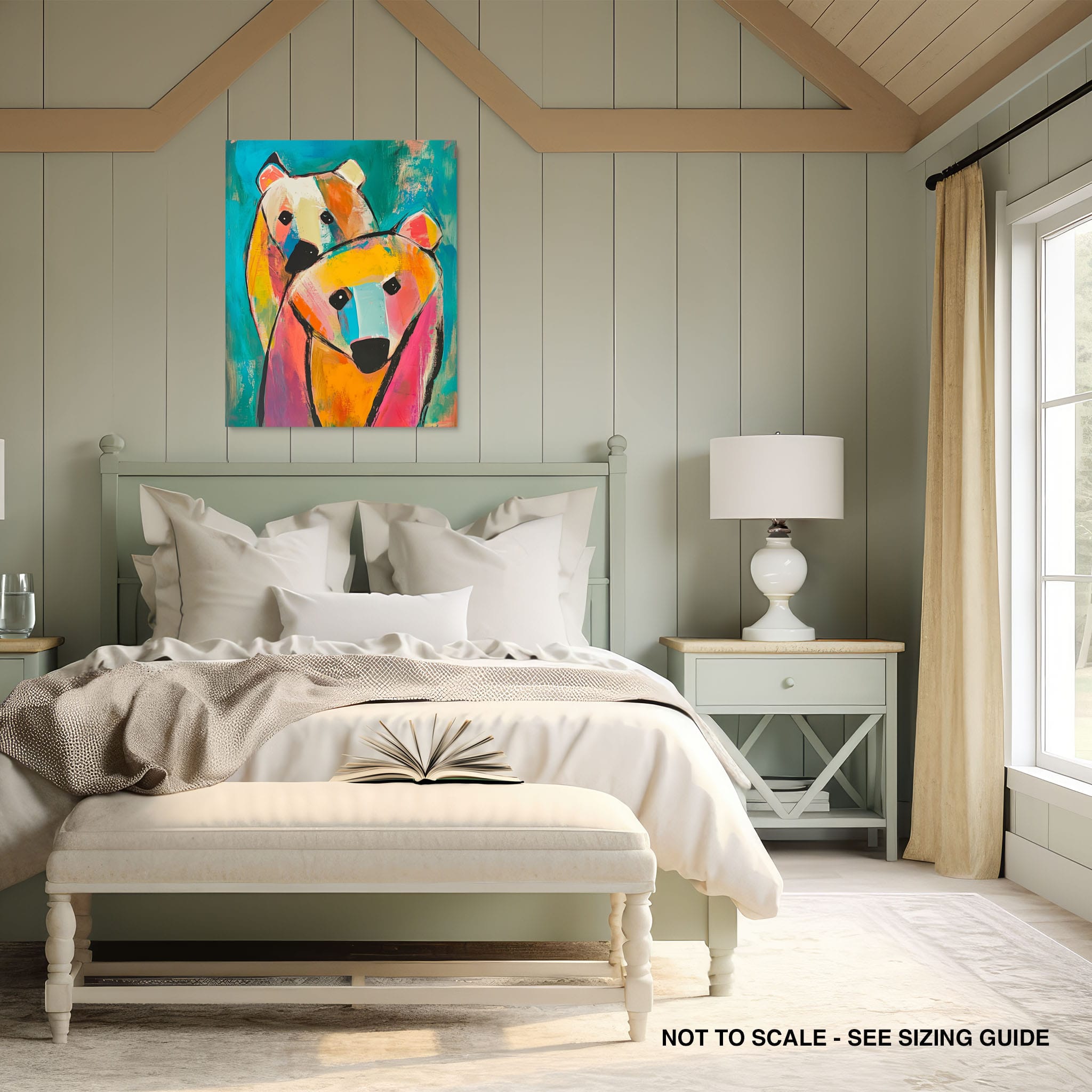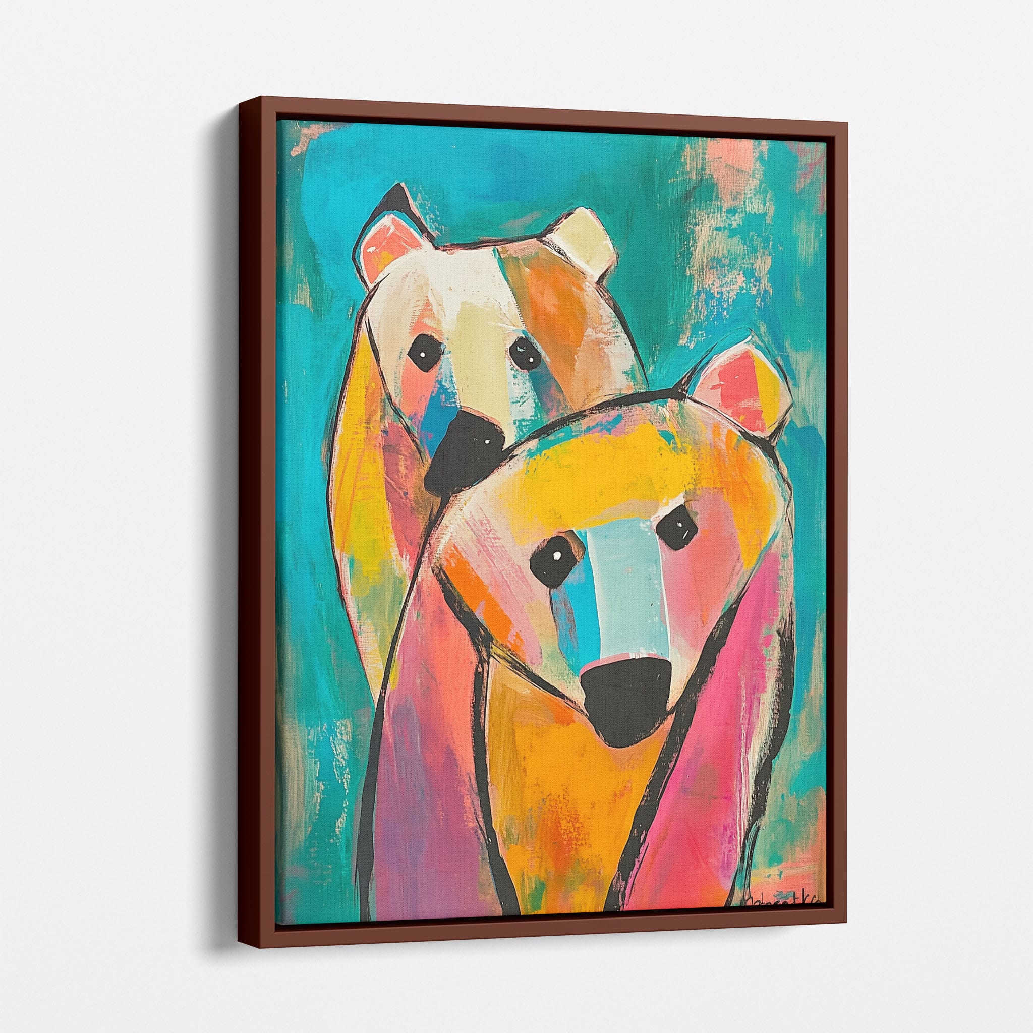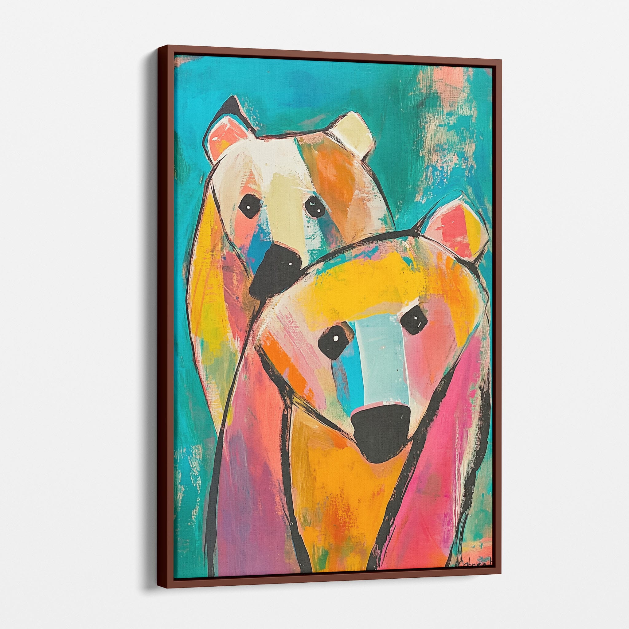 This vibrant digital painting captures the essence of two abstract bears in a sea of rich colors ranging from deep blues to fiery oranges. The expressionist style allows for an explosion of feelings and thoughts as the faces of the bears gaze back with soul-piercing eyes. The bold strokes and vivid palette make this artwork a striking addition to any space, expressing warmth and familial bonds. Ideal for those who appreciate art that speaks and stands out, this piece will draw the eye and heart of any viewer. Elevate your living space with this expressive representation of animal affection.