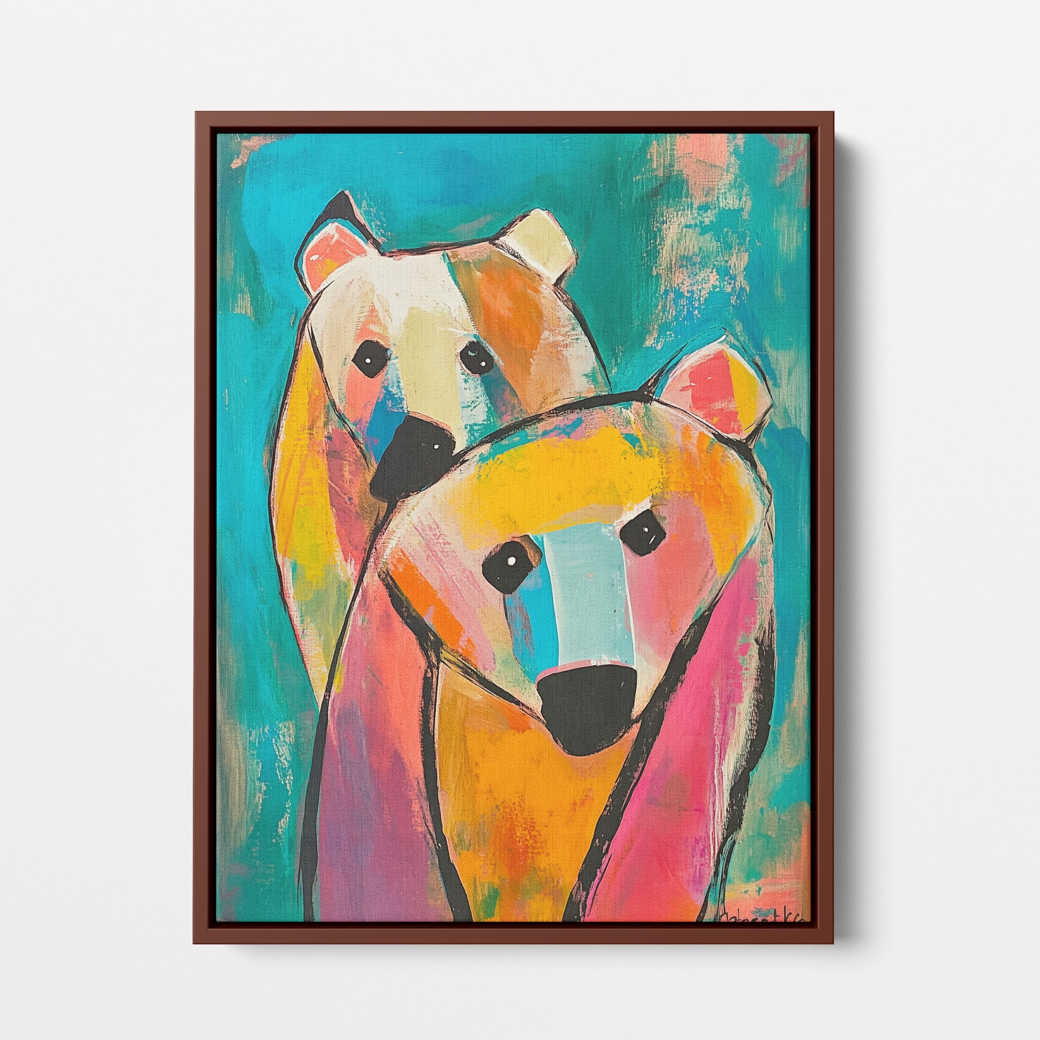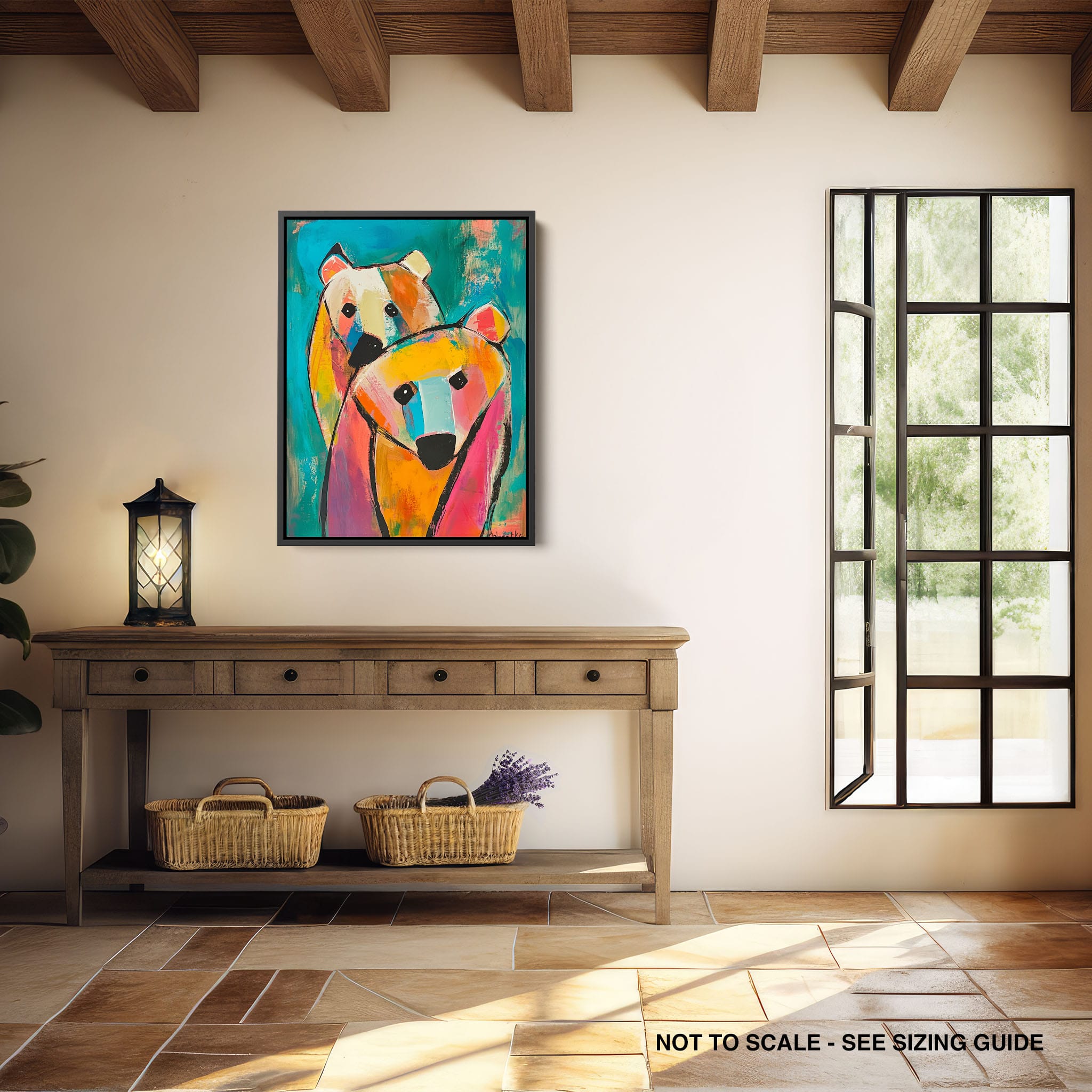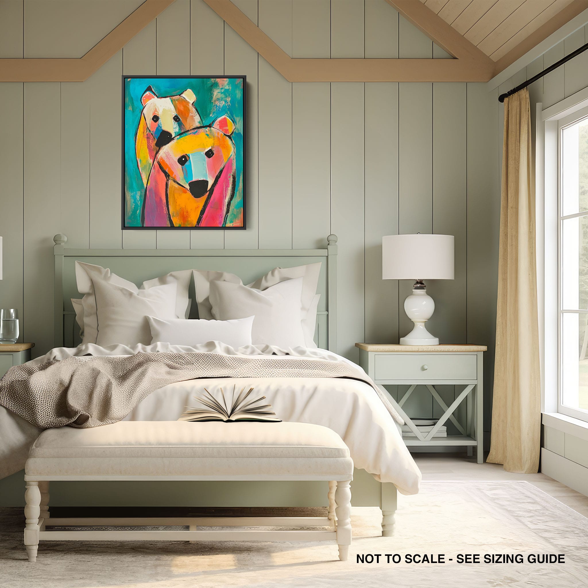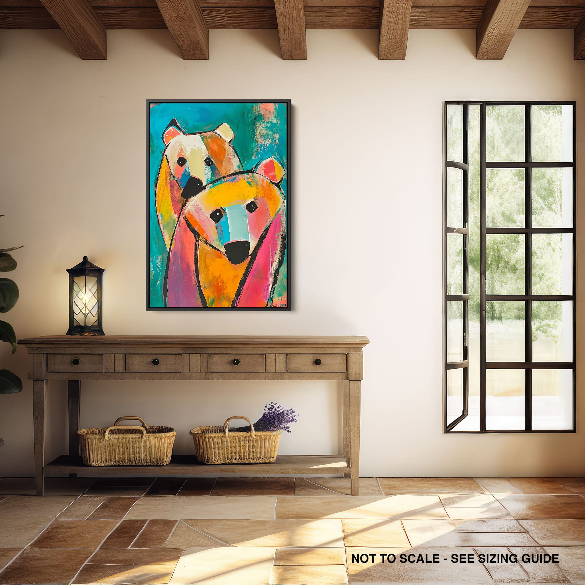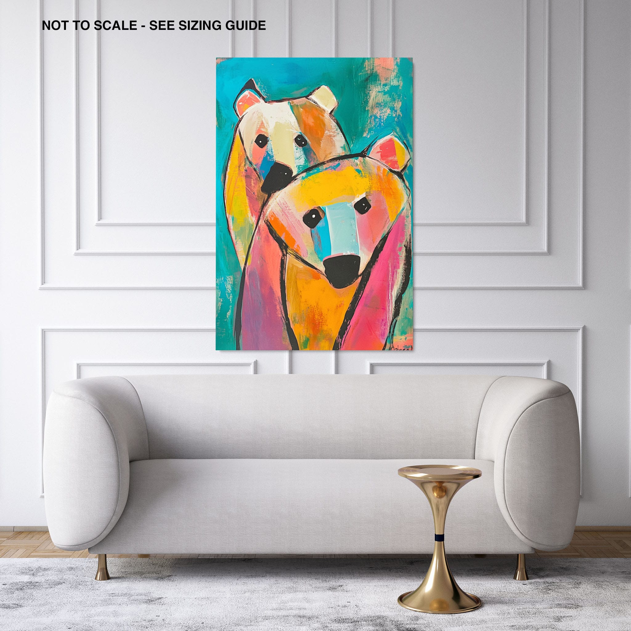 This vibrant digital painting captures the essence of two abstract bears in a sea of rich colors ranging from deep blues to fiery oranges. The expressionist style allows for an explosion of feelings and thoughts as the faces of the bears gaze back with soul-piercing eyes. The bold strokes and vivid palette make this artwork a striking addition to any space, expressing warmth and familial bonds. Ideal for those who appreciate art that speaks and stands out, this piece will draw the eye and heart of any viewer. Elevate your living space with this expressive representation of animal affection.