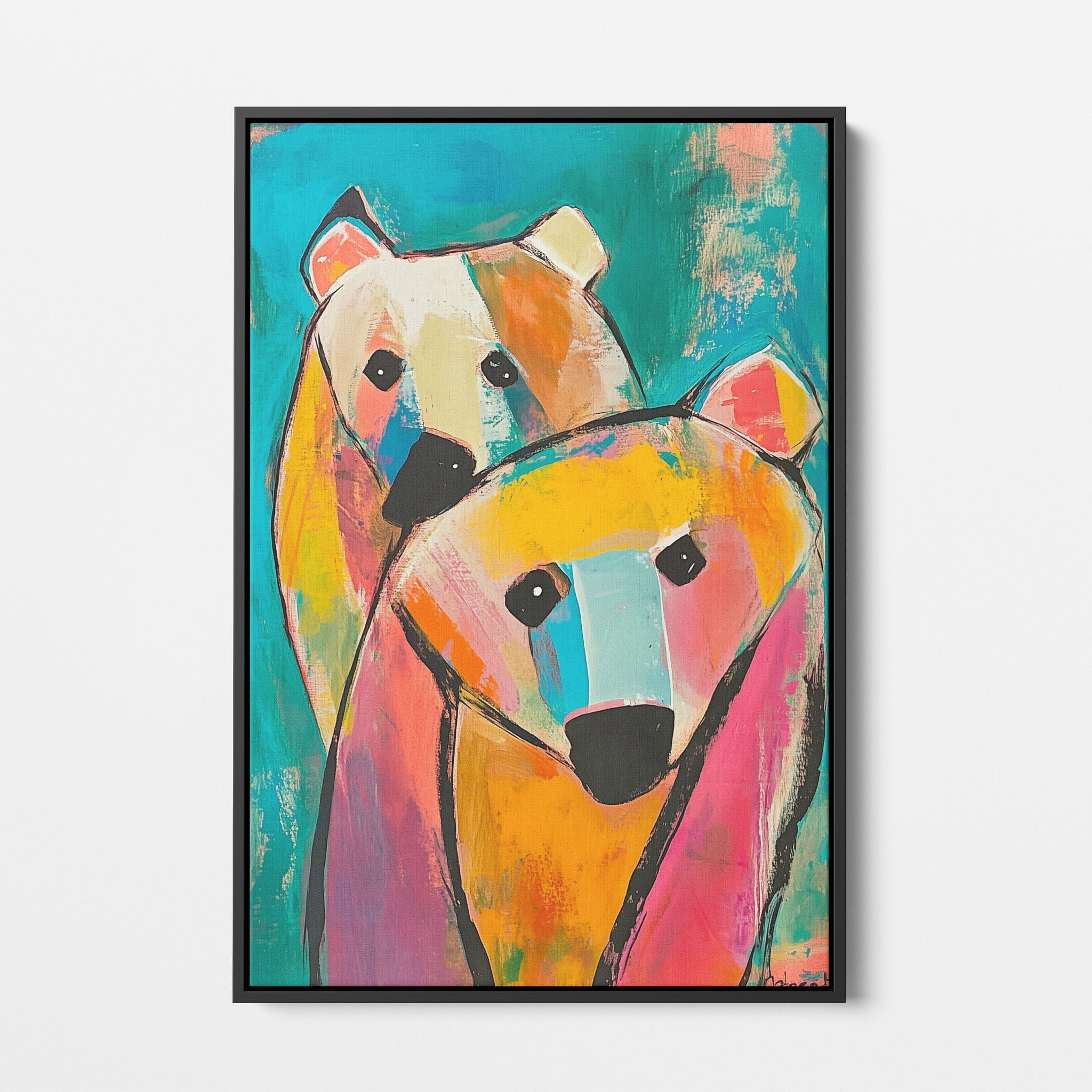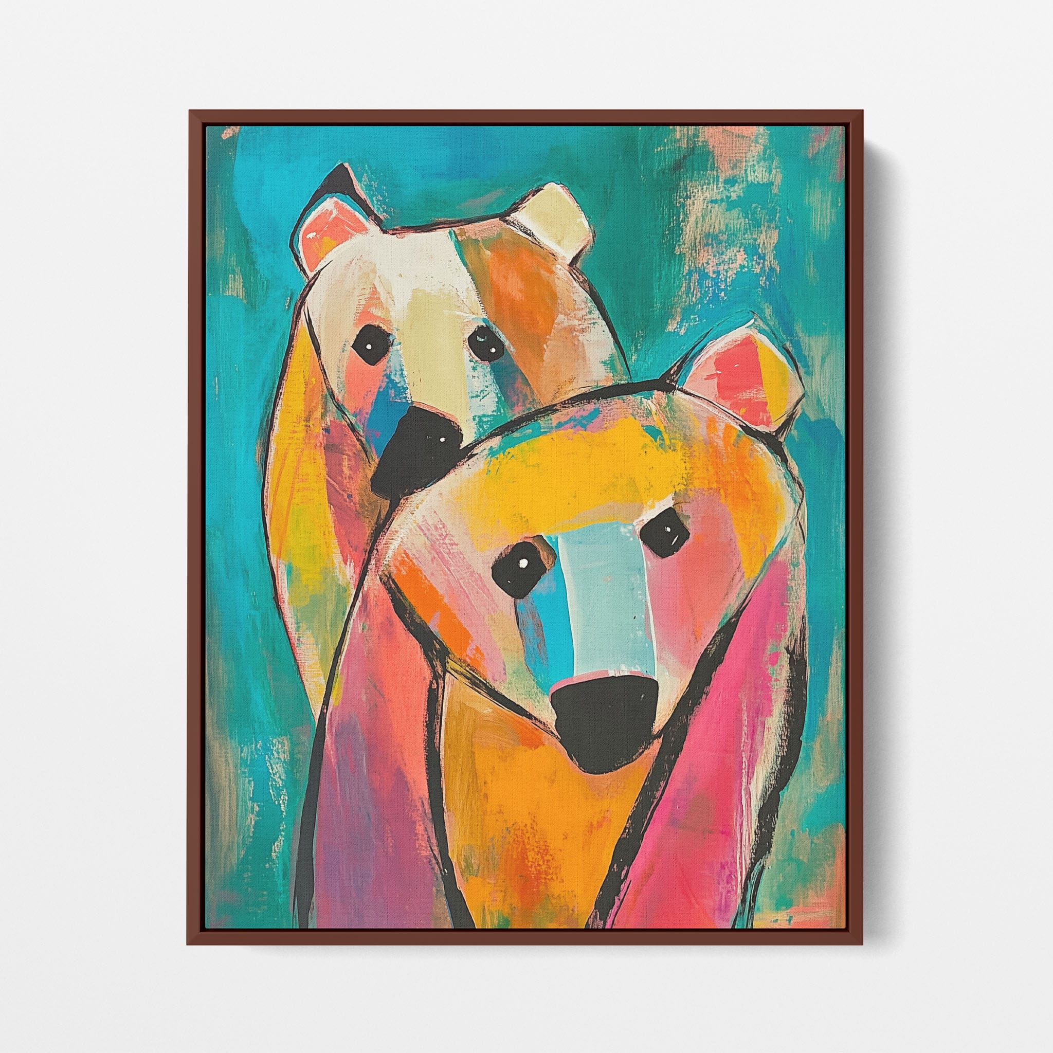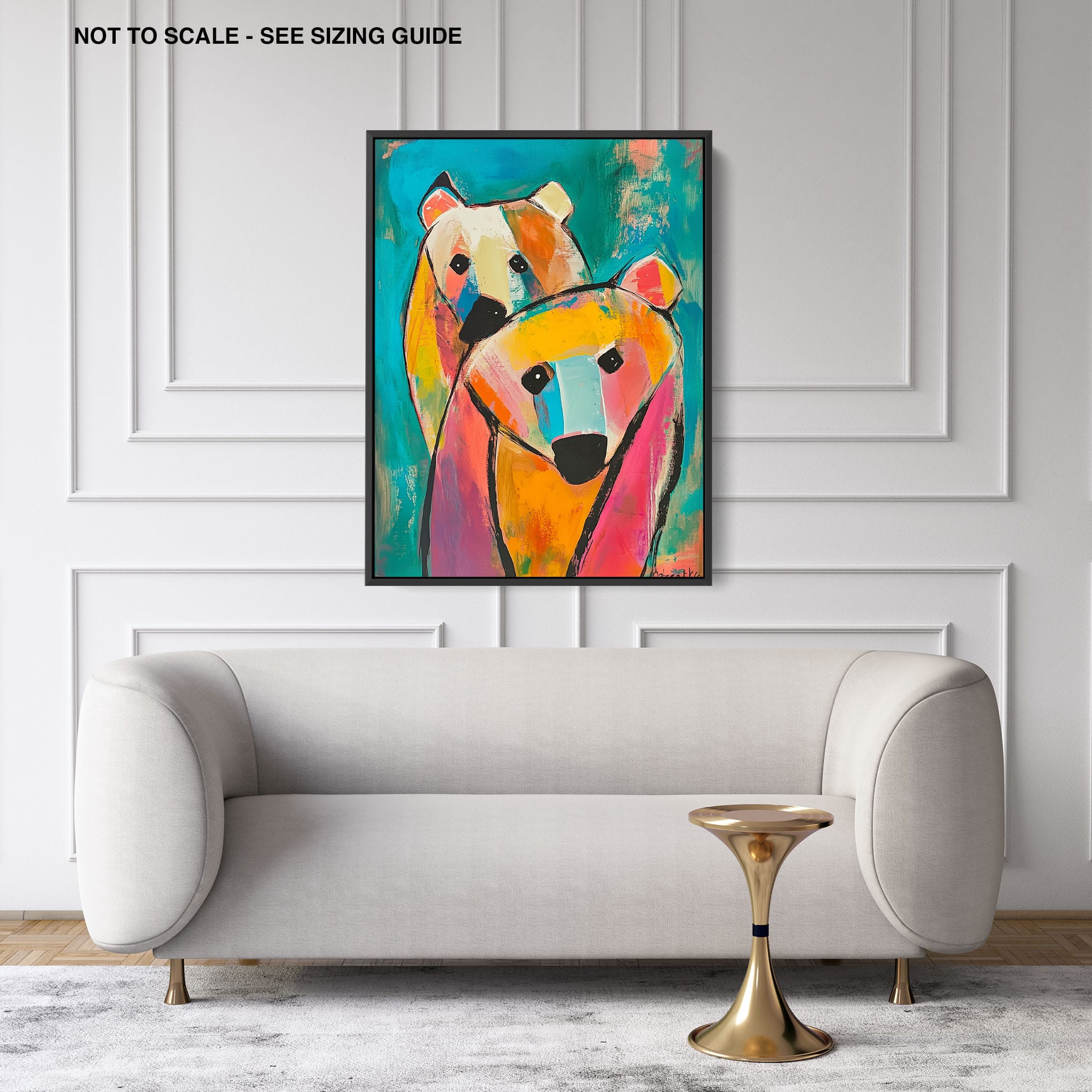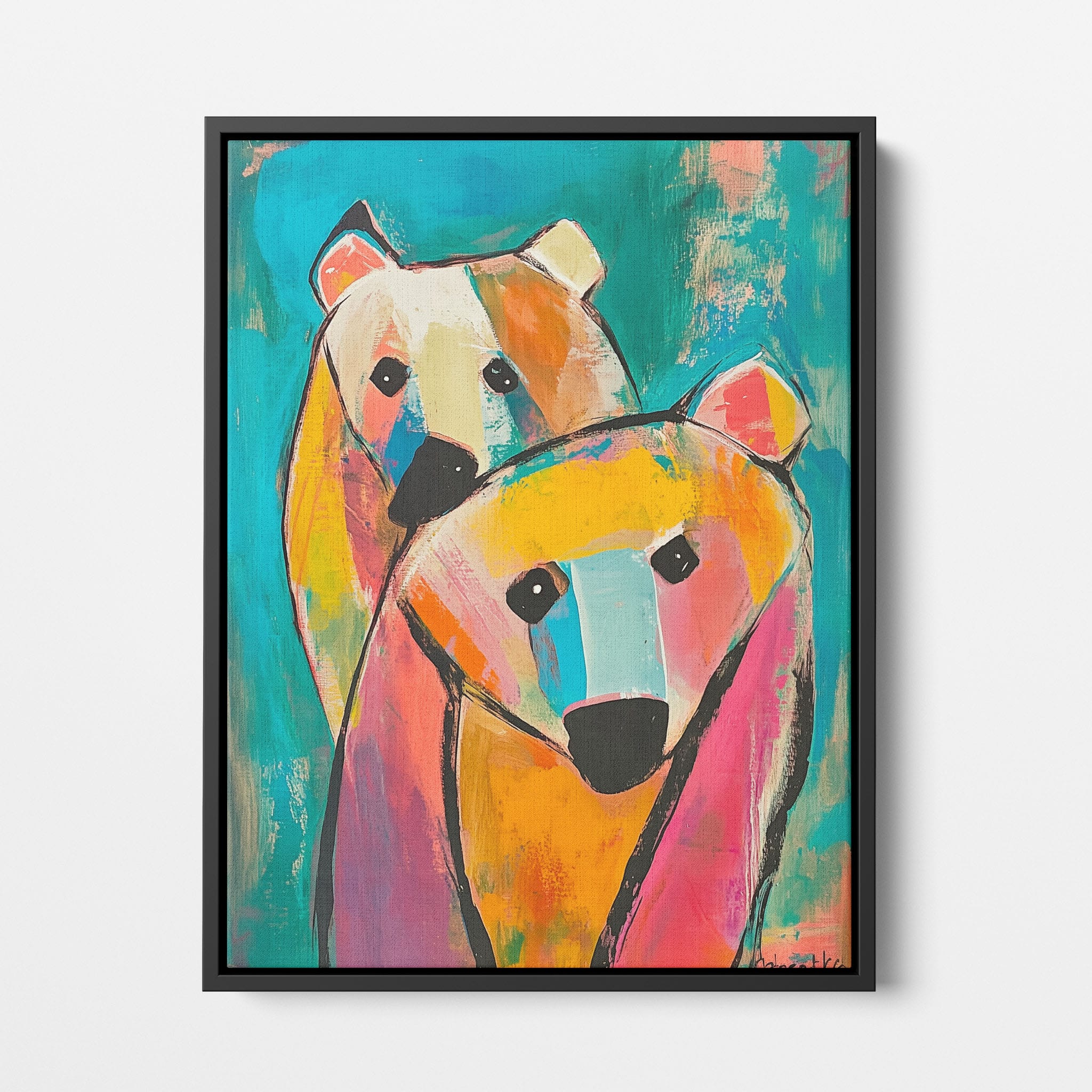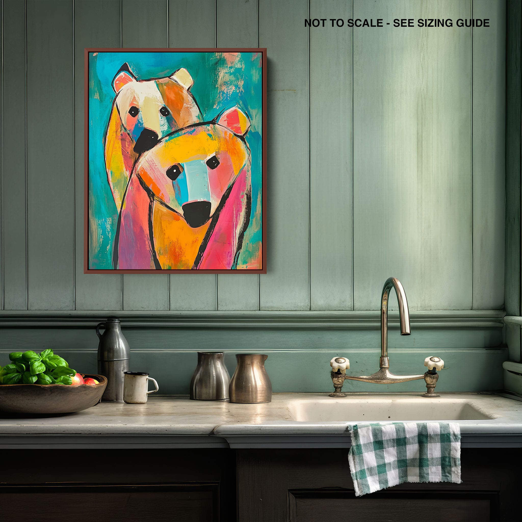 This vibrant digital painting captures the essence of two abstract bears in a sea of rich colors ranging from deep blues to fiery oranges. The expressionist style allows for an explosion of feelings and thoughts as the faces of the bears gaze back with soul-piercing eyes. The bold strokes and vivid palette make this artwork a striking addition to any space, expressing warmth and familial bonds. Ideal for those who appreciate art that speaks and stands out, this piece will draw the eye and heart of any viewer. Elevate your living space with this expressive representation of animal affection.