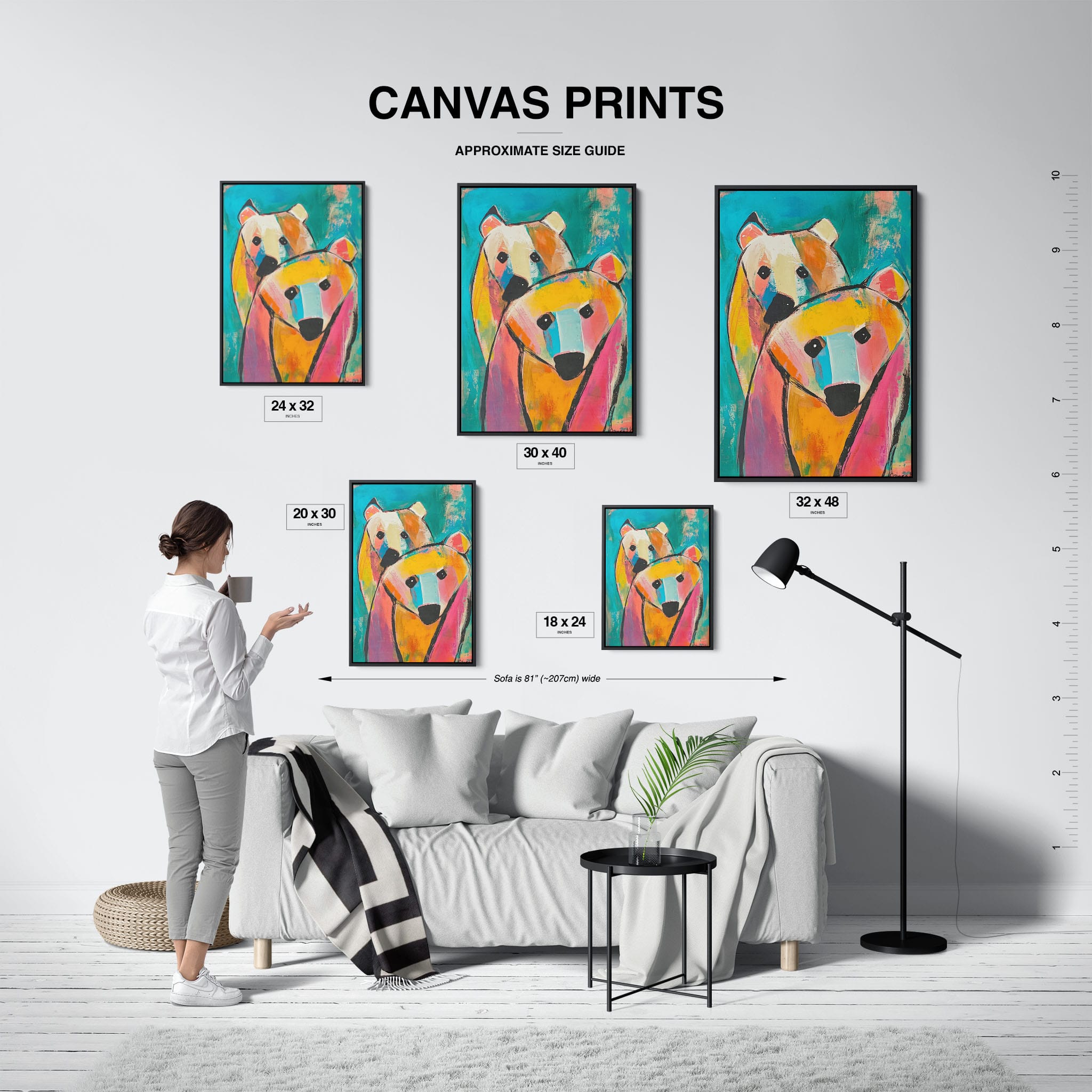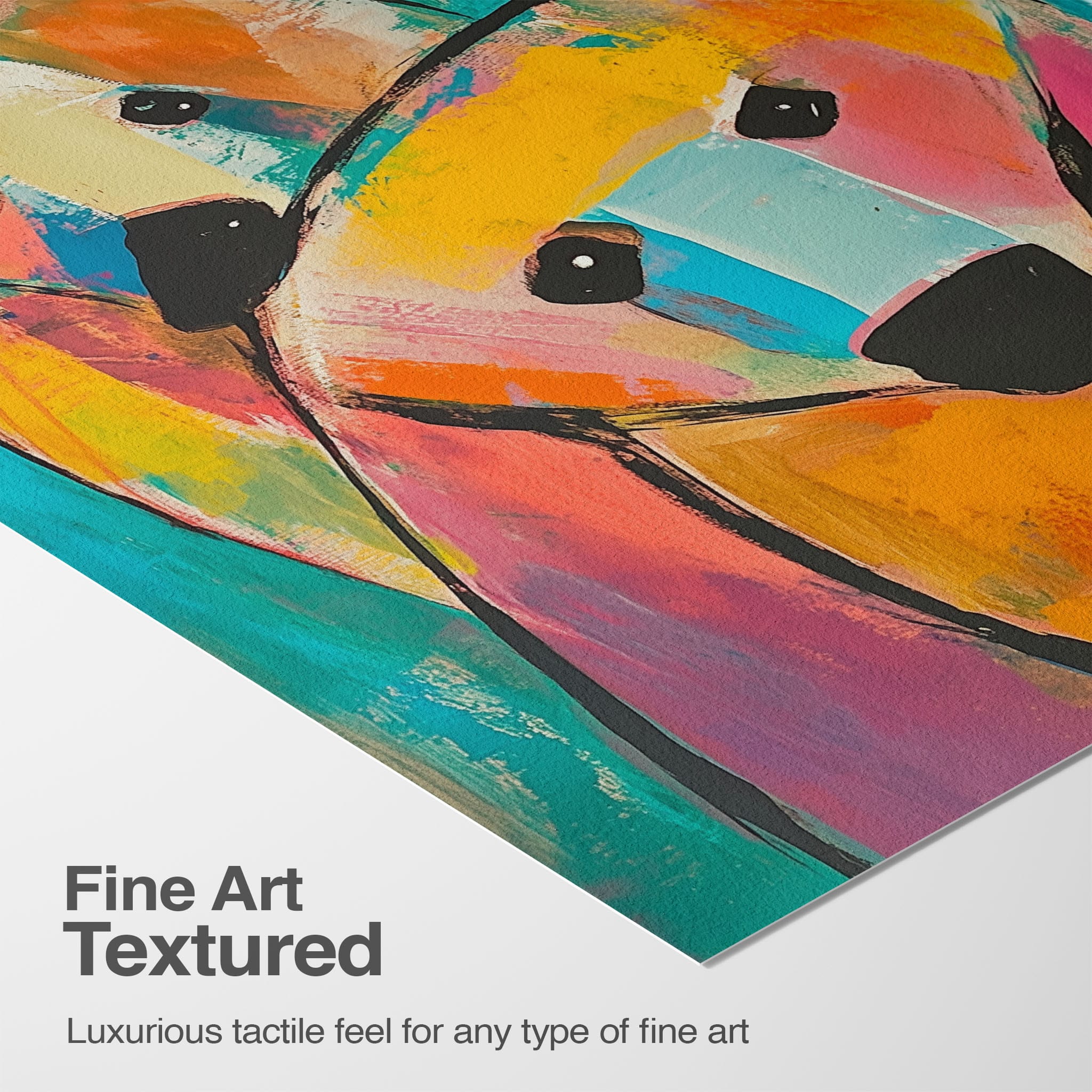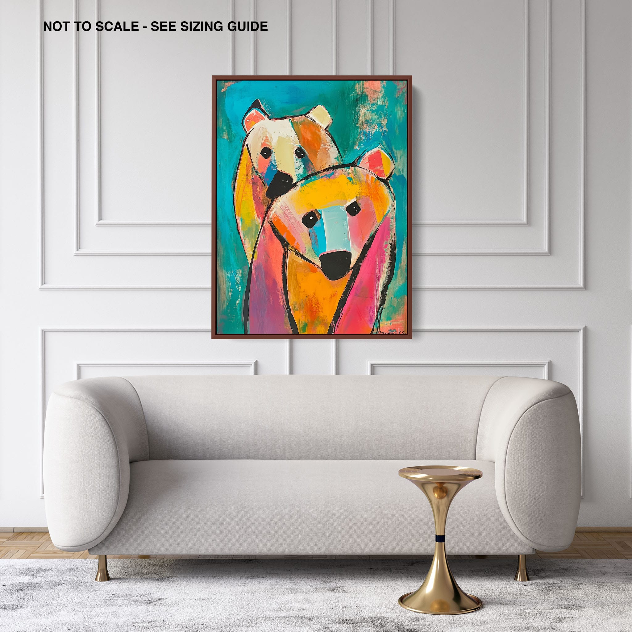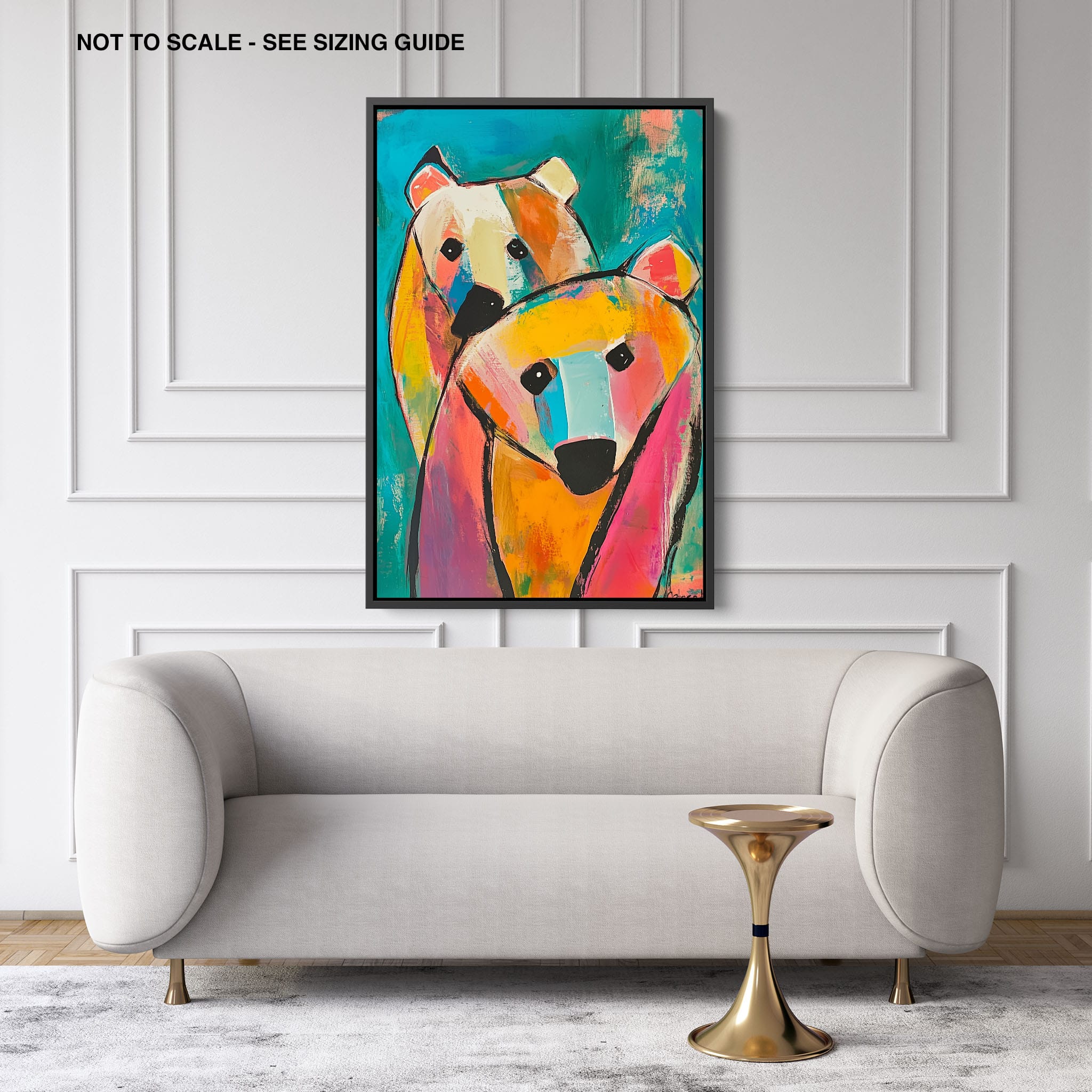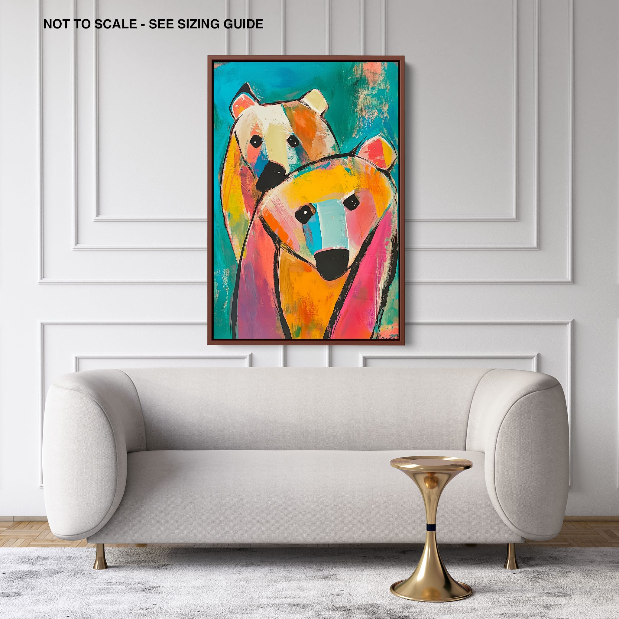 This vibrant digital painting captures the essence of two abstract bears in a sea of rich colors ranging from deep blues to fiery oranges. The expressionist style allows for an explosion of feelings and thoughts as the faces of the bears gaze back with soul-piercing eyes. The bold strokes and vivid palette make this artwork a striking addition to any space, expressing warmth and familial bonds. Ideal for those who appreciate art that speaks and stands out, this piece will draw the eye and heart of any viewer. Elevate your living space with this expressive representation of animal affection.